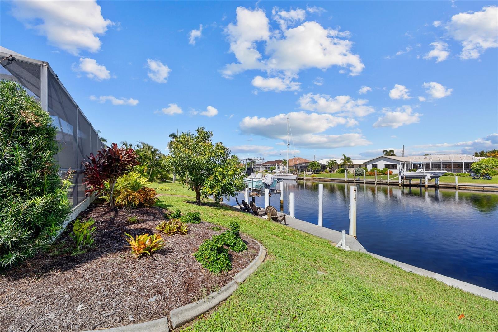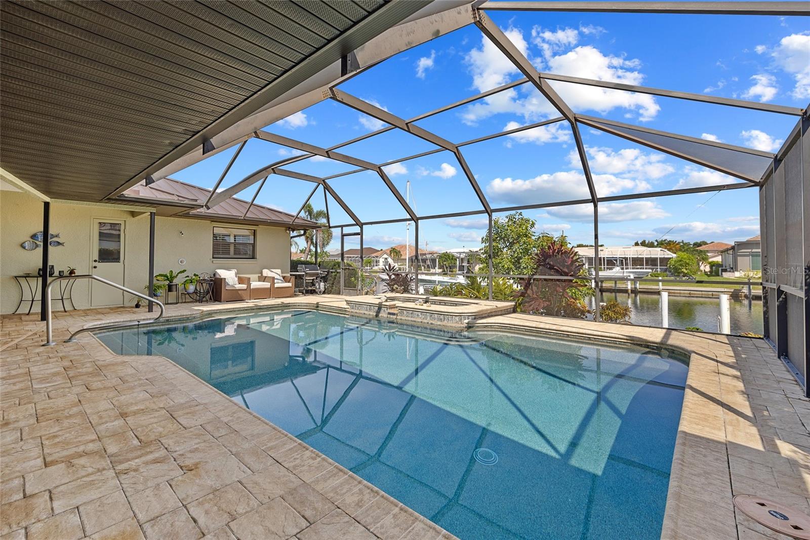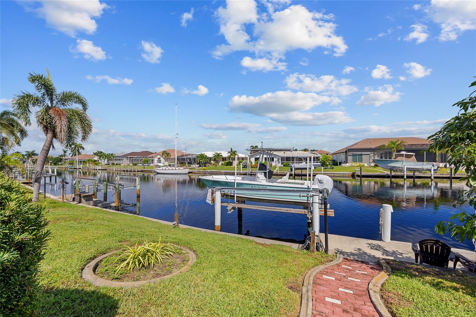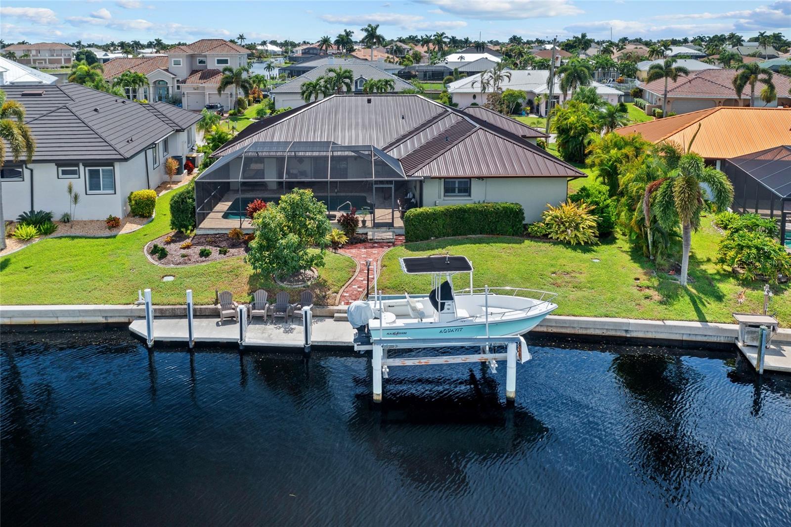 PRIME WATERFRONT LOCATION! EXCEPTIONAL 3 BEDROOM, 2 BATH, 2-CAR GARAGE POOL HOME WITH MERE MINUTE DEEP WATER SAILBOAT ACCESS TO CHARLOTTE HARBOR LEADING TO THE GULF OF MEXICO! A boater's dream, the property features about 70 feet of waterfrontage, a concrete dock equipped with water and electric, and a 10,000 lb. boat lift plus beautiful intersecting canal views. New premium metal roof, new A/C and new hot water heater. Inside, you'll find a bright and open layout with high ceilings and tasteful neutral decor, accented with plantation shutters. The formal living and dining areas seamlessly connect to the outdoor space through pocket sliders, leading you to a fabulous lanai. This expansive outdoor oasis includes a 14’ X 28’ screened heated pool and spa, perfect for relaxation and entertaining. The kitchen is well-appointed with light cabinetry, tiled backsplash, convenient pass-thru window, and breakfast bar. Enjoy meals in the casual dining area overlooking a sunlit family room with a charming bay window. The primary suite is true retreat, featuring tray ceiling, slider to the lanai, and private bath with dual vanities, walk-in closet and walk-in shower. The split floor plan offers privacy for guests, with two additional bedrooms featuring walk-in closets and a separate full bath with pool access. Other highlights include a screened-in front porch, laundry room with a desk, cabinets, and closet, hurricane protection, irrigation system, and lush tropical landscaping. Located in a vibrant golf and boating community, this home is just minutes from the Yacht Club, Fishermen's Village, and the historic downtown area of Punta Gorda. Enjoy arts, community events, entertainment, world-class fishing, boating, fine dining, as well as easy access to the SWFL gulf beaches. Great area for riding bikes and walking with Ponce De Leon Park only 1.5 miles away. Don't miss the opportunity to own this piece of paradise. Schedule your private showing today!