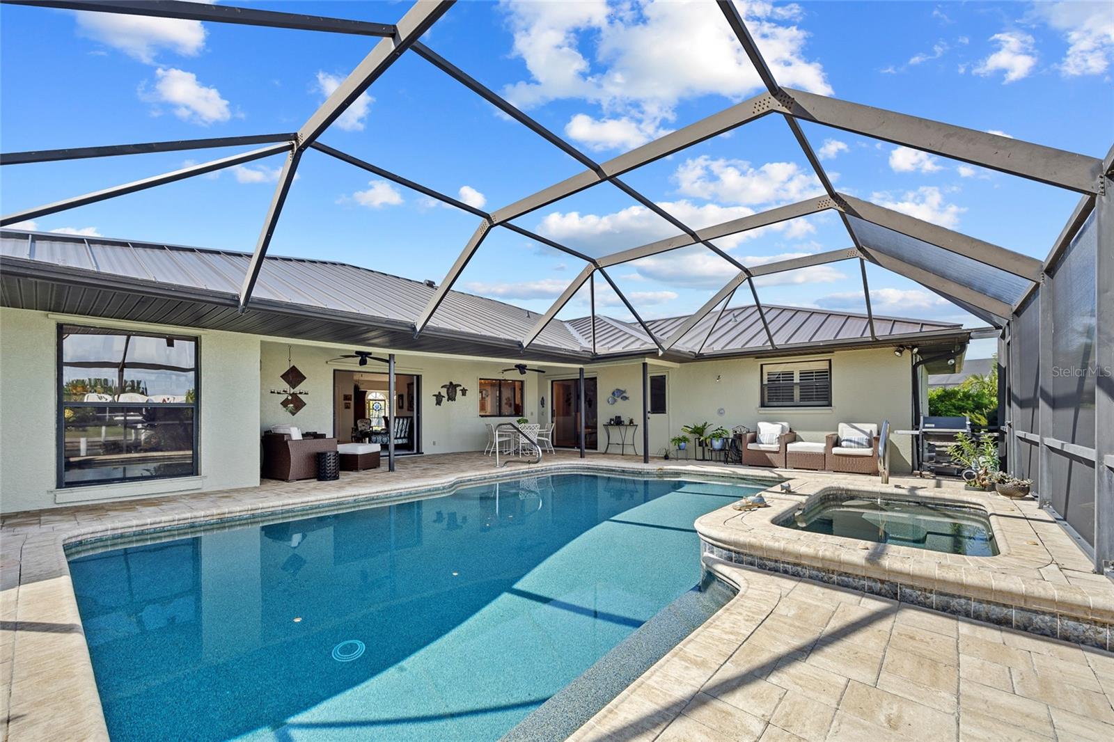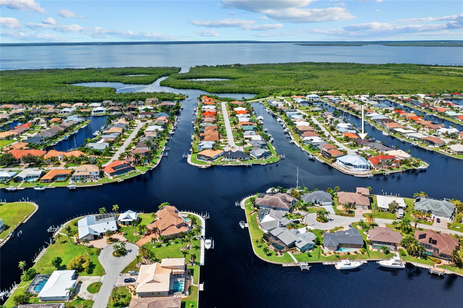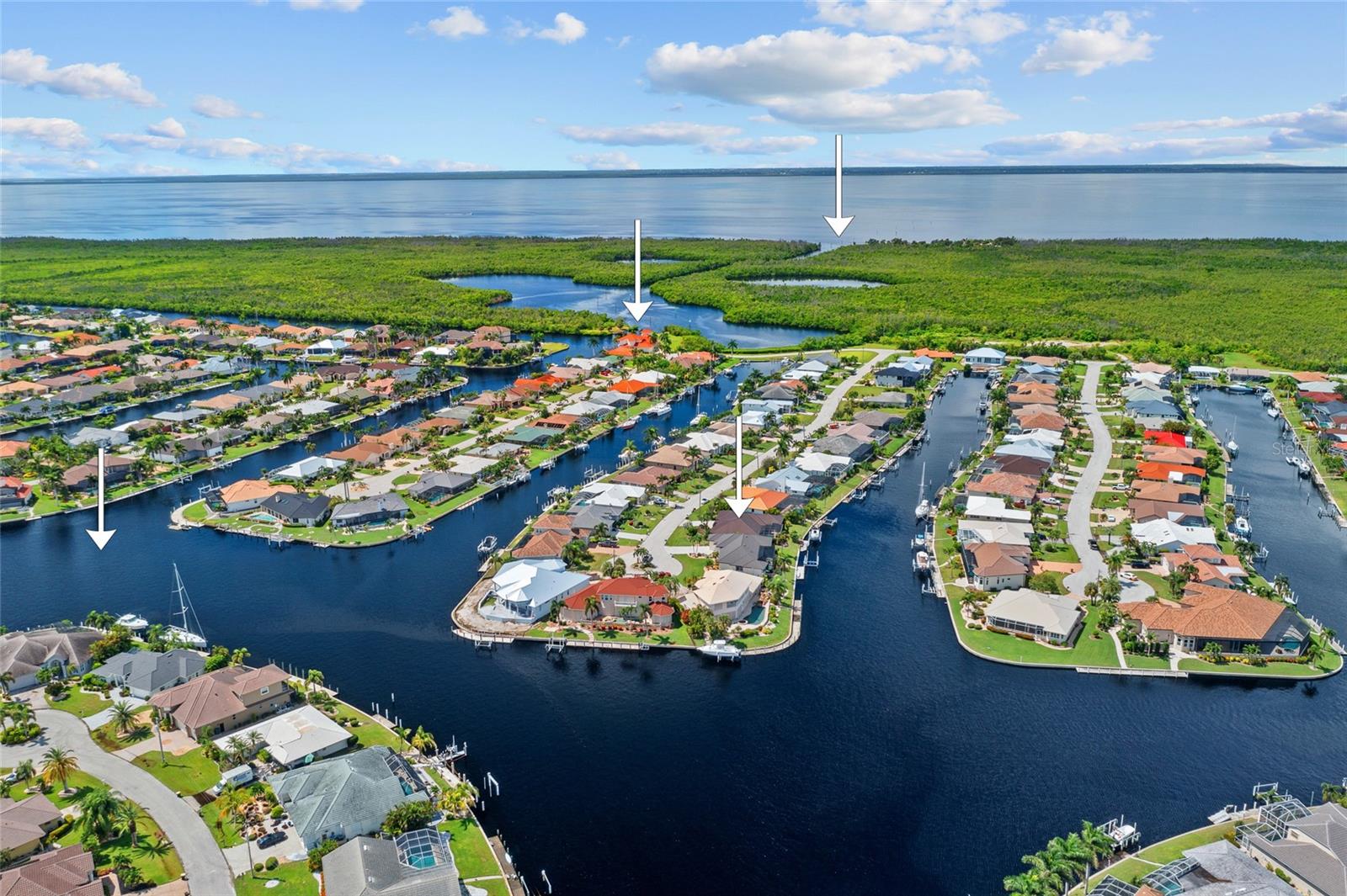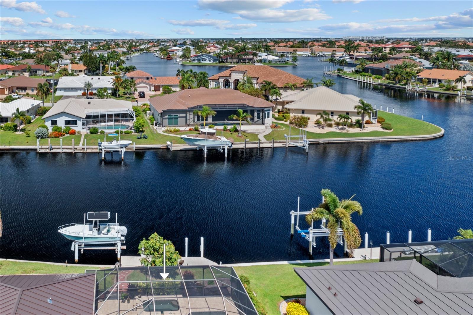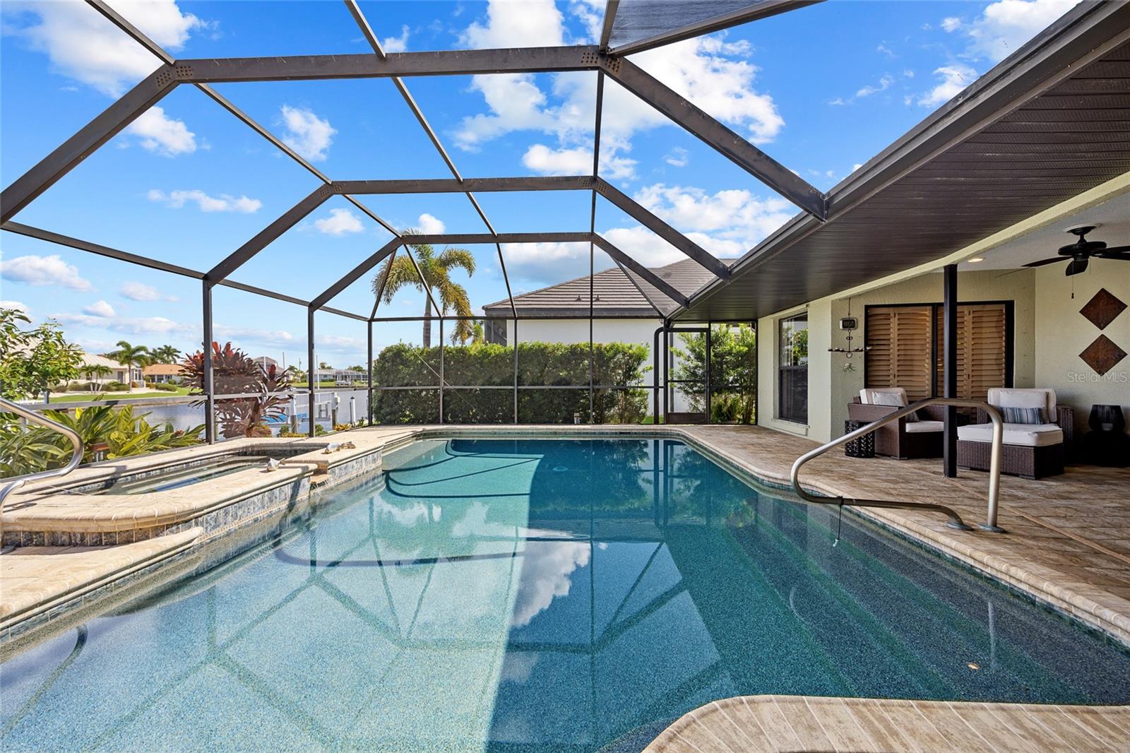 PRIME WATERFRONT LOCATION! EXCEPTIONAL 3 BEDROOM, 2 BATH, 2-CAR GARAGE POOL HOME WITH MERE MINUTE DEEP WATER SAILBOAT ACCESS TO CHARLOTTE HARBOR LEADING TO THE GULF OF MEXICO! A boater's dream, the property features about 70 feet of waterfrontage, a concrete dock equipped with water and electric, and a 10,000 lb. boat lift plus beautiful intersecting canal views. New premium metal roof, new A/C and new hot water heater. Inside, you'll find a bright and open layout with high ceilings and tasteful neutral decor, accented with plantation shutters. The formal living and dining areas seamlessly connect to the outdoor space through pocket sliders, leading you to a fabulous lanai. This expansive outdoor oasis includes a 14’ X 28’ screened heated pool and spa, perfect for relaxation and entertaining. The kitchen is well-appointed with light cabinetry, tiled backsplash, convenient pass-thru window, and breakfast bar. Enjoy meals in the casual dining area overlooking a sunlit family room with a charming bay window. The primary suite is true retreat, featuring tray ceiling, slider to the lanai, and private bath with dual vanities, walk-in closet and walk-in shower. The split floor plan offers privacy for guests, with two additional bedrooms featuring walk-in closets and a separate full bath with pool access. Other highlights include a screened-in front porch, laundry room with a desk, cabinets, and closet, hurricane protection, irrigation system, and lush tropical landscaping. Located in a vibrant golf and boating community, this home is just minutes from the Yacht Club, Fishermen's Village, and the historic downtown area of Punta Gorda. Enjoy arts, community events, entertainment, world-class fishing, boating, fine dining, as well as easy access to the SWFL gulf beaches. Great area for riding bikes and walking with Ponce De Leon Park only 1.5 miles away. Don't miss the opportunity to own this piece of paradise. Schedule your private showing today!