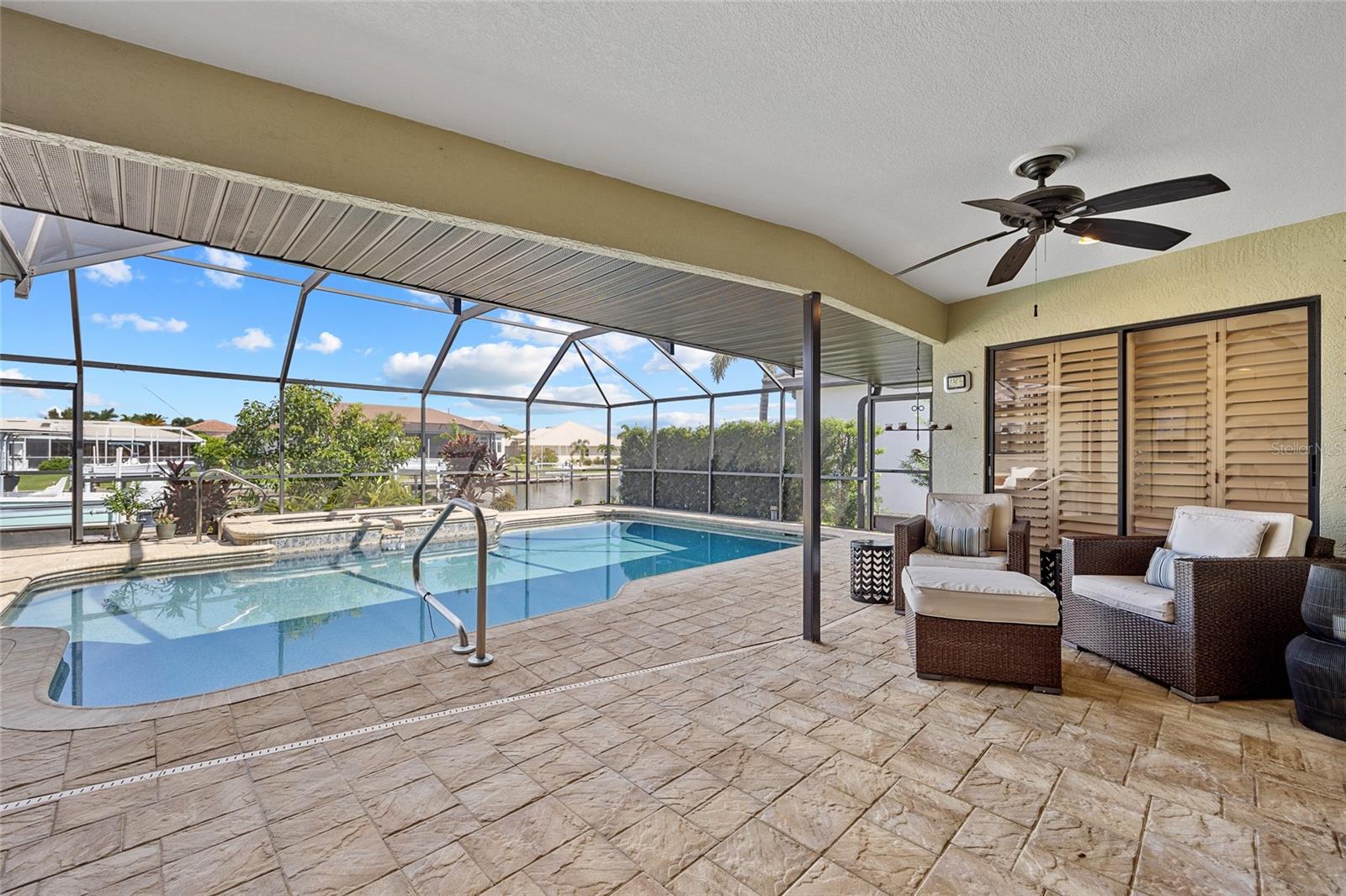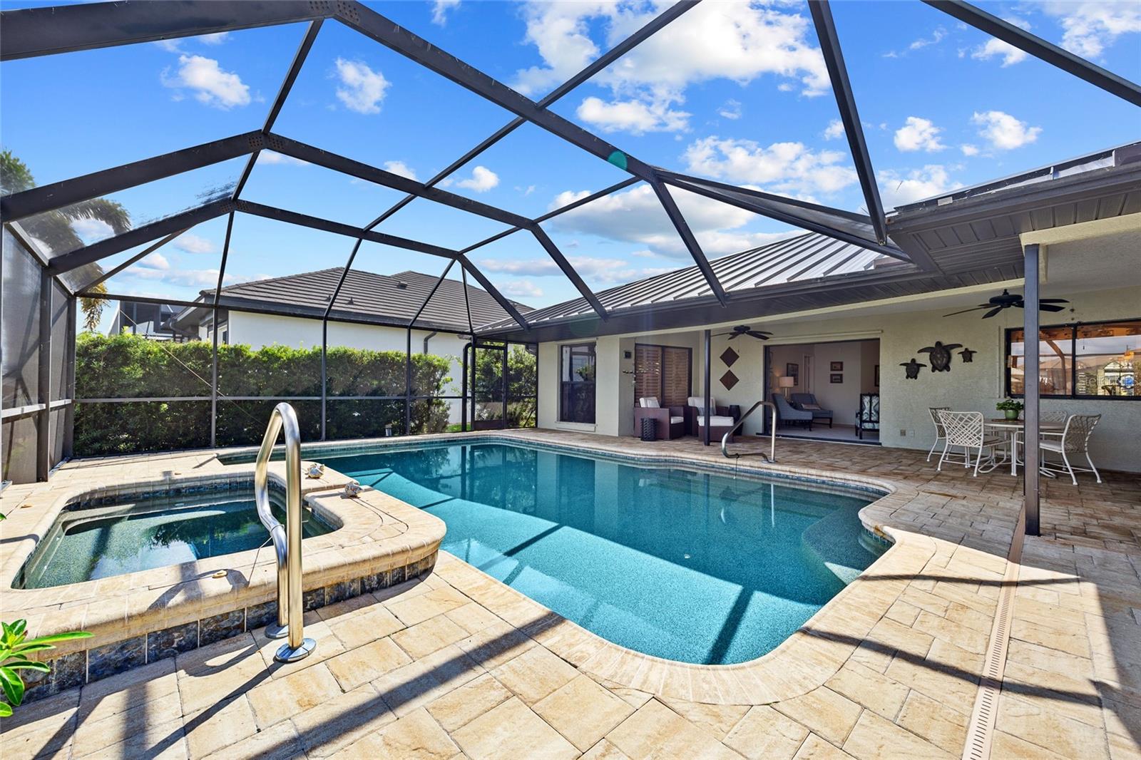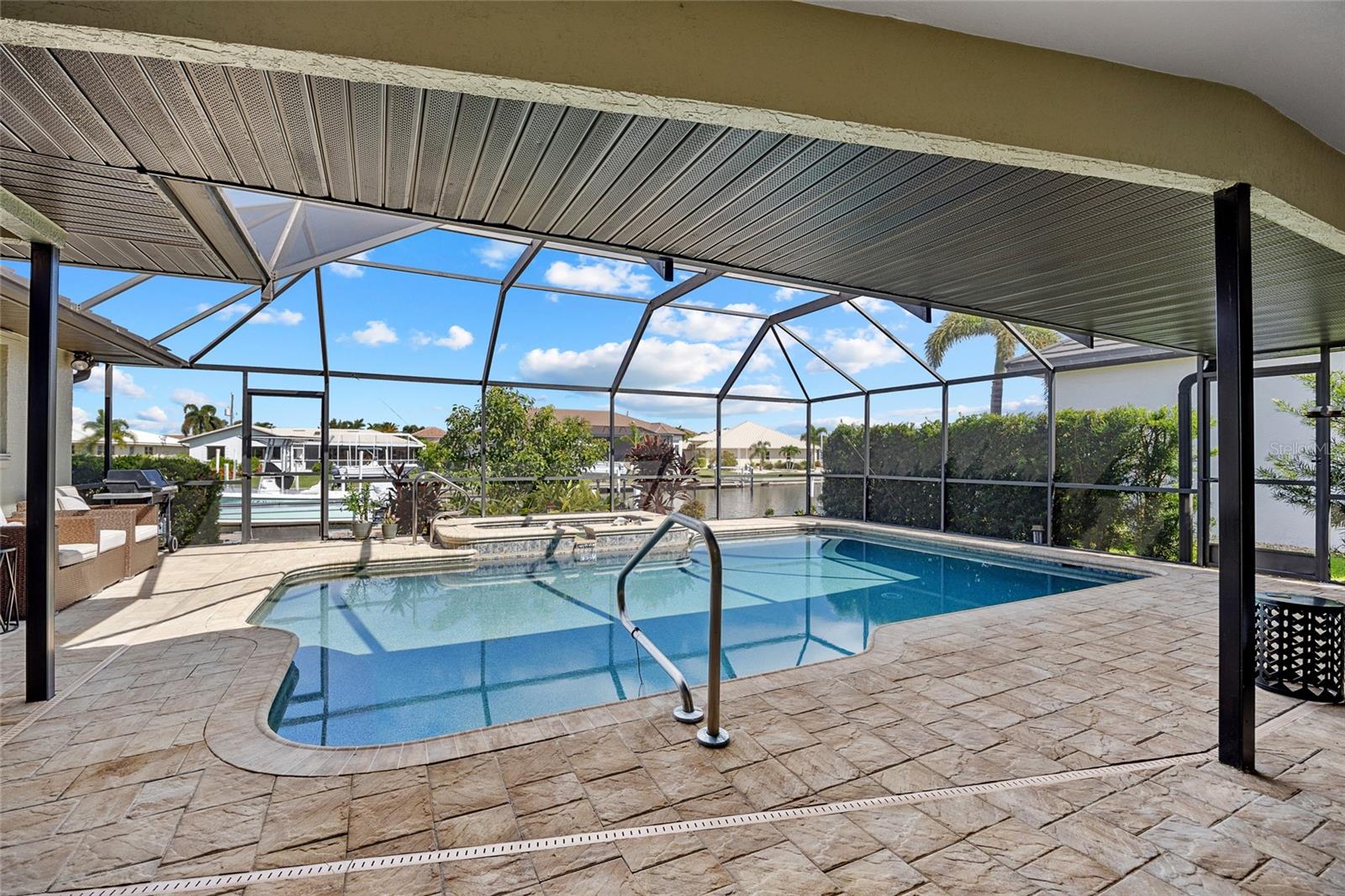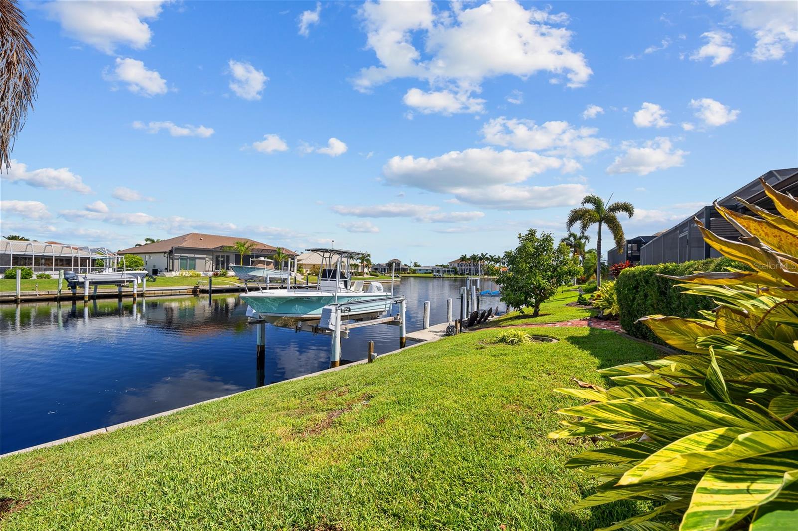 PRIME WATERFRONT LOCATION! EXCEPTIONAL 3 BEDROOM, 2 BATH, 2-CAR GARAGE POOL HOME WITH MERE MINUTE DEEP WATER SAILBOAT ACCESS TO CHARLOTTE HARBOR LEADING TO THE GULF OF MEXICO! A boater's dream, the property features about 70 feet of waterfrontage, a concrete dock equipped with water and electric, and a 10,000 lb. boat lift plus beautiful intersecting canal views. New premium metal roof, new A/C and new hot water heater. Inside, you'll find a bright and open layout with high ceilings and tasteful neutral decor, accented with plantation shutters. The formal living and dining areas seamlessly connect to the outdoor space through pocket sliders, leading you to a fabulous lanai. This expansive outdoor oasis includes a 14’ X 28’ screened heated pool and spa, perfect for relaxation and entertaining. The kitchen is well-appointed with light cabinetry, tiled backsplash, convenient pass-thru window, and breakfast bar. Enjoy meals in the casual dining area overlooking a sunlit family room with a charming bay window. The primary suite is true retreat, featuring tray ceiling, slider to the lanai, and private bath with dual vanities, walk-in closet and walk-in shower. The split floor plan offers privacy for guests, with two additional bedrooms featuring walk-in closets and a separate full bath with pool access. Other highlights include a screened-in front porch, laundry room with a desk, cabinets, and closet, hurricane protection, irrigation system, and lush tropical landscaping. Located in a vibrant golf and boating community, this home is just minutes from the Yacht Club, Fishermen's Village, and the historic downtown area of Punta Gorda. Enjoy arts, community events, entertainment, world-class fishing, boating, fine dining, as well as easy access to the SWFL gulf beaches. Great area for riding bikes and walking with Ponce De Leon Park only 1.5 miles away. Don't miss the opportunity to own this piece of paradise. Schedule your private showing today!