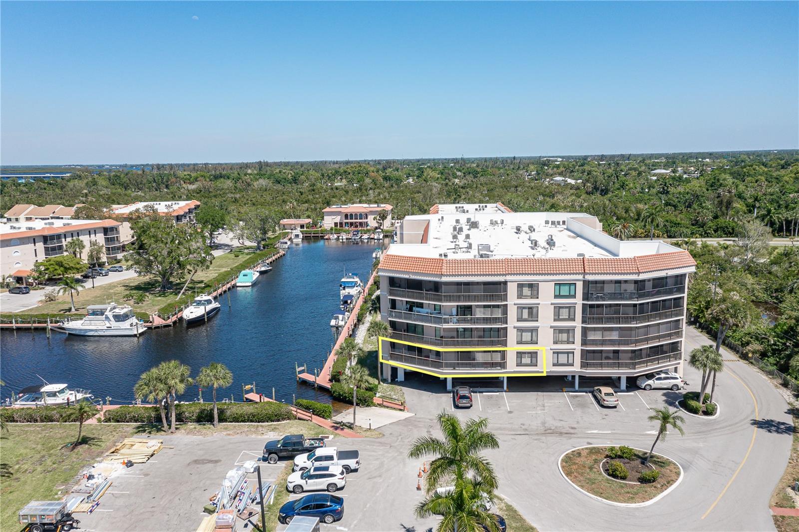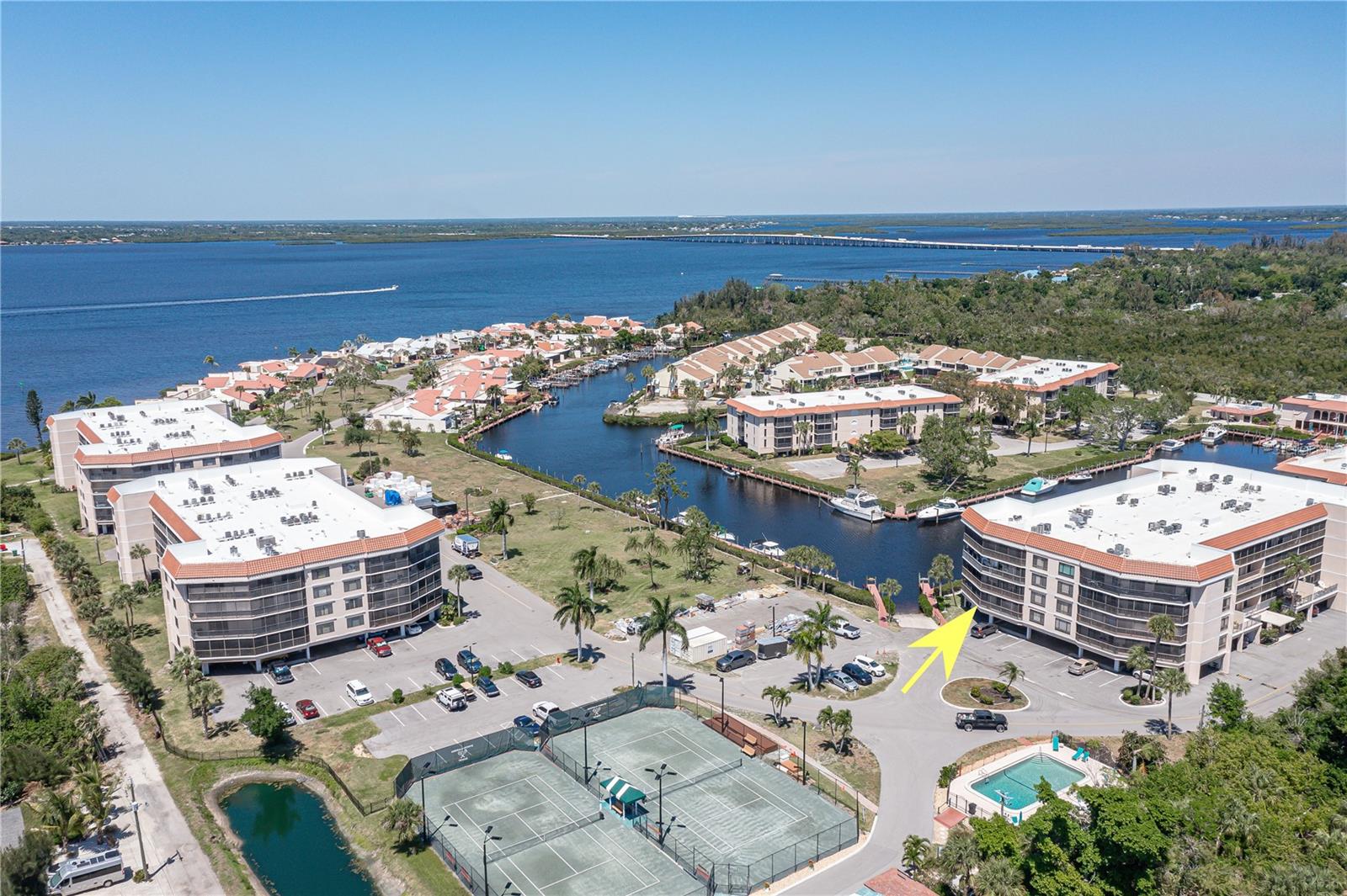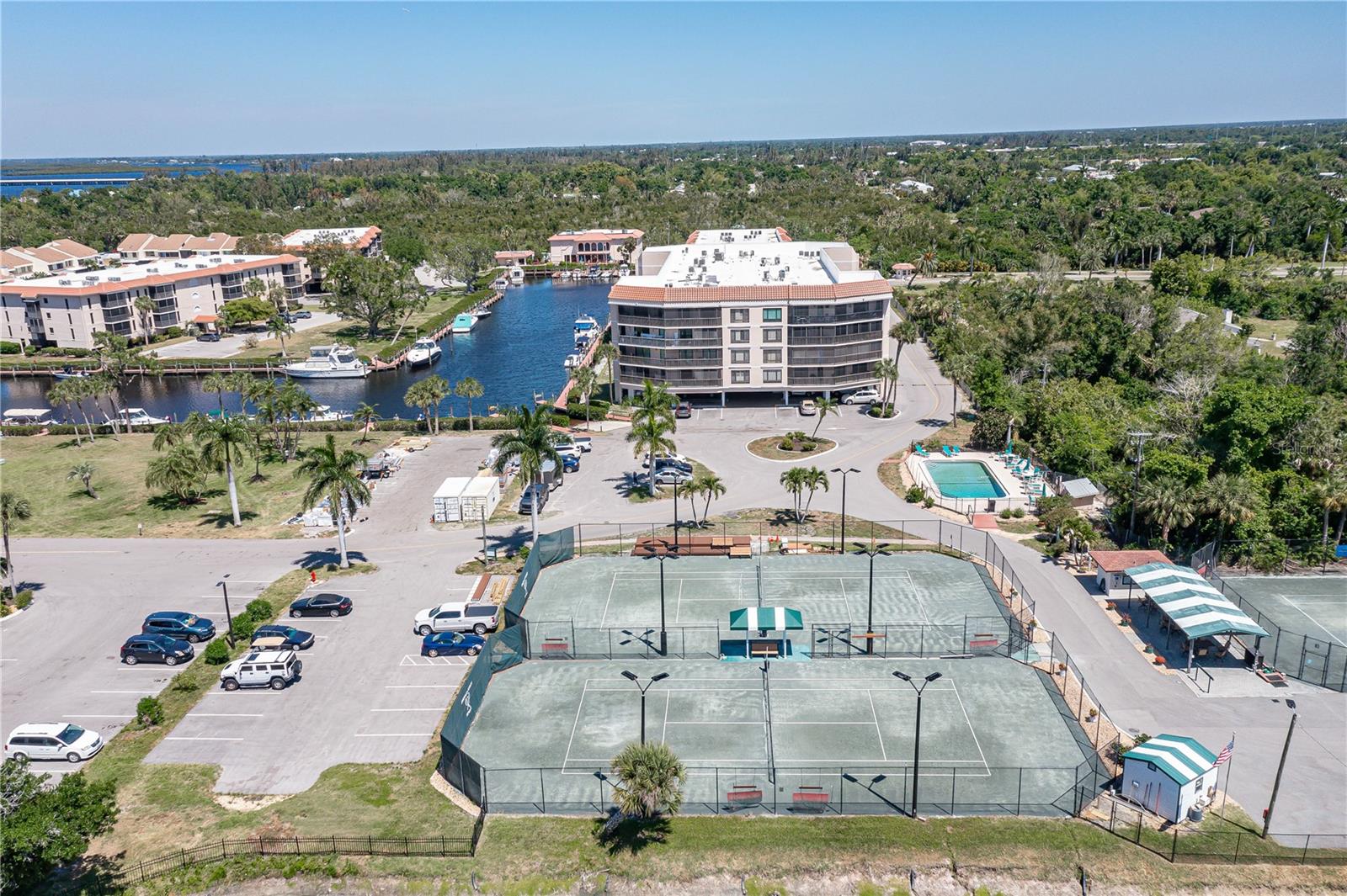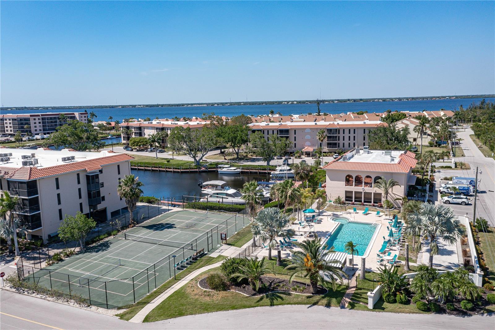 END-UNIT CONDO W/FABULOUS CANAL VIEW AT EMERALD POINTE! Looking for a place that feels like an all-inclusive resort? Look no further...this 3 bed/2 bath, corner unit w/over 2,100 sq ft of living space at the gated community of Emerald Pointe HAS IT ALL! Spectacular water front view, Charlotte Harbor and Gulf boating access, spacious open floor plan w/living room & formal dining room w/a wall of storage, tons of additional storage, large bedrooms, wet bar & chef's kitchen. Resort-like amenities include full-time tennis pro w/4 Har-Tru clay tennis courts, pickleball courts, as well as Bocce ball, putting green, three swimming pools, a clubhouse & a fitness center. There's also the marina w/dock space available. Bring your boat and keep it just steps away. Dock space INCLUDED with HOA dues! Reach open water in mere minutes & enjoy some of the best fishing & boating in SW Florida. At time of listing, dock space is available. Community also has an active social calendar w/book clubs, bridge group, poker night, a crafting group and so much more that makes everyday feel like you're on vacation! This corner unit is flooded w/natural light thanks to large picture windows & multiple sliding glass doors. Living room has a wet bar & fireplace plus amazing canal view. Kitchen offers a breakfast bar, pantry plus ample cabinet & counter space. The adjacent breakfast area features front row seat to the lovely canal view. Large master suite offers an oversized, walk-in closet & private master bath plus walk-out access to the screened lanai. Unit comes w/an assigned, under-building parking space, private storage closet next to unit, & two storage lockers near parking spot. UPDATES include new range (2020), new wine cooler (2017), new mini-refrigerator (2022), new dishwasher (2022) & new AC (2020). Reasonable condo fees include all that you'd expect plus basic cable, internet, water & trash. There is a credit to monthly fees for 2025 of $169 per month due to over-payment for previous special assessments regarding Hurricane Ian, resulting in monthly fees of about $600 / month. There are currently no special assessments outstanding for the building. Management office on site. Make appointment today.