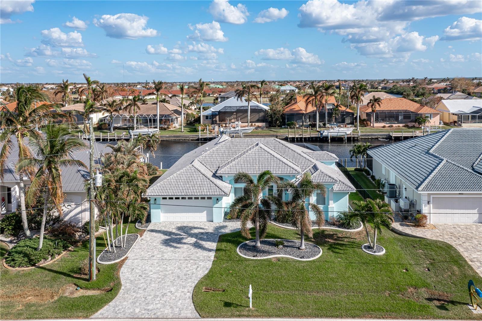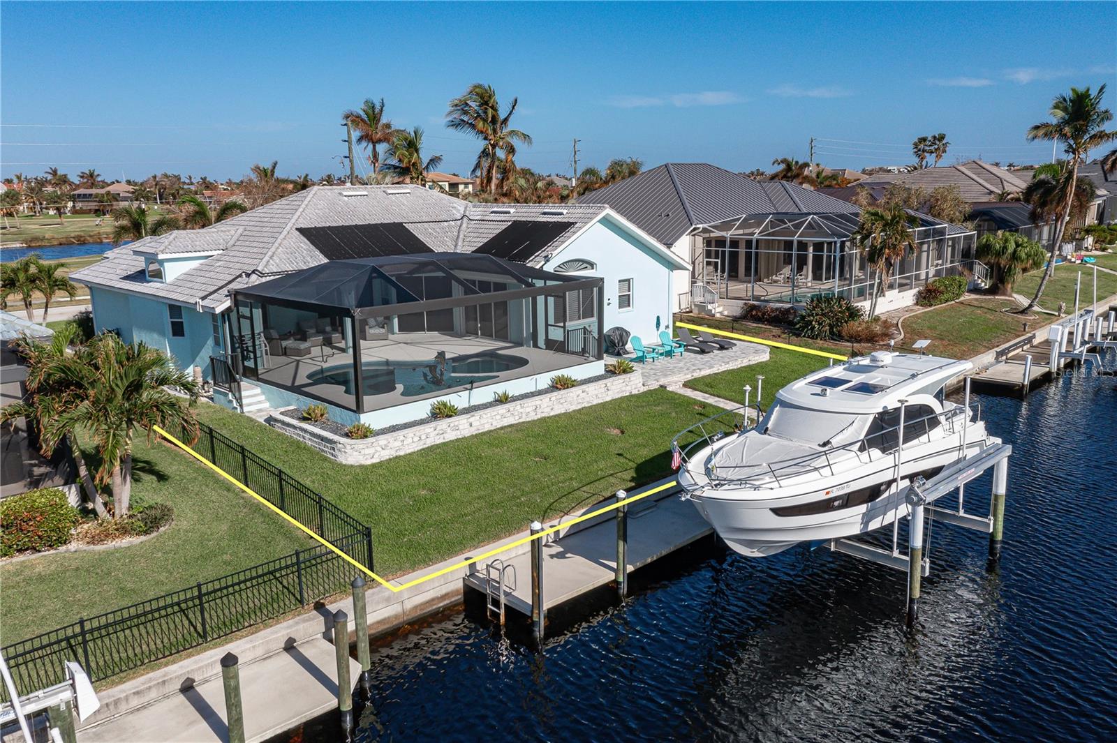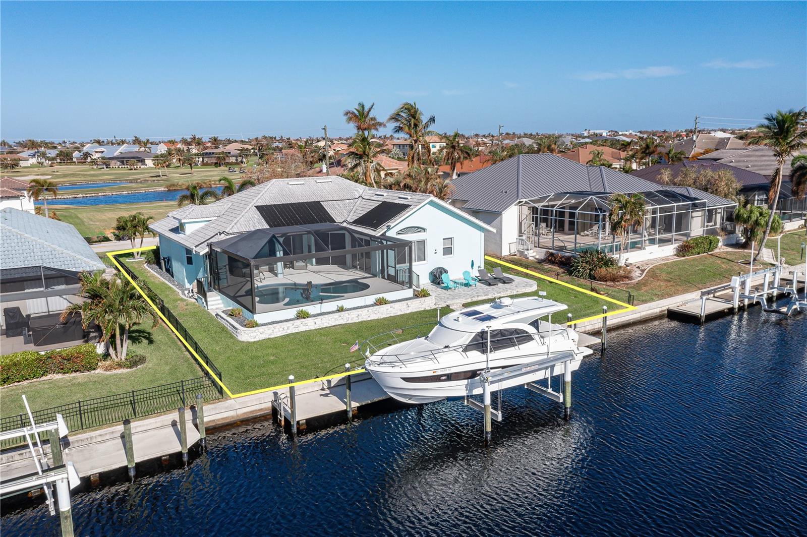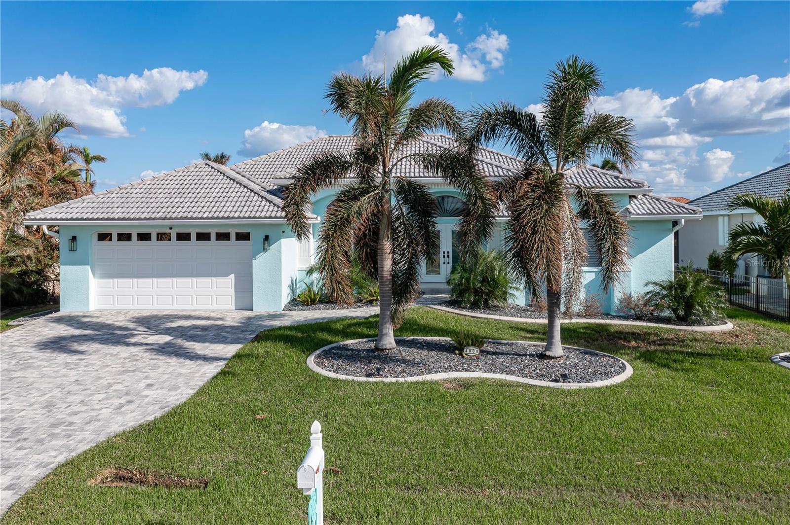 GORGEOUS, WATERFRONT HOME IN PGI W/10 FT ELEVATION, 84 FT OF SEAWALL & QUICK SAIL ACCESS TO CHARLOTTE HARBOR - This beautifully updated, 3 bed/2.5 bath home HAS IT ALL - nearly 2,300 sq ft of living space, 84 ft of seawall, extended concrete dock w/boat lift & sailboat access to Charlotte Harbor. The property is located on a wider than average canal with a great turning basin. Step through the beautiful (hurricane rated) double doors w/inlaid glass to discover a spacious, open floor plan w/formal living room, dining room & separate family room. The home has been completely updated w/new luxury vinyl plank flooring throughout most of the home (carpet in master bed), gorgeous kitchen & baths w/top-of-the-line counters and appliances plus new plantation shutters & all new exterior paint, soffits & gutters. Other architectural details include cathedral ceilings, disappearing sliding glass doors in the living room & family room that seamlessly blend the indoor & outdoor living spaces, transom windows above windows & sliders & decorative plant shelves. Kitchen is the heart of the home & a chef's dream w/quartz counters, NEW GE stainless steel appliances including a convection oven & induction cook top plus a breakfast bar w/pendant lighting. An adjacent breakfast area gives you more options for dining while offering a pool & canal view. Kitchen also opens to the large family room for easy entertaining. The split bedroom floor plan boasts large bedrooms including a private owner's retreat w/spa-like bath, an oversized walk-in closet & walk-out access to the lanai. The master bath has dual sinks, custom vanity w/quartz top, private WC, modern soaking tub & walk-in tile shower w/detachable shower head. The large guest rooms share a beautifully updated guest bath w/walk-in tiled shower. Outside, the large lanai has an in-ground, solar-heated pool & PLENTY OF ROOM for outdoor entertaining. In addition to the screened lanai, the home boasts a large, open-air brick paver patio designed for soaking of the Florida sun as well as giving you the perfect place to BBQ! The fenced backyard leads to an extended, 60ft concrete dock w/20,000 lb, REMOTE-CONTROLLED gear driven boat lift. Water & electric hook-ups are available dockside. Additional updates include completely NEW A/C (including duct work, handler & compressor), NEW paver patio & walkway to dock (2023), NEW pool cage w/panoramic screens, refinished pool deck (2023), NEW pool pump & filter (2023), resurfaced pool w/NEW glass waterline tile for pool & fountain (2023), NEW 20,000 lb boat lift (2024), NEW paver driveway (2024), NEW water heater (2021) & NEW remote-controlled Kevlar hurricane screens on lanai (2023). Other amenities include attached two-car garage, WHOLE HOUSE HURRICANE PROTECTION (mix of impact windows, roll down shutters & Kevlar screens), water softener & well-maintained tropical landscaping that surrounds the home. No expense was spared during renovations. This home is move-in ready. Make an appointment today & be prepared to fall in love! FURNITURE NEGOTIABLE - AVAILABLE TURNKEY, IF DESIRED.