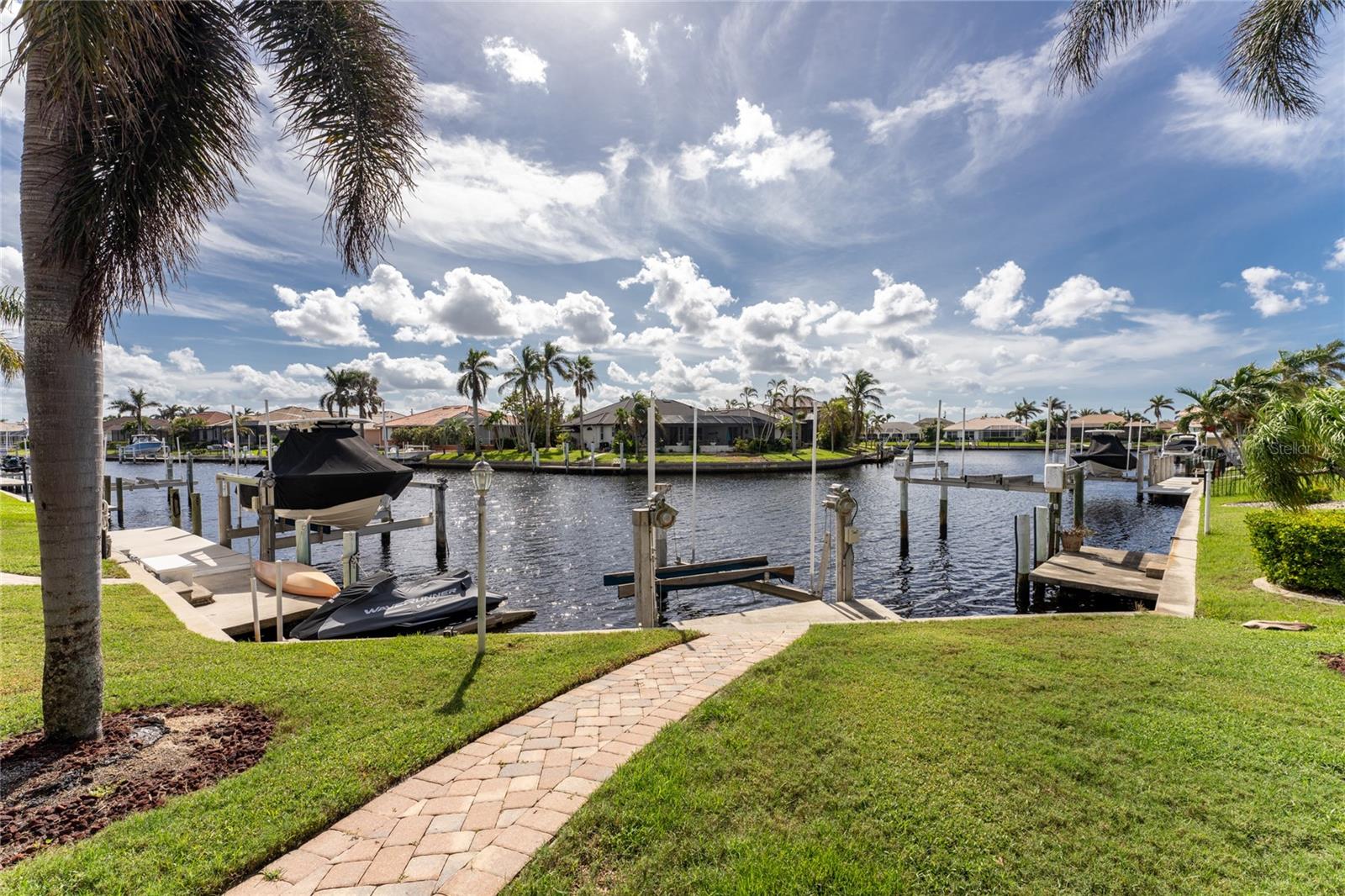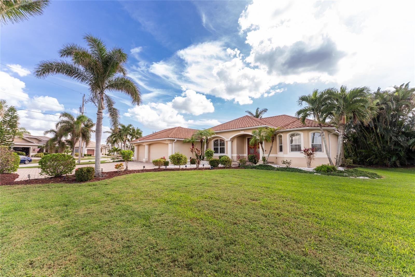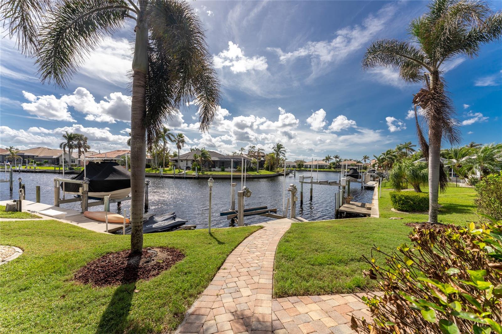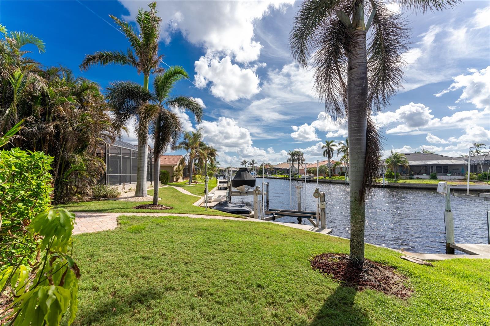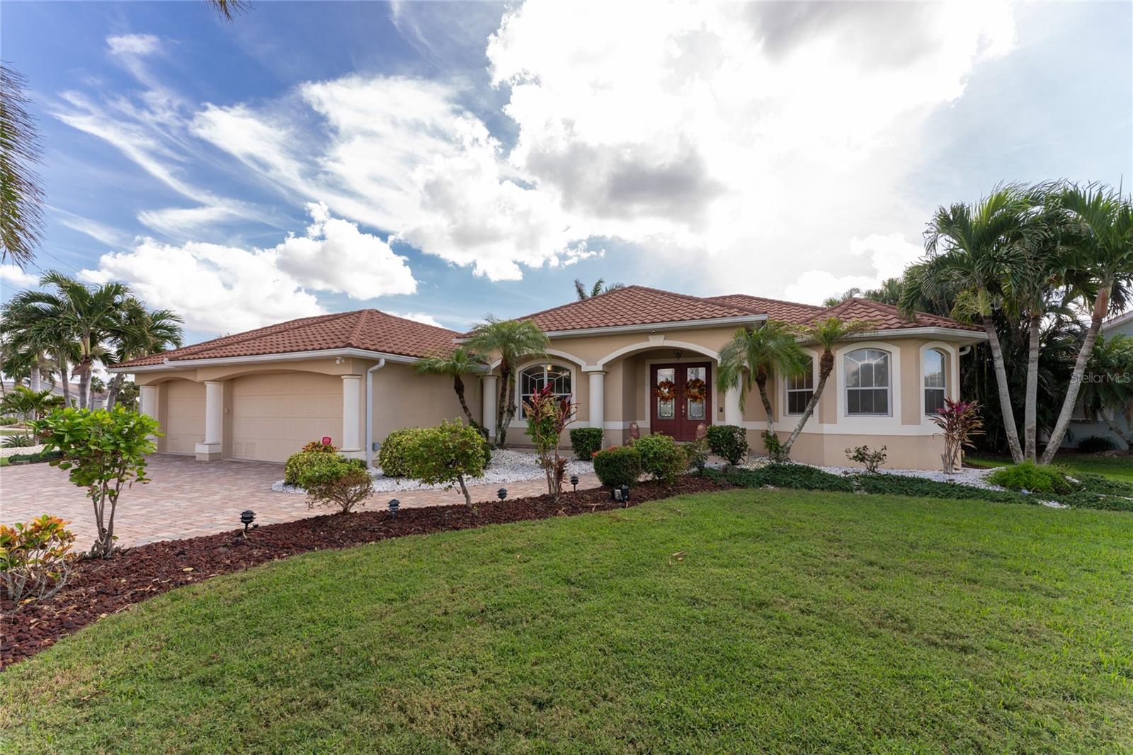SOUTHERN EXPOSURE...Experience the finest in Florida living with this custom-built waterfront pool home, located on an oversized corner lot in the desirable Burnt Store Isles golf community. With sailboat access (no bridges out) to Charlotte Harbor and the Gulf, this superbly crafted 2011 home offers 3 bedrooms, 2 bathrooms, a spacious 3-car garage, and 2,054 square feet of open, tiled living space. From the moment you arrive, you'll be captivated by the elegant landscaping, outdoor lighting, and brick paver driveway and pathways. Step through the etched glass double doors into a grand Great Room, featuring a soaring 14' lighted double tray ceiling and disappearing pocket sliding doors that reveal an inviting lanai and pool area. The thoughtfully designed Great Room also includes a dining area and deluxe kitchen, complete with high-end granite countertops, matching backsplash, stainless steel appliances, an extended breakfast bar, and a dinette with serene views of the outdoors. The master suite is a true retreat, offering private access to the pool, a walk-in closet, an additional large closet, and an en-suite bathroom featuring a jetted soaking tub, his-and-her granite vanities, a walk-in tiled shower, and a private toilet room. The split floor plan provides guests with two private bedrooms and a full guest bathroom, ensuring comfort and privacy for family and friends. Step outside through the 8' glass sliders to relax on the oversized lanai and enjoy the heated pool with built-in seating and table, a large covered lanai with storm shutters, and a sun deck area. This waterfront property includes a seawall, a concrete dock, and a 10,000 lb. boat lift for easy sailboat access to the Gulf. Additional features include an oversized 3-car garage, a laundry room with a granite countertop sink and pantry, irrigation system, security system, crown molding, designer tray ceilings, Accordion shutters on lanai, NEW METAL TILE ROOF 2024 and so much more. Burnt Store Isles (BSI) is a deed-restricted, waterfront and golfing community, with Twin Isles Country Club located right in the center of the neighborhood. Conveniently located close to I-75, US-41, Fishermen’s Village, and downtown Punta Gorda's shops, dining, and entertainment, this home is spotless and move-in ready. Come enjoy the Florida lifestyle at its finest in this impressive Burnt Store Isles residence!