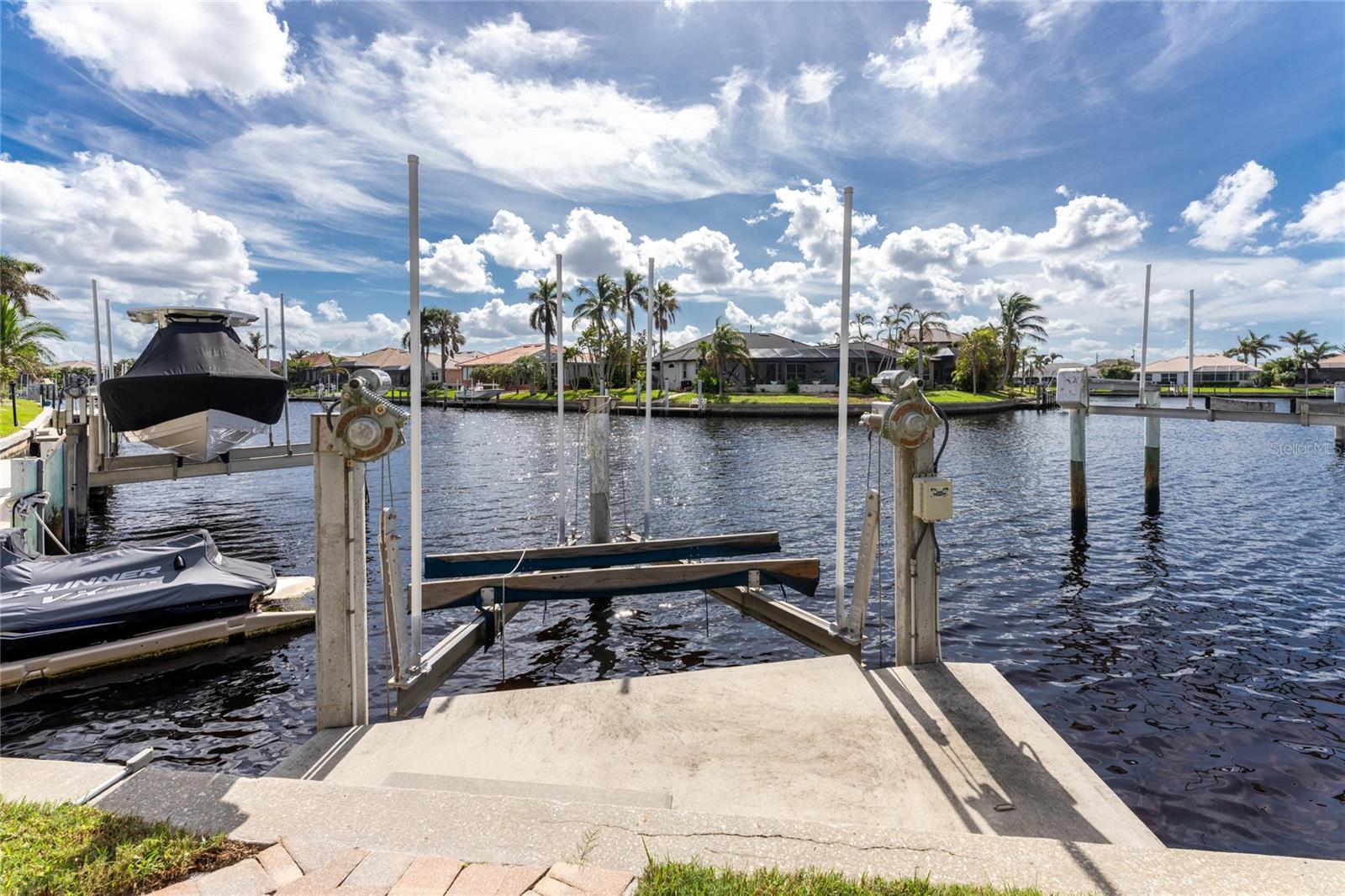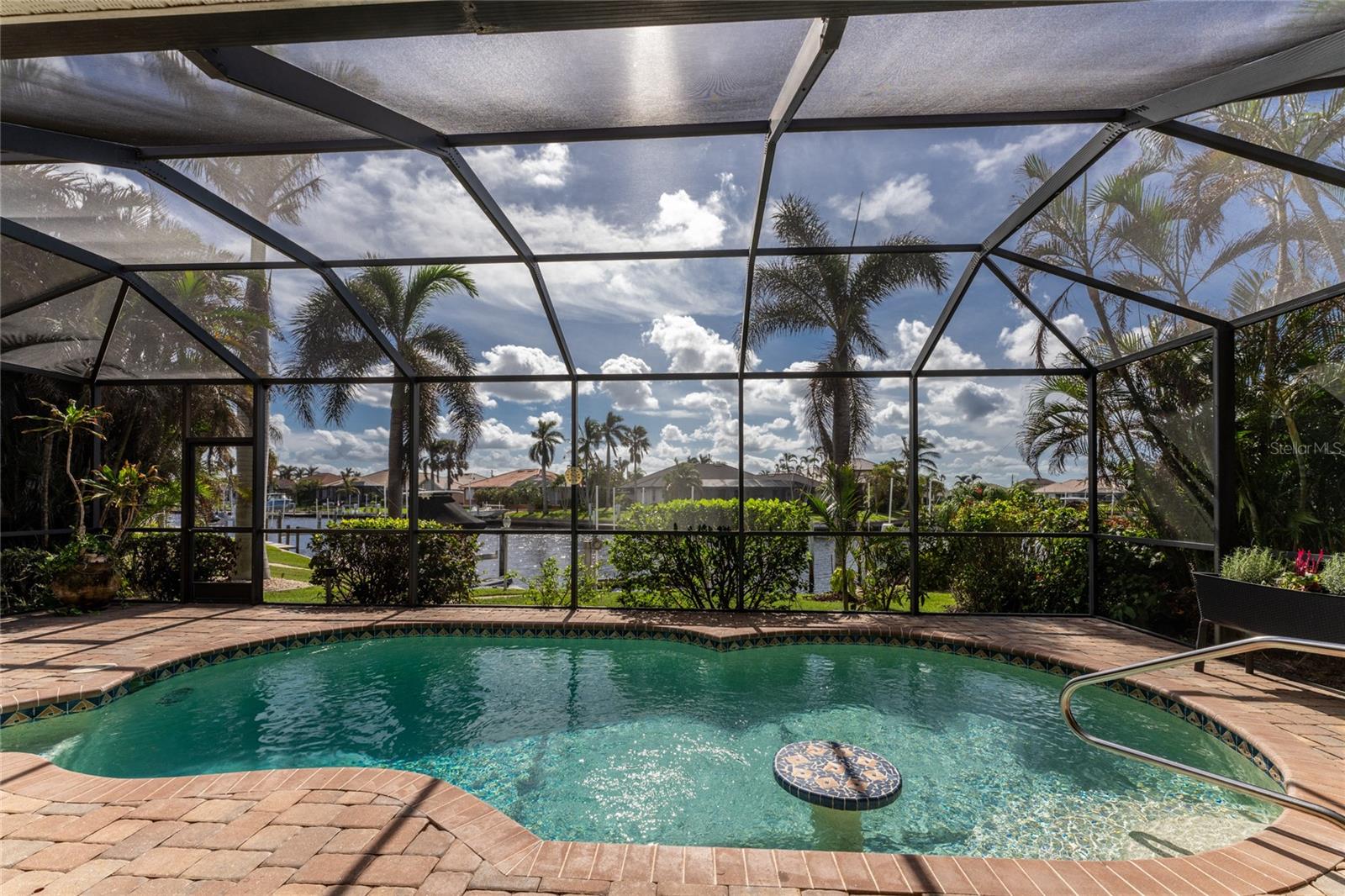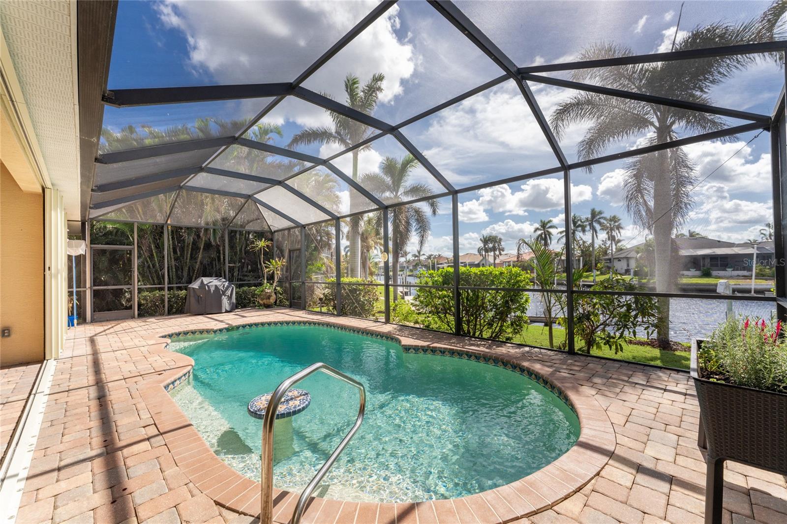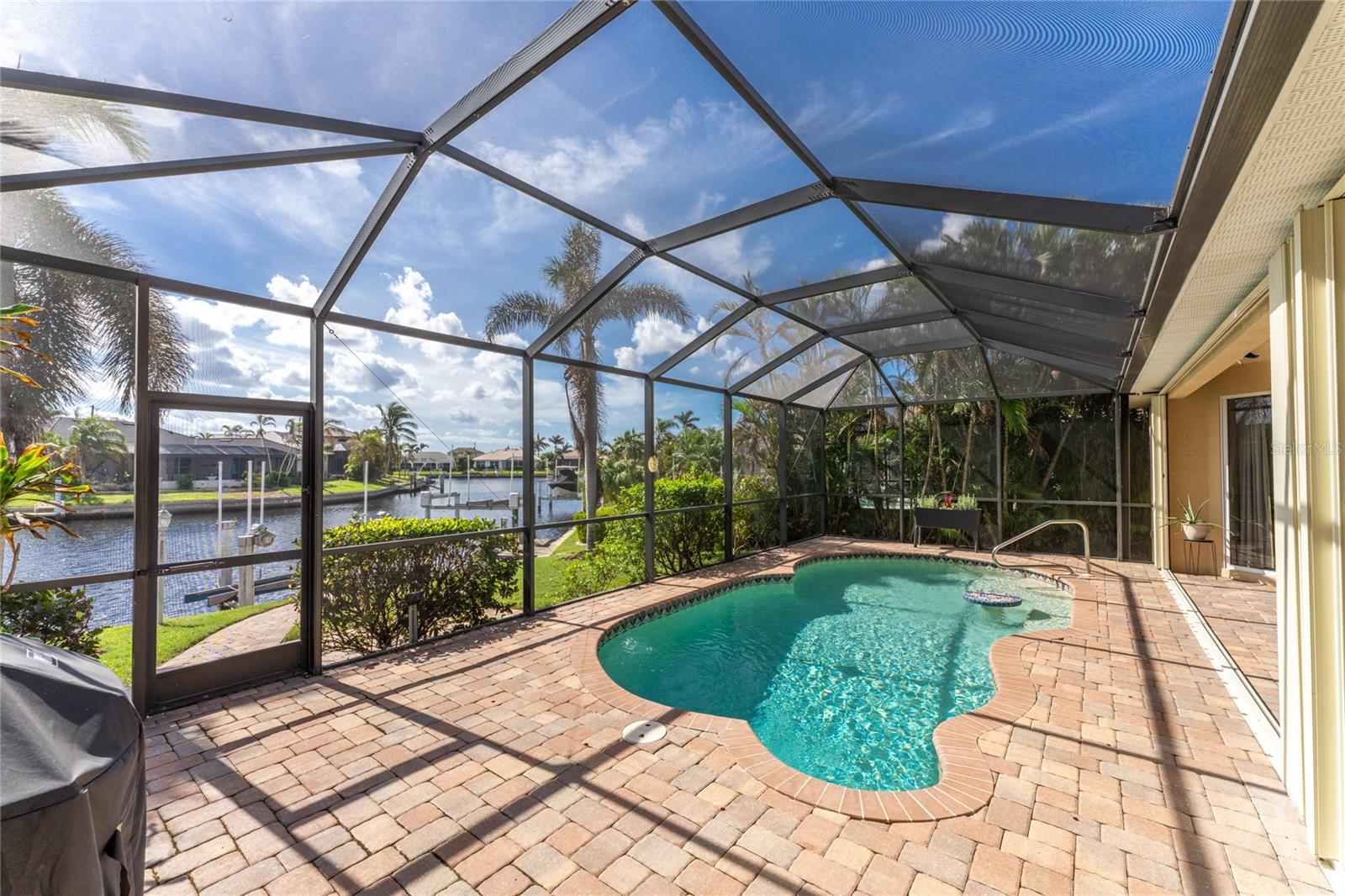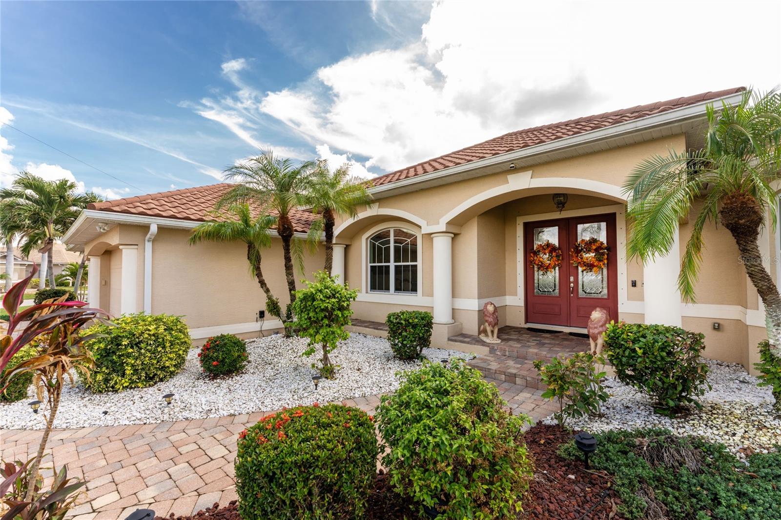 SOUTHERN EXPOSURE...Experience the finest in Florida living with this custom-built waterfront pool home, located on an oversized corner lot in the desirable Burnt Store Isles golf community. With sailboat access (no bridges out) to Charlotte Harbor and the Gulf, this superbly crafted 2011 home offers 3 bedrooms, 2 bathrooms, a spacious 3-car garage, and 2,054 square feet of open, tiled living space. From the moment you arrive, you'll be captivated by the elegant landscaping, outdoor lighting, and brick paver driveway and pathways. Step through the etched glass double doors into a grand Great Room, featuring a soaring 14' lighted double tray ceiling and disappearing pocket sliding doors that reveal an inviting lanai and pool area. The thoughtfully designed Great Room also includes a dining area and deluxe kitchen, complete with high-end granite countertops, matching backsplash, stainless steel appliances, an extended breakfast bar, and a dinette with serene views of the outdoors. The master suite is a true retreat, offering private access to the pool, a walk-in closet, an additional large closet, and an en-suite bathroom featuring a jetted soaking tub, his-and-her granite vanities, a walk-in tiled shower, and a private toilet room. The split floor plan provides guests with two private bedrooms and a full guest bathroom, ensuring comfort and privacy for family and friends. Step outside through the 8' glass sliders to relax on the oversized lanai and enjoy the heated pool with built-in seating and table, a large covered lanai with storm shutters, and a sun deck area. This waterfront property includes a seawall, a concrete dock, and a 10,000 lb. boat lift for easy sailboat access to the Gulf. Additional features include an oversized 3-car garage, a laundry room with a granite countertop sink and pantry, irrigation system, security system, crown molding, designer tray ceilings, Accordion shutters on lanai, NEW METAL TILE ROOF 2024 and so much more. Burnt Store Isles (BSI) is a deed-restricted, waterfront and golfing community, with Twin Isles Country Club located right in the center of the neighborhood. Conveniently located close to I-75, US-41, Fishermen’s Village, and downtown Punta Gorda's shops, dining, and entertainment, this home is spotless and move-in ready. Come enjoy the Florida lifestyle at its finest in this impressive Burnt Store Isles residence!
