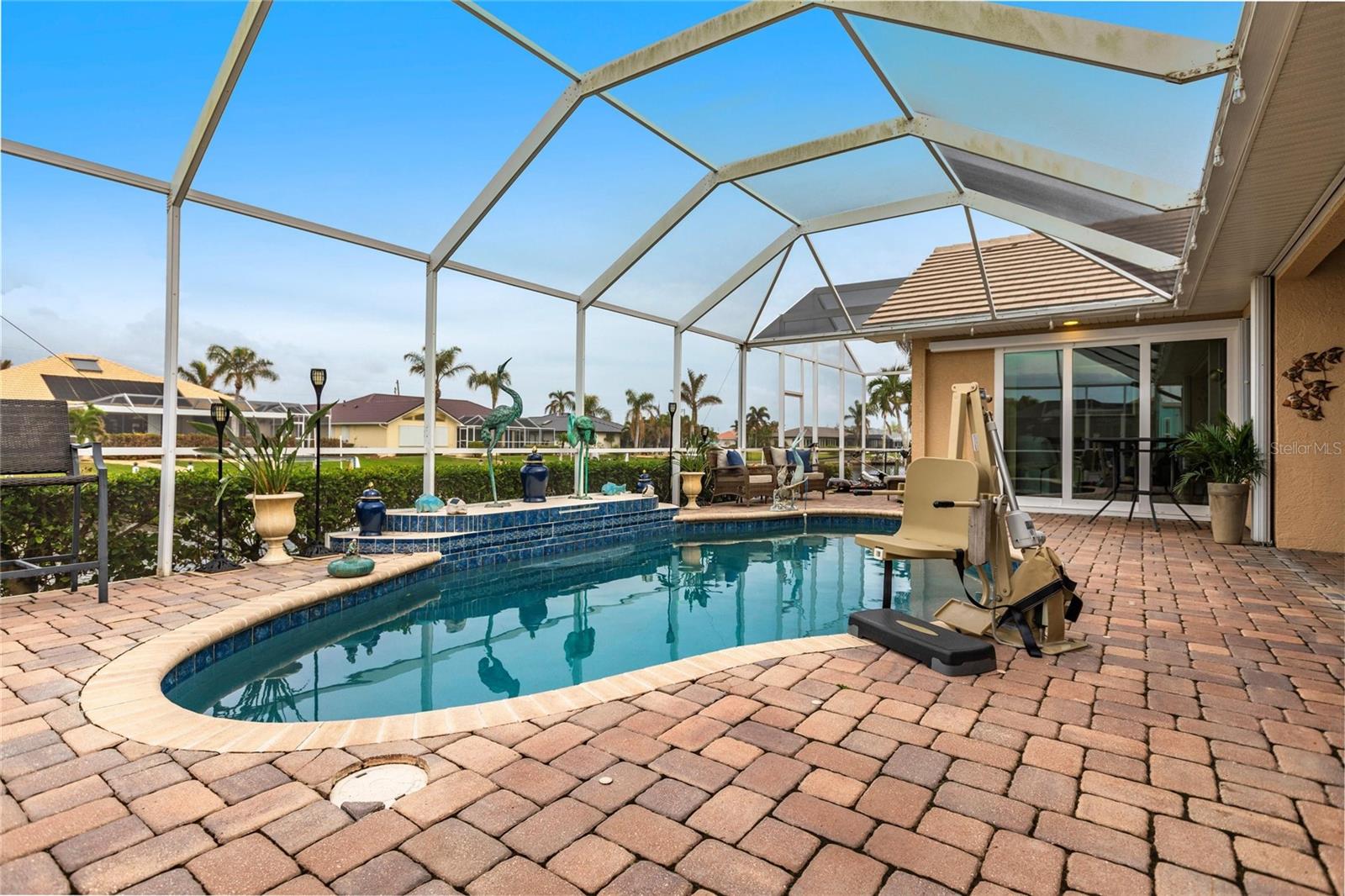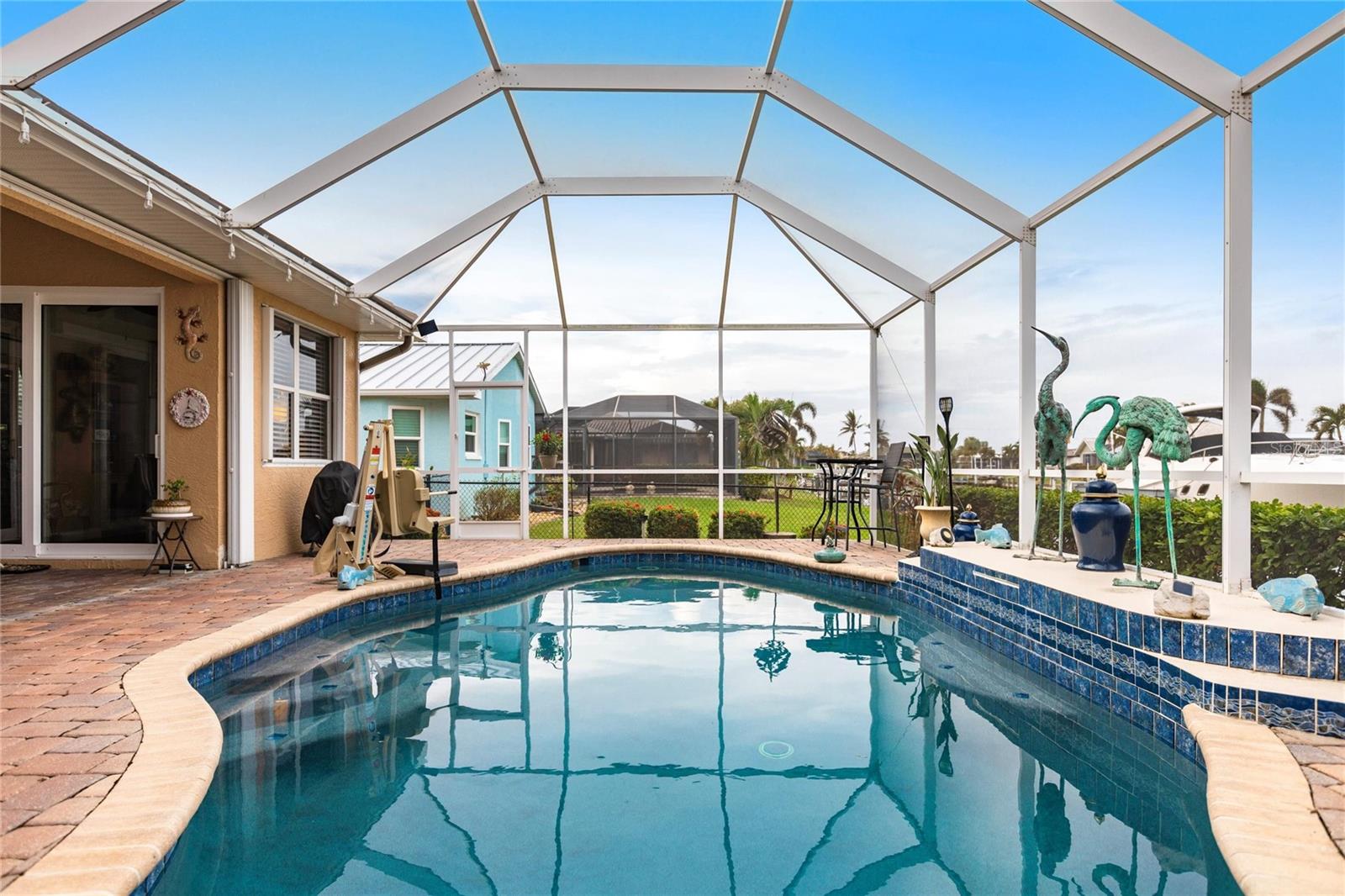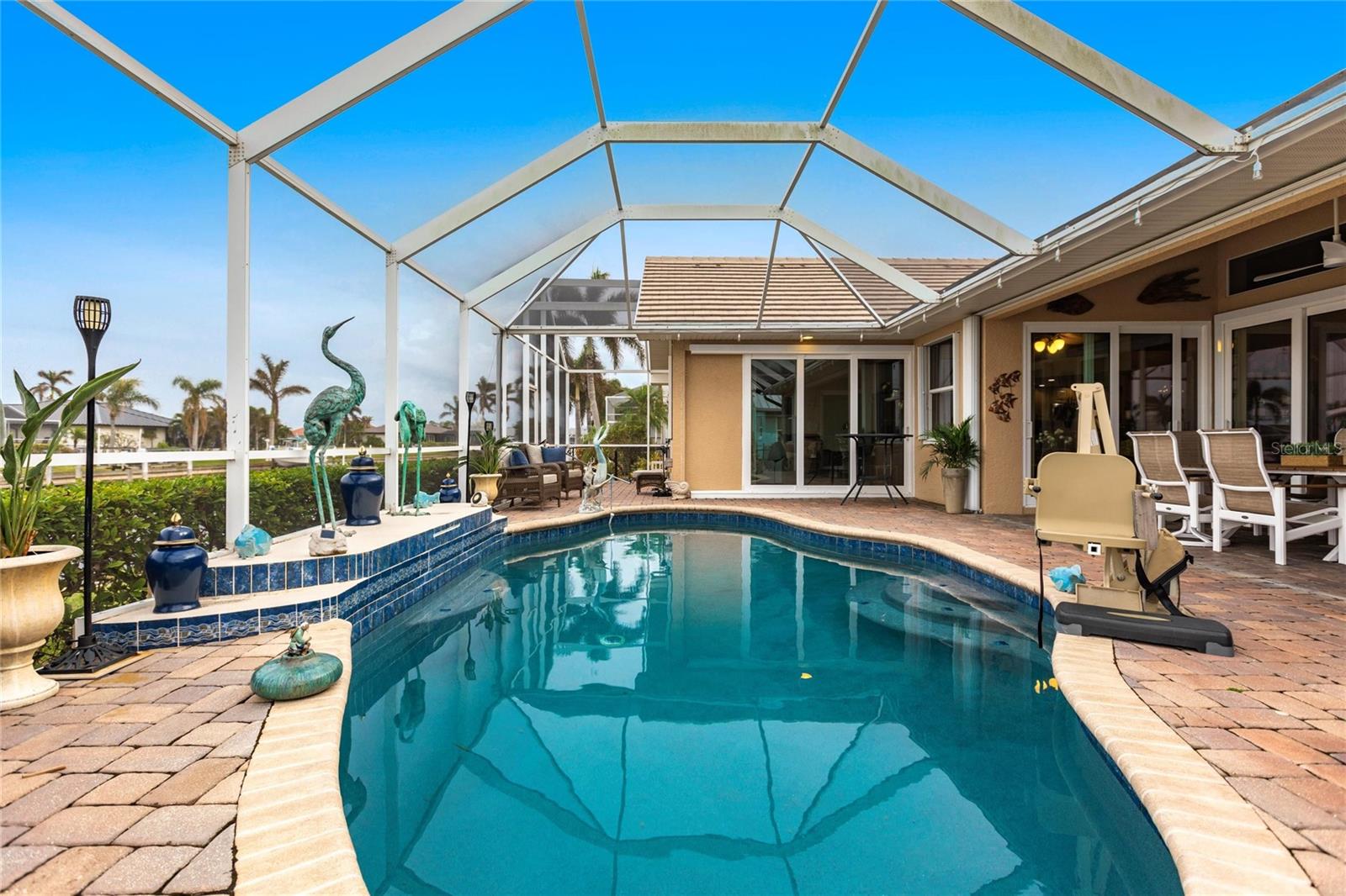 This spectacular home is a boater’s dream! This sailboat-access, waterfront, handicap-accessible pool home with 3 bedrooms and 2 baths offers direct access to beautiful Charlotte Harbor and the Gulf of Mexico. Bring your boat! With a concrete dock, city-maintained seawall, and 77 feet of water frontage, you’re just 10 minutes from open water. Designed to suit all ages, the home features a master bath equipped with grab bars, a comfort-height toilet with raised seat, and a doorless zero-entry shower. The garage includes a lift for wheelchair accessibility and ease of moving heavy items. A ramped lanai provides smooth entry, and a new pool lift offers effortless access in and out of the heated pool. The spacious guest suite accommodates a king-size bed, includes a walk-in closet, private bath also updated with new granite top vanity, hardware/fixtures and bonus room—ideal for a caregiver. With over 2,500 sq ft of living space, there’s room for everyone. Enjoy a living room, family room, dining area, large kitchen with casual dining, and lanai overlooking the water and pool. Invisible pocket sliders in the main living areas connect seamlessly to the lanai, blending indoor and outdoor living. Elegant touches include vaulted and tray ceilings, crown molding, tile and wood-look laminate flooring, accent walls, decorator lighting and fans, and a built-in entertainment center. The chef’s kitchen is a standout with rich wood cabinetry, closet pantry, stainless appliances (including wine fridge), stone countertops and backsplash, and an expansive breakfast bar that opens to the main living areas—perfect for entertaining. The casual dining area offers tranquil views of the pool and waterway, an ideal spot for morning coffee. Retreat to your luxurious master suite, complete with a versatile bonus room, private lanai access, two walk-in closets, and a beautifully updated en suite bath with a jetted soaking tub, walk-in shower, makeup vanity, new fixtures and hardware, and granite-topped wood cabinetry. The extended brick-paved lanai is perfect for relaxing and enjoying serene water views. Additional highlights include new whole-house storm protection, fencing, tile roof, irrigation system, and public water and sewer. Close to beaches, shopping, golf, dining, parks, trails, and boat ramps. Just minutes to historic downtown Punta Gorda and Fishermen’s Village. Quiet waterfront community with every convenience nearby. Claim your piece of Florida paradise!*PLEASE ENJOY THE 3D INTERACTIVE VIRTUAL TOUR ASSOCIATED WITH THIS LISTING