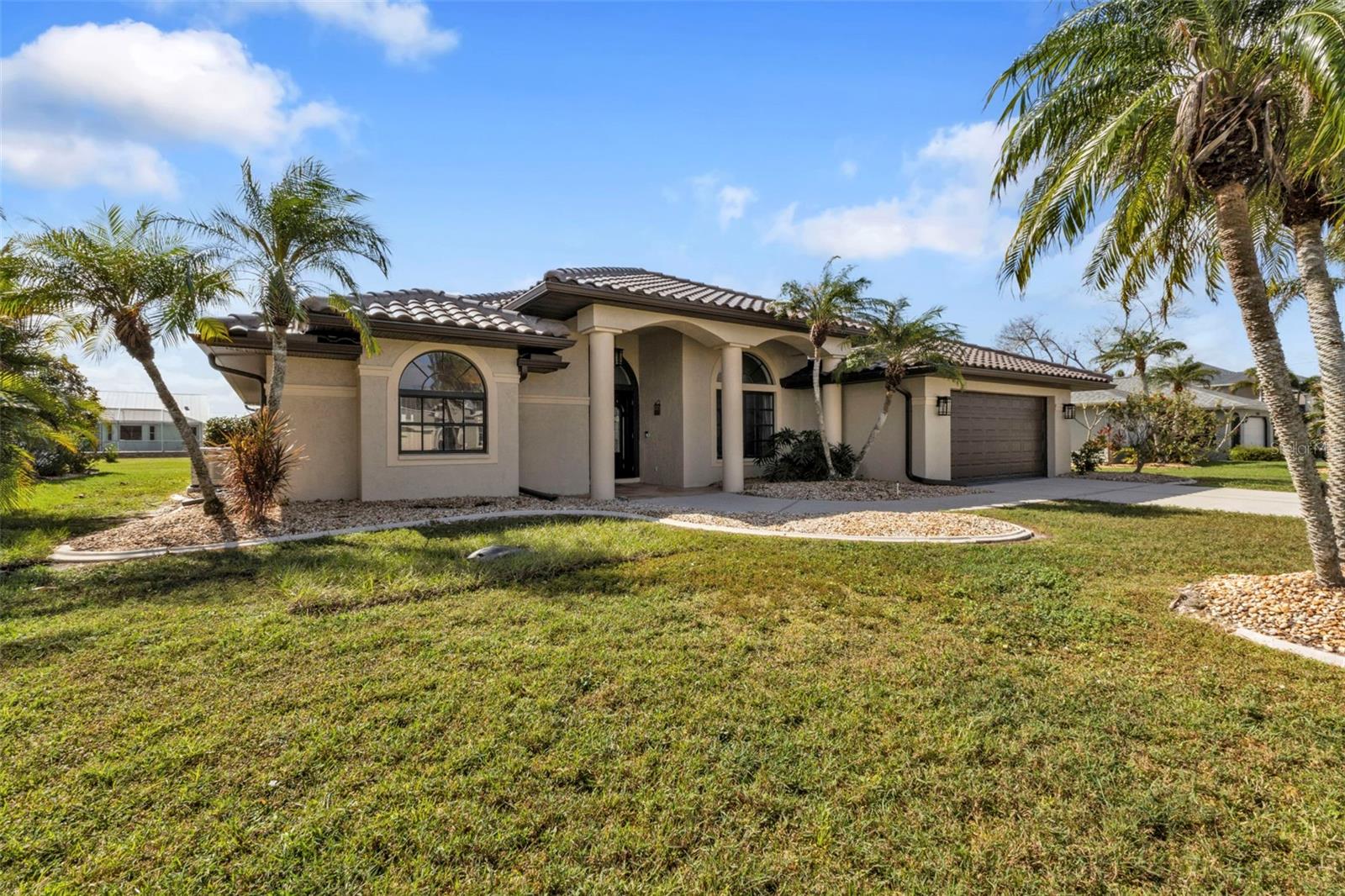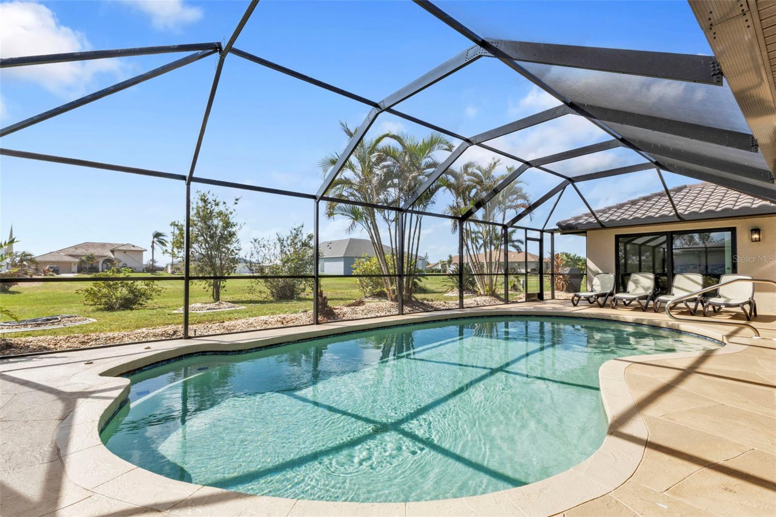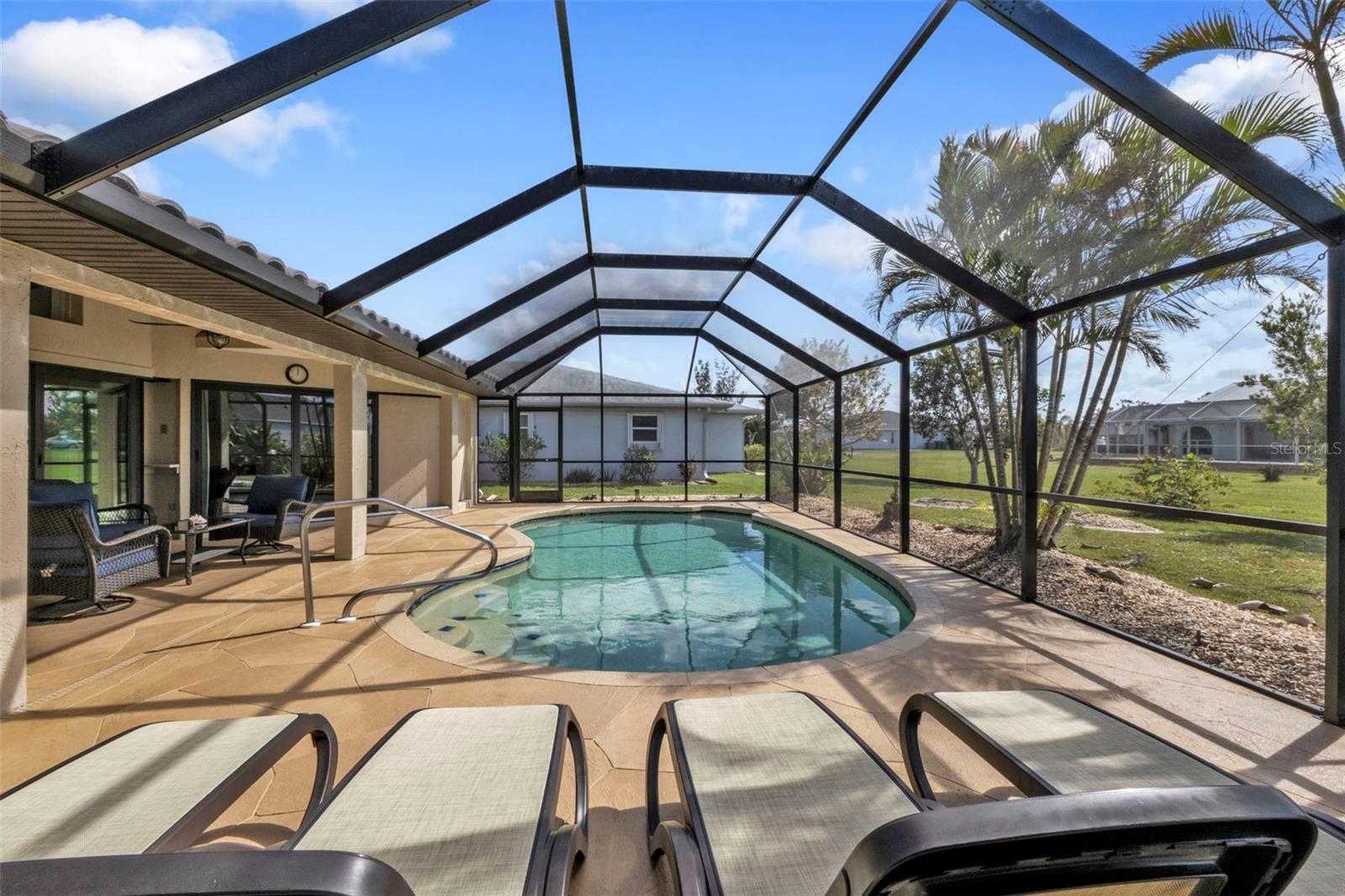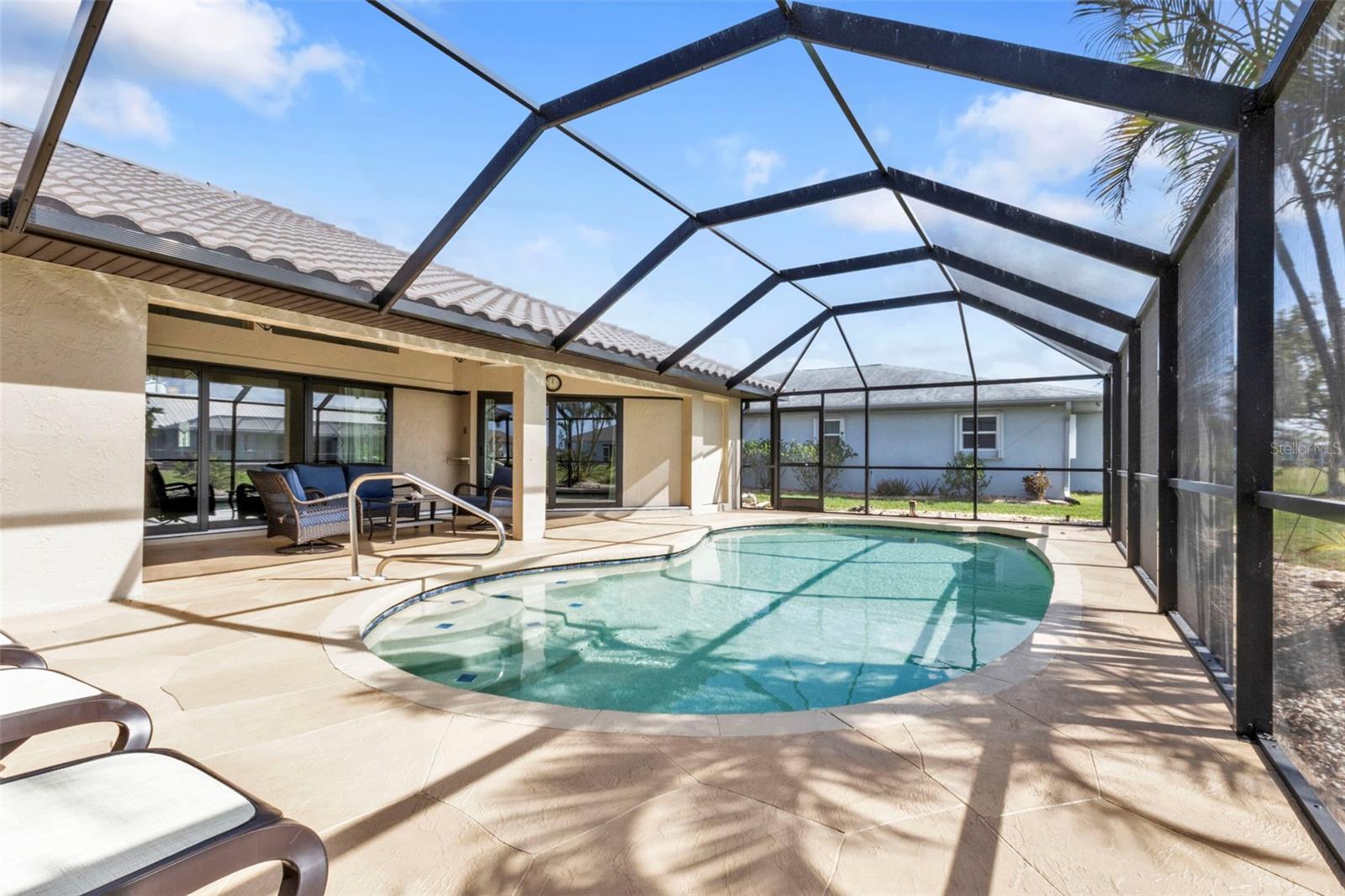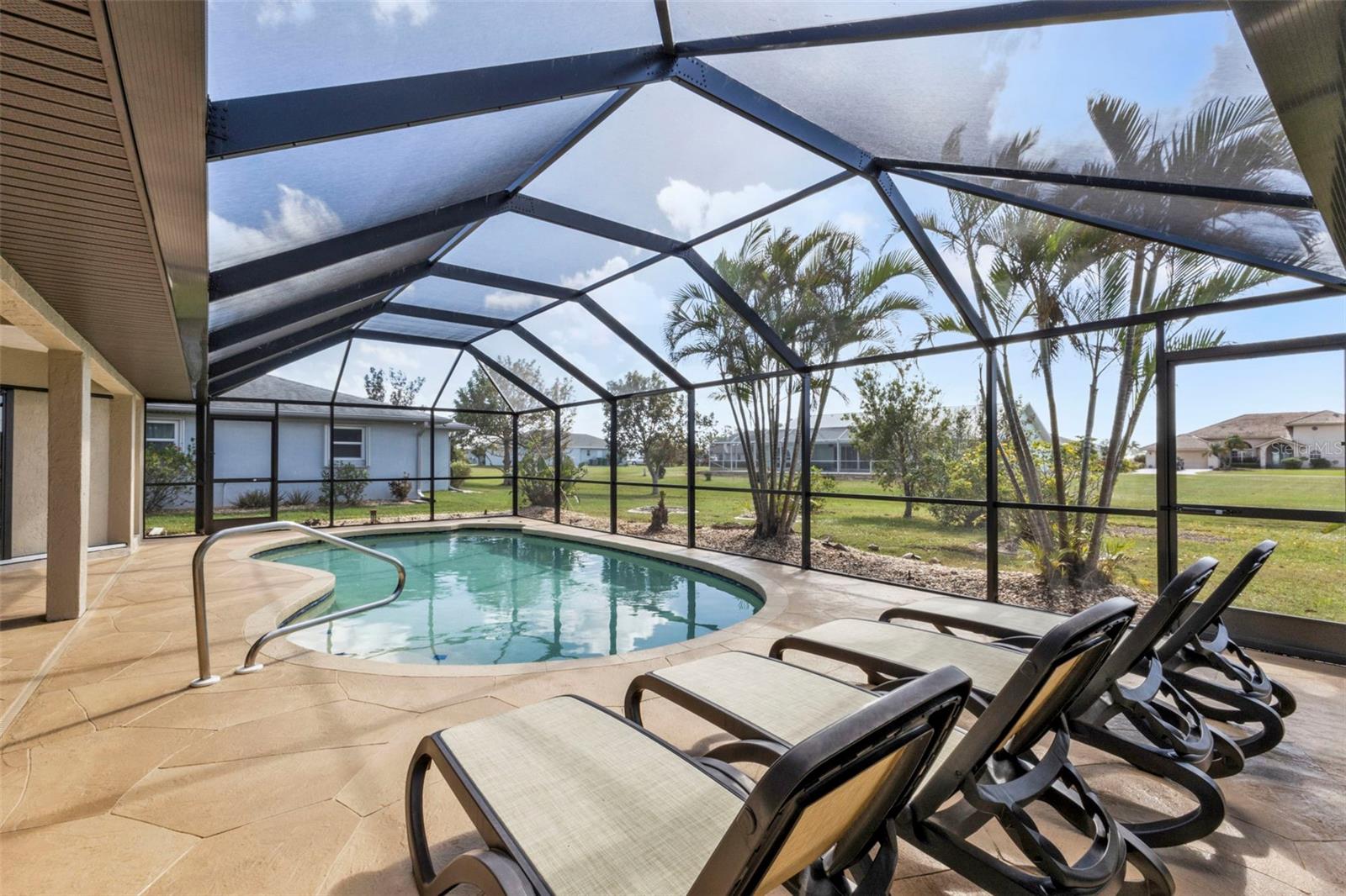 Welcome to the quiet, sought after community of Deep Creek in Punta Gorda, Florida. This beautiful home has great curb appeal. With NEW BARREL TILE ROOF, NEW SOFFITS, FASCIA AND GUTTERS, NEW EXTERIOR PAINT, NEW IMPACT SLIDERS AND A NEW WHOLE HOUSE GENERATOR, this home is move in ready and NOT IN FLOOD ZONE!!! As you enter the NEW double front door, you will see the large living area overlooking the beautiful pool with NEW decking and a NEW POOL CAGE with screened lanai. The New impact hide-away sliders will be great for all your entertaining needs. This beautifully maintained home has 3 bedrooms, 2 baths with an mini split A/C system in the 2 car garage. The garage also has a new hurricane garage door. This split floor plan has opened living area with privacy for your guest rooms and primary bedroom. The primary bedroom is huge! Enough space for your office or sitting area as well as your private ensuite bath. This entire house is protected with a NEW WHOLE HOUSE GENERATOR. The Deep Creek community has a public golf course, dining, shopping and restaurants. Close to I-75 you are close to the Punta Gorda airport, beaches, and boating. PLEASE PUT ON PROVIDED BOOTIES FOR YOUR SHOES. THANK YOU!!