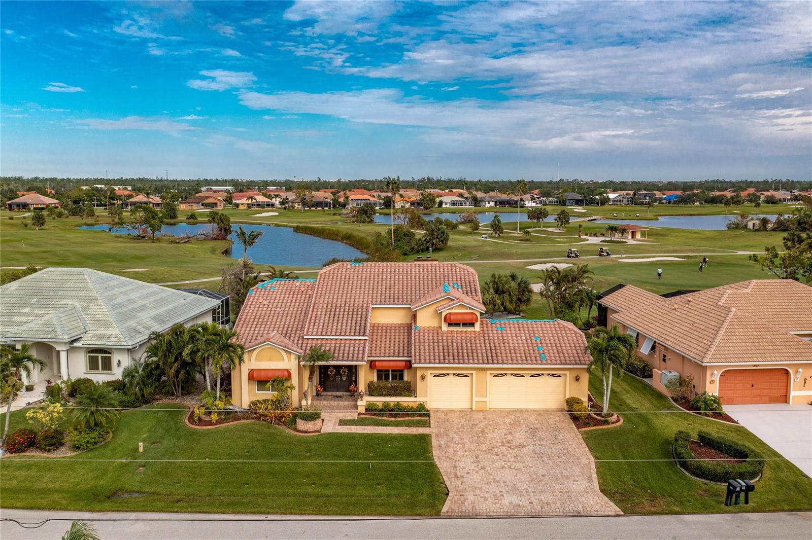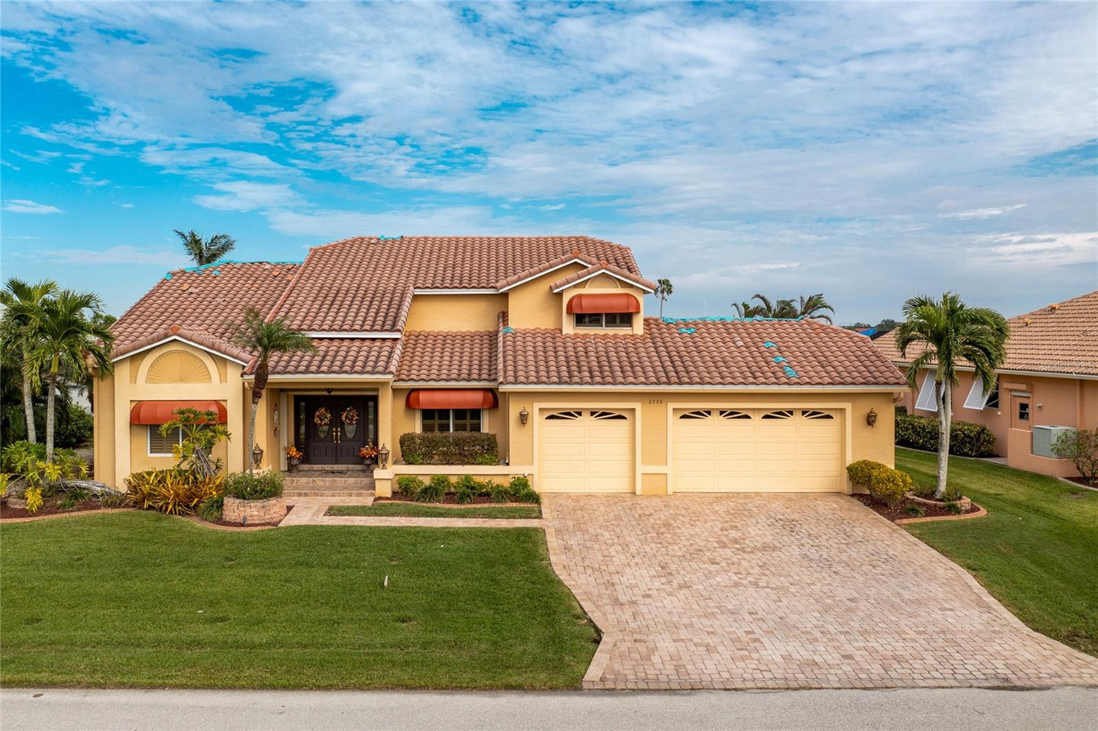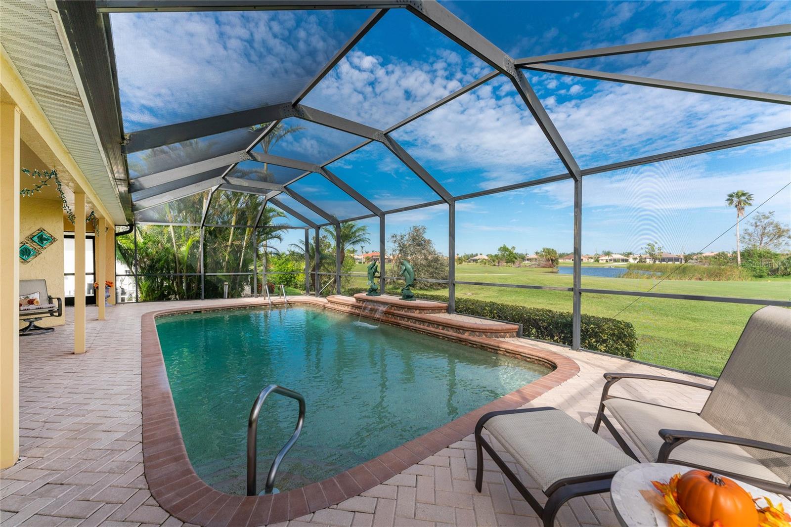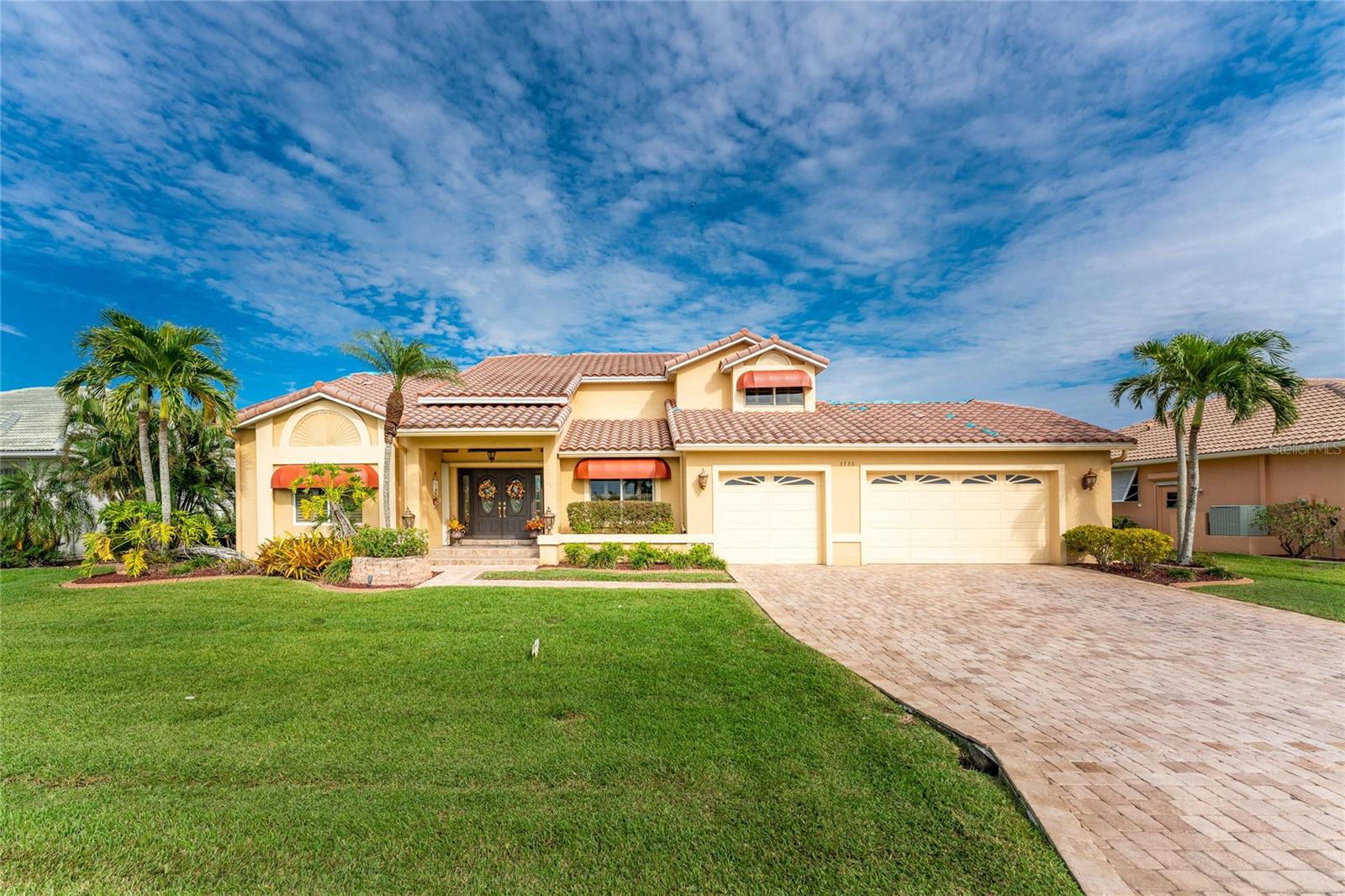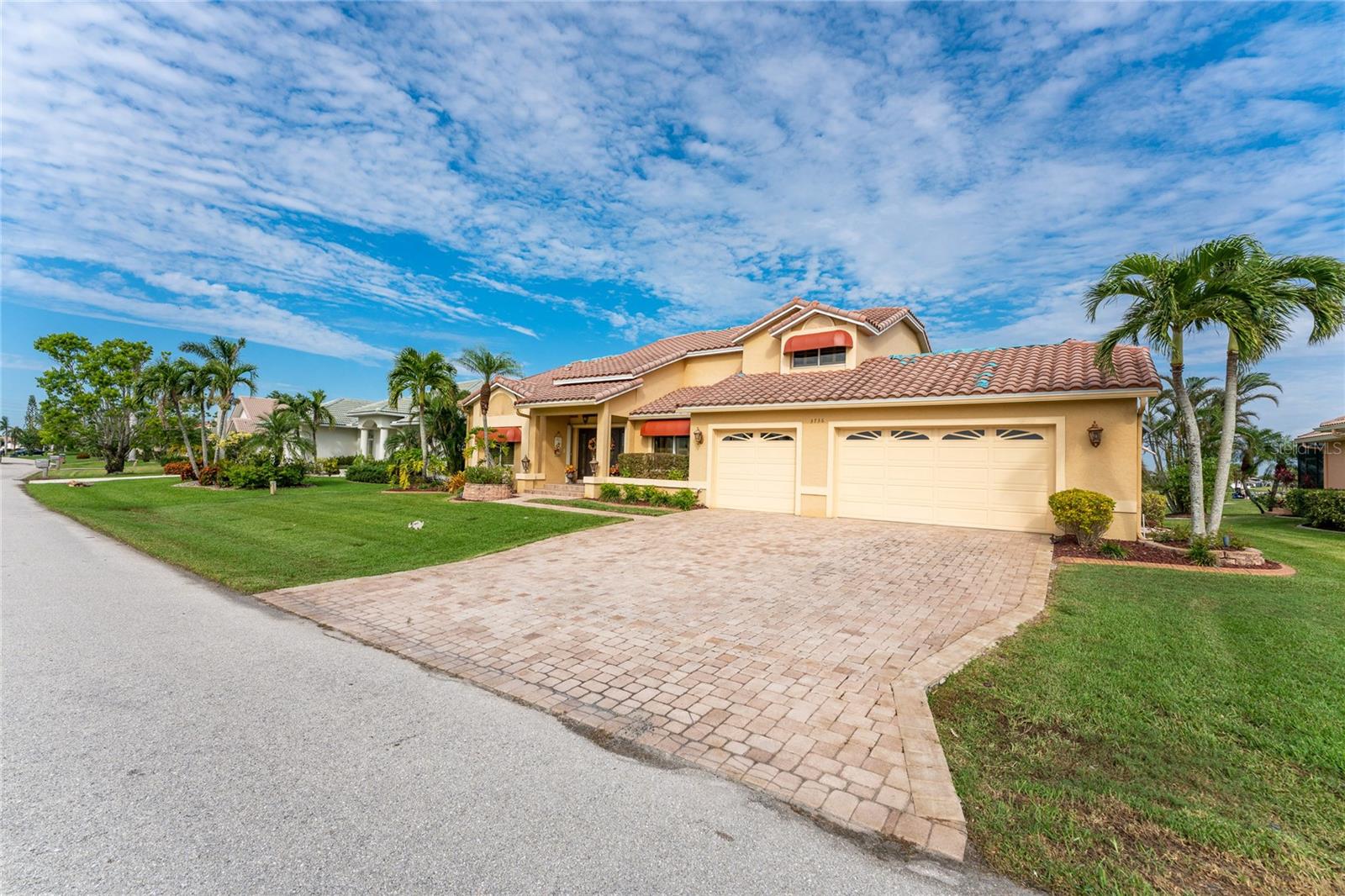 Stunning 3 Bedroom, 3.5 Bathroom plus Loft Bonus Room and 3 Car Garage with cabinets. Located on Twin Isles GOLF COURSE in desirable deed restricted BURNT STORE ISLES. *** TURNKEY FURNISHED*** This light and bright 2 story home offers an open and split bedroom floor plan with Great Room, Family Room with wood burning fireplace, formal Dining Room, well appointed Kitchen, Inside Laundry, second floor large Loft Bonus Room. Beautiful design features throughout. The Kitchen features a wood cabinet, granite counters, walk in pantry, breakfast bar, center island and dining area with wet bar. The Inside Laundry Room has a washer, dryer and laundry tub. There is a half bath off the Kitchen. The Master Bedroom suite on the second floor offers wood flooring, TWO walk in closets, private 17x7 screened balcony with awesome golf course views, wood burning fireplace and private bathroom with dual sinks, jetted tub, separate walk in shower. There is a 6x6 sewing room with wood floor. The guest bedrooms are also spacious, have wood floors and one bedroom has a walk in closet, the other has a double closet. One of the guest bedrooms is on the second floor. The second floor loft bonus room has an area used as an office and the other space is a fitness area. Large storage space. Your living space extends to the screened lanai and pool area with paver deck, large covered area, outdoor shower, outside bath access and ingound pool with fountain. Fabulous GOLF COURSE VIEW! Other features include: double door entry with transom window, plantation shutters, barrel tile roof, brick paver driveway and walkway. Utilities are city water and sewer. Per Sellers: ***NEW ROOF November 2023, NEW A/C 2019, NEW Refrigerator 2018, NEW Washer and Dryer 2017, NEW HWH (garage) 2022, NEW HWH (second floor) 2017. This home is minutes from Golf, Fishermen's Village and historic downtown Punta Gorda shopping, dining, medical care, waterfront parks, boat ramps, fishing piers, Charlotte Harbor Event Center, art galleries, walking and biking paths, weekend farmers markets, events and more!