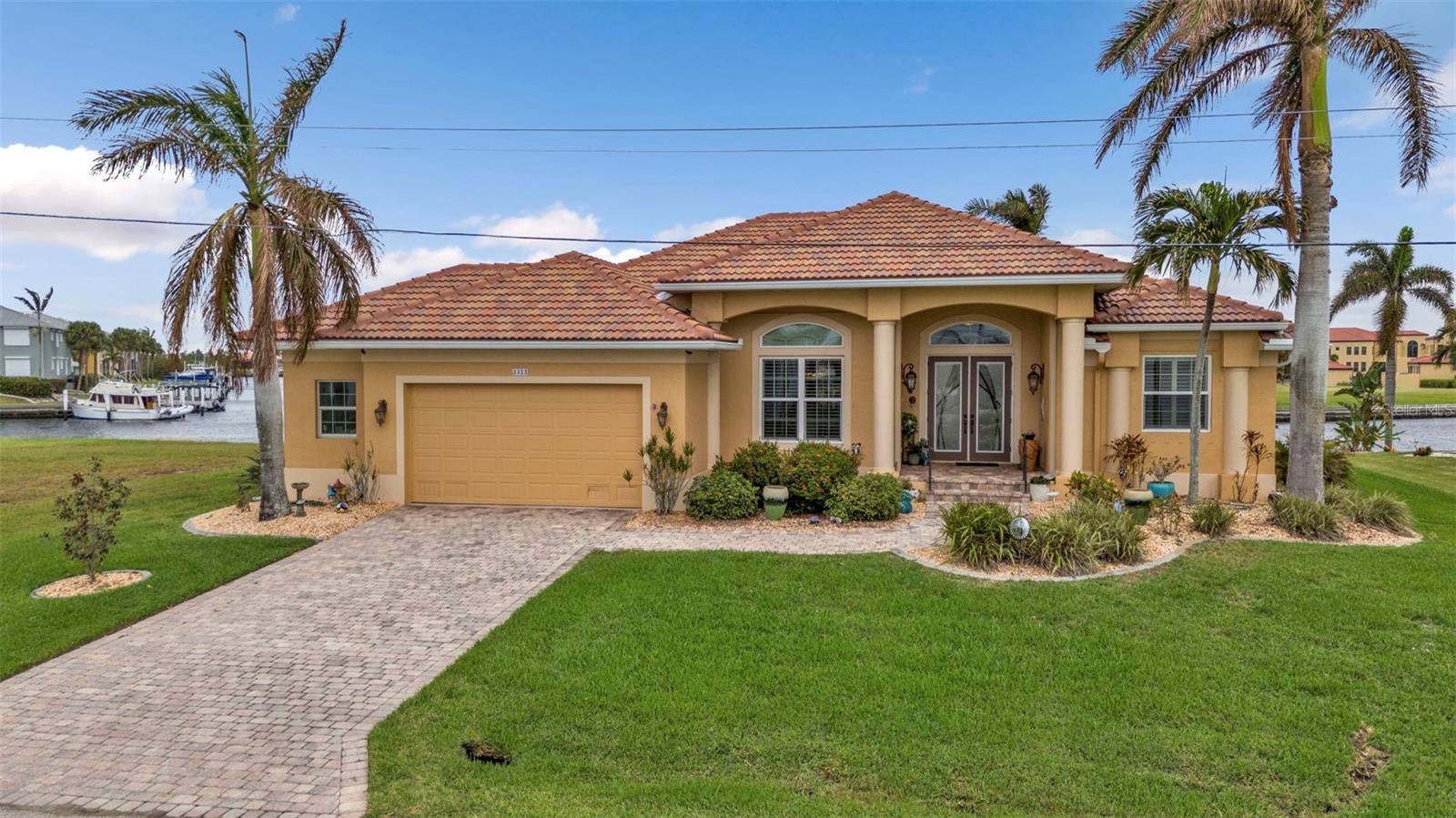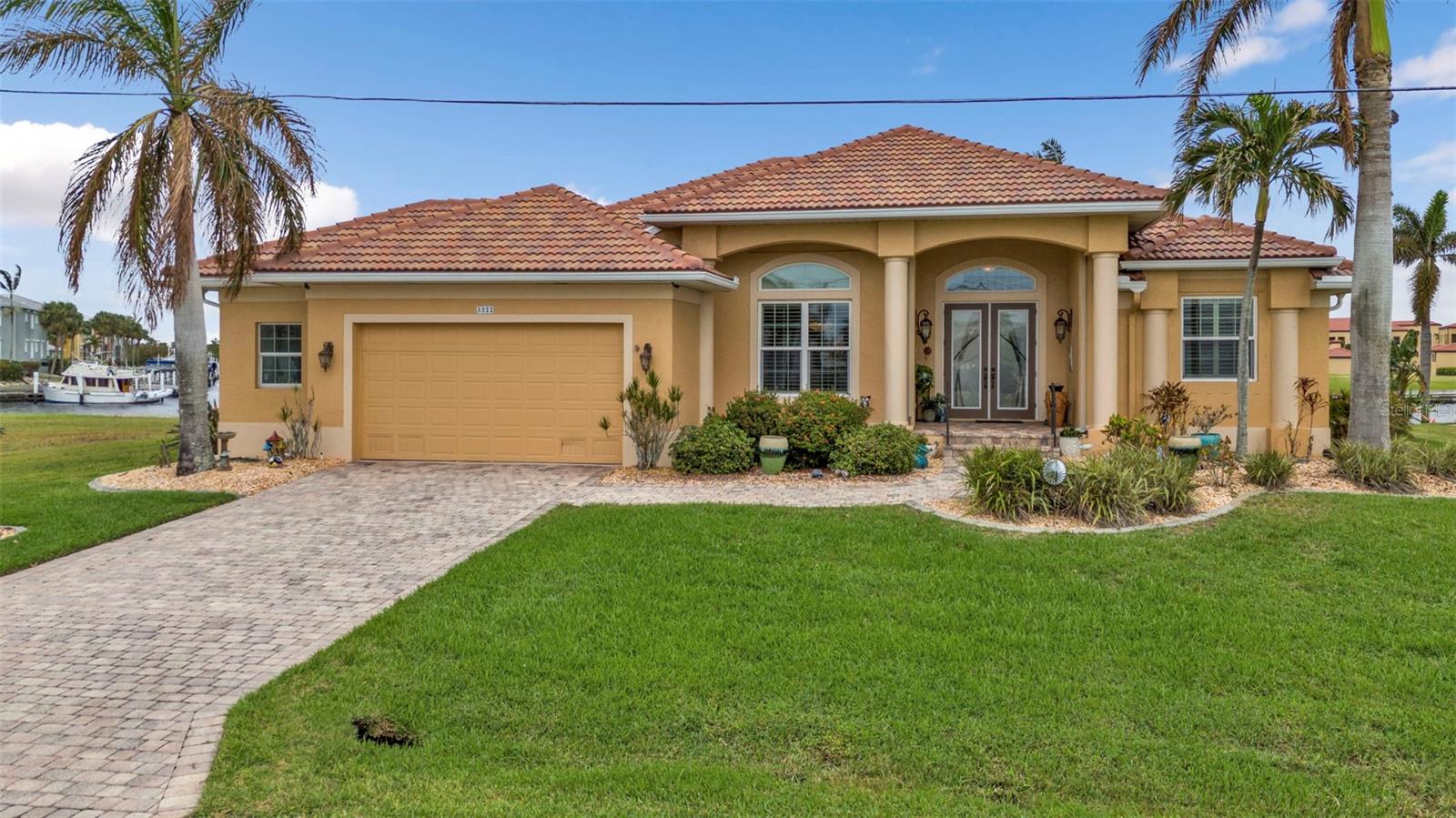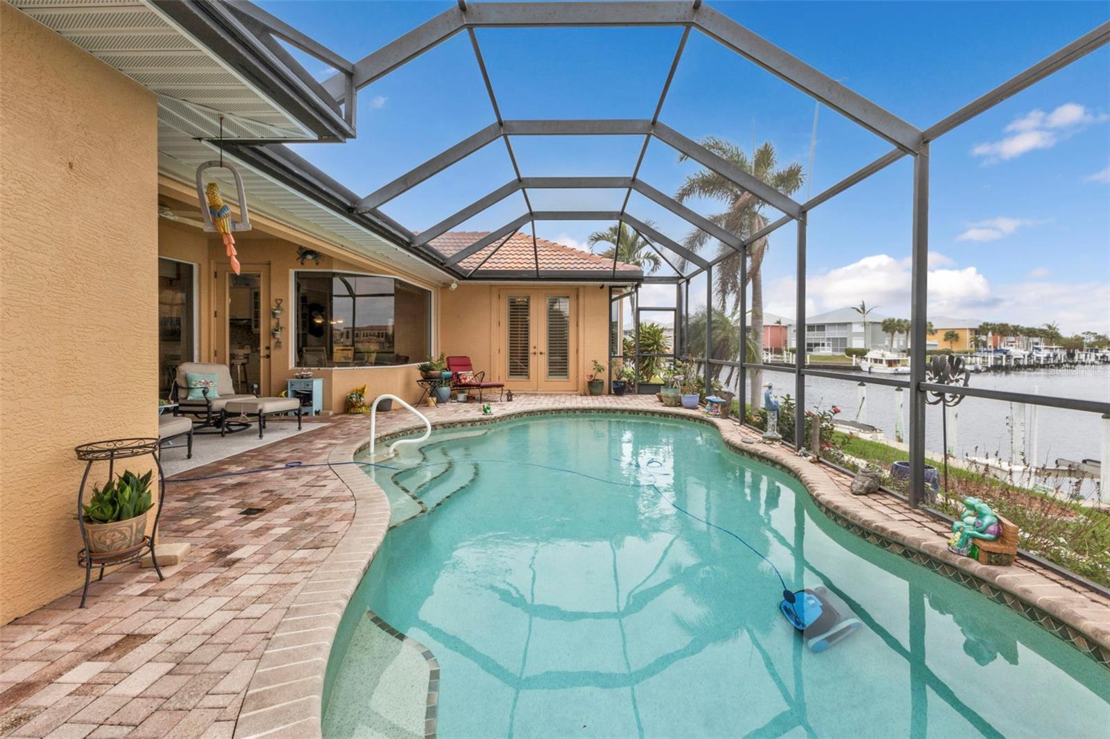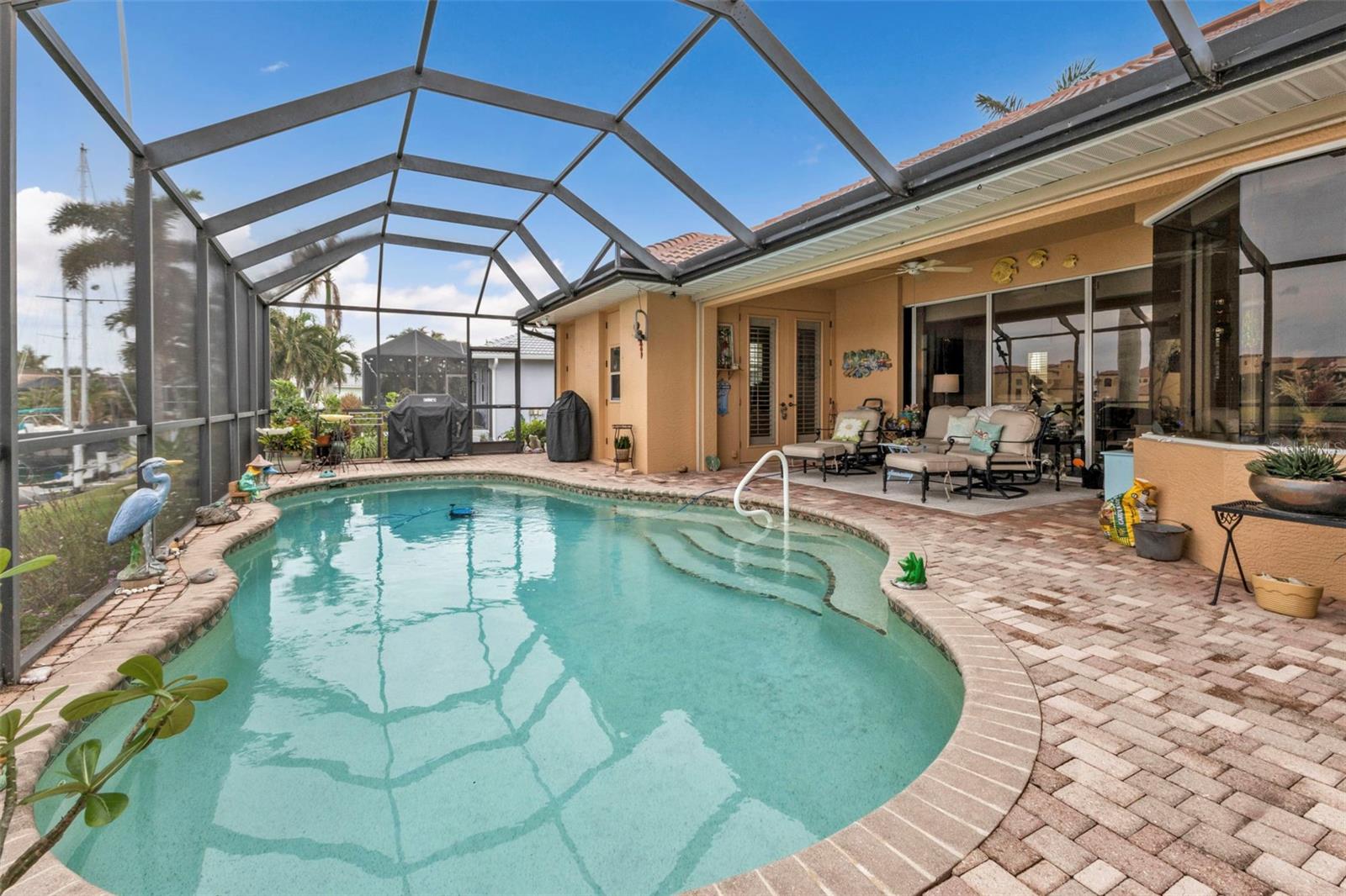 Nestled in the heart of the exclusive waterfront community of Punta Gorda Isles, this exquisite residence captures the essence of luxurious coastal living. Built in 2003 by the esteemed West Coast Builders, this home greets you with a meticulously designed paver driveway and a welcoming front walk. Step inside through the stunning new double glass doors, and let the airy ambiance embrace you. The open floor plan with soaring 13-foot ceilings and an expansive stone fireplace wall, complete with large flat-screen TV, sets the stage for both relaxation and entertainment. The kitchen is a chef’s dream, boasting sleek granite countertops, premium stainless steel appliances from LG and Kenmore Elite, and a layout that makes cooking a joy. Every door in the home is crafted from solid core wood, standing at an impressive 8 feet tall, lending an air of quality and sophistication. Plus, the home’s Man-a-Block plumbing system and generator-wired electrical panel provide peace of mind, offering both functionality and resilience. The air-conditioned garage, with its epoxy-coated floor, workshop space, and overhead storage, is perfect for hobbyists and organizers alike. Designed for the ultimate Florida lifestyle, the outdoor amenities are unmatched: a sparkling pool with new variable-speed pump, heat pump, and saltwater system are complemented by updated double-pane low-e windows, Kevlar hurricane panels, and a full suite of security alarm and cameras for worry-free living. At the water’s edge, a 30’ concrete dock with a 10,000-lb boat lift and direct canal access invites you to explore the open waters of Charlotte Harbor and the Gulf of Mexico. Be to open water in approximately 20 minutes by way of Buckley's Pass! With its new landscaping, soffits, lighting, and roof, every corner of this home has been thoughtfully refreshed and upgraded. Don’t miss this rare opportunity to experience a lifestyle where elegance meets the water’s edge.