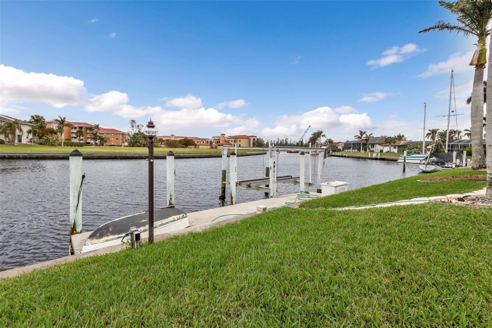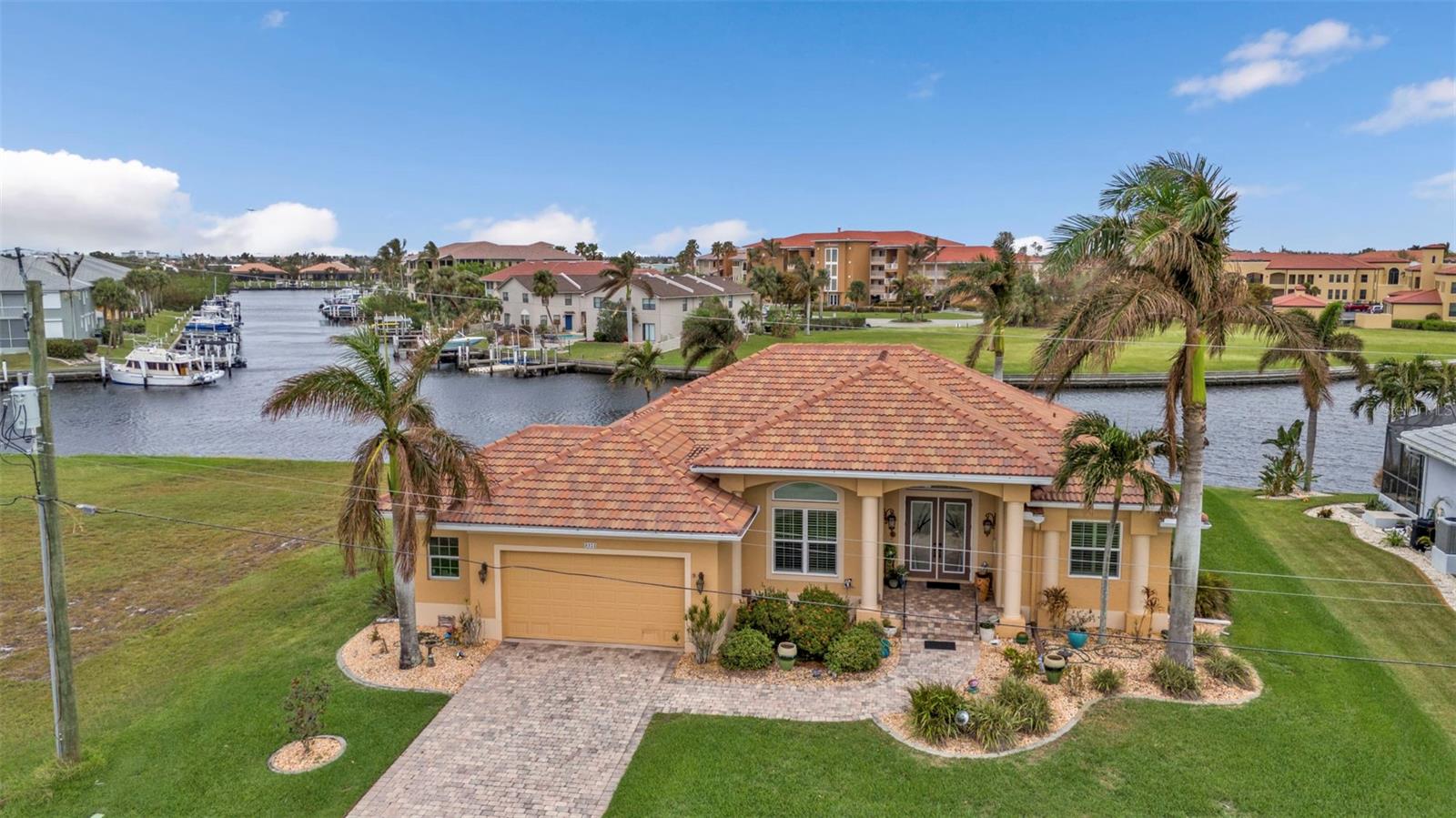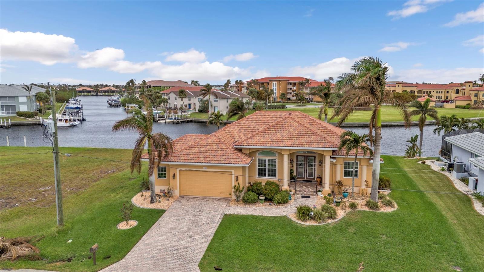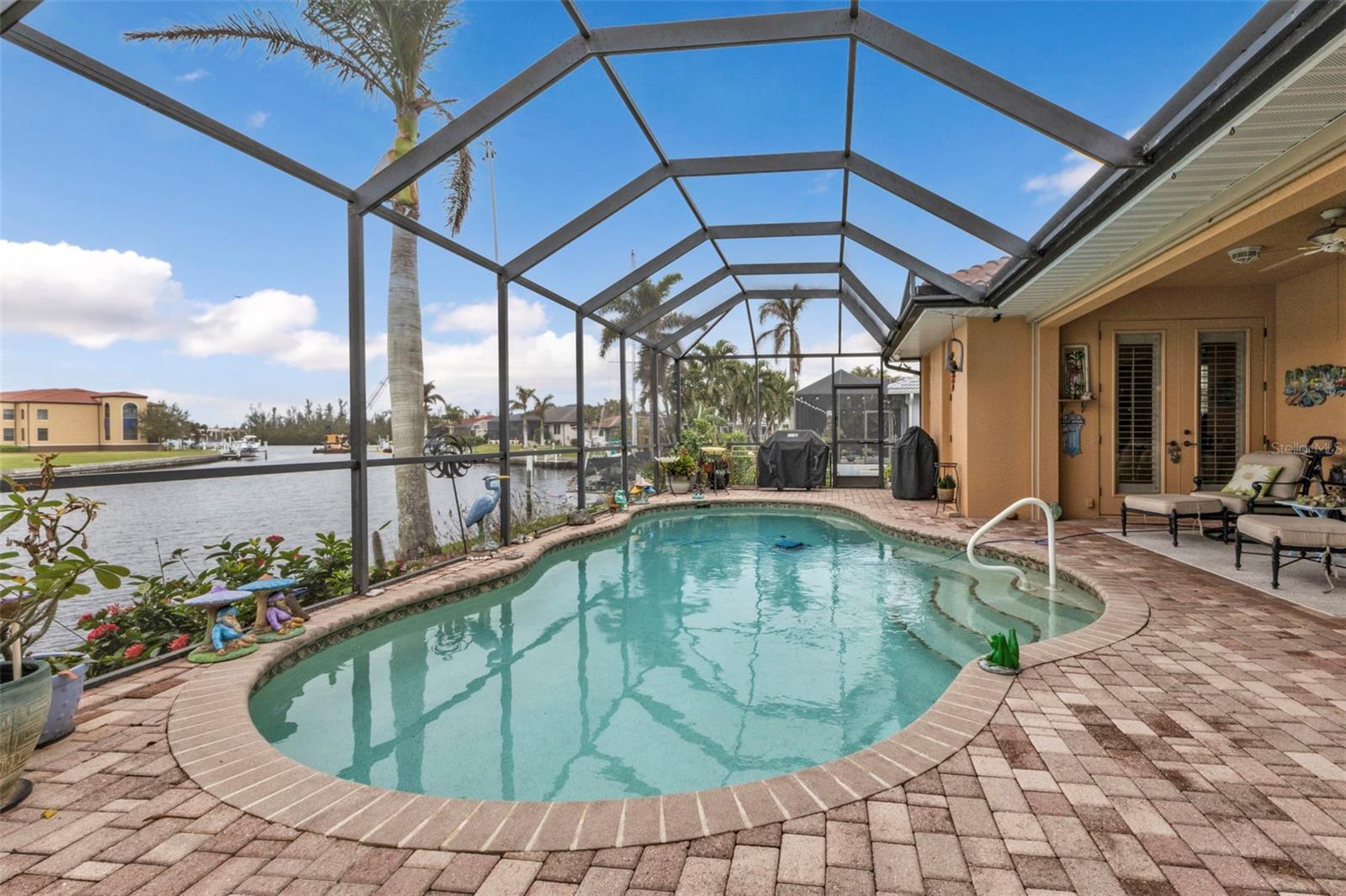 Nestled in the heart of the exclusive waterfront community of Punta Gorda Isles, this exquisite residence captures the essence of luxurious coastal living. Built in 2003 by the esteemed West Coast Builders, this home greets you with a meticulously designed paver driveway and a welcoming front walk. Step inside through the stunning new double glass doors, and let the airy ambiance embrace you. The open floor plan with soaring 13-foot ceilings and an expansive stone fireplace wall, complete with large flat-screen TV, sets the stage for both relaxation and entertainment. The kitchen is a chef’s dream, boasting sleek granite countertops, premium stainless steel appliances from LG and Kenmore Elite, and a layout that makes cooking a joy. Every door in the home is crafted from solid core wood, standing at an impressive 8 feet tall, lending an air of quality and sophistication. Plus, the home’s Man-a-Block plumbing system and generator-wired electrical panel provide peace of mind, offering both functionality and resilience. The air-conditioned garage, with its epoxy-coated floor, workshop space, and overhead storage, is perfect for hobbyists and organizers alike. Designed for the ultimate Florida lifestyle, the outdoor amenities are unmatched: a sparkling pool with new variable-speed pump, heat pump, and saltwater system are complemented by updated double-pane low-e windows, Kevlar hurricane panels, and a full suite of security alarm and cameras for worry-free living. At the water’s edge, a 30’ concrete dock with a 10,000-lb boat lift and direct canal access invites you to explore the open waters of Charlotte Harbor and the Gulf of Mexico. Be to open water in approximately 20 minutes by way of Buckley's Pass! With its new landscaping, soffits, lighting, and roof, every corner of this home has been thoughtfully refreshed and upgraded. Don’t miss this rare opportunity to experience a lifestyle where elegance meets the water’s edge.