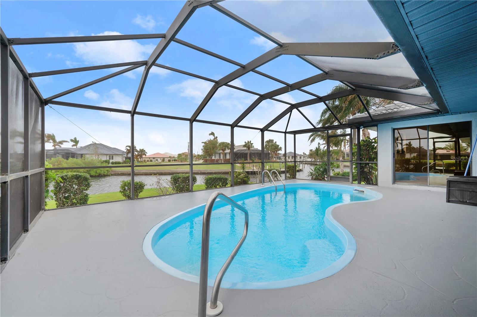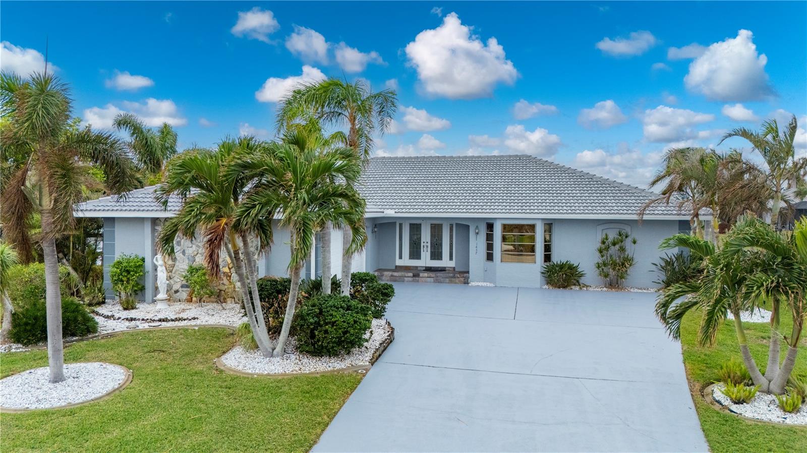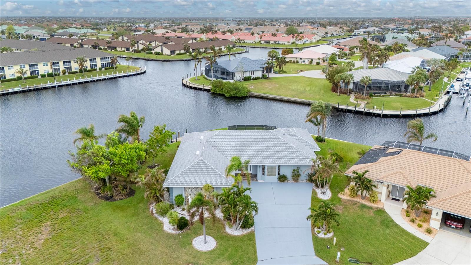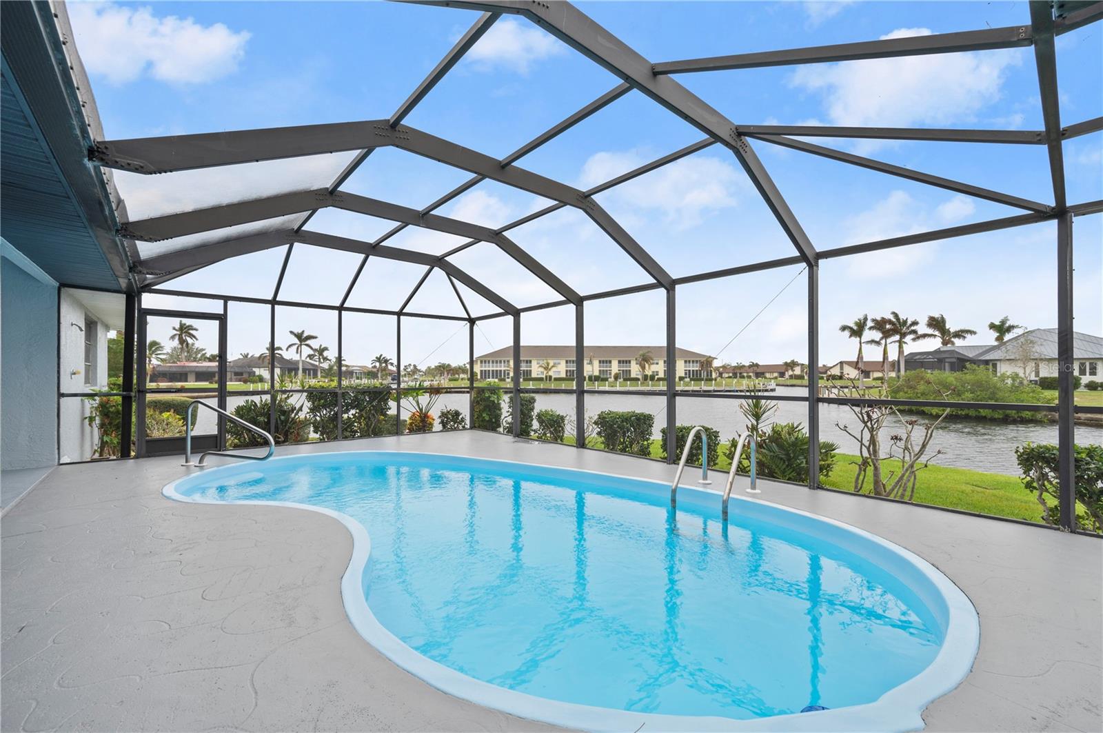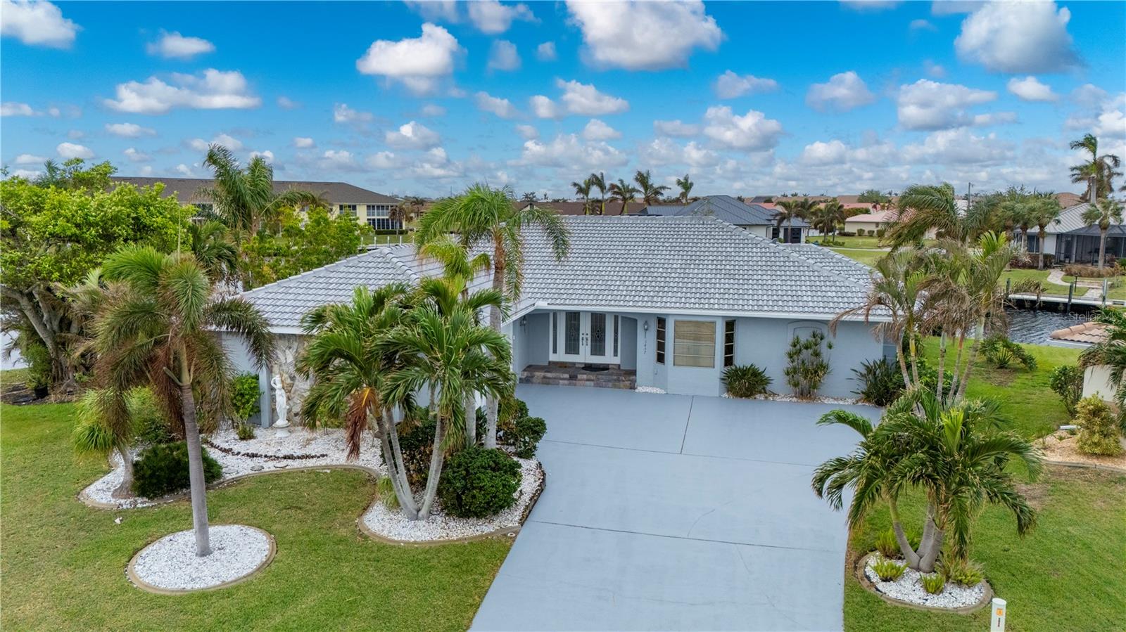 PRIME TIP LOT IN PUNTA GORDA ISLES! This single-owner 3 bedroom, 2 bath, 2-car garage waterfront pool home is a true gem with quick sailboat access to Charlotte Harbor leading to the Gulf of Mexico via Buckley’s Pass. This meticulously maintained cul-de-sac home boasts 173 ft of waterfrontage, large deep turning basin, concrete dock with electric and gorgeous intersecting canal views. Step inside through the stainless double door entry and be greeted by an open floor plan bathed in neutral tones. The living room features a pocket slider that opens up to the lanai, seamlessly blending indoor and outdoor living. The formal dining room, complete with a charming bay window, is perfect for hosting dinner parties. The recently updated kitchen is a chef's delight featuring granite countertops, new appliances (except the dishwasher), a large breakfast bar, and a movable center island. Enjoy casual meals in the cozy dining area overlooking the pool. Retreat to the generous primary suite, which offers a private slider to the lanai, walk-in closet, and private bath with dual sinks, garden tub, and walk-in shower. The split floor plan ensures privacy for guests, with two nicely sized bedrooms, each with walk-in closets, and a remodeled bath featuring dual sinks and a walk-in shower. The third bedroom even has direct access to the pool! The outdoor entertaining area is a true highlight, featuring a covered lanai and a screened free-form fiberglass pool, perfect for soaking up the Florida sun and enjoying amazing sunsets. Recent updates include brand new roof, a/c unit new in 2022, new ceiling fans, lighting fixtures, attic insulation, and fresh carpet in the living room. The tropical landscaping, walkway to the dock, and side-facing 2-car garage add to the home's appeal. Additional features include an irrigation system, an interior laundry room with sink, storage space and newer washer/dryer, and included items like a large screen TV, foyer mirror, and two cabinets in the garage. Nestled in a vibrant golf and boating community, you're just minutes away from St. Andrews South Golf Club, the Yacht Club, Fishermen's Village, and the historic downtown area of Punta Gorda. Enjoy world-class fishing, boating, fine dining, and beautiful parks, with easy access to the SWFL gulf beaches. Whether you're looking for a snowbird retreat or a permanent home, this fabulous property is ready for you. Schedule your private showing today!