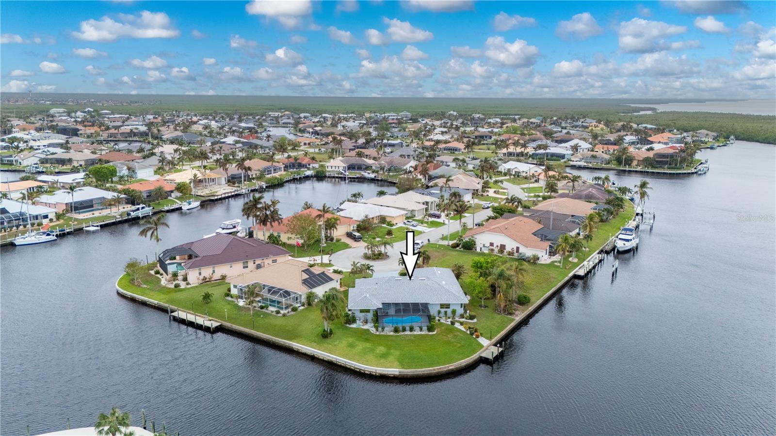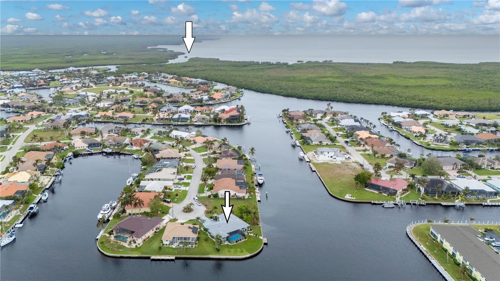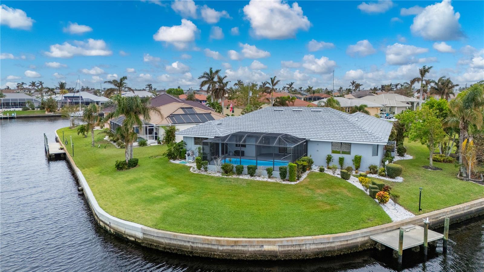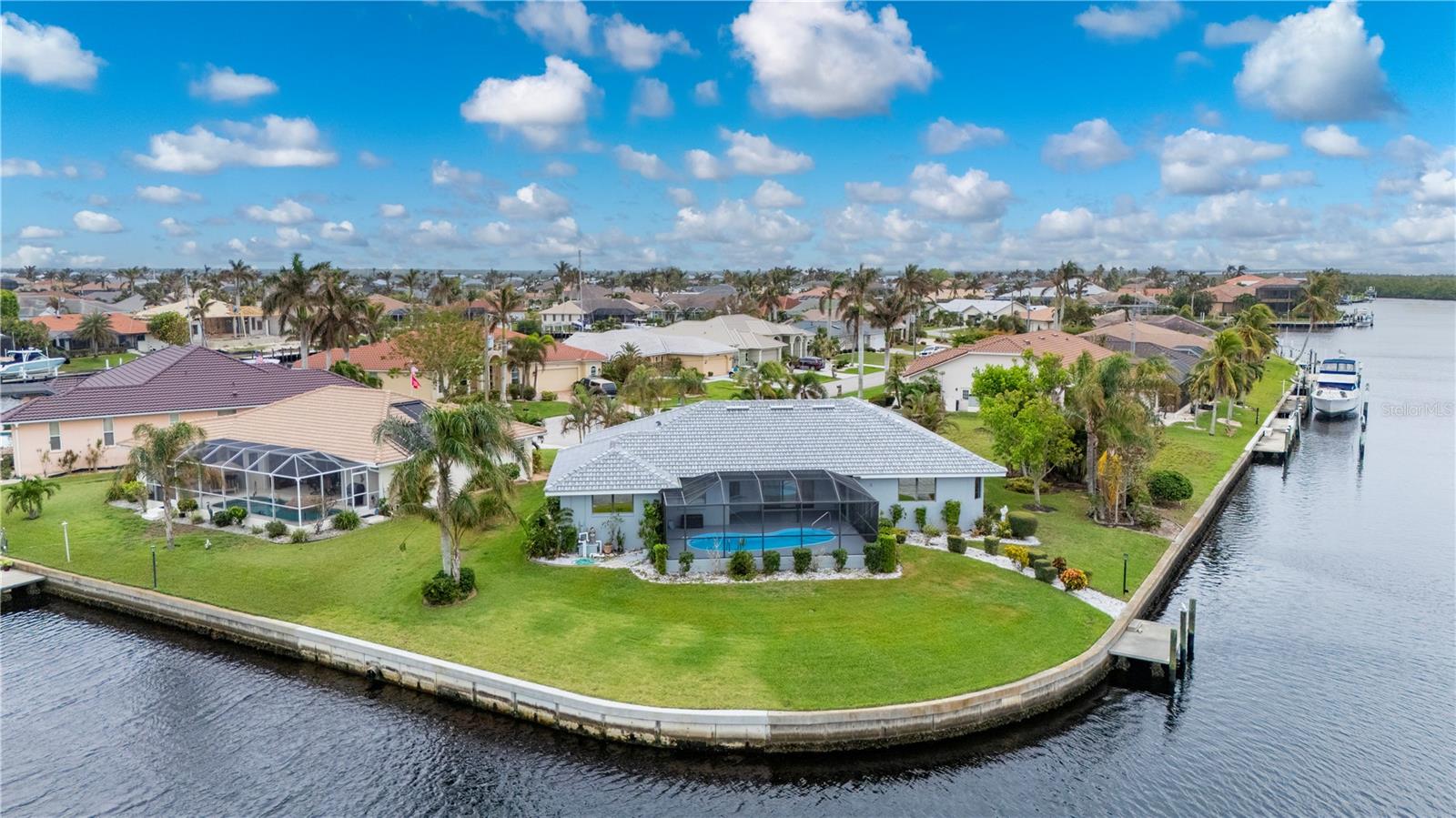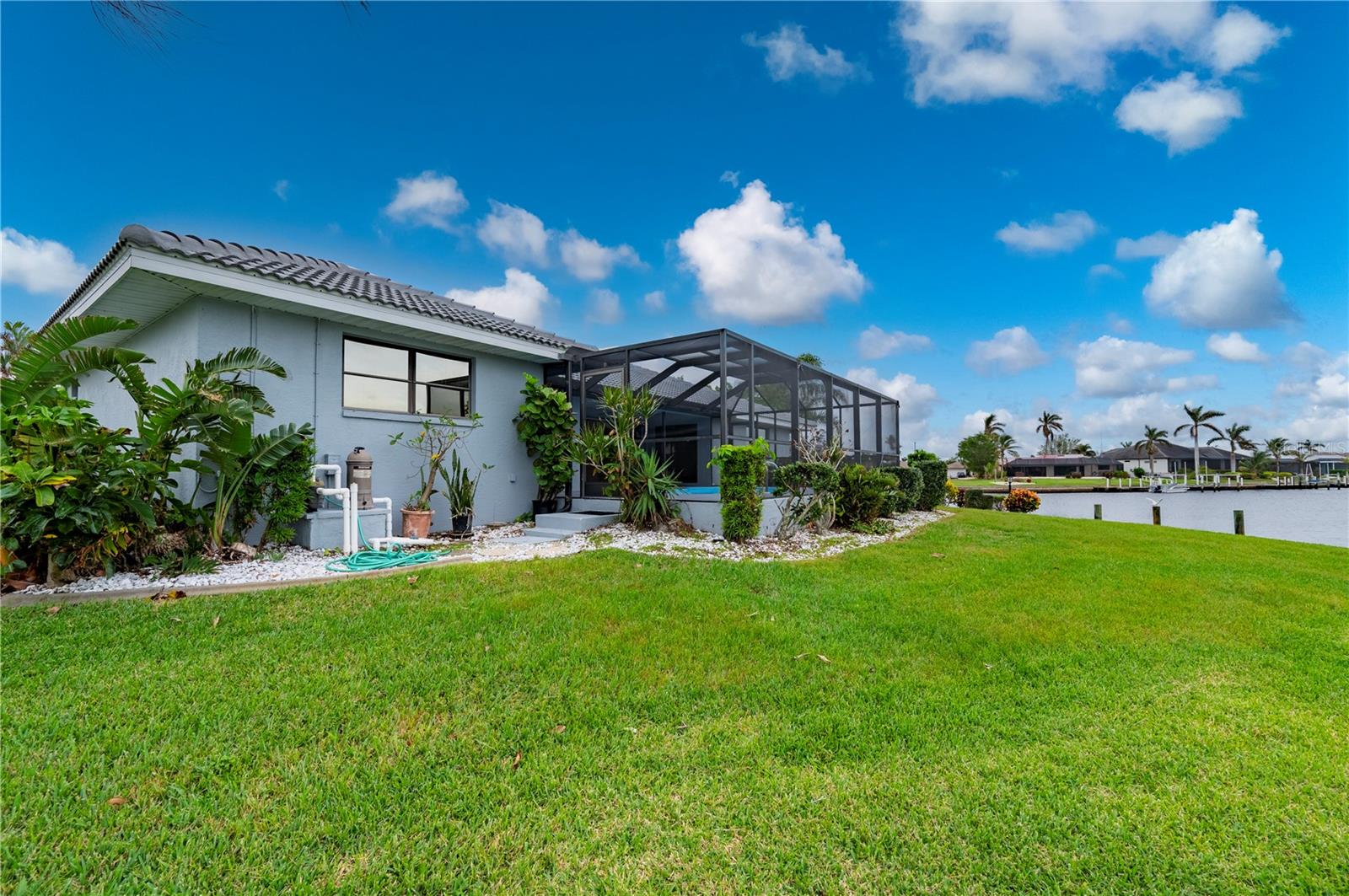 PRIME TIP LOT IN PUNTA GORDA ISLES! This single-owner 3 bedroom, 2 bath, 2-car garage waterfront pool home is a true gem with quick sailboat access to Charlotte Harbor leading to the Gulf of Mexico via Buckley’s Pass. This meticulously maintained cul-de-sac home boasts 173 ft of waterfrontage, large deep turning basin, concrete dock with electric and gorgeous intersecting canal views. Step inside through the stainless double door entry and be greeted by an open floor plan bathed in neutral tones. The living room features a pocket slider that opens up to the lanai, seamlessly blending indoor and outdoor living. The formal dining room, complete with a charming bay window, is perfect for hosting dinner parties. The recently updated kitchen is a chef's delight featuring granite countertops, new appliances (except the dishwasher), a large breakfast bar, and a movable center island. Enjoy casual meals in the cozy dining area overlooking the pool. Retreat to the generous primary suite, which offers a private slider to the lanai, walk-in closet, and private bath with dual sinks, garden tub, and walk-in shower. The split floor plan ensures privacy for guests, with two nicely sized bedrooms, each with walk-in closets, and a remodeled bath featuring dual sinks and a walk-in shower. The third bedroom even has direct access to the pool! The outdoor entertaining area is a true highlight, featuring a covered lanai and a screened free-form fiberglass pool, perfect for soaking up the Florida sun and enjoying amazing sunsets. Recent updates include brand new roof, a/c unit new in 2022, new ceiling fans, lighting fixtures, attic insulation, and fresh carpet in the living room. The tropical landscaping, walkway to the dock, and side-facing 2-car garage add to the home's appeal. Additional features include an irrigation system, an interior laundry room with sink, storage space and newer washer/dryer, and included items like a large screen TV, foyer mirror, and two cabinets in the garage. Nestled in a vibrant golf and boating community, you're just minutes away from St. Andrews South Golf Club, the Yacht Club, Fishermen's Village, and the historic downtown area of Punta Gorda. Enjoy world-class fishing, boating, fine dining, and beautiful parks, with easy access to the SWFL gulf beaches. Whether you're looking for a snowbird retreat or a permanent home, this fabulous property is ready for you. Schedule your private showing today!