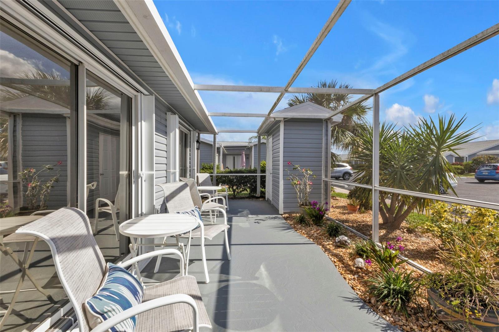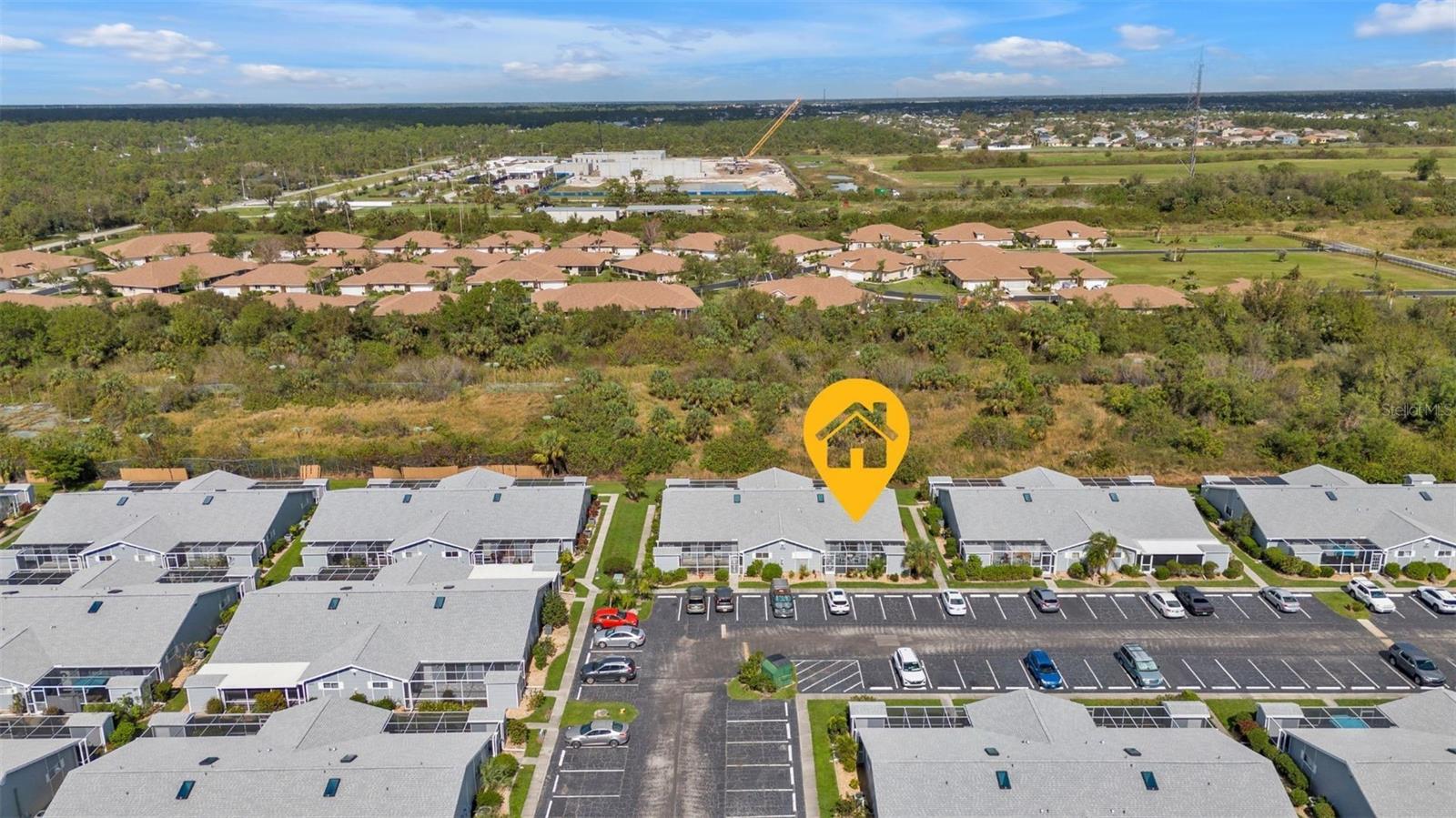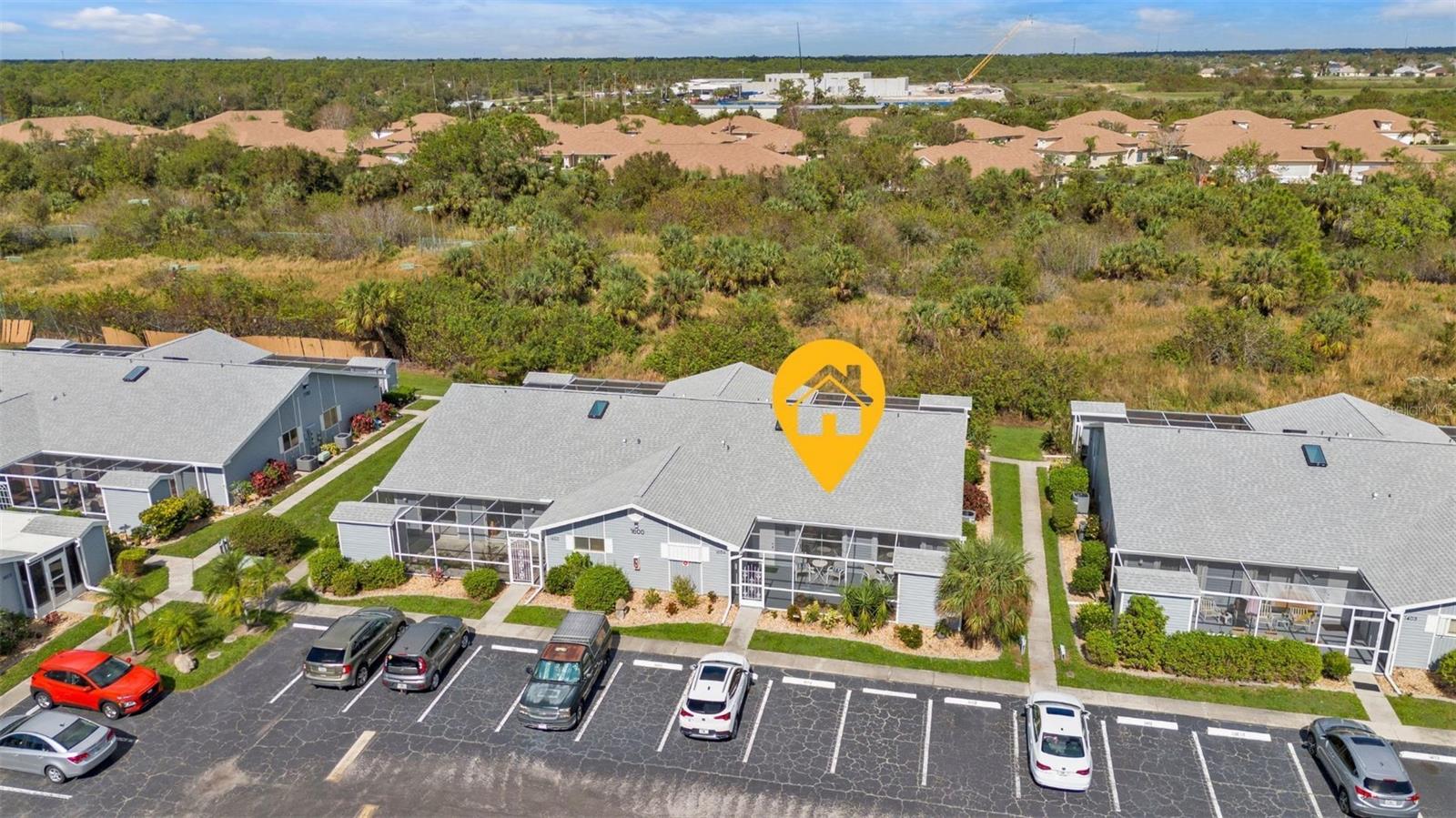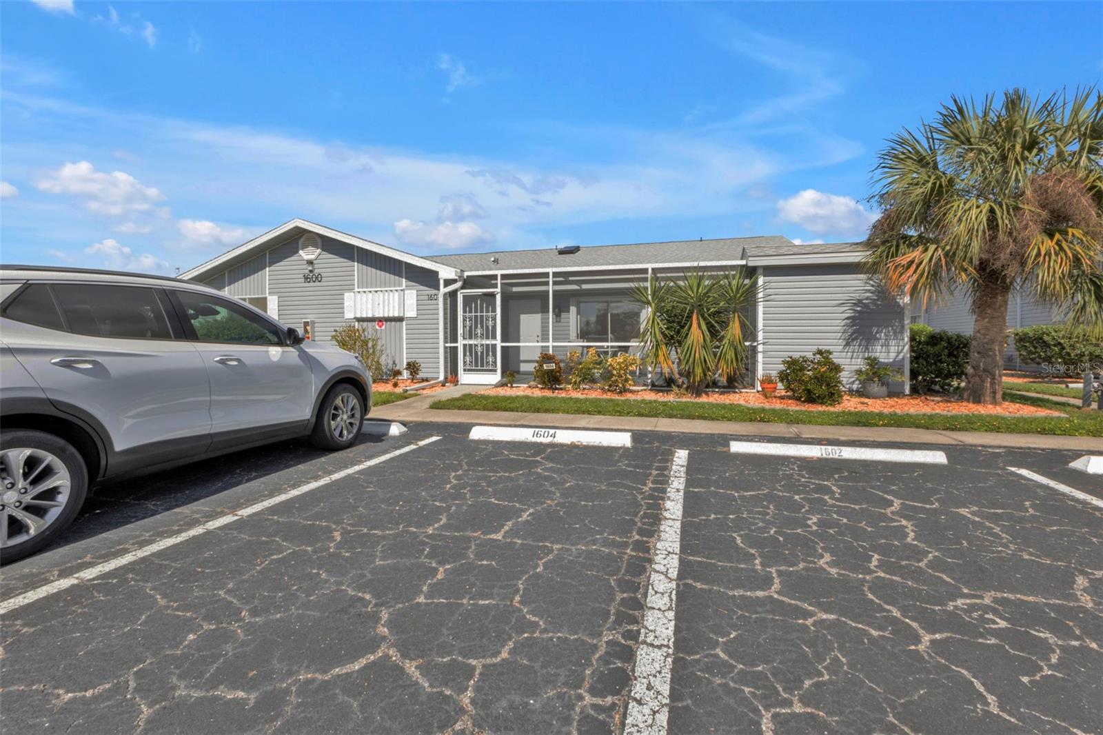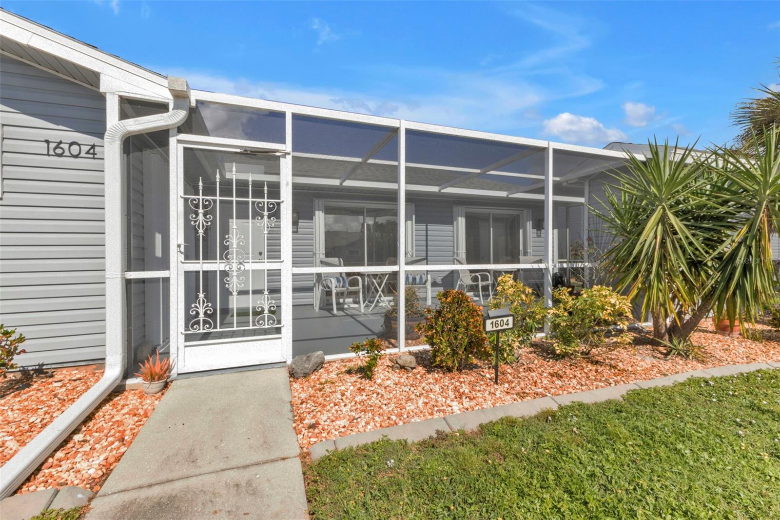 When you want the BEST...this is the NICEST- well-appointed VILLA now for sale in the Courtyards! The PARKING SPOTS are assigned & directly in front of the villa making "bringing in the groceries" or dashing in from a cloudburst much easier! Mailboxes & the heated POOL / clubhouse are close & convenient too!! There is a spacious screened lanai courtyard area, with plantings and a small storage shed at the entry- providing lots of privacy! INTERIOR: FANTASTIC- ***UPDATED kitchen, Gorgeous KRAFTMAID, White Shaker Cabinetry, accented with Antique BRONZE hardware and faucet. Soft close, full extension, dovetail drawers, a pantry cupboard w/ pull out drawer & under cabinet lighting. A crisp arctic white quartz countertop complements the designer Arabesque tile backsplash. Stainless Samsung appliance suite, French Door, 2 drawer Fridge, slide-in range. Recessed lighting provides a well-lit workspace! ***UPDATED Front load Washer and Dryer. ***UPDATED Porcelain tile flooring in Kitchen, Living Room and both bathrooms. Dining room and Living room have a vaulted ceiling- an impact rated skylight floods the room with light. The entire villa was painted about 3 years ago. The Primary suite has a walk-in closet, Sliders to Porch area, and the ensuite BATHROOM is EQUALLY as GORGEOUS as the KITCHEN. ***New shaker door style, oversized vanity with 2 banks of soft close drawers and a sparkling quartz top. The SHOWER has been ***UPDATED with rectangular gray marble-look tile, and "penny tile" flooring, Bronze fixtures and a glass door, comfort height commode. The Guest room, and Guest bath are on the opposite side of the villa for privacy. (Bedroom has sliders to Porch too) Guest BATH has a new vanity and updated commode too! ***UPDATED lighting throughout! SYSTEMS & ROOF: AIR CONDITIONER is 2 years young with warranty. STORM SMART ACCORDIAN STORM SHUTTERS recently installed. The rollers on the 3 sets of sliders have been replaced and glass has been tinted. The Roofs, new shingles were installed recently!! And these Villas are NOT in a flood ZONE, good elevation. NO damage from recent storms! (The seller even including the Flexsteel reclining, 2 yr old sofa (Bacon's) dining room table / chairs) area rug, TV and stand with acceptable offer! This is not an age restricted community. Enjoy life at Loveland Courtyard Villas.