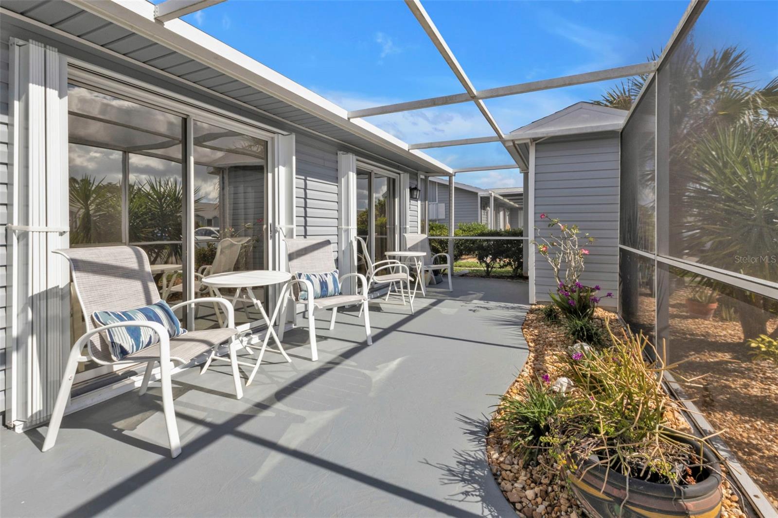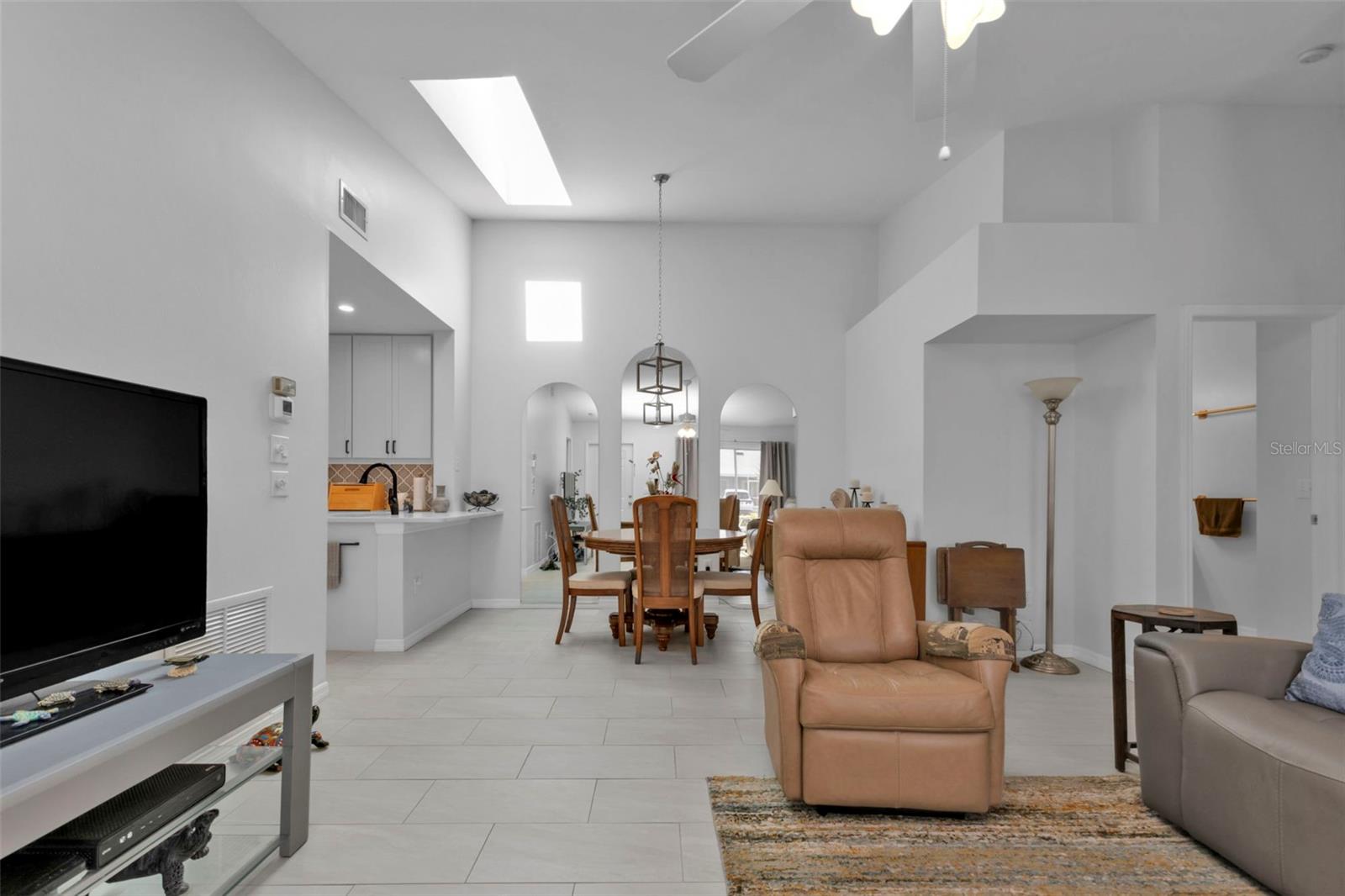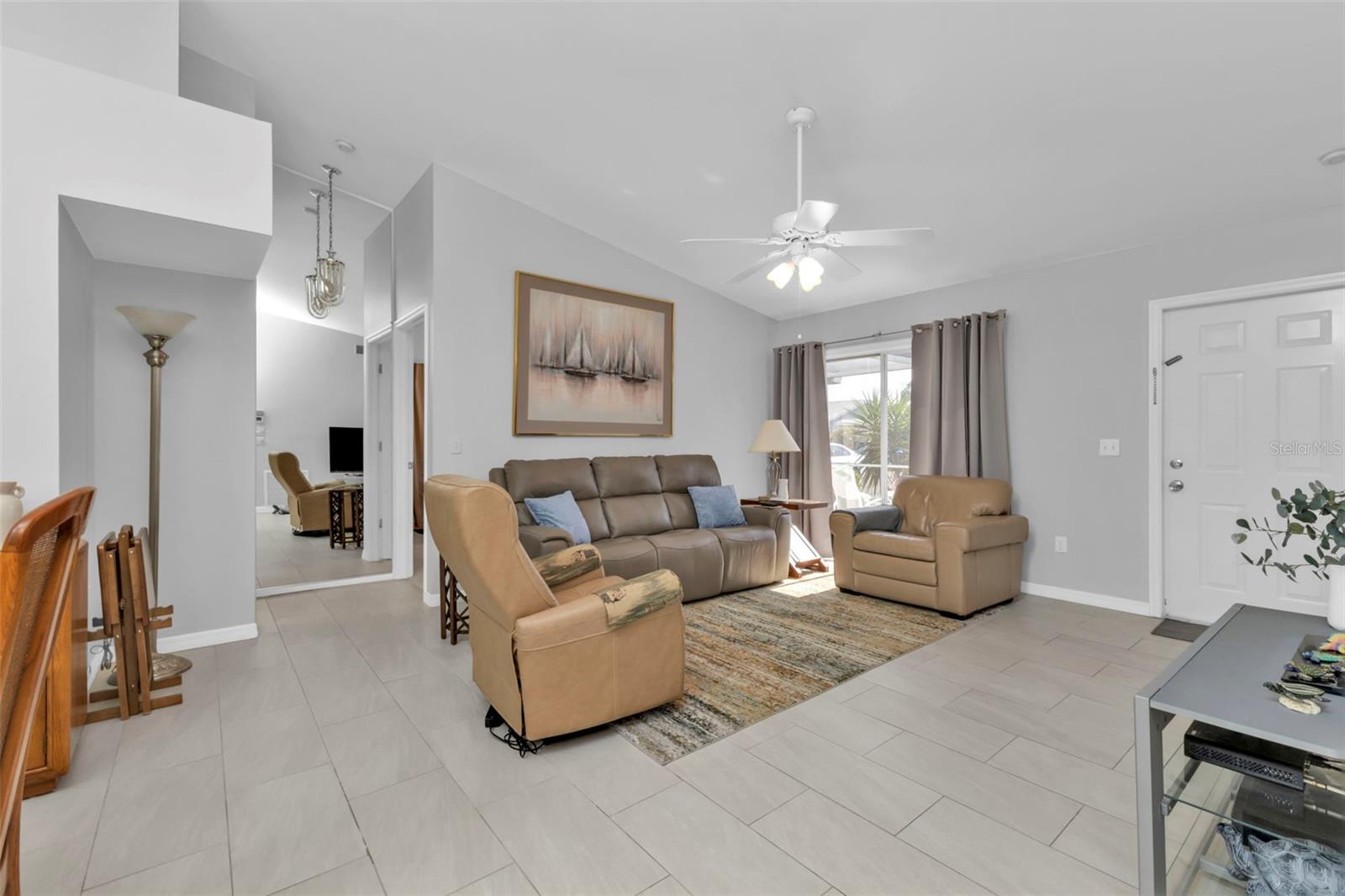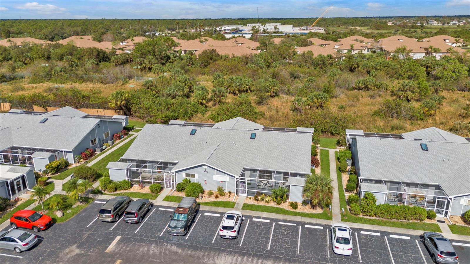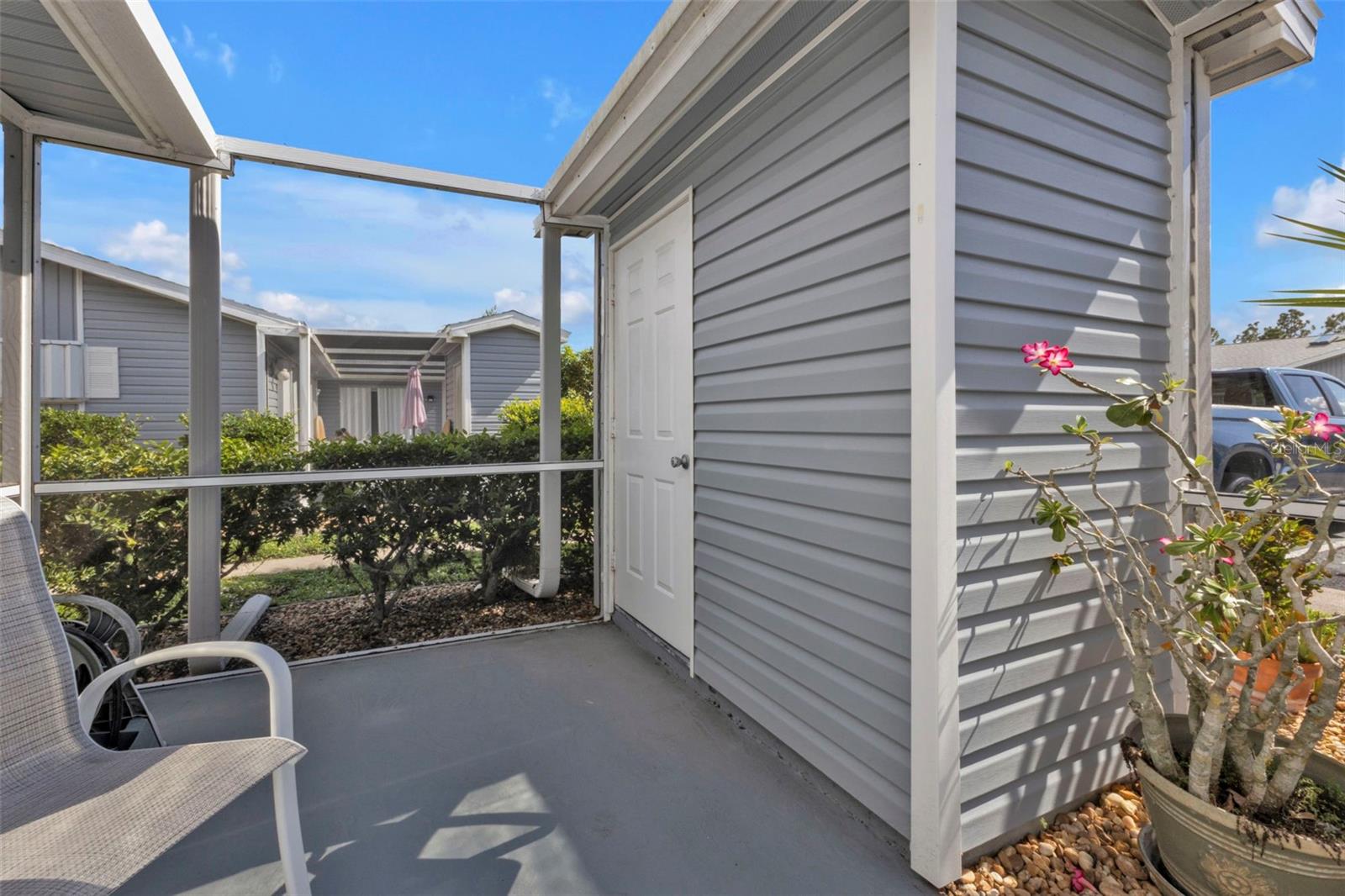 When you want the BEST...this is the NICEST- well-appointed VILLA now for sale in the Courtyards! The PARKING SPOTS are assigned & directly in front of the villa making "bringing in the groceries" or dashing in from a cloudburst much easier! Mailboxes & the heated POOL / clubhouse are close & convenient too!! There is a spacious screened lanai courtyard area, with plantings and a small storage shed at the entry- providing lots of privacy! INTERIOR: FANTASTIC- ***UPDATED kitchen, Gorgeous KRAFTMAID, White Shaker Cabinetry, accented with Antique BRONZE hardware and faucet. Soft close, full extension, dovetail drawers, a pantry cupboard w/ pull out drawer & under cabinet lighting. A crisp arctic white quartz countertop complements the designer Arabesque tile backsplash. Stainless Samsung appliance suite, French Door, 2 drawer Fridge, slide-in range. Recessed lighting provides a well-lit workspace! ***UPDATED Front load Washer and Dryer. ***UPDATED Porcelain tile flooring in Kitchen, Living Room and both bathrooms. Dining room and Living room have a vaulted ceiling- an impact rated skylight floods the room with light. The entire villa was painted about 3 years ago. The Primary suite has a walk-in closet, Sliders to Porch area, and the ensuite BATHROOM is EQUALLY as GORGEOUS as the KITCHEN. ***New shaker door style, oversized vanity with 2 banks of soft close drawers and a sparkling quartz top. The SHOWER has been ***UPDATED with rectangular gray marble-look tile, and "penny tile" flooring, Bronze fixtures and a glass door, comfort height commode. The Guest room, and Guest bath are on the opposite side of the villa for privacy. (Bedroom has sliders to Porch too) Guest BATH has a new vanity and updated commode too! ***UPDATED lighting throughout! SYSTEMS & ROOF: AIR CONDITIONER is 2 years young with warranty. STORM SMART ACCORDIAN STORM SHUTTERS recently installed. The rollers on the 3 sets of sliders have been replaced and glass has been tinted. The Roofs, new shingles were installed recently!! And these Villas are NOT in a flood ZONE, good elevation. NO damage from recent storms! (The seller even including the Flexsteel reclining, 2 yr old sofa (Bacon's) dining room table / chairs) area rug, TV and stand with acceptable offer! This is not an age restricted community. Enjoy life at Loveland Courtyard Villas.