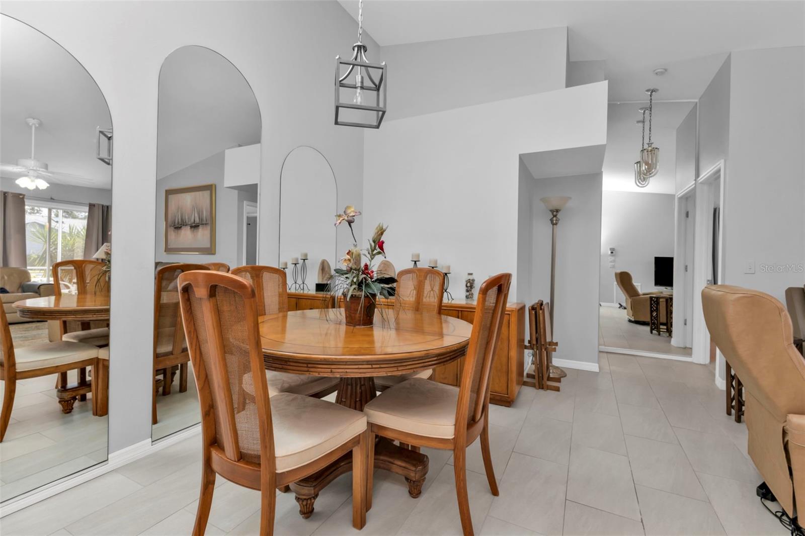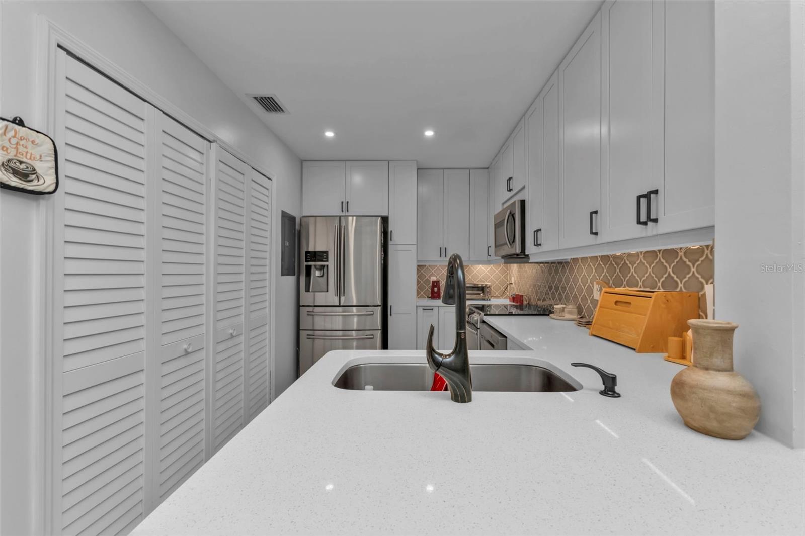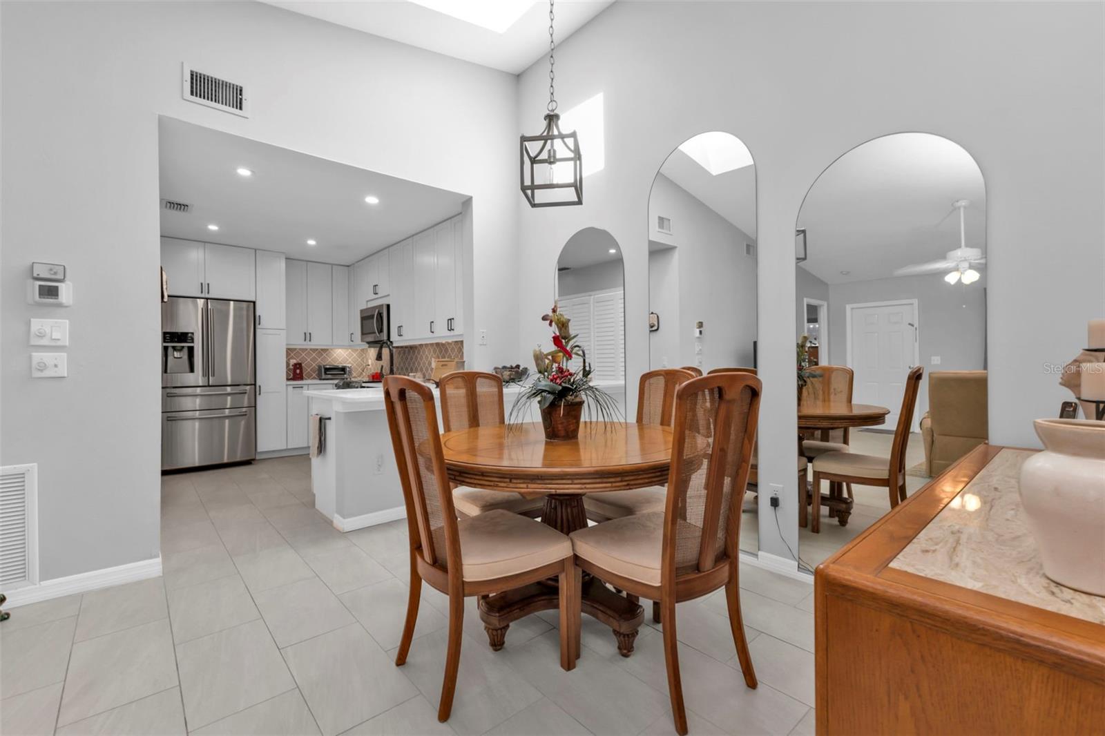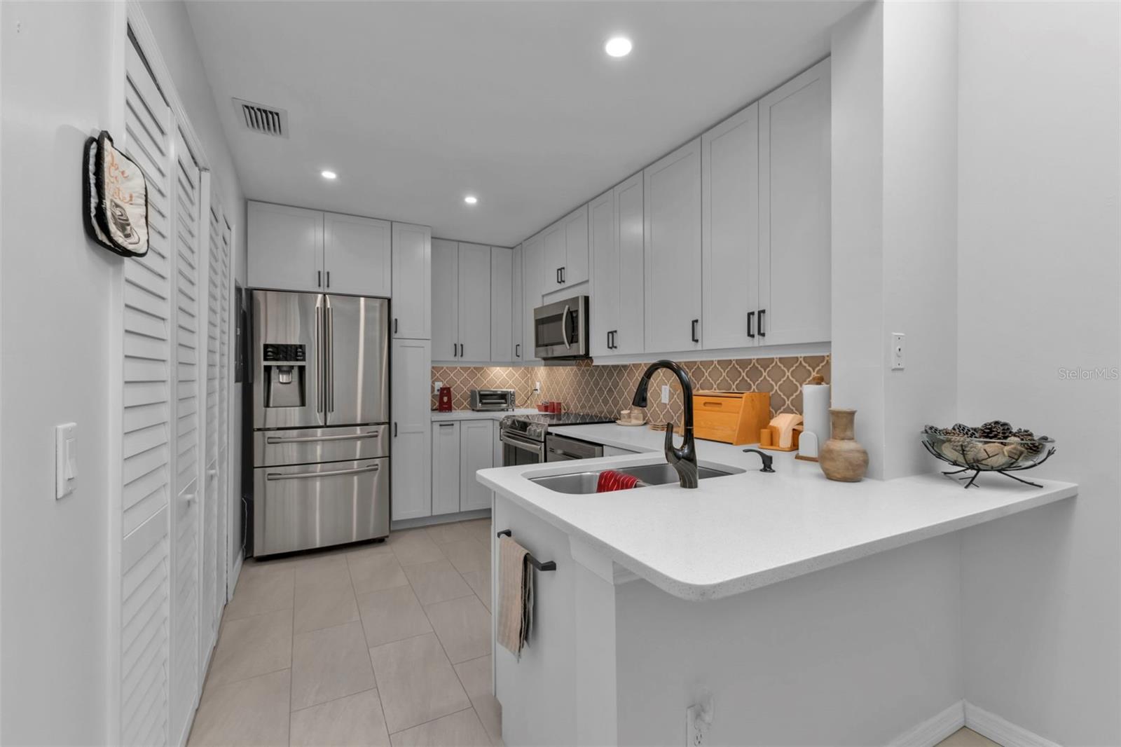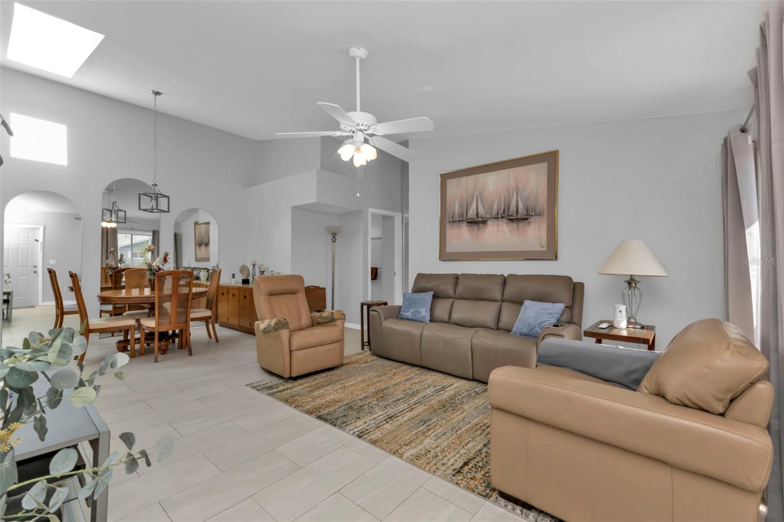 When you want the BEST...this is the NICEST- well-appointed VILLA now for sale in the Courtyards! The PARKING SPOTS are assigned & directly in front of the villa making "bringing in the groceries" or dashing in from a cloudburst much easier! Mailboxes & the heated POOL / clubhouse are close & convenient too!! There is a spacious screened lanai courtyard area, with plantings and a small storage shed at the entry- providing lots of privacy! INTERIOR: FANTASTIC- ***UPDATED kitchen, Gorgeous KRAFTMAID, White Shaker Cabinetry, accented with Antique BRONZE hardware and faucet. Soft close, full extension, dovetail drawers, a pantry cupboard w/ pull out drawer & under cabinet lighting. A crisp arctic white quartz countertop complements the designer Arabesque tile backsplash. Stainless Samsung appliance suite, French Door, 2 drawer Fridge, slide-in range. Recessed lighting provides a well-lit workspace! ***UPDATED Front load Washer and Dryer. ***UPDATED Porcelain tile flooring in Kitchen, Living Room and both bathrooms. Dining room and Living room have a vaulted ceiling- an impact rated skylight floods the room with light. The entire villa was painted about 3 years ago. The Primary suite has a walk-in closet, Sliders to Porch area, and the ensuite BATHROOM is EQUALLY as GORGEOUS as the KITCHEN. ***New shaker door style, oversized vanity with 2 banks of soft close drawers and a sparkling quartz top. The SHOWER has been ***UPDATED with rectangular gray marble-look tile, and "penny tile" flooring, Bronze fixtures and a glass door, comfort height commode. The Guest room, and Guest bath are on the opposite side of the villa for privacy. (Bedroom has sliders to Porch too) Guest BATH has a new vanity and updated commode too! ***UPDATED lighting throughout! SYSTEMS & ROOF: AIR CONDITIONER is 2 years young with warranty. STORM SMART ACCORDIAN STORM SHUTTERS recently installed. The rollers on the 3 sets of sliders have been replaced and glass has been tinted. The Roofs, new shingles were installed recently!! And these Villas are NOT in a flood ZONE, good elevation. NO damage from recent storms! (The seller even including the Flexsteel reclining, 2 yr old sofa (Bacon's) dining room table / chairs) area rug, TV and stand with acceptable offer! This is not an age restricted community. Enjoy life at Loveland Courtyard Villas.