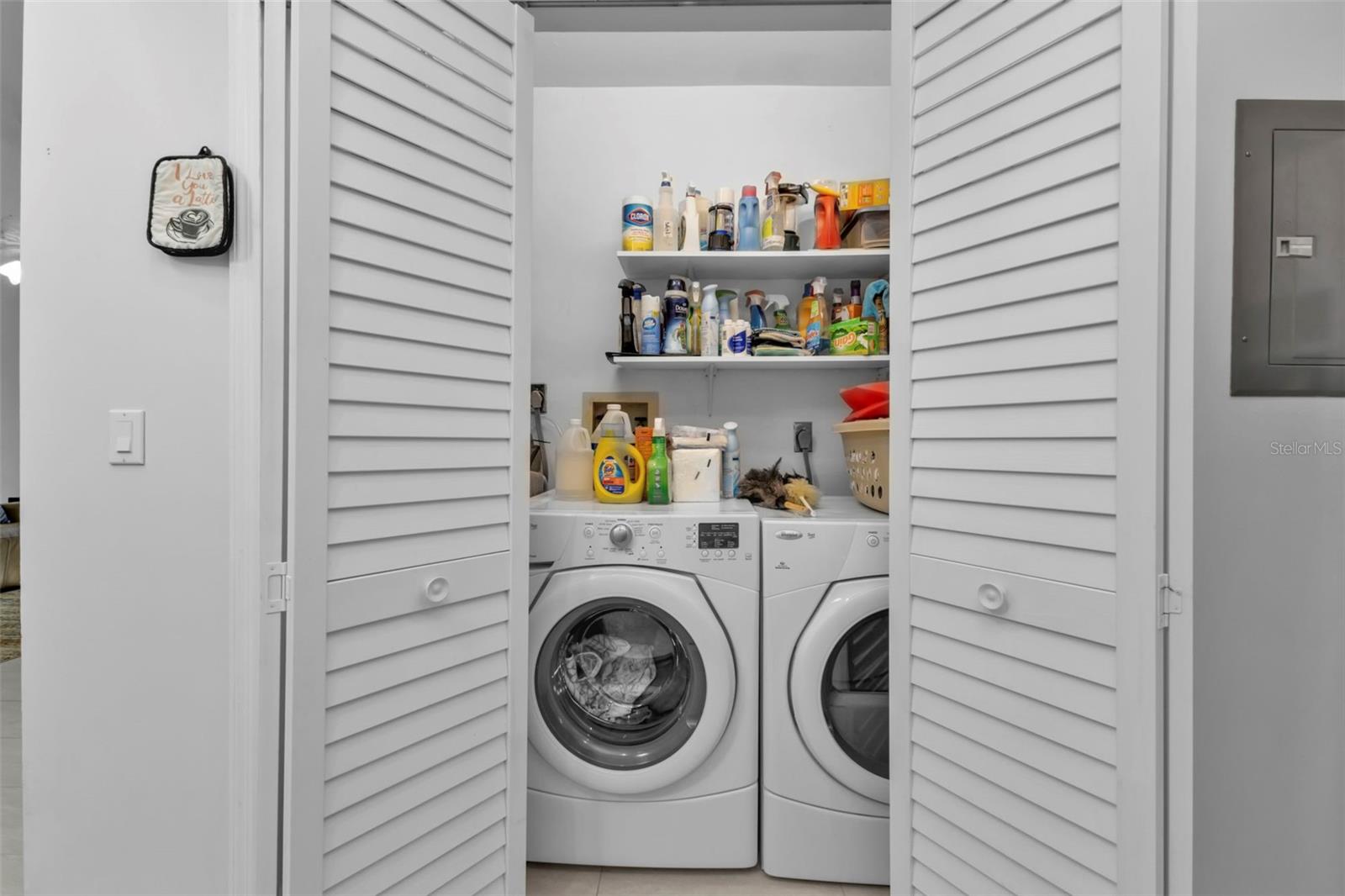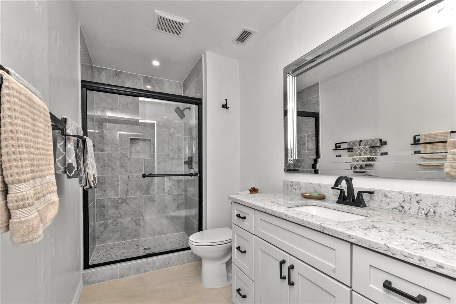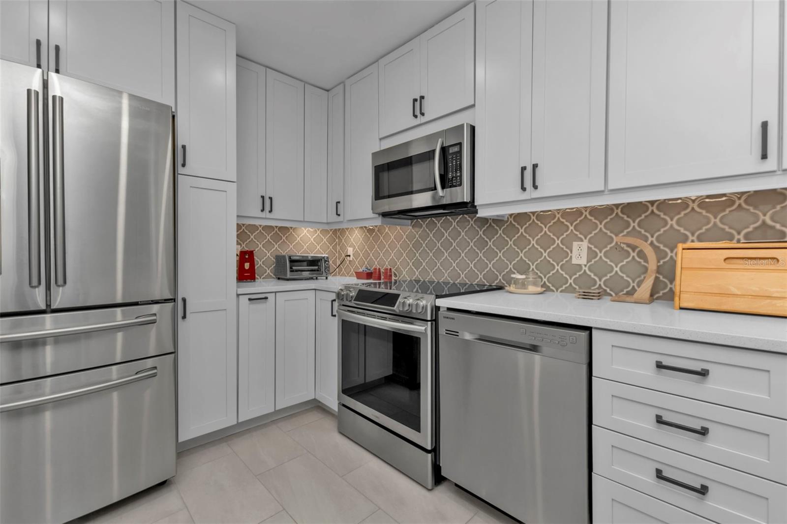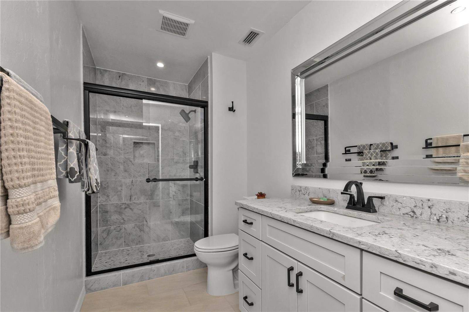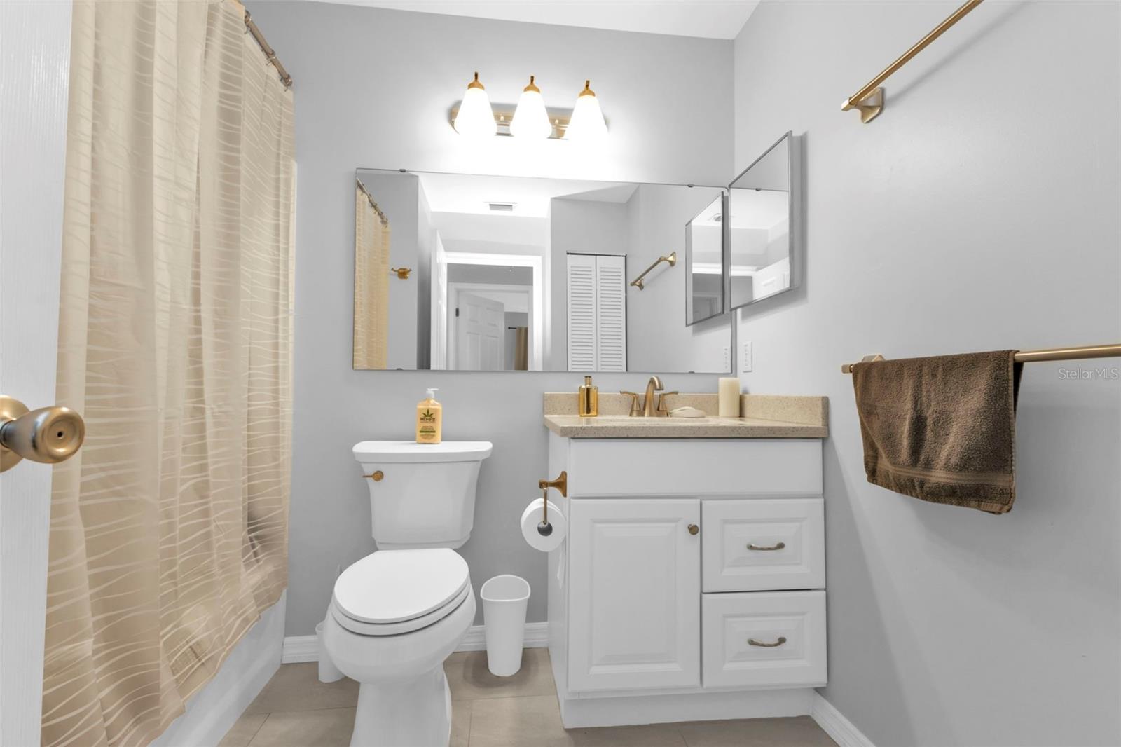 When you want the BEST...this is the NICEST- well-appointed VILLA now for sale in the Courtyards! The PARKING SPOTS are assigned & directly in front of the villa making "bringing in the groceries" or dashing in from a cloudburst much easier! Mailboxes & the heated POOL / clubhouse are close & convenient too!! There is a spacious screened lanai courtyard area, with plantings and a small storage shed at the entry- providing lots of privacy! INTERIOR: FANTASTIC- ***UPDATED kitchen, Gorgeous KRAFTMAID, White Shaker Cabinetry, accented with Antique BRONZE hardware and faucet. Soft close, full extension, dovetail drawers, a pantry cupboard w/ pull out drawer & under cabinet lighting. A crisp arctic white quartz countertop complements the designer Arabesque tile backsplash. Stainless Samsung appliance suite, French Door, 2 drawer Fridge, slide-in range. Recessed lighting provides a well-lit workspace! ***UPDATED Front load Washer and Dryer. ***UPDATED Porcelain tile flooring in Kitchen, Living Room and both bathrooms. Dining room and Living room have a vaulted ceiling- an impact rated skylight floods the room with light. The entire villa was painted about 3 years ago. The Primary suite has a walk-in closet, Sliders to Porch area, and the ensuite BATHROOM is EQUALLY as GORGEOUS as the KITCHEN. ***New shaker door style, oversized vanity with 2 banks of soft close drawers and a sparkling quartz top. The SHOWER has been ***UPDATED with rectangular gray marble-look tile, and "penny tile" flooring, Bronze fixtures and a glass door, comfort height commode. The Guest room, and Guest bath are on the opposite side of the villa for privacy. (Bedroom has sliders to Porch too) Guest BATH has a new vanity and updated commode too! ***UPDATED lighting throughout! SYSTEMS & ROOF: AIR CONDITIONER is 2 years young with warranty. STORM SMART ACCORDIAN STORM SHUTTERS recently installed. The rollers on the 3 sets of sliders have been replaced and glass has been tinted. The Roofs, new shingles were installed recently!! And these Villas are NOT in a flood ZONE, good elevation. NO damage from recent storms! (The seller even including the Flexsteel reclining, 2 yr old sofa (Bacon's) dining room table / chairs) area rug, TV and stand with acceptable offer! This is not an age restricted community. Enjoy life at Loveland Courtyard Villas.