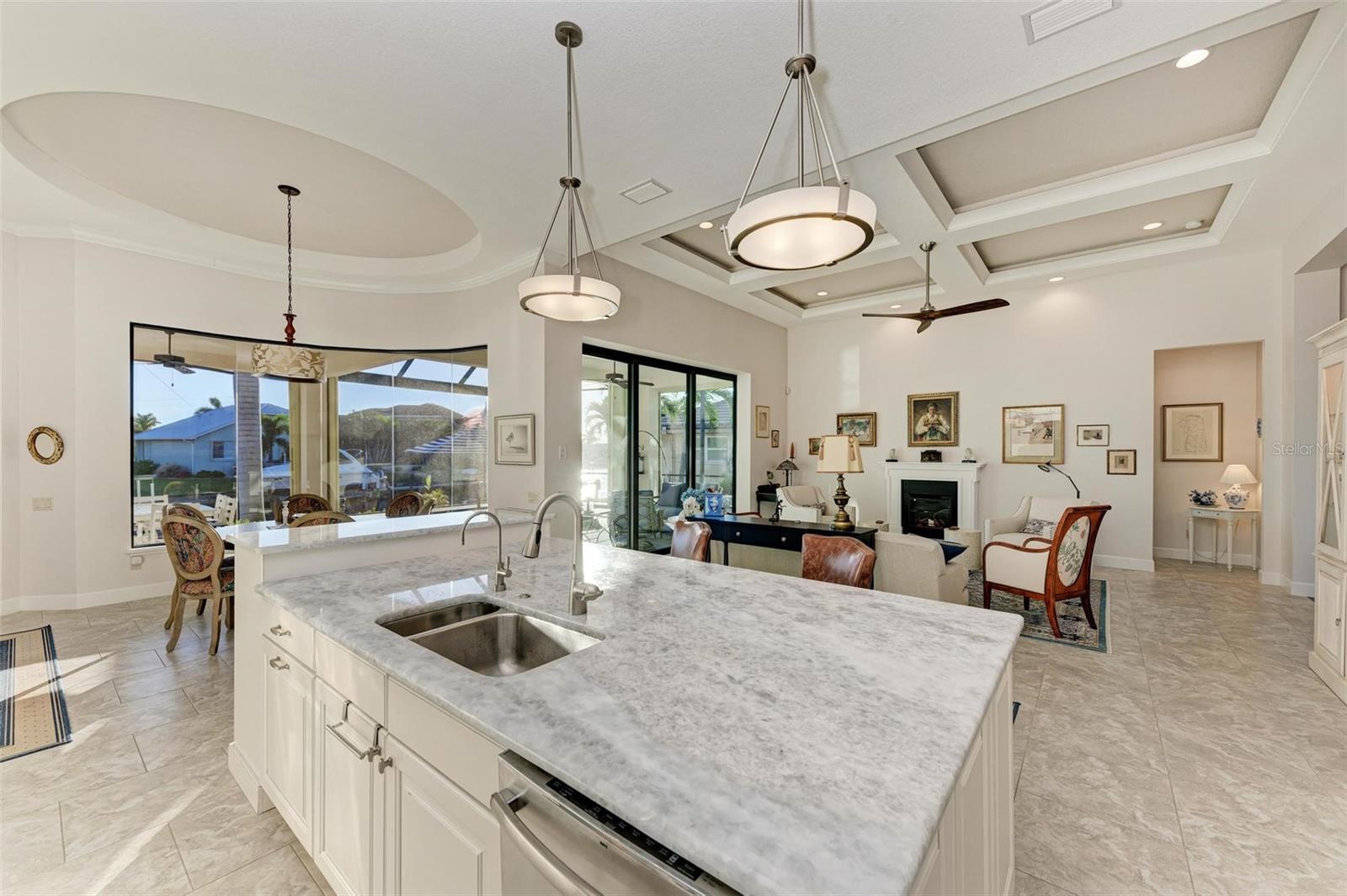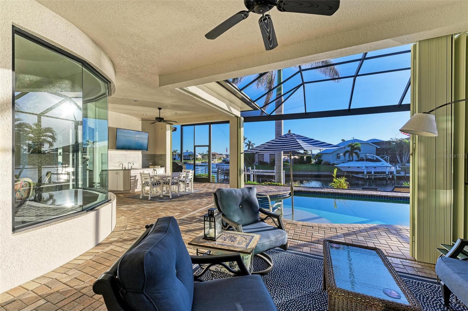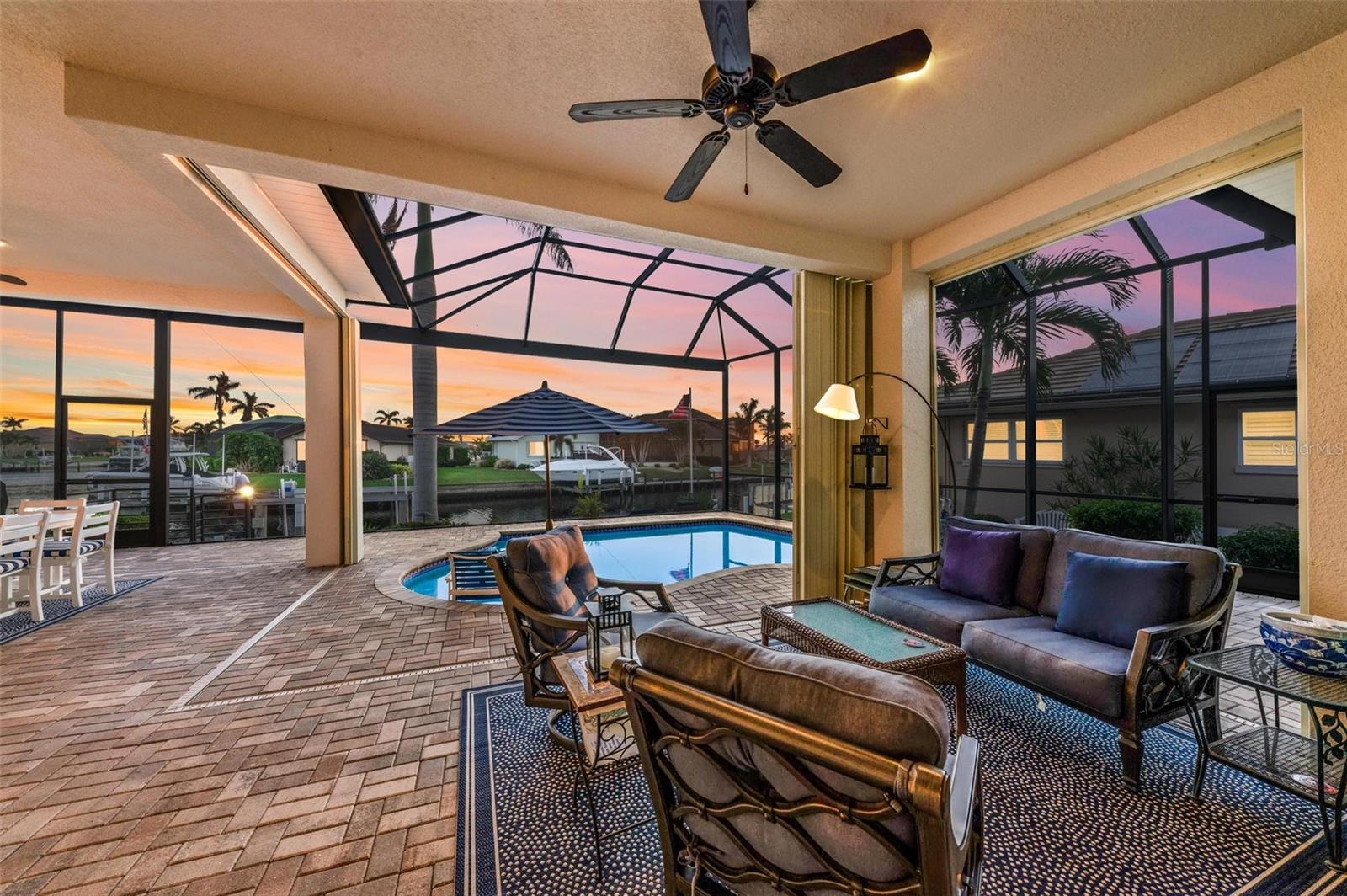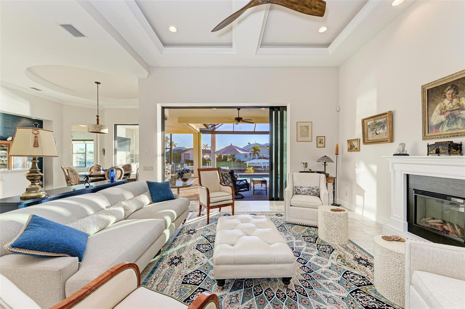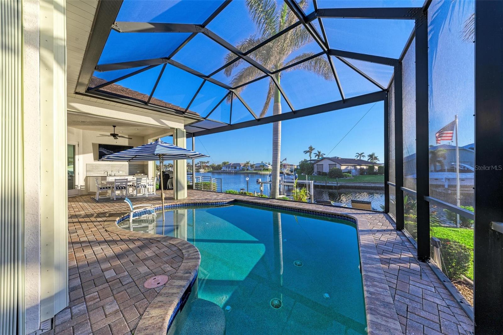 MOTIVATED SELLER FOR THIS Incredible 2016 built SOUTHERN EXPOSURE Turnberry II by Arthur Rutenberg WATERFRONT POOL HOME with DOCK/LIFT, 3 bedrooms, 3 bathrooms, a den, a 3-car garage and gorgeous finishes awaits new owners! Notice the incredible curb appeal with the architectural upgrades chosen including corbel details, a high-hat entry, large circular driveway, upgraded landscaping, and low voltage lighting. Inside the entry take in the niches with custom wallpaper applications, tray ceiling designs, 12' ceilings and 8' doors, beautiful tile and wood floors, custom lighting, and so much more! The open concept floor plan in ideal for entertaining with a spacious great room with coffered ceilings and a wall of pocket sliding glass doors all connected to the kitchen/dining rooms and outdoor spaces. The gourmet kitchen is a dream, with stone counters and custom cabinetry with glass front doors and both in-cabinet and under-cabinet lighting, upgraded stainless steel appliances, a breakfast bar, and a large walk-in pantry. The dining room has a custom round tray ceiling and aquarium glass windows to take in the outdoor views. To the right side of the home, the primary suite is a cozy retreat, with a separate sitting area with a wall of windows with Hunter Douglas blinds, a great space for large furniture, and is connected to a spa-like bathroom with private water closet, separate free-standing tub, large glass shower and massive walk-in closet with organizers. On the opposite side of the home, off the kitchen, find a great welcome center that connects to the garage with a built-in storage room with A/C, or it can be turned back into a 3 car garage. Notice the whole home generator JUST ADDED with buried propane tank for maximum hurricane protection/efficiency! Back inside, off of the welcome center, there is a spacious laundry room with great cabinets and sink, and at the opposite end of the welcome center, a spacious guest suite awaits, with en-suite bathroom with shower and walk-in closet. At the front of the home, a luxurious den with a wall of windows to take in the views and remote-control Hunter Douglas blinds is a wonderful space. Lastly, inside, find a guest bathroom with access to the pool and a 3rd bedroom with built-in storage (currently used as an office). Outside, there is an incredible heated pool with sun shelf, and great entertaining spaces, with two separate areas for both dining and relaxing, all overlooking the beautiful water views and glorious sunsets. Owners have added a separate patio outside of the lanai and an extended walkway to the dock with lift and 63' of city maintained concrete seawall, and great deep water sailboat access to Charlotte Harbor and the Gulf of Mexico! This home has incredible features and upgrades, so be sure to ask for the FEATURES SHEET & CLICK THE FULL VIRTUAL TOUR LINKS FOR ADDITIONAL DETAILS! Nearby to great golfing, shopping, restaurants, parks, Downtown Punta Gorda, I-75, and the PGD airport, this home is ideal. Schedule your showing today!