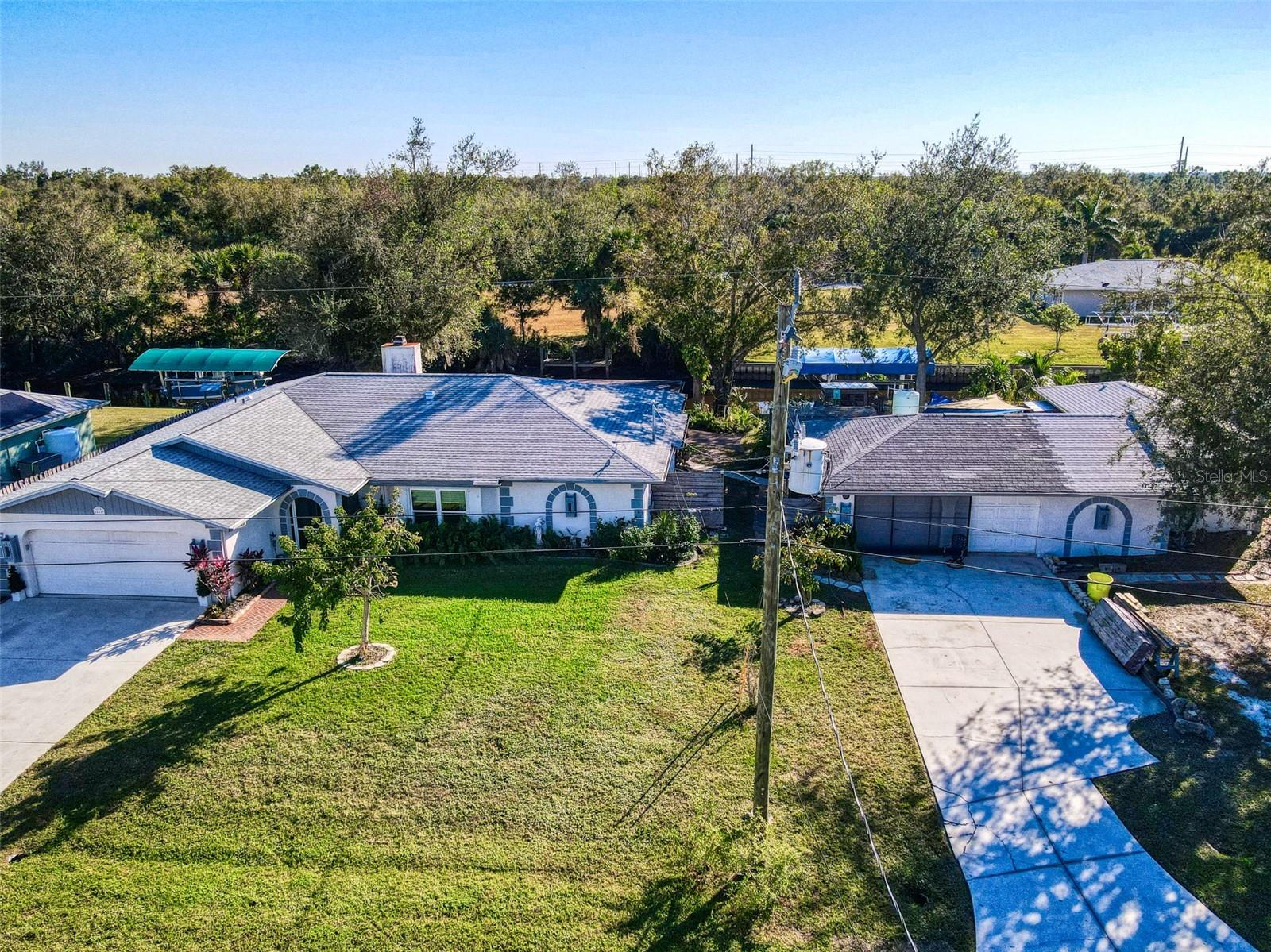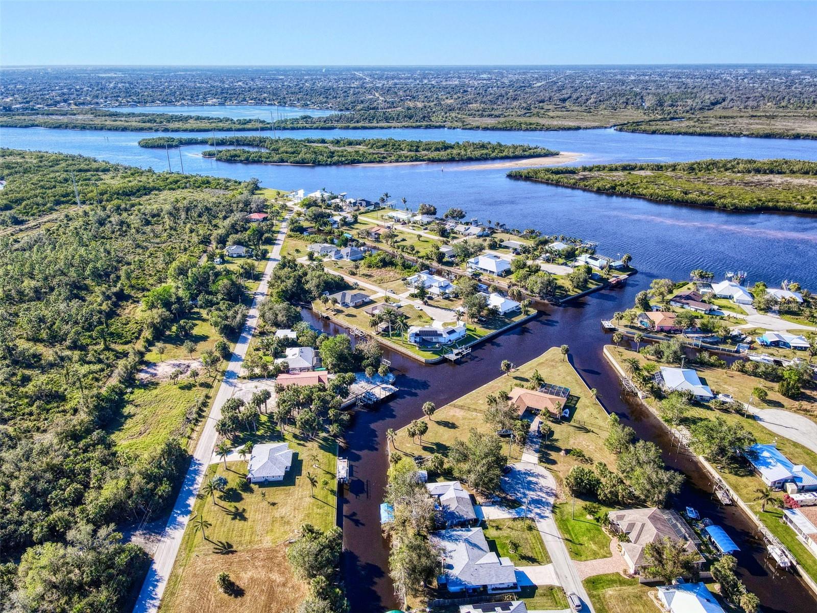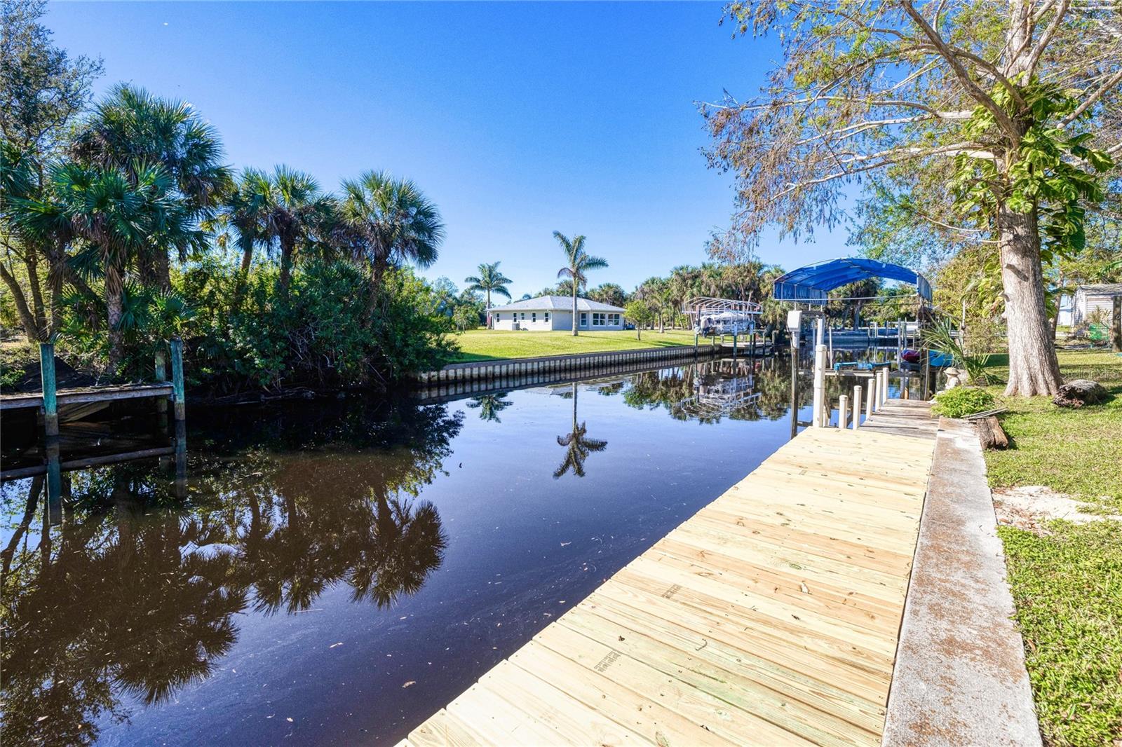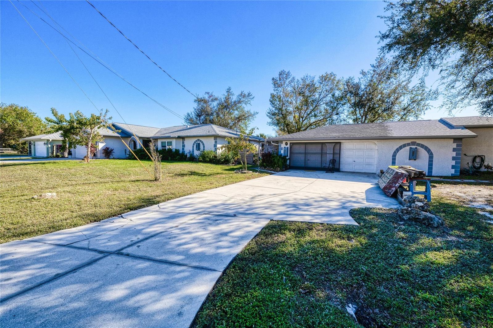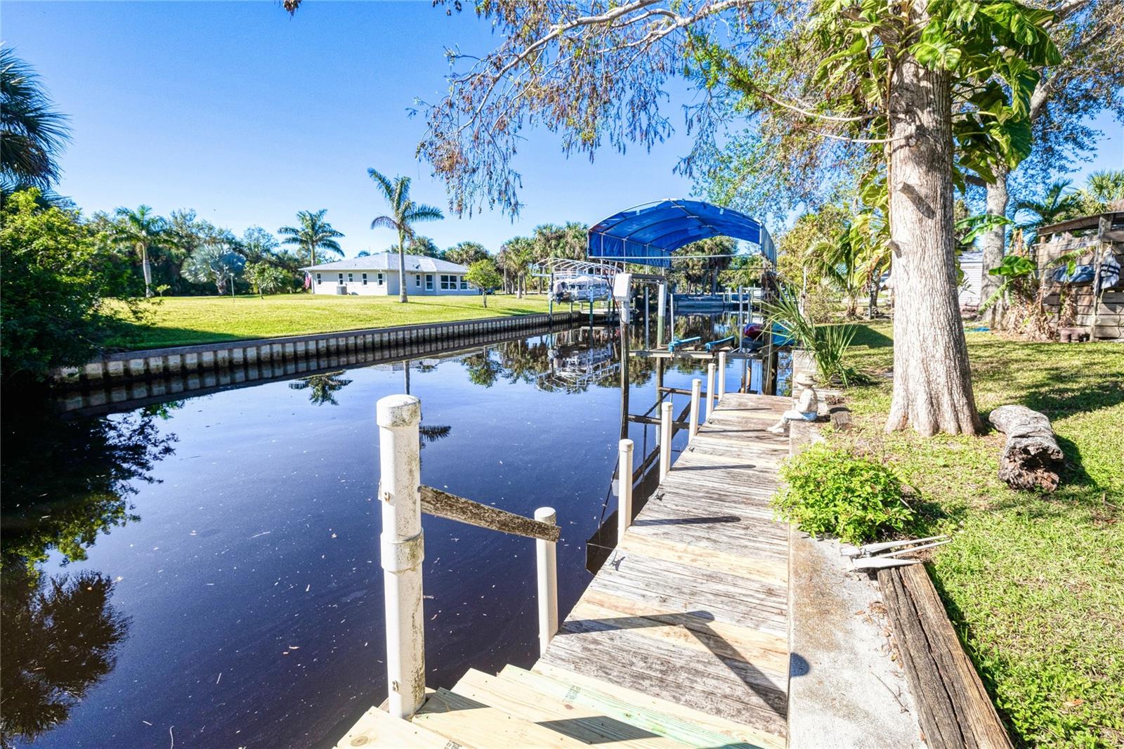 DON'T SKIP OVER THIS ONE, ITS TWO UPDATED LIVING STRUCTURES, 3 CAR GARAGES ON A DOUBLE SALT WATER LOT FOR THE PRICE OF ONE! ****ROOF 2020***NEW WHOLE HOME R.O SYSTEM 2024***NEW IMPACT WINDOWS AND MORE! Welcome to this one-of-a-kind, high-elevation waterfront property in the Palm Shores community(ONLY 15 MINUTES TO DOWNTOWN PUNTA GORDA), featuring a DETACHED 1 bed/ 1 bath, 744 SQ FT GUEST SUITE THATS ALL UNDER CENTRAL A/C and has its own 1 car garage. The current owner has a transferable flood policy at only $1,048 per year! Situated on a rare double lot (.43 acres) with 160 feet of water frontage on a 60-foot-wide deep saltwater canal, this home offers direct access by boat to the Peace River, Charlotte Harbor, and the Gulf of Mexico—ideal for boating and fishing. The detached 744 sq. ft. guest suite, built in 2020, includes a one-bedroom, one-bathroom layout with its own kitchen, in-suite laundry, vaulted ceilings, French-door entrance, and a charming paver patio overlooking the water. It offers comfort and privacy with its own A/C, hot water, septic system, and one-car garage. This versatile space is perfect for guests, a private office, workshop, or even rental income. The main house, built by Fero Homes, is a one-owner property thoughtfully renovated to blend modern luxury with timeless charm. Newer impact windows throughout ensure both natural light and peace of mind. The home features new luxury vinyl plank flooring and ceramic tile throughout, an open-concept split floor plan, and a wood-burning fireplace that adds warmth to the living area. The updated kitchen and living spaces flow seamlessly, with vaulted ceilings creating an open, airy atmosphere. Freshly painted in neutral tones, the home offers a calm, welcoming environment. A whole-home reverse osmosis system, installed in 2024, guarantees pristine water quality for both buildings. The roof was replaced in 2020, providing additional peace of mind. Step outside through the French doors to a nearly 400 sq. ft. screened lanai that expands your living space and offers spectacular water views and stunning sunsets. The private master suite includes an updated en-suite bathroom, walk-in closets, and direct access to the lanai, creating a serene retreat with natural surroundings. Outdoor enthusiasts will appreciate the 65-foot updated wood dock with a boat lift and canopy, perfect for docking your boat and enjoying immediate water access. This home offers the ultimate waterfront lifestyle, with updated features and versatile living spaces. Located in Palm Shores, this home is close to local amenities, downtown Punta Gorda, and a nearby nature preserve with trails and wildlife. For golf lovers, the community golf course provides even more outdoor recreation. Don’t miss the chance to own this waterfront gem—schedule your private tour today!