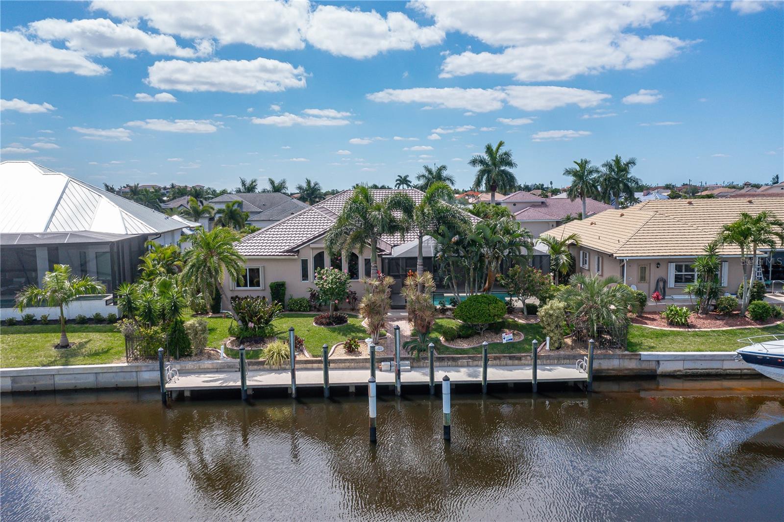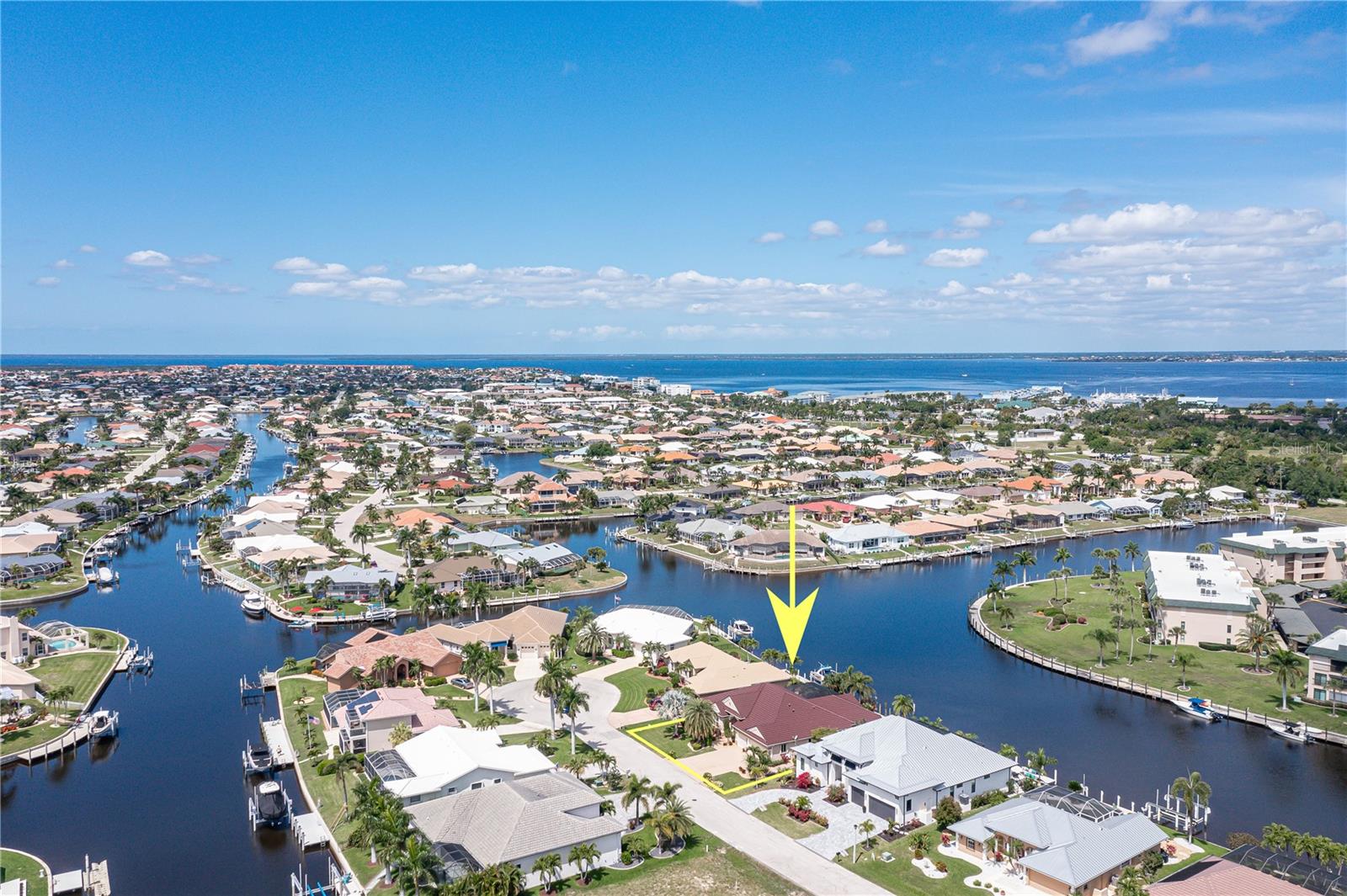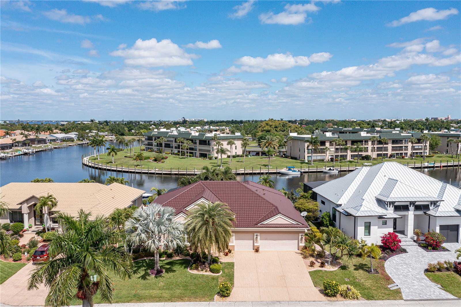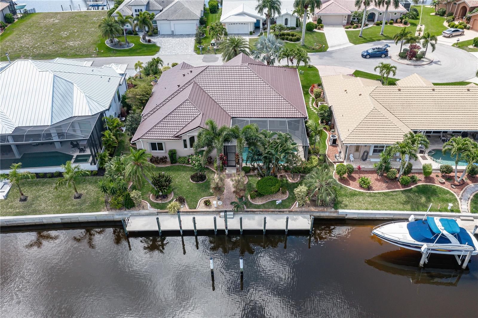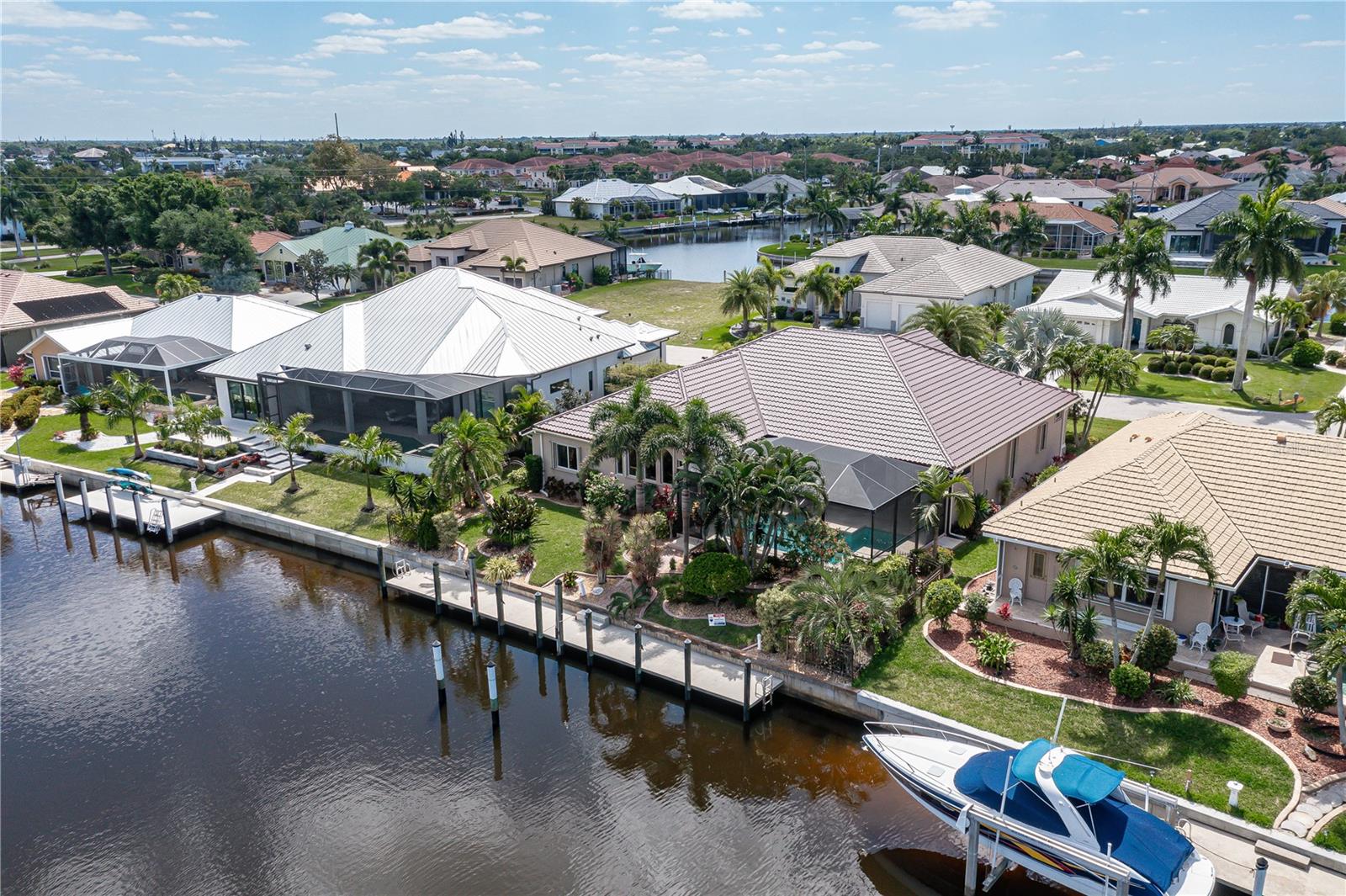PGI CUSTOM WATERFRONT BEAUTY W/QUICK BOATING ACCESS & **NEW ROOF** (INSTALLED MARCH 2024) (Roof Info at end of description). Custom, 3 bed/2 bath + study, waterfront home in Punta Gorda Isles is located on one of the few streets in PGI w/UNDERGROUND UTILITIES. Reach open water in under 15 minutes from your backyard! Inside, the home features a spacious, open floor plan w/formal living room, formal dining room & separate family room. Architectural details include HIGH CEILINGS throughout, tile floors in kitchen & family room, hardwood floors in living room & dining room, arched transom windows in front, & plantation shutters in bedrooms. The living room has beautiful, engineered hardwood flooring, crown molding & sliding glass doors that open to the lanai. Formal dining room has a tray ceiling & chair rail w/wainscot paneling beneath it. Study/home office is nestled just off the foyer & formal living room. It features a built-in desk w/two workstations & a walk-in closet. Easily converts to a 4th bedroom if desired w/removal of desk. The large, gourmet kitchen features granite counters, raised-panel cabinetry w/stepped upper cabinets, INDUCTION RANGE W/DOUBLE CONVECTION OVEN, kitchen R/O water filtration plus a breakfast bar, center island, closet pantry & walk-in butler's pantry. The adjacent breakfast area has a mitered bay window that overlooks the pool & canal view. The family room has a soaring cathedral ceiling, built-in entertainment center, tall windows & disappearing sliding glass doors that open to the lanai. Laundry room features additional storage cabinets w/built-in pantry plus a small storage closet. The master suite has walk-out access to the lanai, two walk-in closets & a large master bath. The master bath offers dual sinks, walk-in shower, linen closet & private WC. Split bedroom layout boasts two, large guest rooms (one w/walk-in closet) that share an elegant guest bath w/two sinks & a combination tub/shower. Outside, the lanai features an in-ground pool, summer kitchen & plenty of room for outdoor entertaining. Enjoy this outdoor living space that overlooks the canal view. The partially FENCED BACKYARD leads to the extended concrete dock. Dock has two outside pilings plus two posts w/slide moors. Water & electric hook-ups are available dockside. Start enjoying some of the best fishing & boating in SW Florida directly from your backyard. Other amenities include an OVERSIZED 3-CAR GARAGE w/bump out & overhead storage, whole-house HURRICANE PROTECTION w/mix of electric roll-downs, panels & accordion shutters, water softener, in-wall speaker system/intercom & humidistat. Lush, tropical landscaping surrounds the home creating the feel of a PRIVATE OASIS when sitting on your lanai. Property is located on a quiet street yet remains close to historic downtown, Fishermen's Village, PGICA building, library & Ring Around the City walking/biking trail. Start enjoying the active lifestyle Punta Gorda offers including golfing, fishing, tennis, pickleball & more. Punta Gorda also offers a lively art & music scene w/weekend festivals throughout the year. 200 MPH Worthouse Metal Tile Roof System installed by Apple Roofing in March 2024.