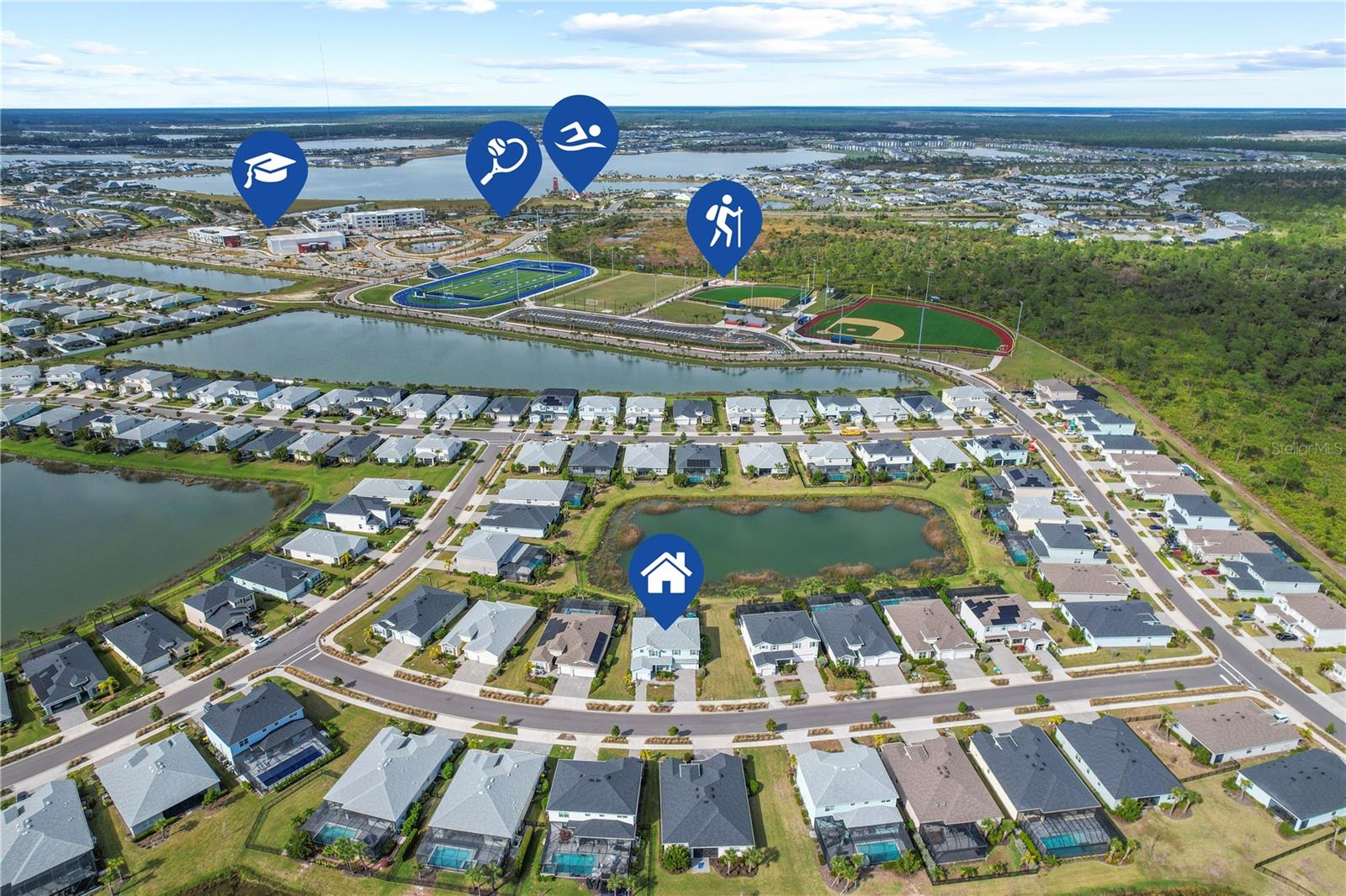 This house has EVERYTHING you want for your family!! Come see this expansive Majestica model home, with heated pool, with waterfall spa, extra large outdoor deck around the pool and even a pool bathroom. The huge 86 inch LG TV mounted on the wall in downstairs living room stays with the house along with the mounted TV's in upstairs living room and Master bedroom. The master bath has a bidet and there is also a built in Murphy bed in the downstairs bedroom that all stays with the house. This beautifully designed home offering five spacious bedrooms and four and a half baths. Each bedroom serves as a private retreat, while the ample bathrooms ensure both comfort and privacy. At the heart of the home lies a stunning kitchen featuring an extra large central island that takes center stage with a large breakfast nook, and formal dinning room perfect for entertaining. On the first floor is a living room, formal dining room, open living space with a kitchen, bedroom suite and an attached lanai for outdoor activities. Upstairs hosts the owner’s suite, three secondary bedrooms and a cozy loft overlooking the Great Room. The Master suite has two walk-in closets, walk-in shower, private water closet, and dual sinks.The three-car garage offers abundant storage and parking, accommodating all your needs. Come see this beautiful home with pool and spa in a beautiful neighborhood. The outside of the home has a classic-inspired exterior with open gable rooflines, horizontal siding, nice front porch, and decorative trim. Located in the highly sought-after community of Trails Edge with one of the lowest HOA fees in all of Babcock Ranch that includes lawn care, internet and is close to all the amenities and is centrally located close to Babcock K-12 Neighborhood School.Babcock Ranch is America’s first fully solar-powered town, this home offers access to multiple private community pools, nature trails, shopping, and dining. Experience the convenience of Babcock Ranch living with a vibrant array of amenities, including festivals, farmers' markets, concerts, a health gym, golf course access all in a golf cart-friendly community. There’s something for everyone, from lighted tennis, pickleball, and bocce courts to hundreds of clubs and activities each month. The K-12 neighborhood school features a new sports complex, playgrounds, dog parks, basket ball court and a skate park. Enjoy the extensive network of nature trails and parks. Babcock Ranch, a master-planned community, gained national recognition for maintaining power and internet during Hurricane Ian & Milton. Discover SW Florida at its finest, with beautiful parks and amenities right at your doorstep. Schedule your private tour today and make your dream home a reality in the extraordinary Babcock Ranch! Enjoy living with access to multiple private community pools, nature trails, with shopping and dining. Schedule your private tour today and make your dream home a reality! Come live a better life at Babcock Ranch!