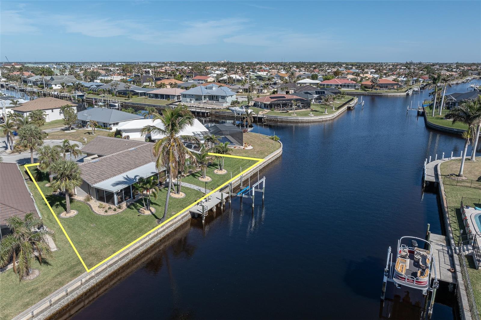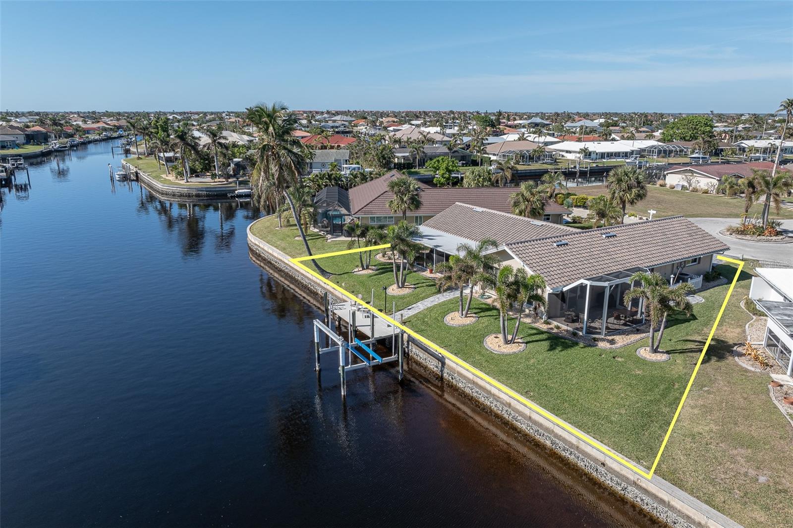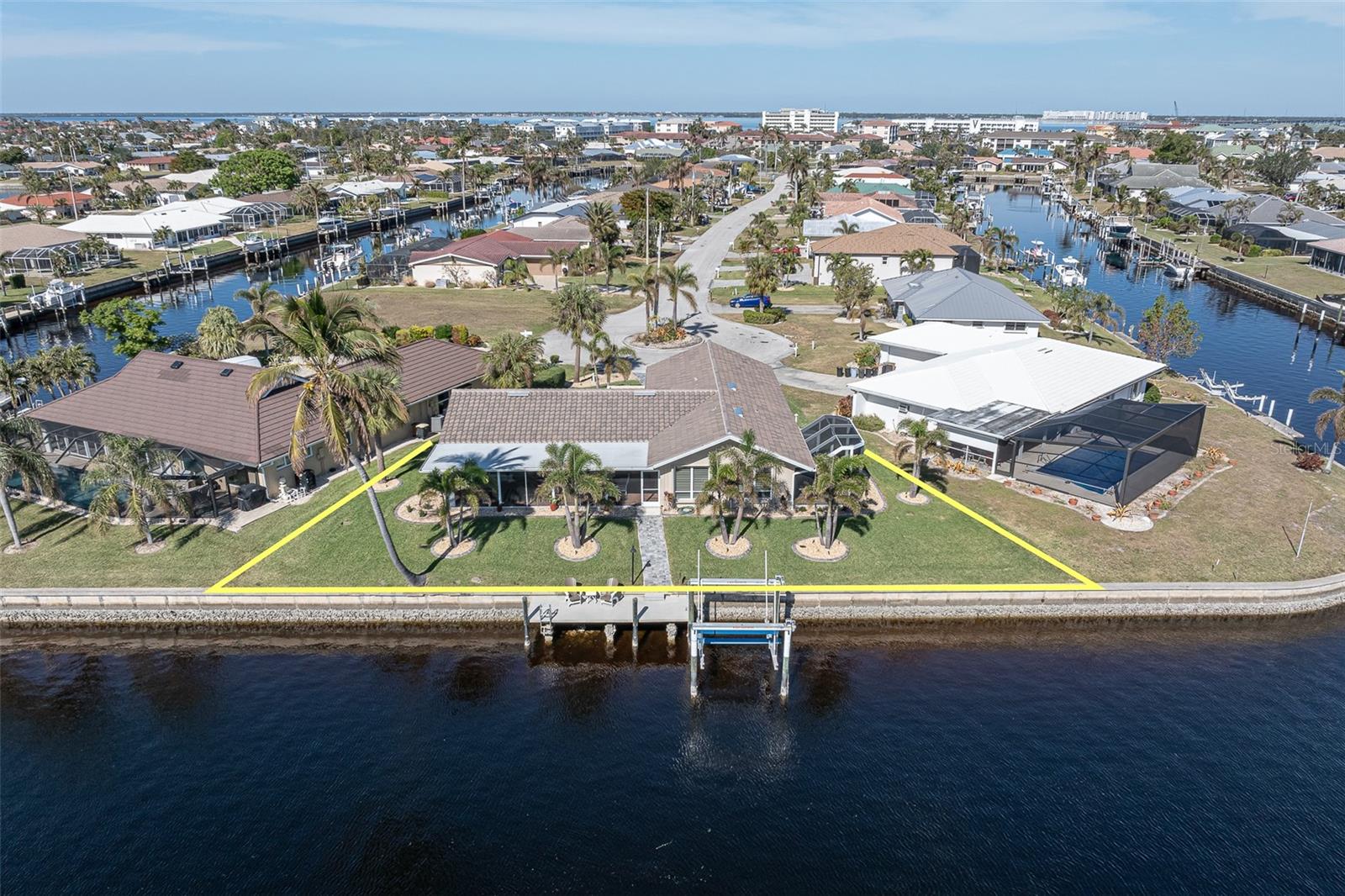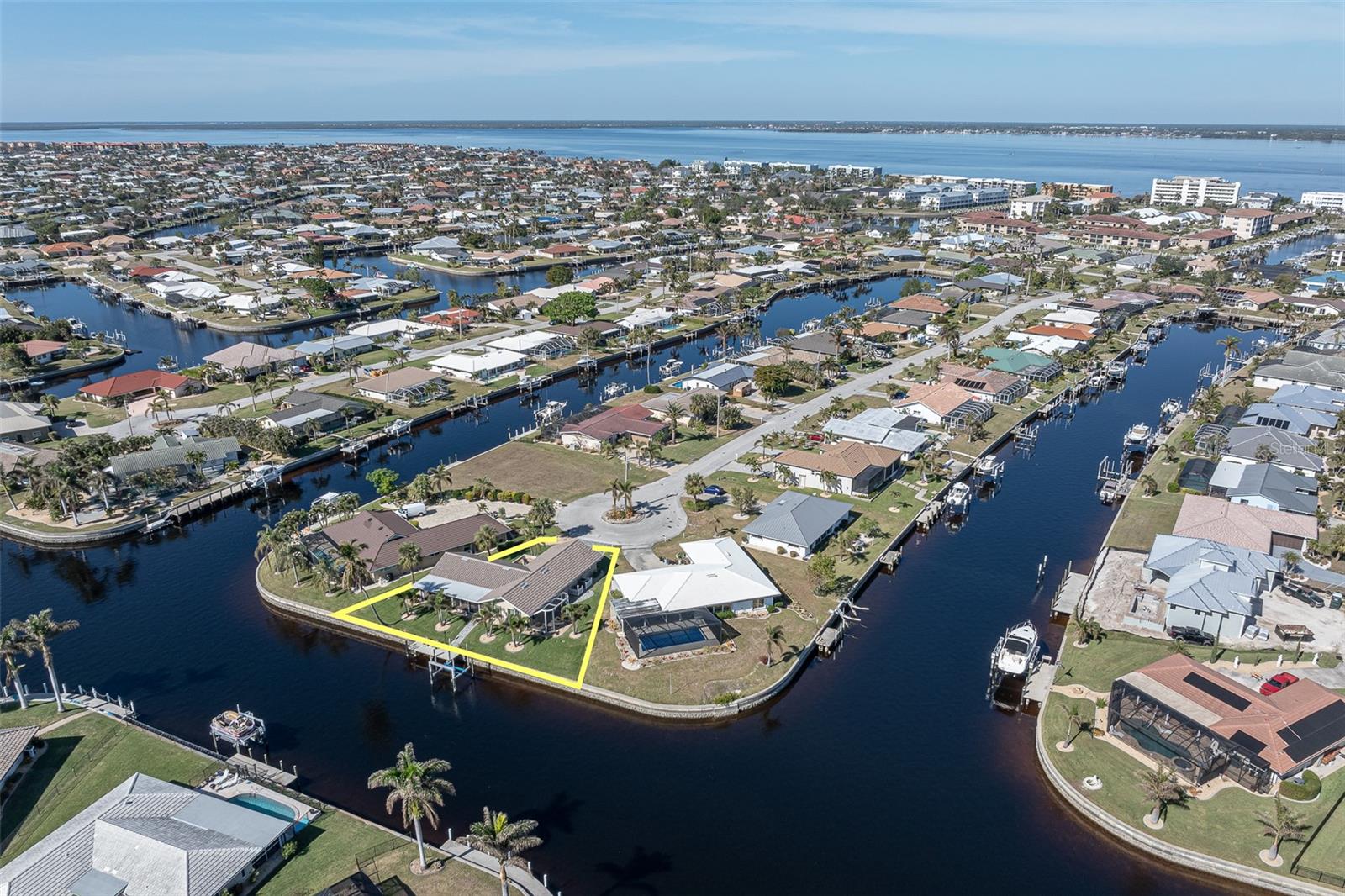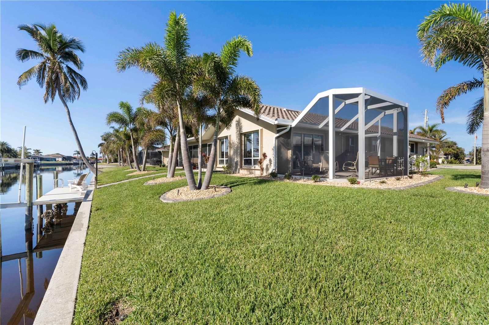 WATERFRONT HOME IN PUNTA GORDA ISLES ON KEY LOT W/**NEW ROOF**, SOUTHERN REAR EXPOSURE & PHENOMENAL VIEW - This updated 3 bed/2 bath, waterfront home has 140 ft of seawall & quick boating access to Charlotte Harbor. Home has been renovated w/updated kitchen & baths. Inside, the modified Bimini floor plan offers an elegant living space featuring Brazilian cherry wood floors. Disappearing sliding glass doors seamlessly connect the living/dining area to the screened lanai, complete with a brick paver deck, where you can relax and enjoy panoramic water views. Home is perfect for Florida living with almost every room in the home opening to an outdoor living space. The kitchen has granite counters, wood cabinetry & under cabinet lighting. The adjacent breakfast area offers stunning canal view & thanks to the southern rear exposure, you can catch glimpses of both the sunrise & sunset. The split bedroom layout features a spacious master suite w/spa-like master bath & an oversized walk-in closet. The master bath has dual sinks & a tiled shower w/rainfall shower head & built-in corner bench. The guest bedrooms share an updated guest bath. One guest room is currently used as a den/family room w/pocket doors opening to the kitchen area & sliding glass doors that open to a second screened patio that provides additional outdoor entertaining space. There's room for a pool, if desired. Renderings for potential pool attached to MLS. Brick paver walkway leads to the extended concrete dock w/10,000 lb boat lift that was added in 2018. Water & electric hook-ups are available dockside. Start enjoying some of the best fishing & boating SW Florida has to offer from your backyard. Reach open water in under 15 minutes. Other updates include NEW EAGLE TILE ROOF (2023), whole house replumb with PEX (2020), home rewired (2014), NEW paver driveway/walkways (2022) & NEW irrigation system (2022). Home has an attached two-car garage with an epoxy floor (2021), NEW storage cabinets & slatwall (2021). Hurricane protection provided by steel accordion shutters & an electric Kevlar screen on the main lanai. Thanks to the home’s high elevation, it experienced no flooding or water intrusion during recent hurricanes. Consider joining the Punta Gorda Isles Civic Association - here you'll find numerous social and boating clubs to connect with like-minded neighbors. Miles of sidewalks in PGI easily connect you to numerous parks, Fishermen's Village, the library, the PGICA building & historic downtown. There's more to Punta Gorda than boating, an active lifestyle awaits here w/golfing, fishing, tennis, pickleball & more. The city also offers a lively art & music scene w/weekend festivals throughout the year. Discover why Punta Gorda Isles is considered a hidden gem of SW Florida. Make an appointment today.