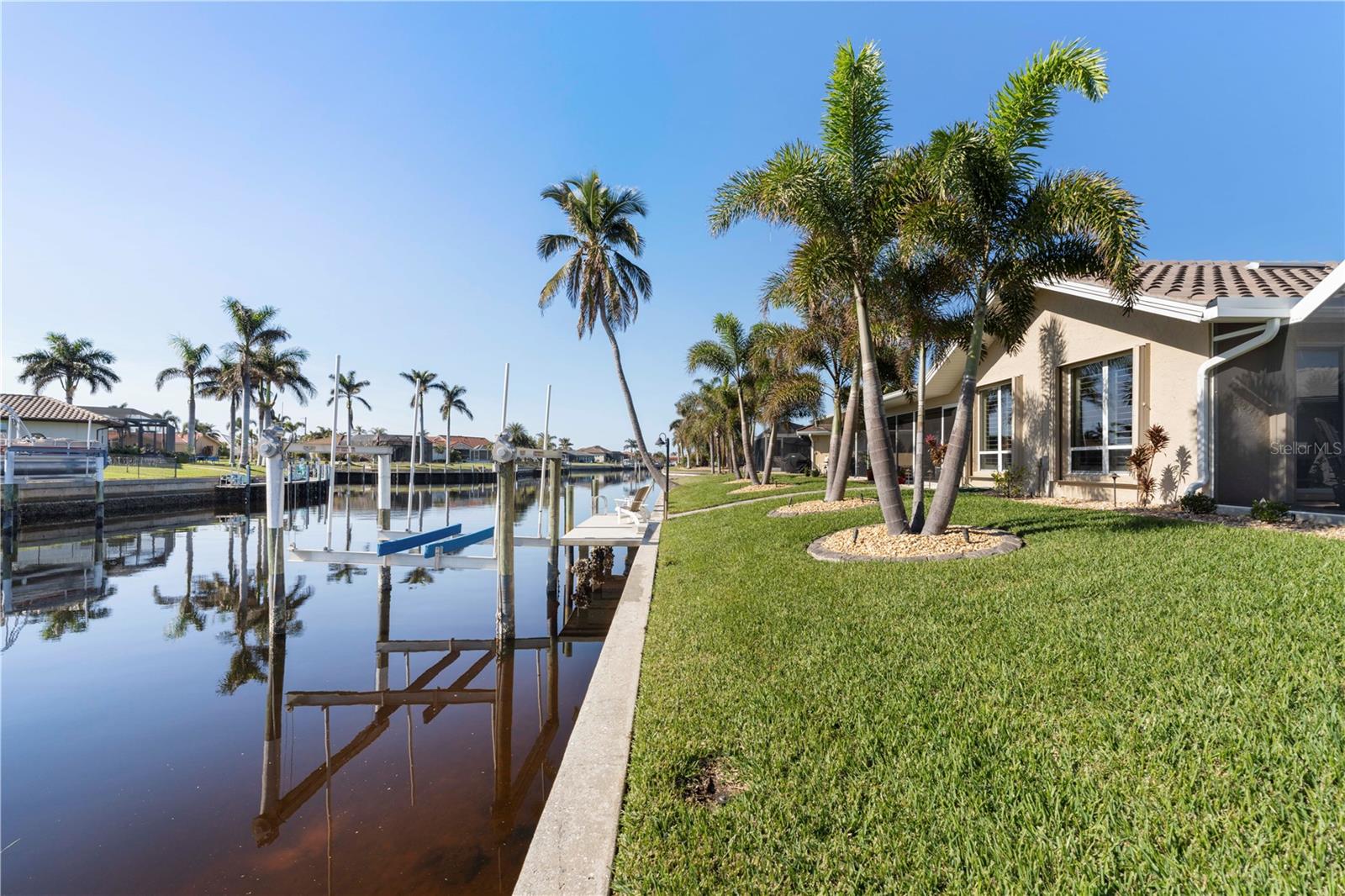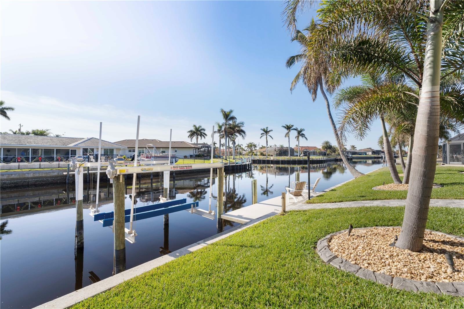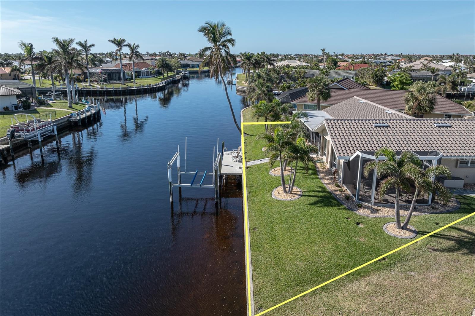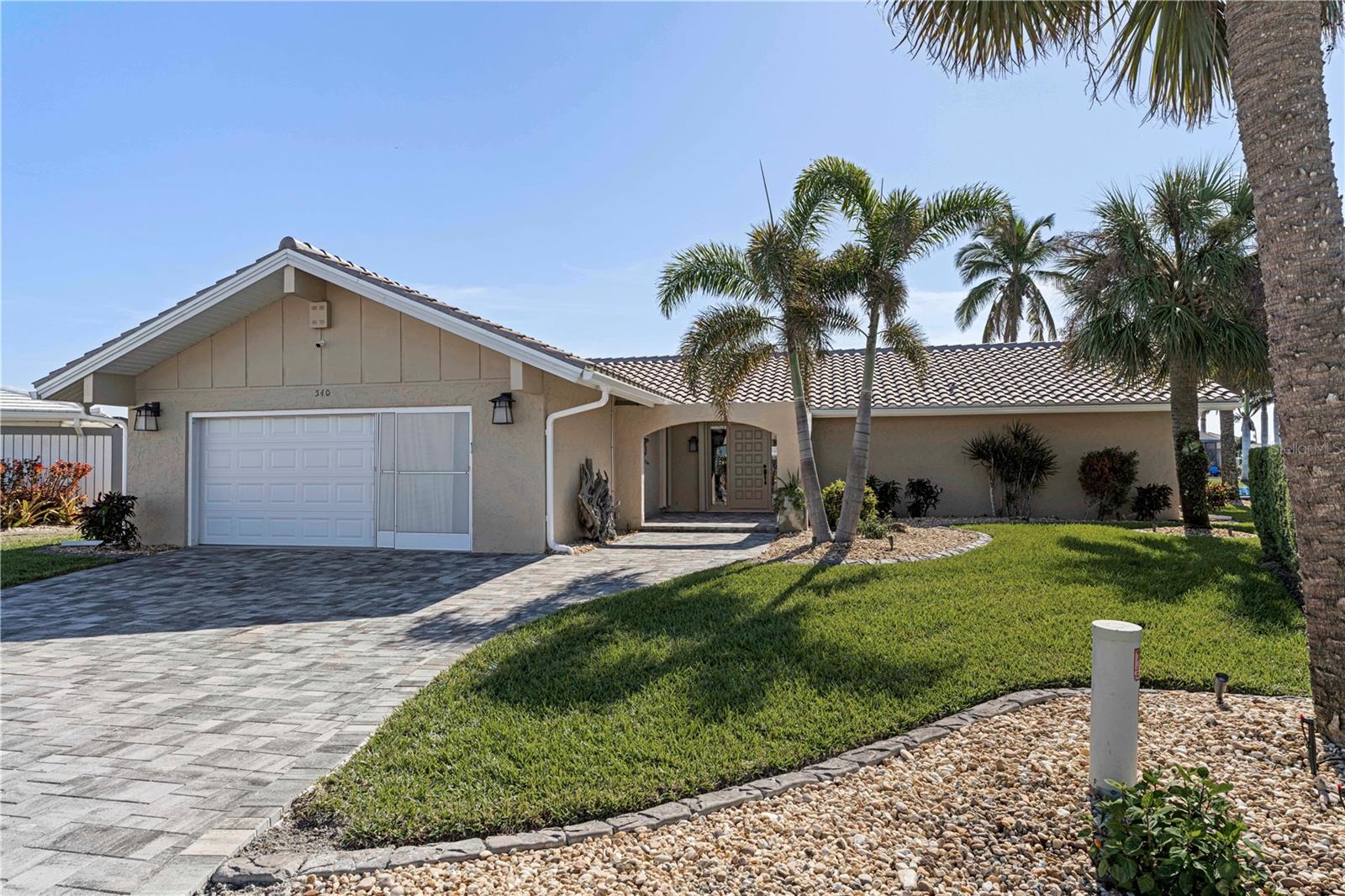 WATERFRONT HOME IN PUNTA GORDA ISLES ON KEY LOT W/**NEW ROOF**, SOUTHERN REAR EXPOSURE & PHENOMENAL VIEW - This updated 3 bed/2 bath, waterfront home has 140 ft of seawall & quick boating access to Charlotte Harbor. Home has been renovated w/updated kitchen & baths. Inside, the modified Bimini floor plan offers an elegant living space featuring Brazilian cherry wood floors. Disappearing sliding glass doors seamlessly connect the living/dining area to the screened lanai, complete with a brick paver deck, where you can relax and enjoy panoramic water views. Home is perfect for Florida living with almost every room in the home opening to an outdoor living space. The kitchen has granite counters, wood cabinetry & under cabinet lighting. The adjacent breakfast area offers stunning canal view & thanks to the southern rear exposure, you can catch glimpses of both the sunrise & sunset. The split bedroom layout features a spacious master suite w/spa-like master bath & an oversized walk-in closet. The master bath has dual sinks & a tiled shower w/rainfall shower head & built-in corner bench. The guest bedrooms share an updated guest bath. One guest room is currently used as a den/family room w/pocket doors opening to the kitchen area & sliding glass doors that open to a second screened patio that provides additional outdoor entertaining space. There's room for a pool, if desired. Renderings for potential pool attached to MLS. Brick paver walkway leads to the extended concrete dock w/10,000 lb boat lift that was added in 2018. Water & electric hook-ups are available dockside. Start enjoying some of the best fishing & boating SW Florida has to offer from your backyard. Reach open water in under 15 minutes. Other updates include NEW EAGLE TILE ROOF (2023), whole house replumb with PEX (2020), home rewired (2014), NEW paver driveway/walkways (2022) & NEW irrigation system (2022). Home has an attached two-car garage with an epoxy floor (2021), NEW storage cabinets & slatwall (2021). Hurricane protection provided by steel accordion shutters & an electric Kevlar screen on the main lanai. Thanks to the home’s high elevation, it experienced no flooding or water intrusion during recent hurricanes. Consider joining the Punta Gorda Isles Civic Association - here you'll find numerous social and boating clubs to connect with like-minded neighbors. Miles of sidewalks in PGI easily connect you to numerous parks, Fishermen's Village, the library, the PGICA building & historic downtown. There's more to Punta Gorda than boating, an active lifestyle awaits here w/golfing, fishing, tennis, pickleball & more. The city also offers a lively art & music scene w/weekend festivals throughout the year. Discover why Punta Gorda Isles is considered a hidden gem of SW Florida. Make an appointment today.