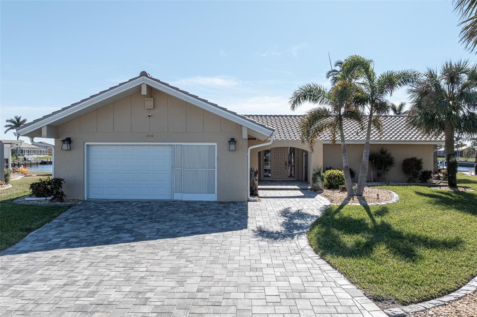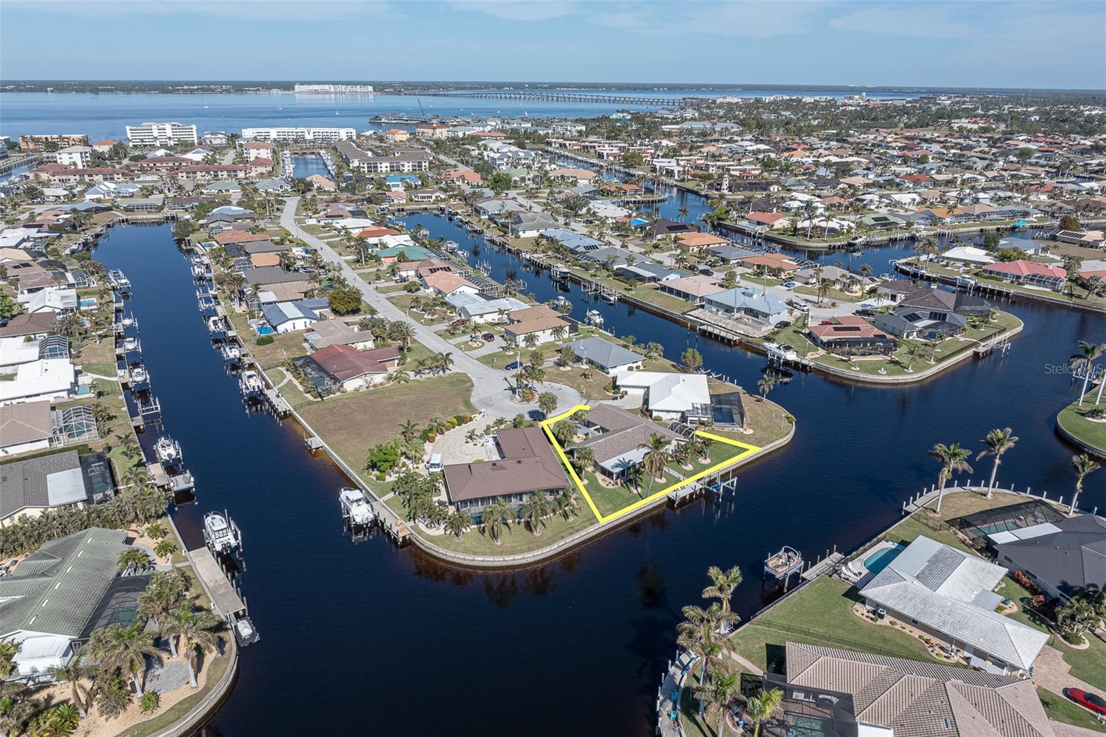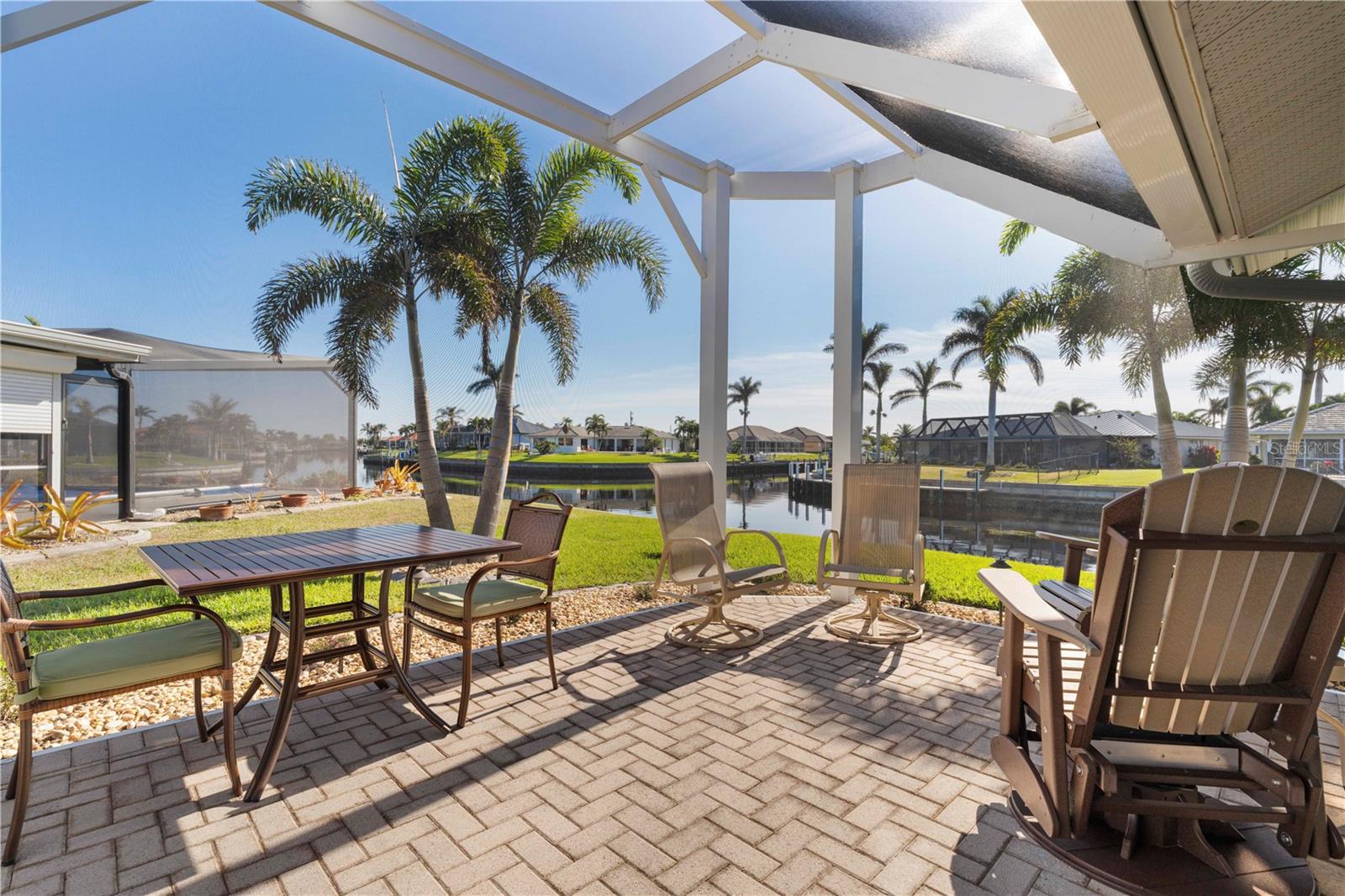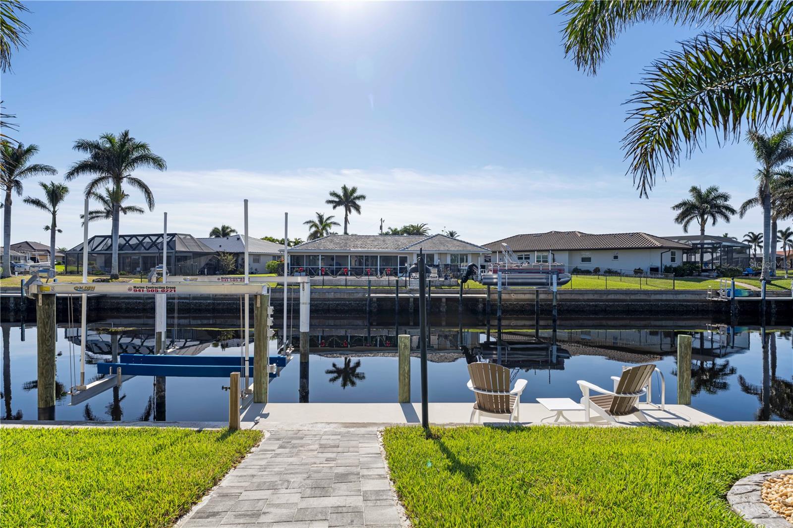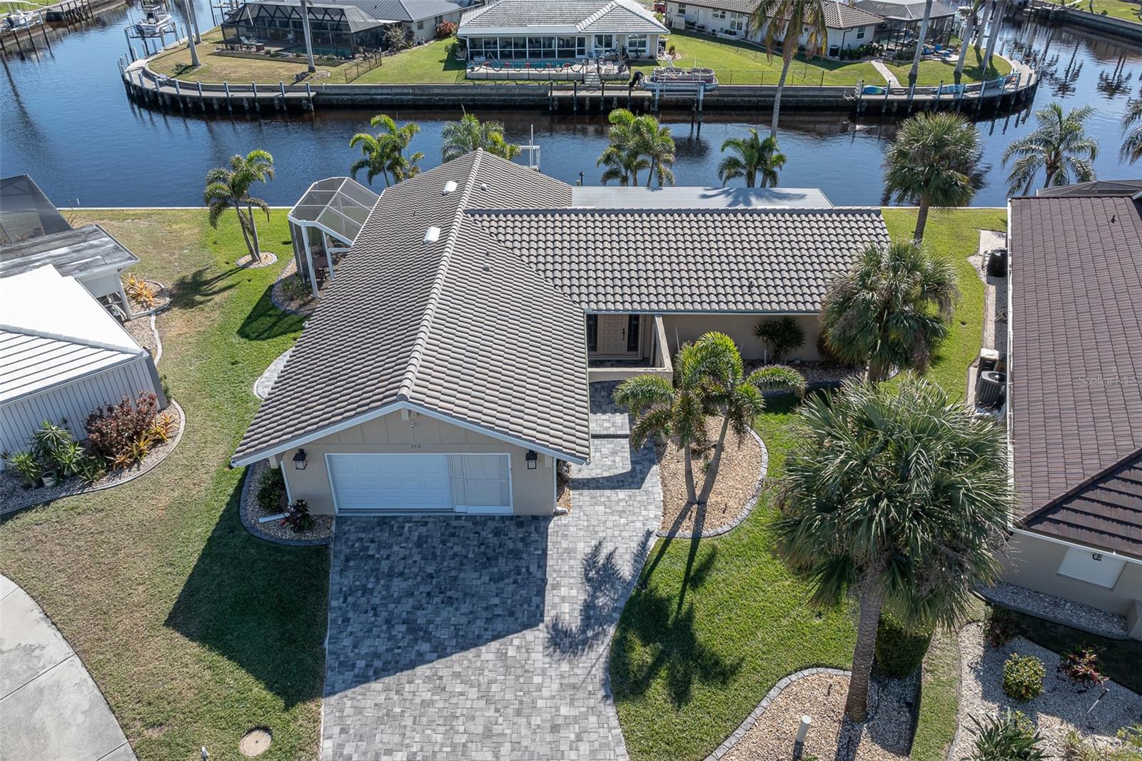 WATERFRONT HOME IN PUNTA GORDA ISLES ON KEY LOT W/**NEW ROOF**, SOUTHERN REAR EXPOSURE & PHENOMENAL VIEW - This updated 3 bed/2 bath, waterfront home has 140 ft of seawall & quick boating access to Charlotte Harbor. Home has been renovated w/updated kitchen & baths. Inside, the modified Bimini floor plan offers an elegant living space featuring Brazilian cherry wood floors. Disappearing sliding glass doors seamlessly connect the living/dining area to the screened lanai, complete with a brick paver deck, where you can relax and enjoy panoramic water views. Home is perfect for Florida living with almost every room in the home opening to an outdoor living space. The kitchen has granite counters, wood cabinetry & under cabinet lighting. The adjacent breakfast area offers stunning canal view & thanks to the southern rear exposure, you can catch glimpses of both the sunrise & sunset. The split bedroom layout features a spacious master suite w/spa-like master bath & an oversized walk-in closet. The master bath has dual sinks & a tiled shower w/rainfall shower head & built-in corner bench. The guest bedrooms share an updated guest bath. One guest room is currently used as a den/family room w/pocket doors opening to the kitchen area & sliding glass doors that open to a second screened patio that provides additional outdoor entertaining space. There's room for a pool, if desired. Renderings for potential pool attached to MLS. Brick paver walkway leads to the extended concrete dock w/10,000 lb boat lift that was added in 2018. Water & electric hook-ups are available dockside. Start enjoying some of the best fishing & boating SW Florida has to offer from your backyard. Reach open water in under 15 minutes. Other updates include NEW EAGLE TILE ROOF (2023), whole house replumb with PEX (2020), home rewired (2014), NEW paver driveway/walkways (2022) & NEW irrigation system (2022). Home has an attached two-car garage with an epoxy floor (2021), NEW storage cabinets & slatwall (2021). Hurricane protection provided by steel accordion shutters & an electric Kevlar screen on the main lanai. Thanks to the home’s high elevation, it experienced no flooding or water intrusion during recent hurricanes. Consider joining the Punta Gorda Isles Civic Association - here you'll find numerous social and boating clubs to connect with like-minded neighbors. Miles of sidewalks in PGI easily connect you to numerous parks, Fishermen's Village, the library, the PGICA building & historic downtown. There's more to Punta Gorda than boating, an active lifestyle awaits here w/golfing, fishing, tennis, pickleball & more. The city also offers a lively art & music scene w/weekend festivals throughout the year. Discover why Punta Gorda Isles is considered a hidden gem of SW Florida. Make an appointment today.