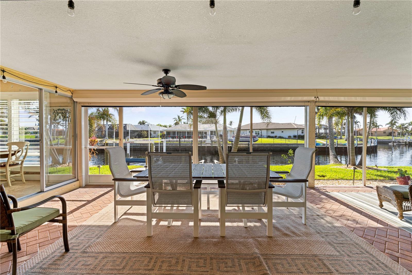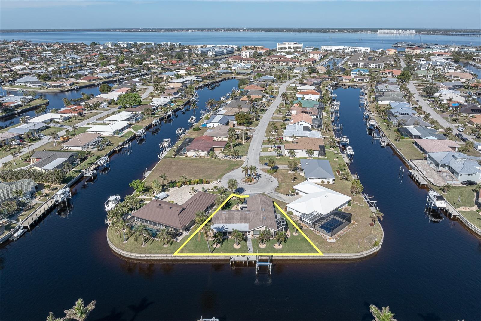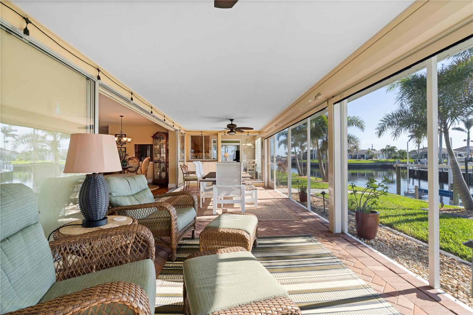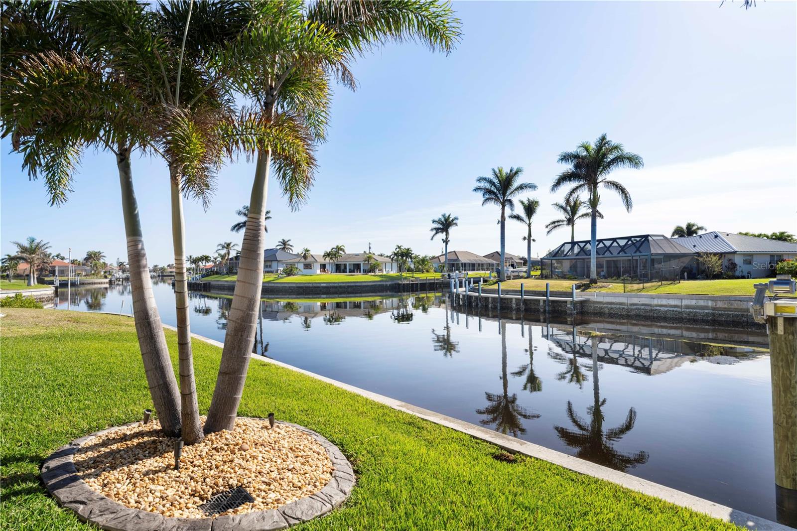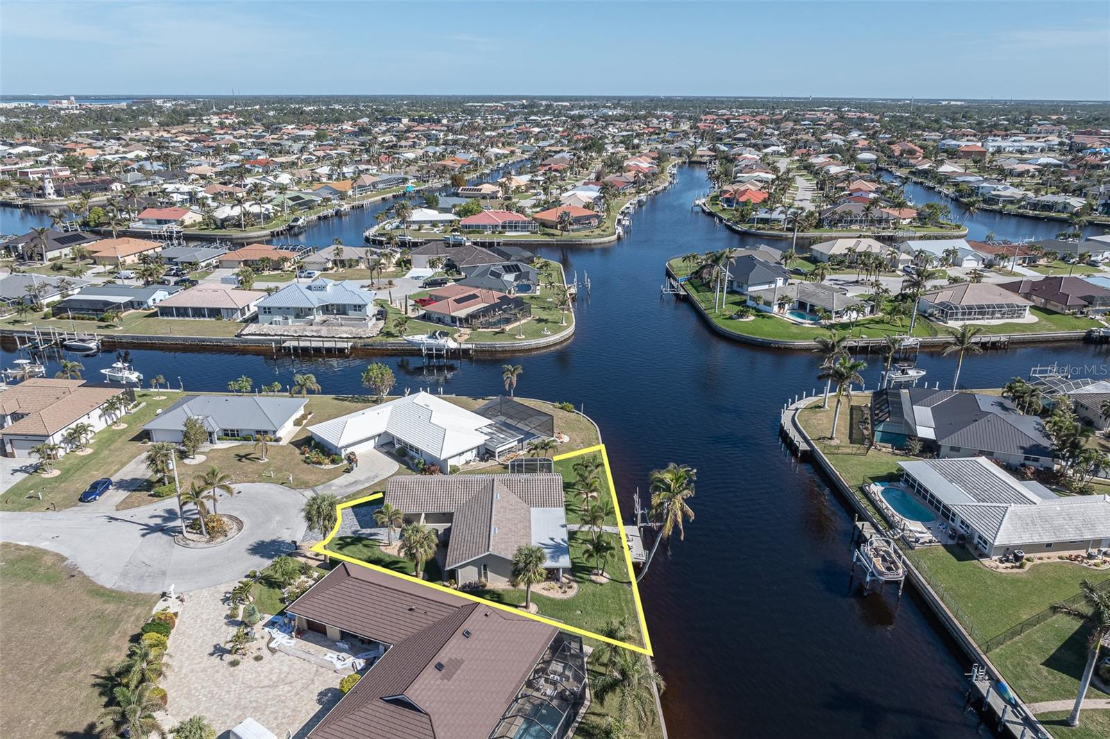 WATERFRONT HOME IN PUNTA GORDA ISLES ON KEY LOT W/**NEW ROOF**, SOUTHERN REAR EXPOSURE & PHENOMENAL VIEW - This updated 3 bed/2 bath, waterfront home has 140 ft of seawall & quick boating access to Charlotte Harbor. Home has been renovated w/updated kitchen & baths. Inside, the modified Bimini floor plan offers an elegant living space featuring Brazilian cherry wood floors. Disappearing sliding glass doors seamlessly connect the living/dining area to the screened lanai, complete with a brick paver deck, where you can relax and enjoy panoramic water views. Home is perfect for Florida living with almost every room in the home opening to an outdoor living space. The kitchen has granite counters, wood cabinetry & under cabinet lighting. The adjacent breakfast area offers stunning canal view & thanks to the southern rear exposure, you can catch glimpses of both the sunrise & sunset. The split bedroom layout features a spacious master suite w/spa-like master bath & an oversized walk-in closet. The master bath has dual sinks & a tiled shower w/rainfall shower head & built-in corner bench. The guest bedrooms share an updated guest bath. One guest room is currently used as a den/family room w/pocket doors opening to the kitchen area & sliding glass doors that open to a second screened patio that provides additional outdoor entertaining space. There's room for a pool, if desired. Renderings for potential pool attached to MLS. Brick paver walkway leads to the extended concrete dock w/10,000 lb boat lift that was added in 2018. Water & electric hook-ups are available dockside. Start enjoying some of the best fishing & boating SW Florida has to offer from your backyard. Reach open water in under 15 minutes. Other updates include NEW EAGLE TILE ROOF (2023), whole house replumb with PEX (2020), home rewired (2014), NEW paver driveway/walkways (2022) & NEW irrigation system (2022). Home has an attached two-car garage with an epoxy floor (2021), NEW storage cabinets & slatwall (2021). Hurricane protection provided by steel accordion shutters & an electric Kevlar screen on the main lanai. Thanks to the home’s high elevation, it experienced no flooding or water intrusion during recent hurricanes. Consider joining the Punta Gorda Isles Civic Association - here you'll find numerous social and boating clubs to connect with like-minded neighbors. Miles of sidewalks in PGI easily connect you to numerous parks, Fishermen's Village, the library, the PGICA building & historic downtown. There's more to Punta Gorda than boating, an active lifestyle awaits here w/golfing, fishing, tennis, pickleball & more. The city also offers a lively art & music scene w/weekend festivals throughout the year. Discover why Punta Gorda Isles is considered a hidden gem of SW Florida. Make an appointment today.