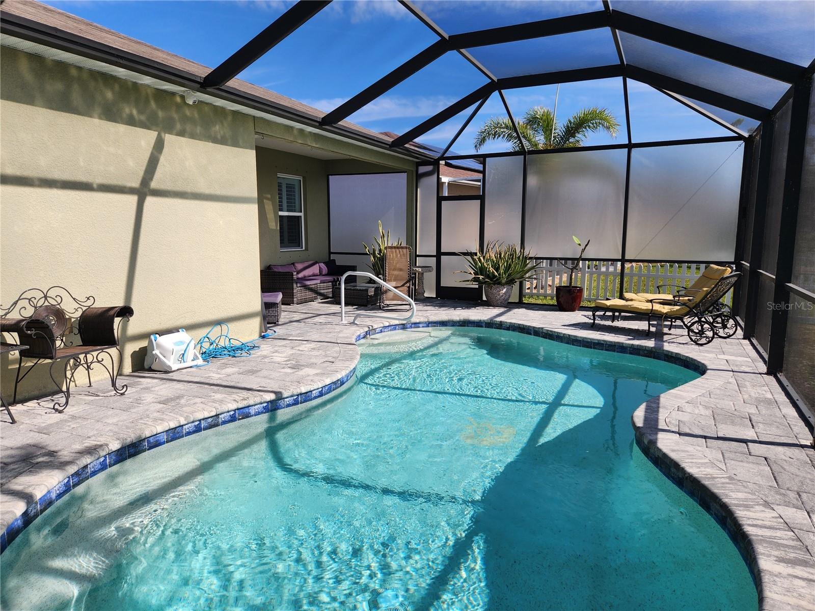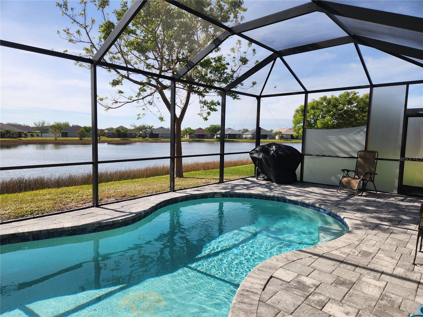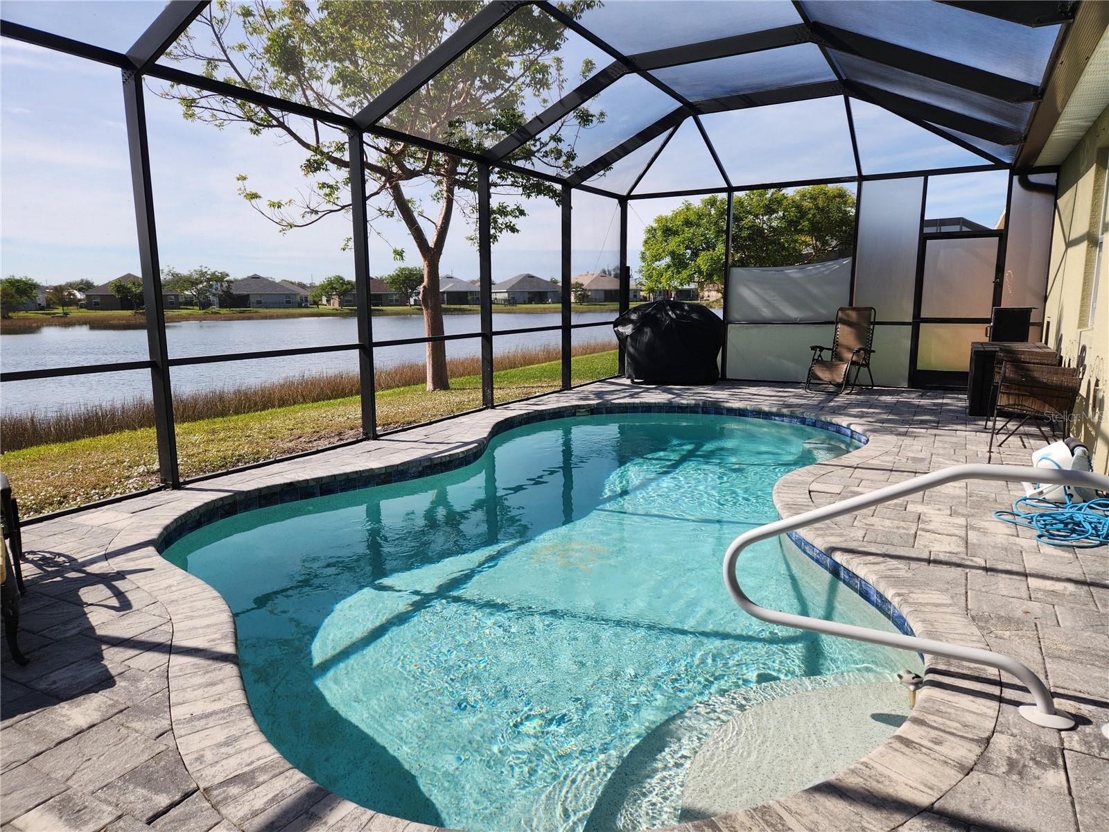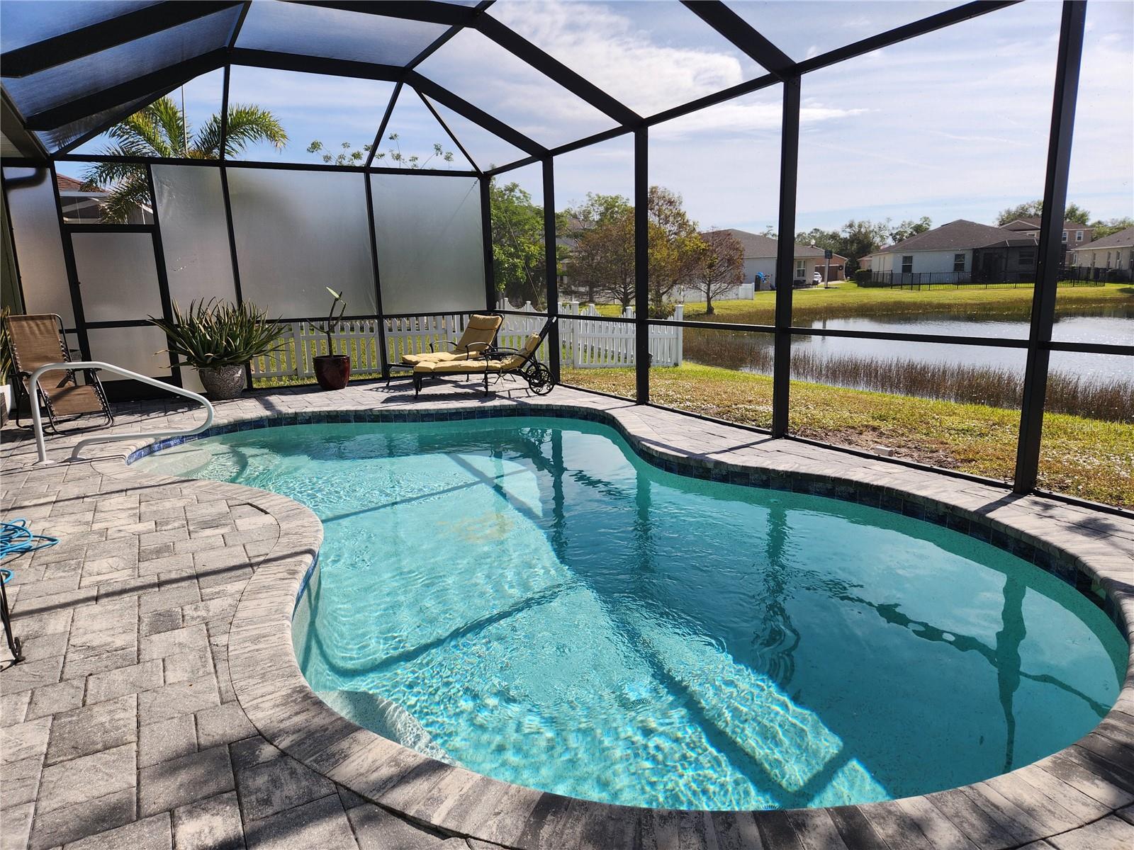 CreekSide – 4 Bedroom / 2 Bathroom with Heated Pool on a Lake. Very well kept & maintained; move-in ready. Tile floors throughout the entire home, beautiful kitchen and an open floor plan. Many upgrades including high ceilings (9’), plantation shutters on all windows, 4-camera CCTV security system, irrigation system and an ultra-efficient state-of-the-art hybrid water heater. The split floor plan has the master bedroom in the rear looking out over the lake. It features a large walk-in closet and bathroom with both a shower and tub and vanity with dual sinks. Two-car garage with hanging storage, screened entry way and a screen enclosed heated pool with a covered lanai. No damage or flooding from hurricanes Ian, Helene or Milton. Not in a flood zone so flood insurance is not required.