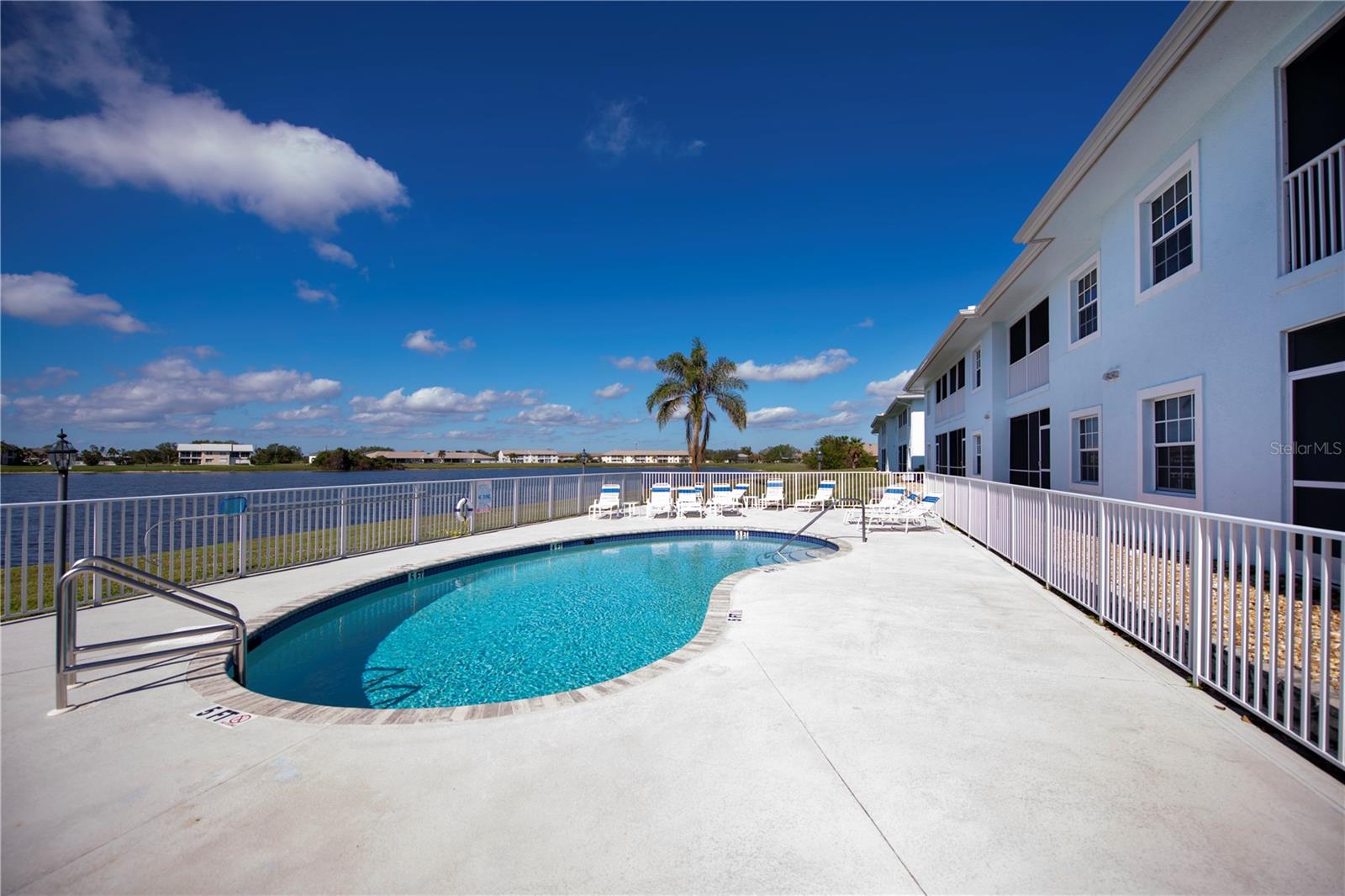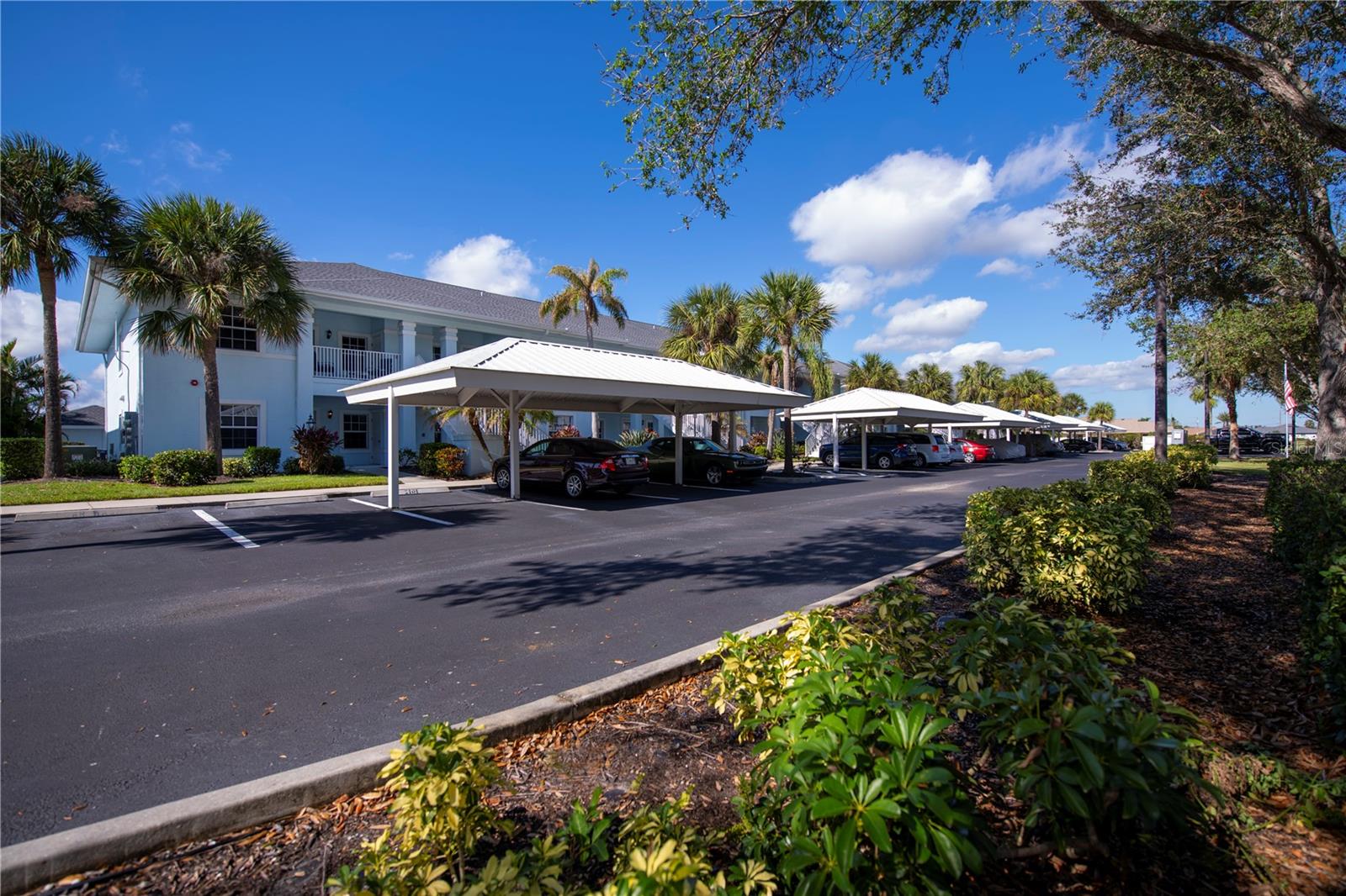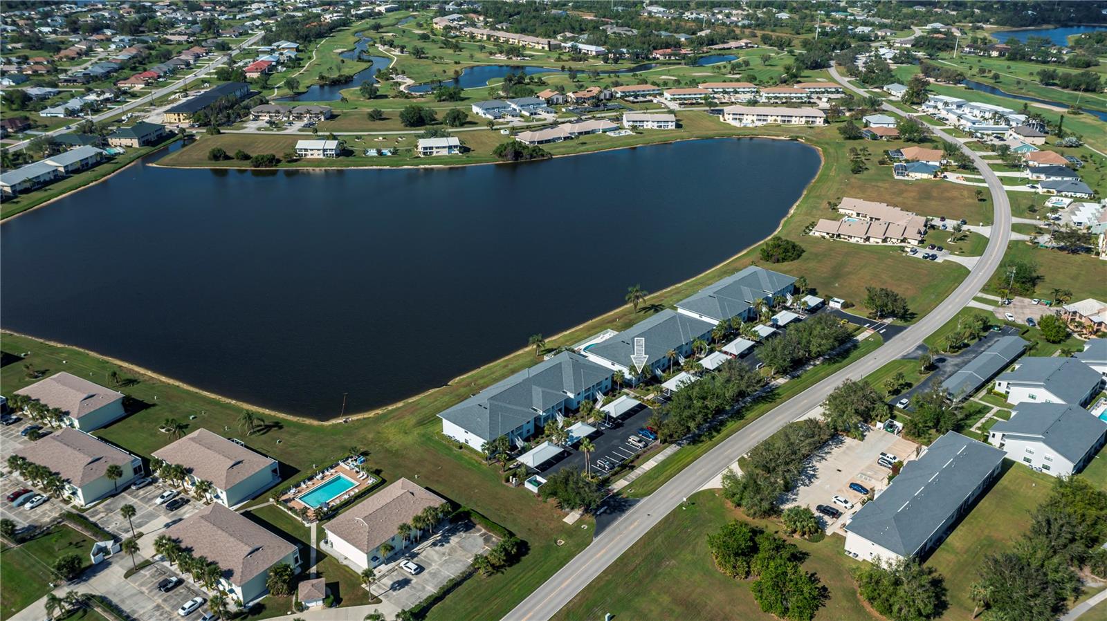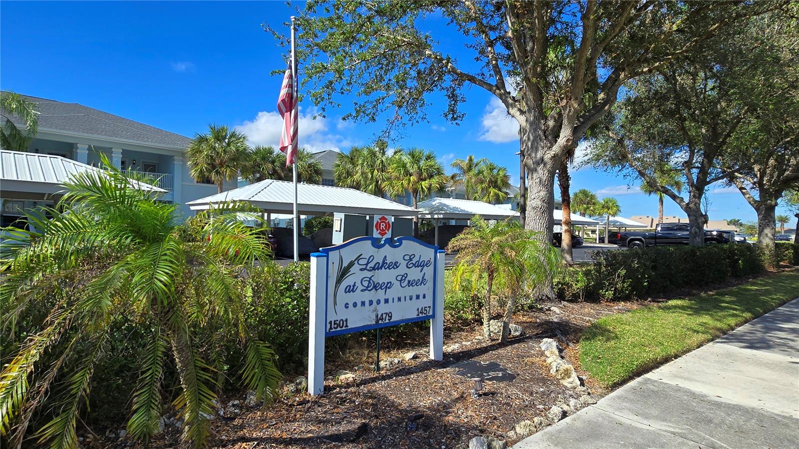 FIRST FLOOR, LAKE VIEW, END UNIT 2/2 PLUS French doors DEN condo with spectacular lake view! Sensational sunset views over the lake. Both bedrooms feature carpeting, with tile floor elsewhere. SUPER open floor plan with a spacious kitchen with built-in wall pantry and breakfast bar in this split bedroom floor plan. Volume ceilings and a tray ceiling in the great room and primary ensuite bedroom add to the attraction of this home. Assigned covered parking in front of your home AND a private exterior storage closet add to the appeal of this lakefront beauty. A centrally located heated pool is just steps away. Deep Creek Golf Course is open to the public is just down the street! Community playground, tennis, basketball & more are around the corner as is a waterfront county park with picnic pavilions, lighted tennis, basketball, shuffleboard, majestic oaks with picnic tables. Shopping, restaurants, workout gym, cultural venues, beaches are nearby. Call today for your year-round or winter retreat opportunity in this well-maintained, intimate condo community.