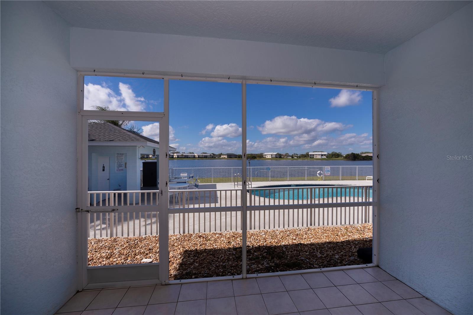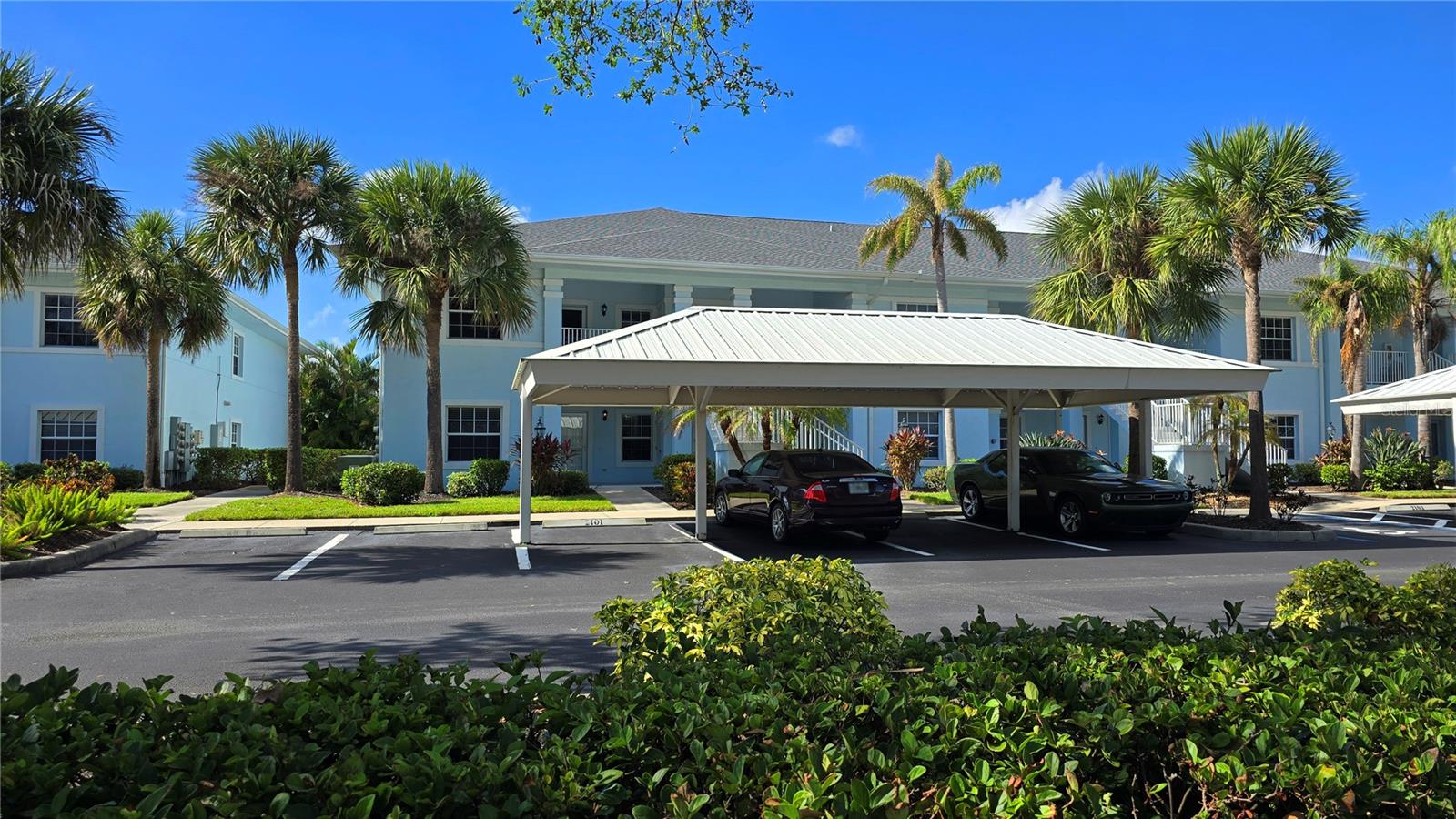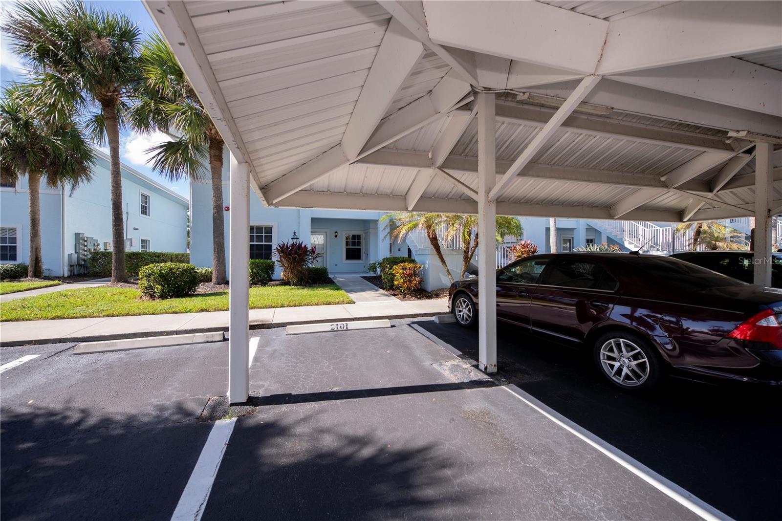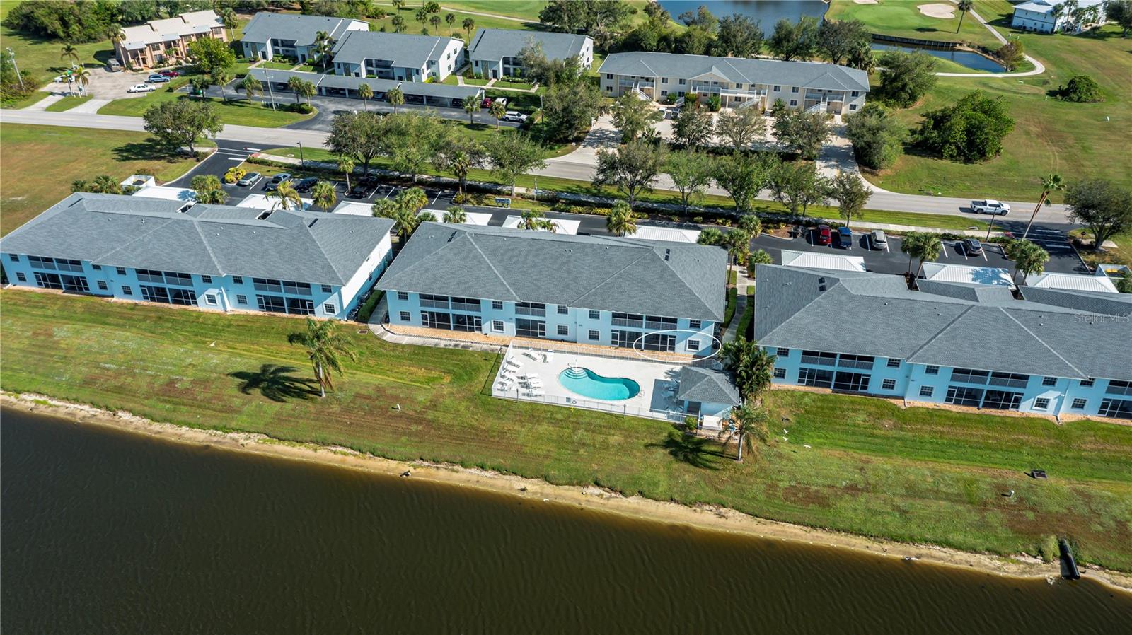 FIRST FLOOR, LAKE VIEW, END UNIT 2/2 PLUS French doors DEN condo with spectacular lake view! Sensational sunset views over the lake. Both bedrooms feature carpeting, with tile floor elsewhere. SUPER open floor plan with a spacious kitchen with built-in wall pantry and breakfast bar in this split bedroom floor plan. Volume ceilings and a tray ceiling in the great room and primary ensuite bedroom add to the attraction of this home. Assigned covered parking in front of your home AND a private exterior storage closet add to the appeal of this lakefront beauty. A centrally located heated pool is just steps away. Deep Creek Golf Course is open to the public is just down the street! Community playground, tennis, basketball & more are around the corner as is a waterfront county park with picnic pavilions, lighted tennis, basketball, shuffleboard, majestic oaks with picnic tables. Shopping, restaurants, workout gym, cultural venues, beaches are nearby. Call today for your year-round or winter retreat opportunity in this well-maintained, intimate condo community.