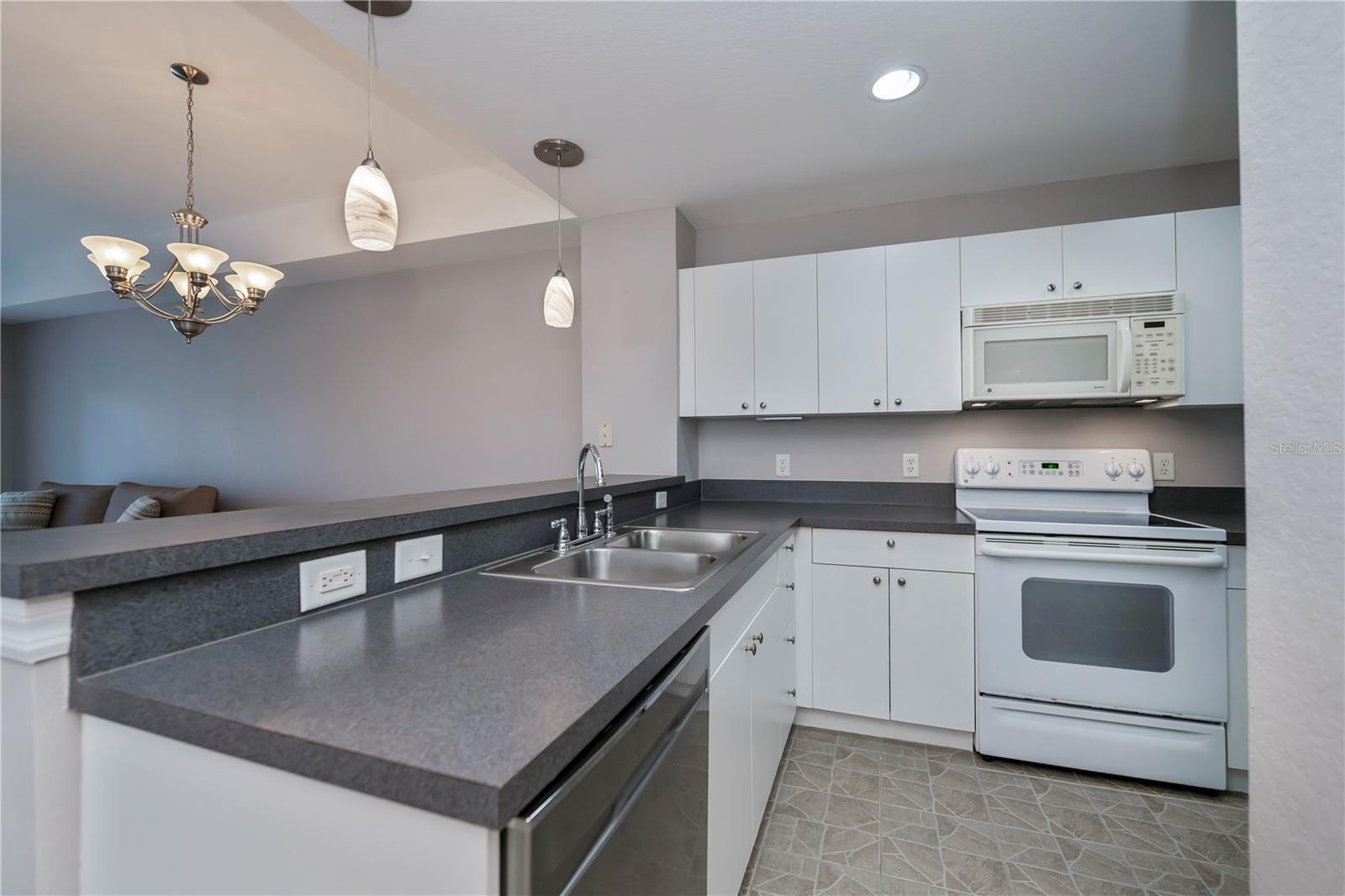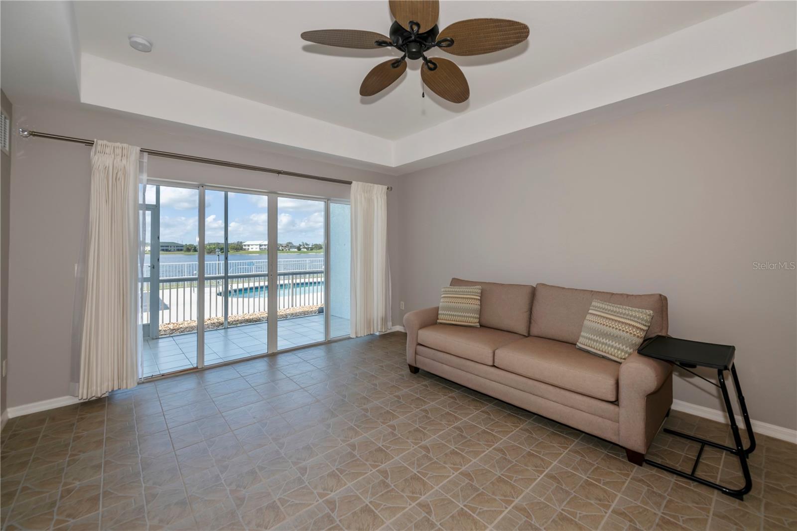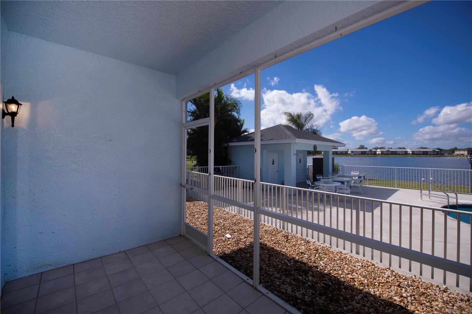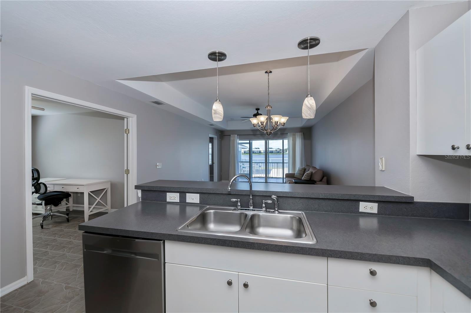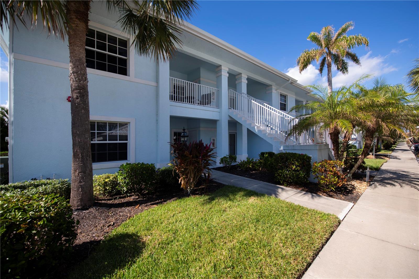 FIRST FLOOR, LAKE VIEW, END UNIT 2/2 PLUS French doors DEN condo with spectacular lake view! Sensational sunset views over the lake. Both bedrooms feature carpeting, with tile floor elsewhere. SUPER open floor plan with a spacious kitchen with built-in wall pantry and breakfast bar in this split bedroom floor plan. Volume ceilings and a tray ceiling in the great room and primary ensuite bedroom add to the attraction of this home. Assigned covered parking in front of your home AND a private exterior storage closet add to the appeal of this lakefront beauty. A centrally located heated pool is just steps away. Deep Creek Golf Course is open to the public is just down the street! Community playground, tennis, basketball & more are around the corner as is a waterfront county park with picnic pavilions, lighted tennis, basketball, shuffleboard, majestic oaks with picnic tables. Shopping, restaurants, workout gym, cultural venues, beaches are nearby. Call today for your year-round or winter retreat opportunity in this well-maintained, intimate condo community.