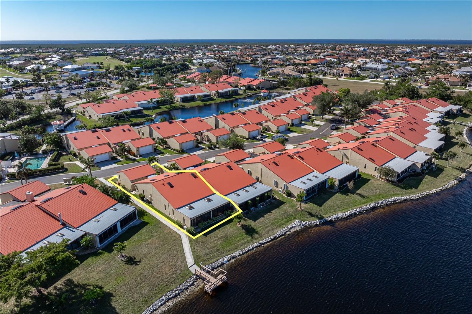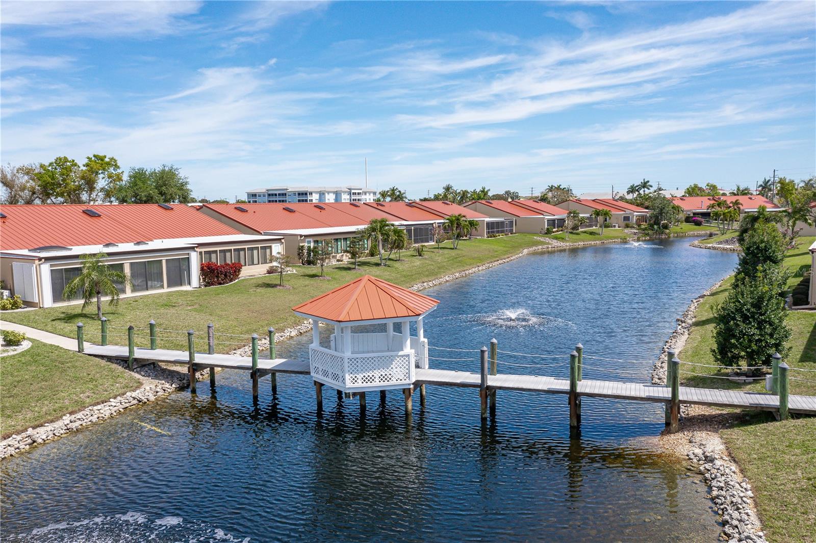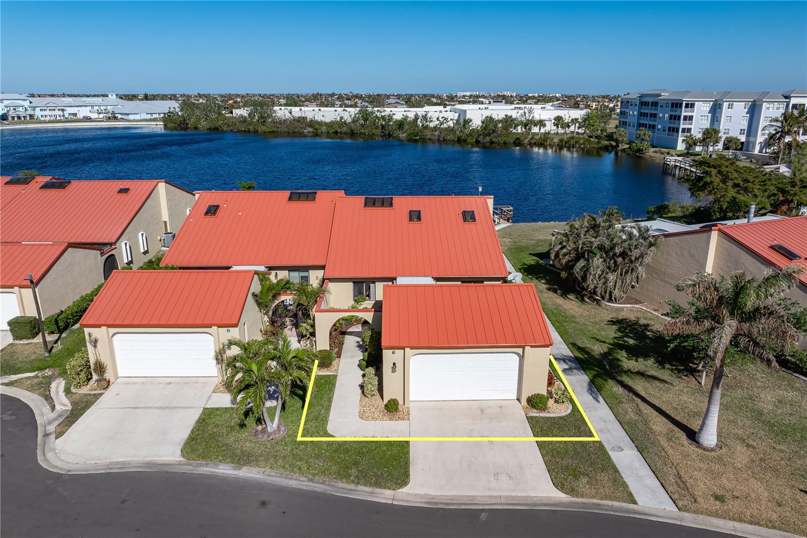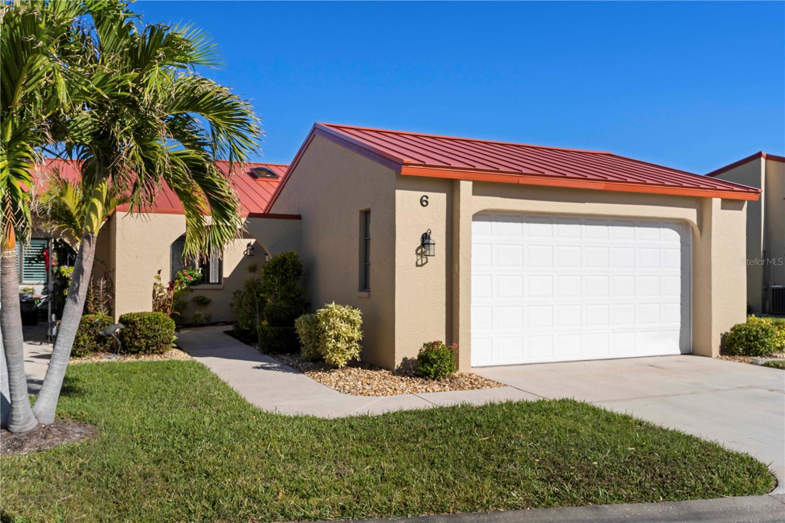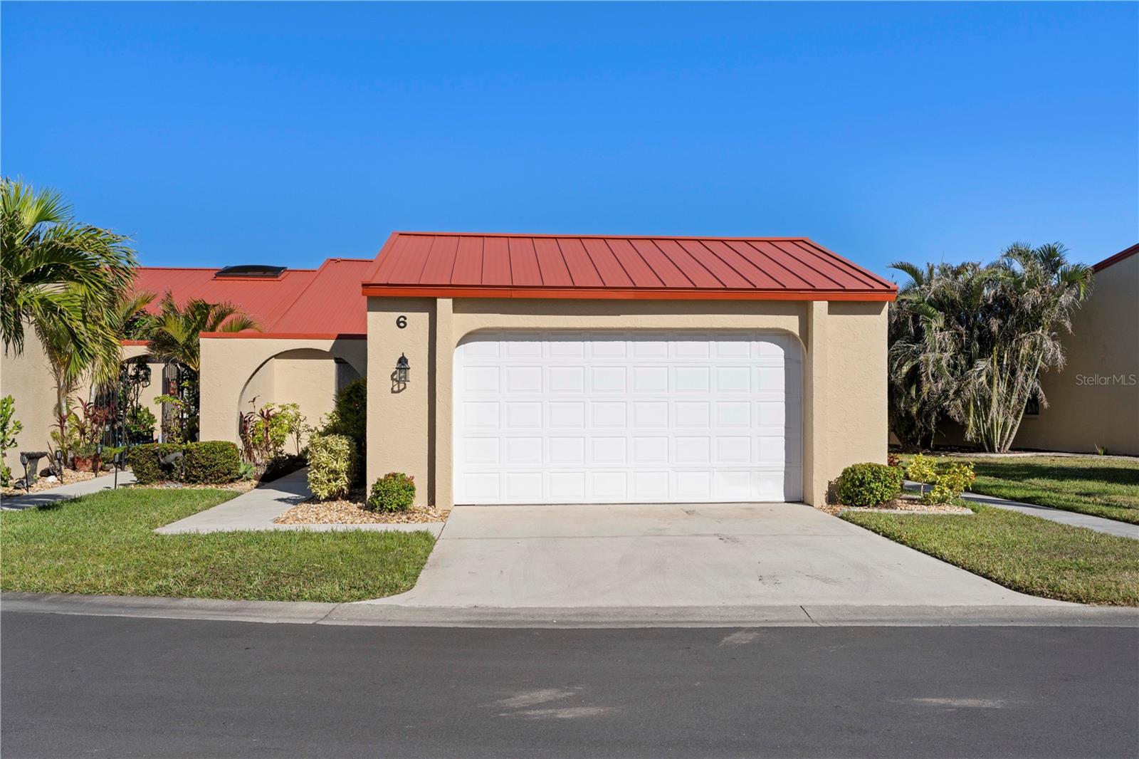 LAKEFRONT VILLA W/**NEW METAL ROOF** AT PARADISE GARDEN VILLAS IN PGI - Spacious, 2,500+ sq ft, 3 bed/2 bath, lakefront villa has a NEW ROOF, NEW SKYLIGHTS, front courtyard & detached two-car garage. Complex is located in the heart of Punta Gorda Isles & is across the street from St Andrews South Golf Club. Enjoy the best of both worlds - relaxing w/lakefront water views or walking across the street for a round of golf with your friends. Interior features include tons of natural light, soaring cathedral ceilings, skylights, spacious kitchen & large, enclosed Florida room w/storage closet. The kitchen boasts solid surface counters, updated appliances, center island, closet pantry as well as under cabinet lighting. Great room is comprised of a large living area & adjacent dining area w/built-in buffet, bookshelf & entertainment center. The master suite has walk-out access to the Florida room w/a fabulous lake view, an oversized walk-in closet including plus an en-suite bath. Master bath has dual sinks, glass-enclosed shower, corner tub & private WC w/linen closet. The two generously sized guest rooms are located at the front of the villa - both have large closets. The guest bath offers a glass-enclosed shower & a linen closet. Interior laundry room has utility sink, full-sized washer/dryer & plus storage shelves. The Florida room has an individual mini-split A/C, built-in bar & boasts walk-out access to the backyard and lakefront viewing pier. Paradise Garden Villas has a park-like setting w/well-maintained tropical landscaping, two in-ground heated pools, a clubhouse, & two lakeside gazebos. Truly paradise found. Make an appointment today.
