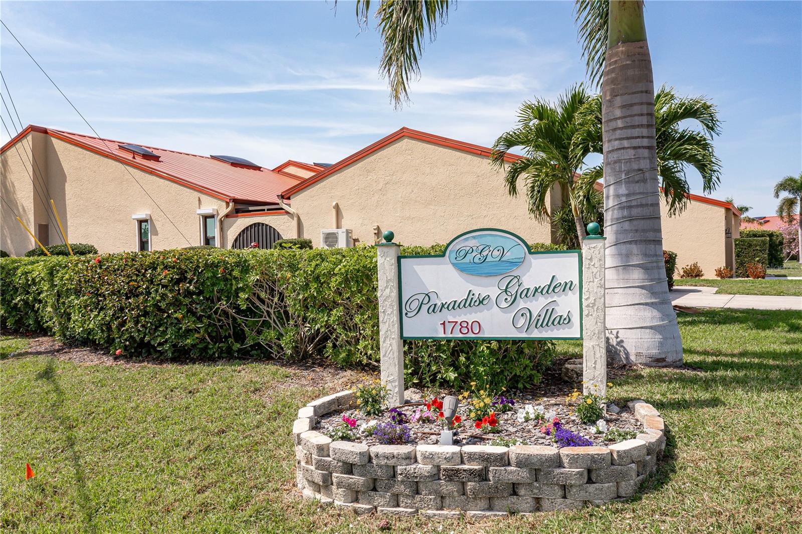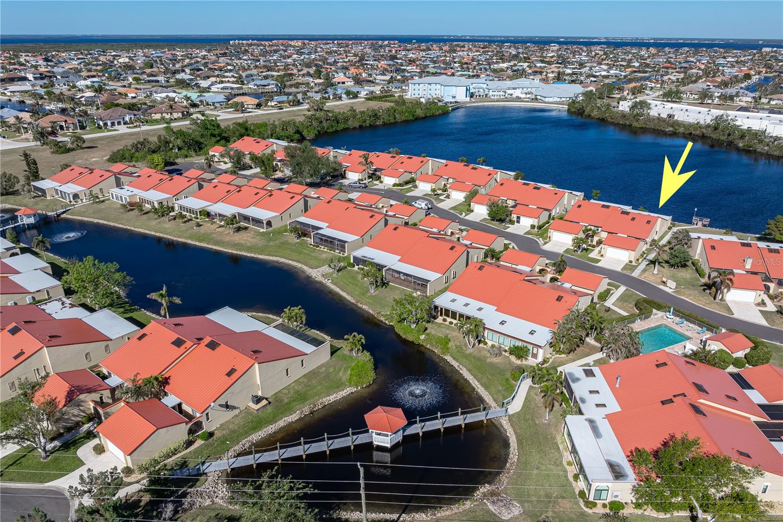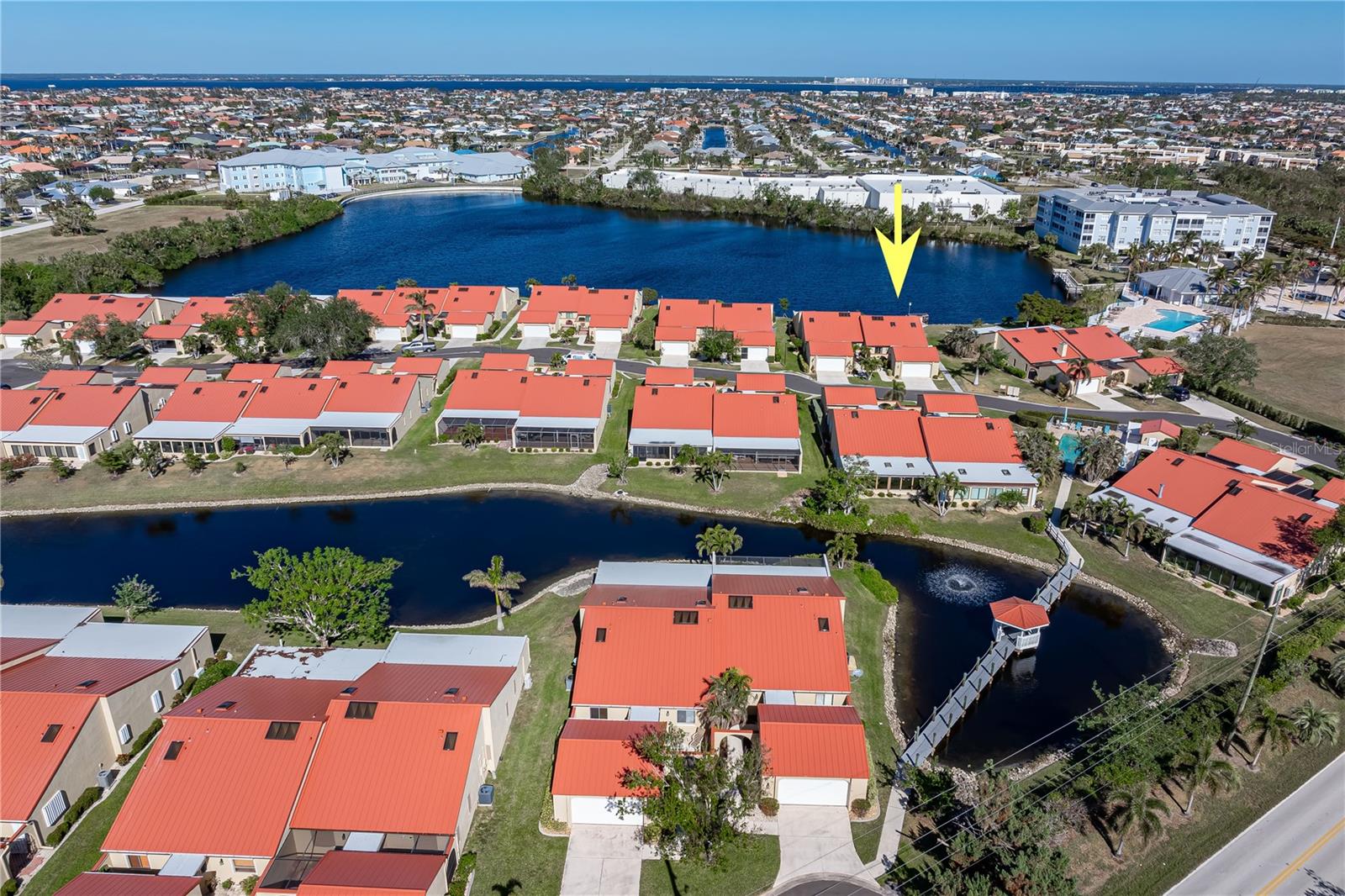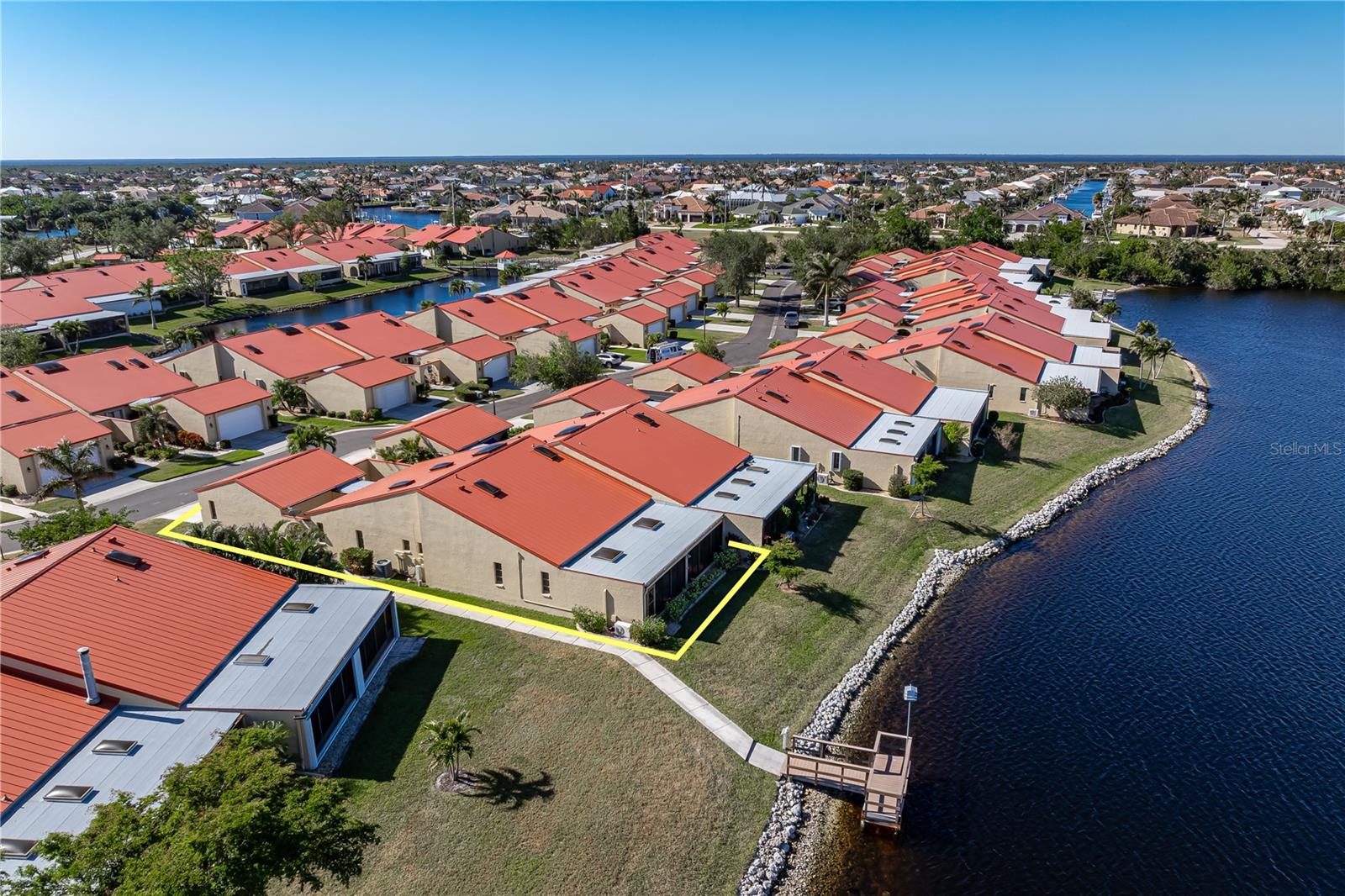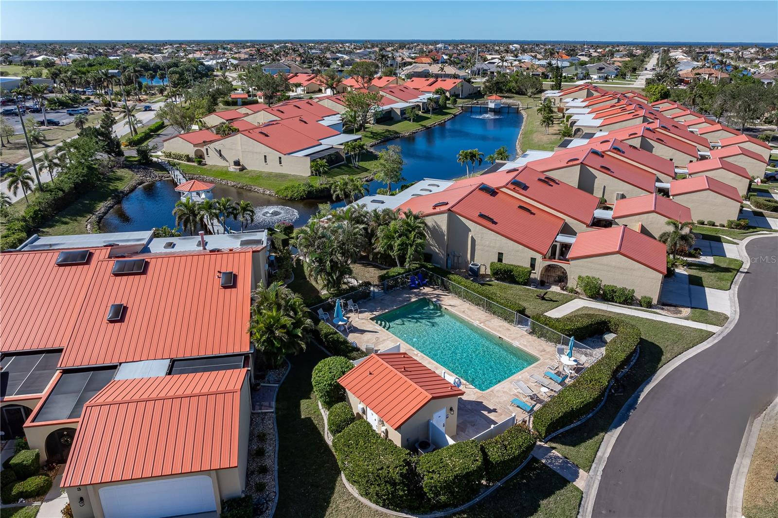 LAKEFRONT VILLA W/**NEW METAL ROOF** AT PARADISE GARDEN VILLAS IN PGI - Spacious, 2,500+ sq ft, 3 bed/2 bath, lakefront villa has a NEW ROOF, NEW SKYLIGHTS, front courtyard & detached two-car garage. Complex is located in the heart of Punta Gorda Isles & is across the street from St Andrews South Golf Club. Enjoy the best of both worlds - relaxing w/lakefront water views or walking across the street for a round of golf with your friends. Interior features include tons of natural light, soaring cathedral ceilings, skylights, spacious kitchen & large, enclosed Florida room w/storage closet. The kitchen boasts solid surface counters, updated appliances, center island, closet pantry as well as under cabinet lighting. Great room is comprised of a large living area & adjacent dining area w/built-in buffet, bookshelf & entertainment center. The master suite has walk-out access to the Florida room w/a fabulous lake view, an oversized walk-in closet including plus an en-suite bath. Master bath has dual sinks, glass-enclosed shower, corner tub & private WC w/linen closet. The two generously sized guest rooms are located at the front of the villa - both have large closets. The guest bath offers a glass-enclosed shower & a linen closet. Interior laundry room has utility sink, full-sized washer/dryer & plus storage shelves. The Florida room has an individual mini-split A/C, built-in bar & boasts walk-out access to the backyard and lakefront viewing pier. Paradise Garden Villas has a park-like setting w/well-maintained tropical landscaping, two in-ground heated pools, a clubhouse, & two lakeside gazebos. Truly paradise found. Make an appointment today.