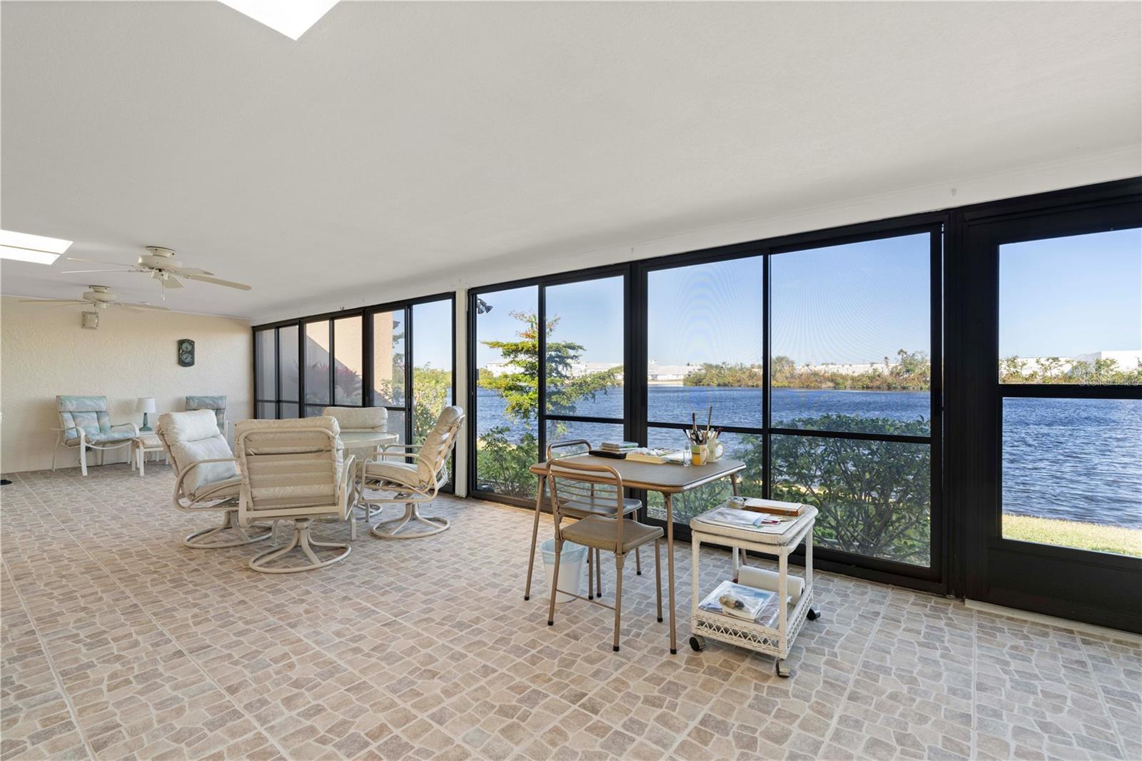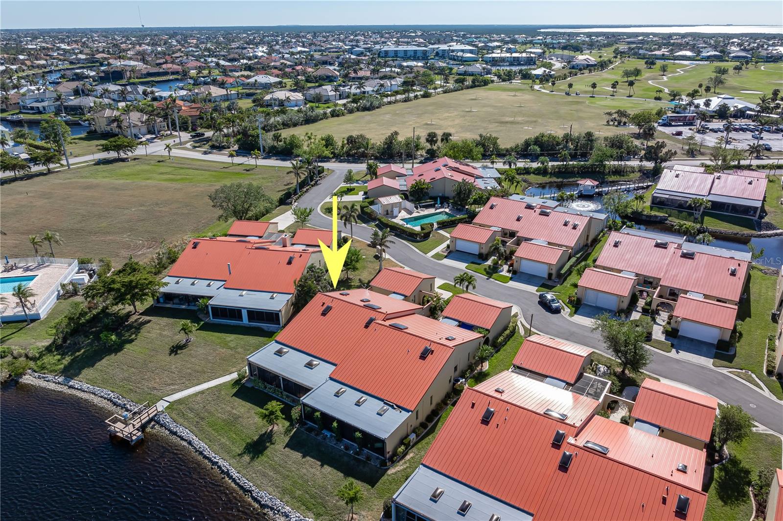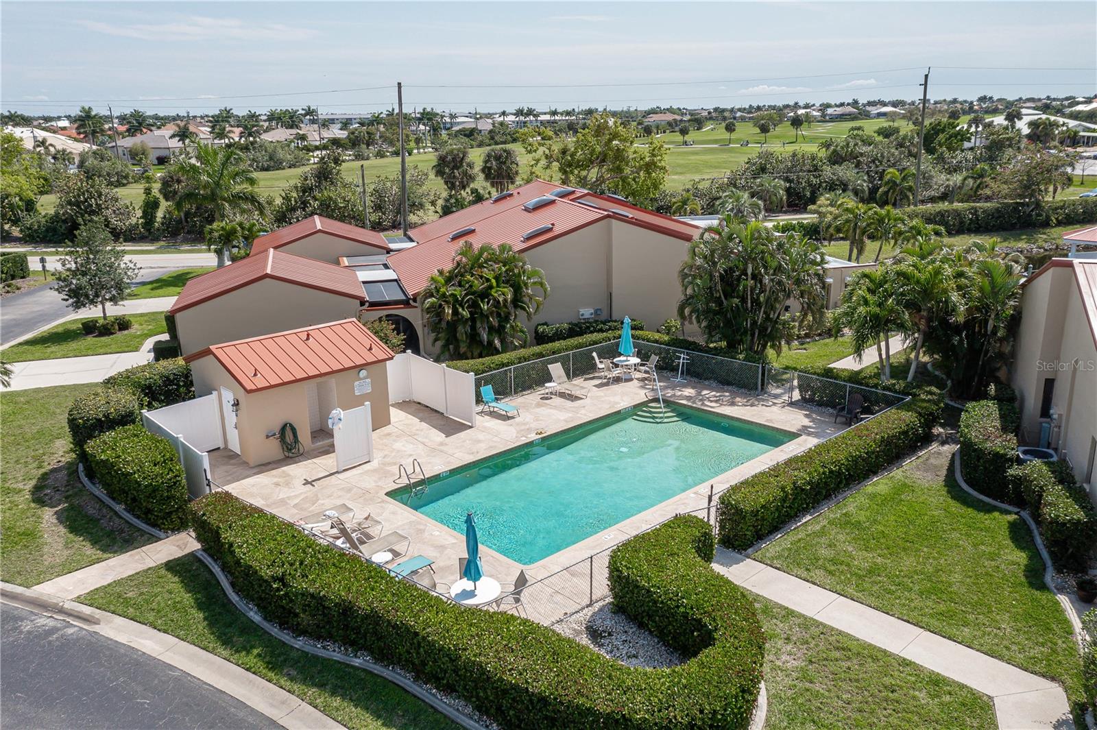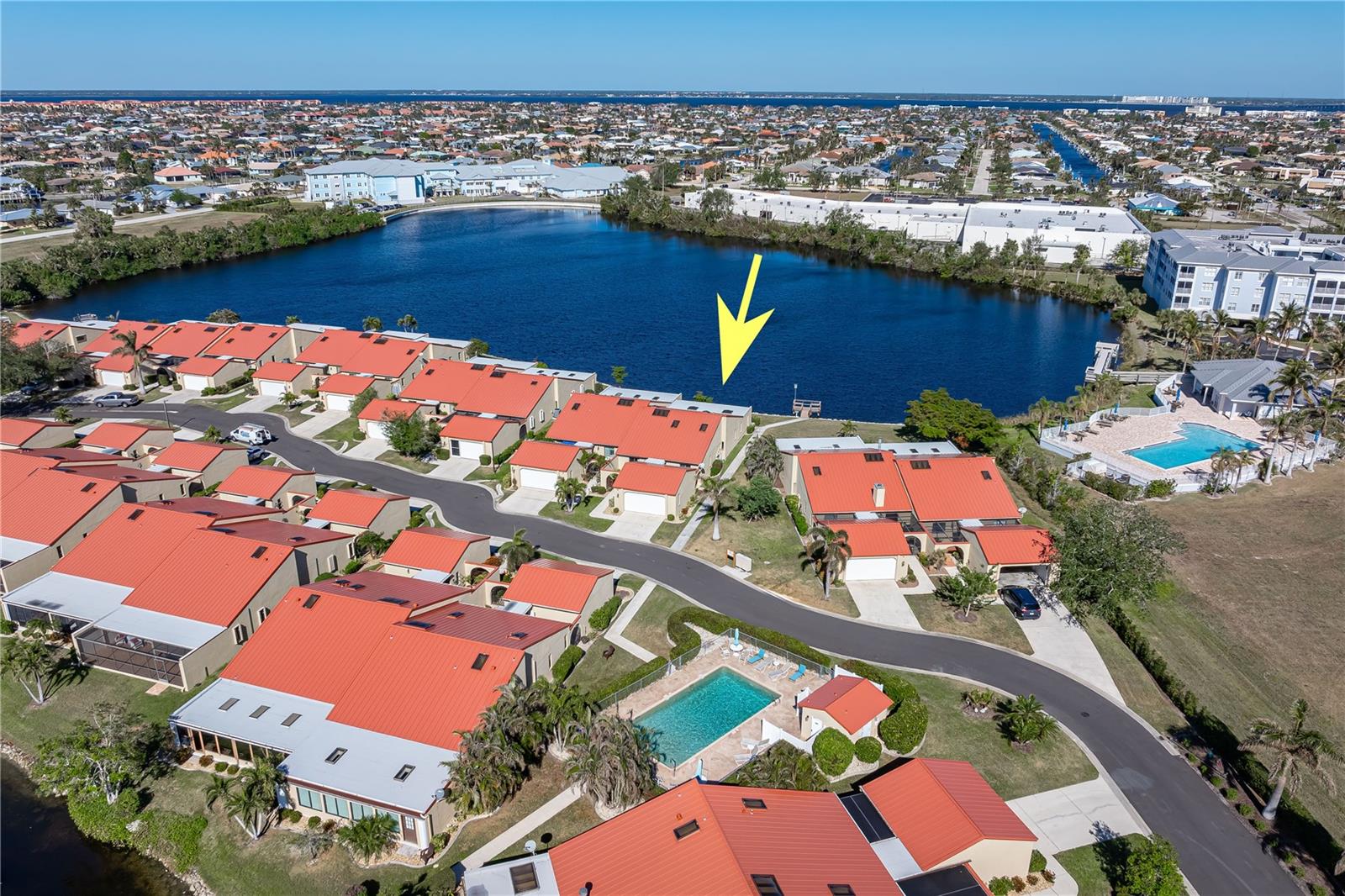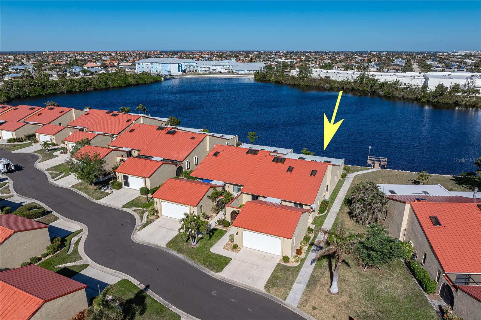 LAKEFRONT VILLA W/**NEW METAL ROOF** AT PARADISE GARDEN VILLAS IN PGI - Spacious, 2,500+ sq ft, 3 bed/2 bath, lakefront villa has a NEW ROOF, NEW SKYLIGHTS, front courtyard & detached two-car garage. Complex is located in the heart of Punta Gorda Isles & is across the street from St Andrews South Golf Club. Enjoy the best of both worlds - relaxing w/lakefront water views or walking across the street for a round of golf with your friends. Interior features include tons of natural light, soaring cathedral ceilings, skylights, spacious kitchen & large, enclosed Florida room w/storage closet. The kitchen boasts solid surface counters, updated appliances, center island, closet pantry as well as under cabinet lighting. Great room is comprised of a large living area & adjacent dining area w/built-in buffet, bookshelf & entertainment center. The master suite has walk-out access to the Florida room w/a fabulous lake view, an oversized walk-in closet including plus an en-suite bath. Master bath has dual sinks, glass-enclosed shower, corner tub & private WC w/linen closet. The two generously sized guest rooms are located at the front of the villa - both have large closets. The guest bath offers a glass-enclosed shower & a linen closet. Interior laundry room has utility sink, full-sized washer/dryer & plus storage shelves. The Florida room has an individual mini-split A/C, built-in bar & boasts walk-out access to the backyard and lakefront viewing pier. Paradise Garden Villas has a park-like setting w/well-maintained tropical landscaping, two in-ground heated pools, a clubhouse, & two lakeside gazebos. Truly paradise found. Make an appointment today.