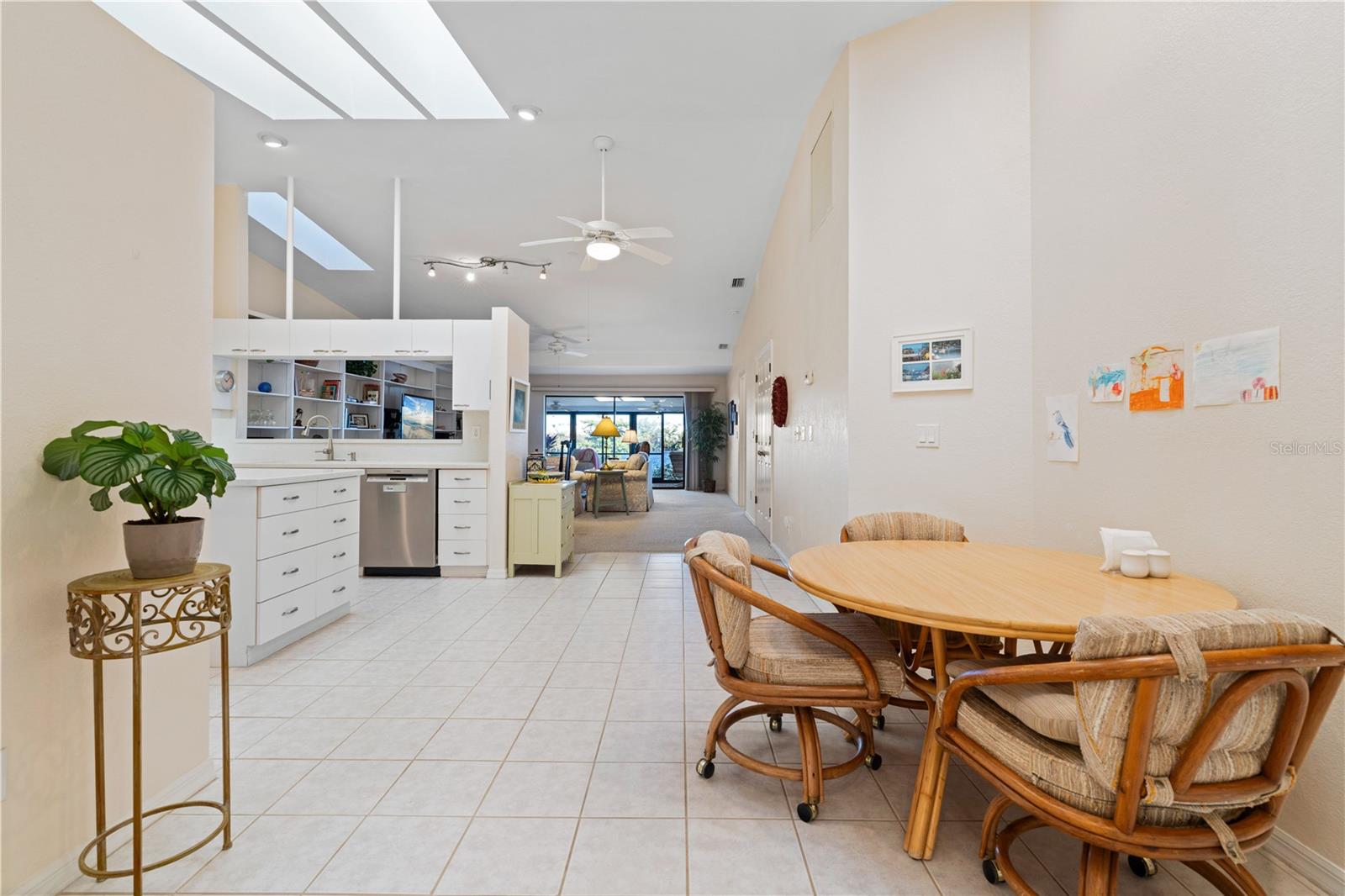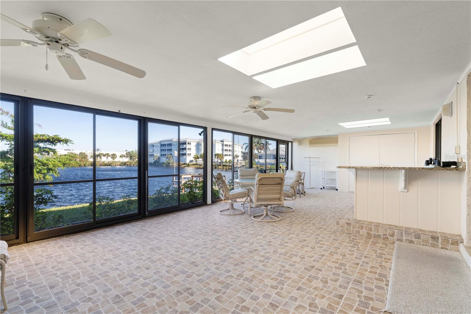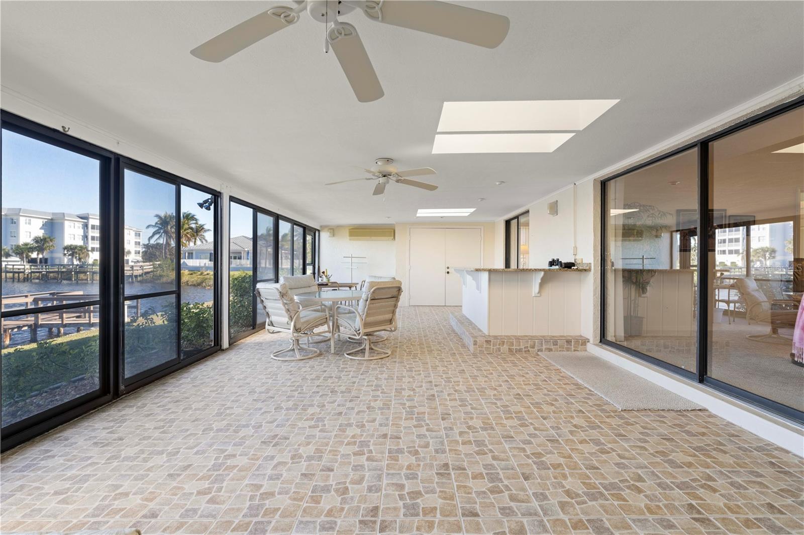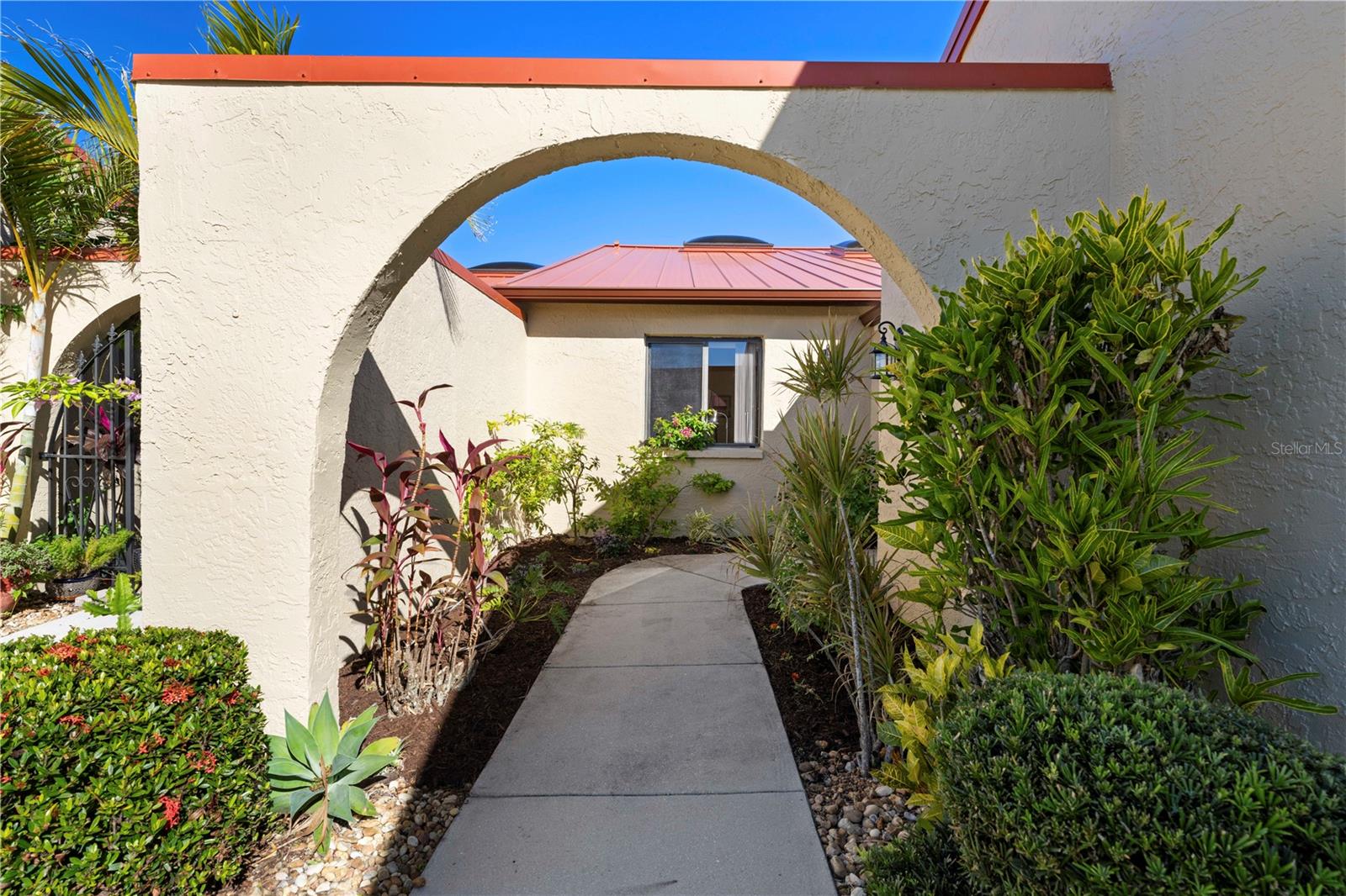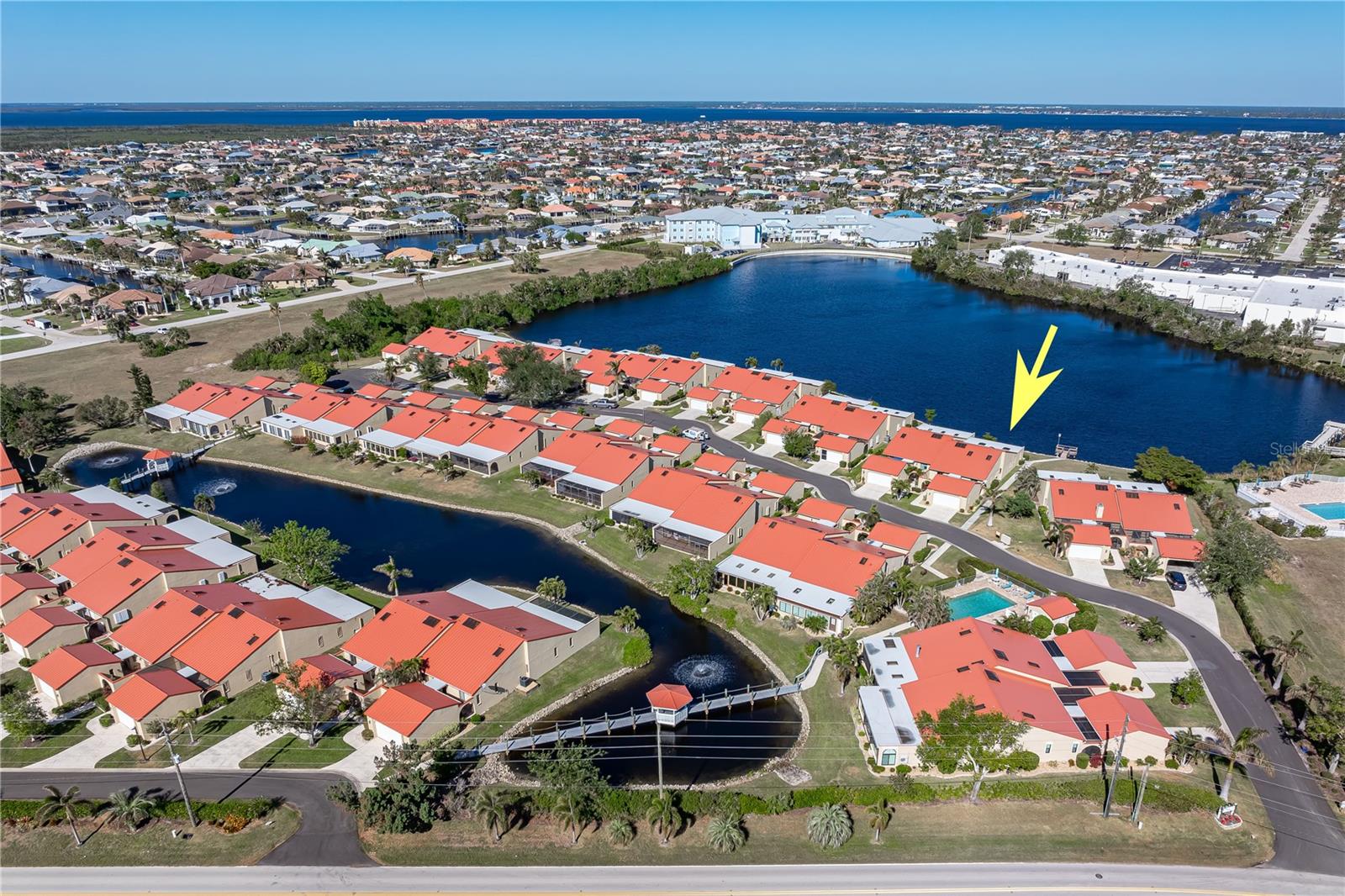 LAKEFRONT VILLA W/**NEW METAL ROOF** AT PARADISE GARDEN VILLAS IN PGI - Spacious, 2,500+ sq ft, 3 bed/2 bath, lakefront villa has a NEW ROOF, NEW SKYLIGHTS, front courtyard & detached two-car garage. Complex is located in the heart of Punta Gorda Isles & is across the street from St Andrews South Golf Club. Enjoy the best of both worlds - relaxing w/lakefront water views or walking across the street for a round of golf with your friends. Interior features include tons of natural light, soaring cathedral ceilings, skylights, spacious kitchen & large, enclosed Florida room w/storage closet. The kitchen boasts solid surface counters, updated appliances, center island, closet pantry as well as under cabinet lighting. Great room is comprised of a large living area & adjacent dining area w/built-in buffet, bookshelf & entertainment center. The master suite has walk-out access to the Florida room w/a fabulous lake view, an oversized walk-in closet including plus an en-suite bath. Master bath has dual sinks, glass-enclosed shower, corner tub & private WC w/linen closet. The two generously sized guest rooms are located at the front of the villa - both have large closets. The guest bath offers a glass-enclosed shower & a linen closet. Interior laundry room has utility sink, full-sized washer/dryer & plus storage shelves. The Florida room has an individual mini-split A/C, built-in bar & boasts walk-out access to the backyard and lakefront viewing pier. Paradise Garden Villas has a park-like setting w/well-maintained tropical landscaping, two in-ground heated pools, a clubhouse, & two lakeside gazebos. Truly paradise found. Make an appointment today.