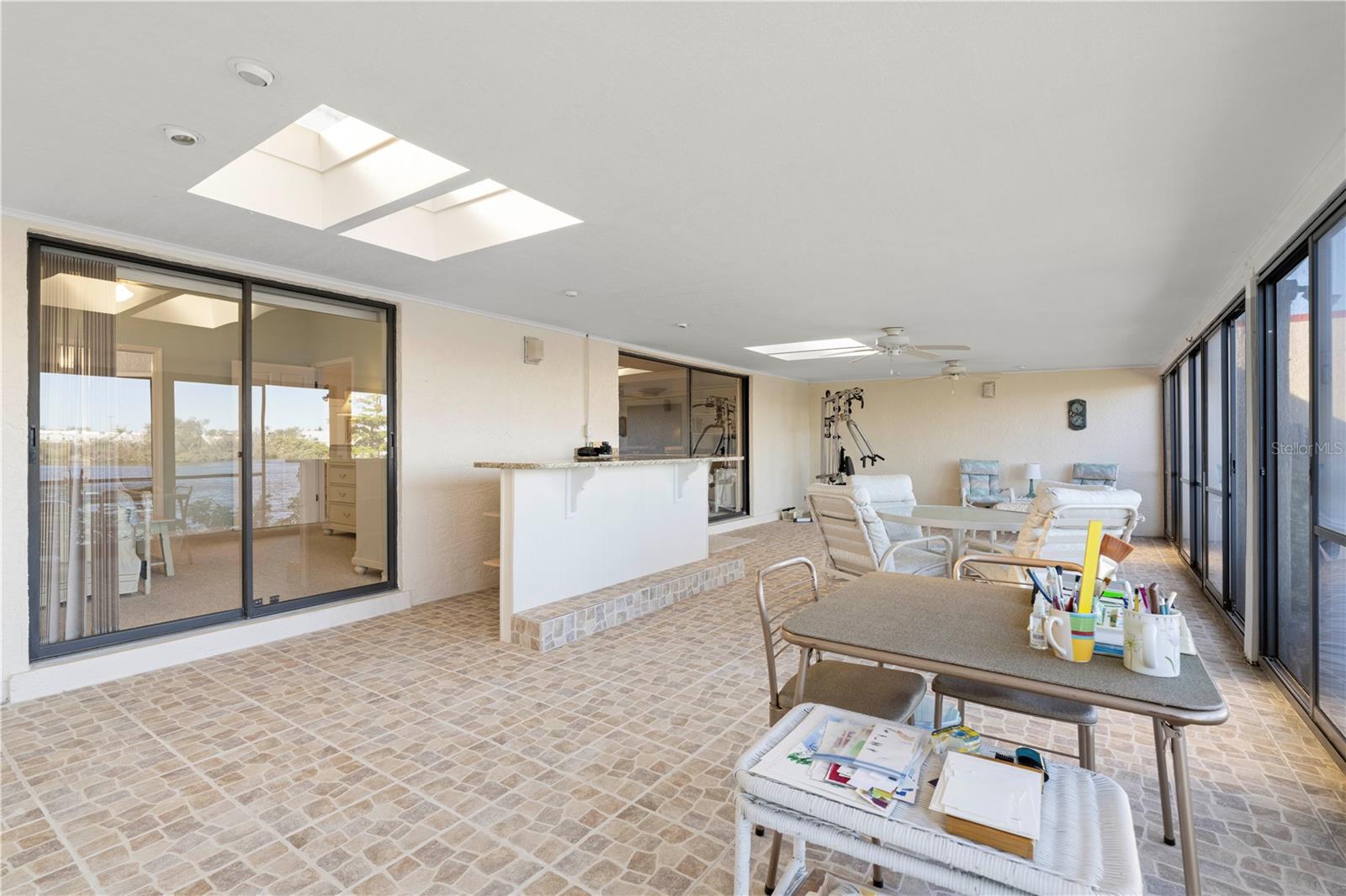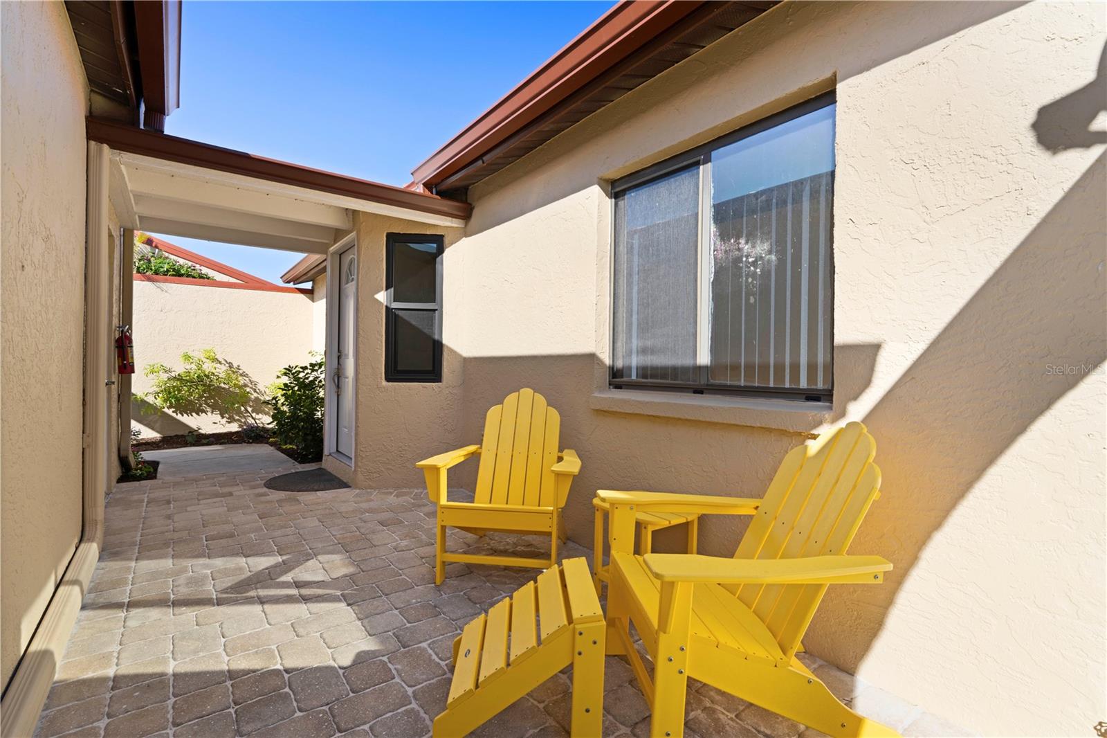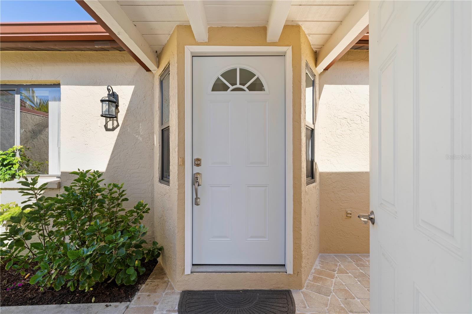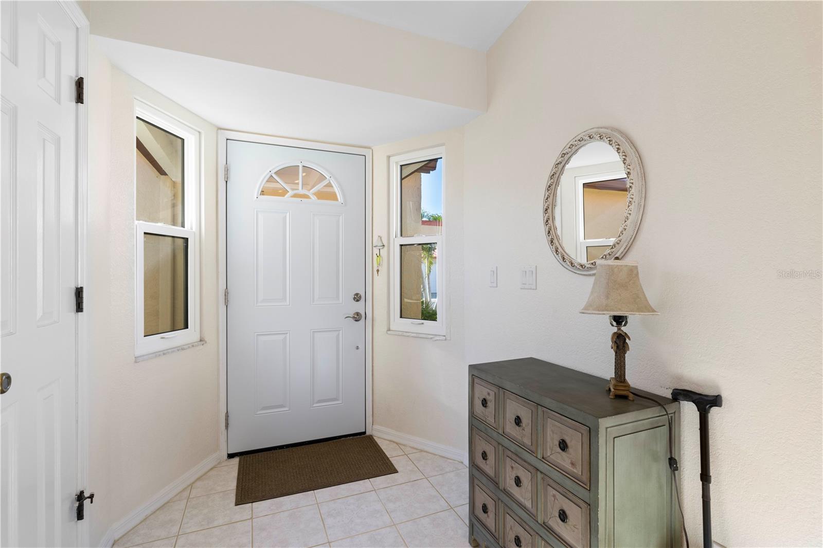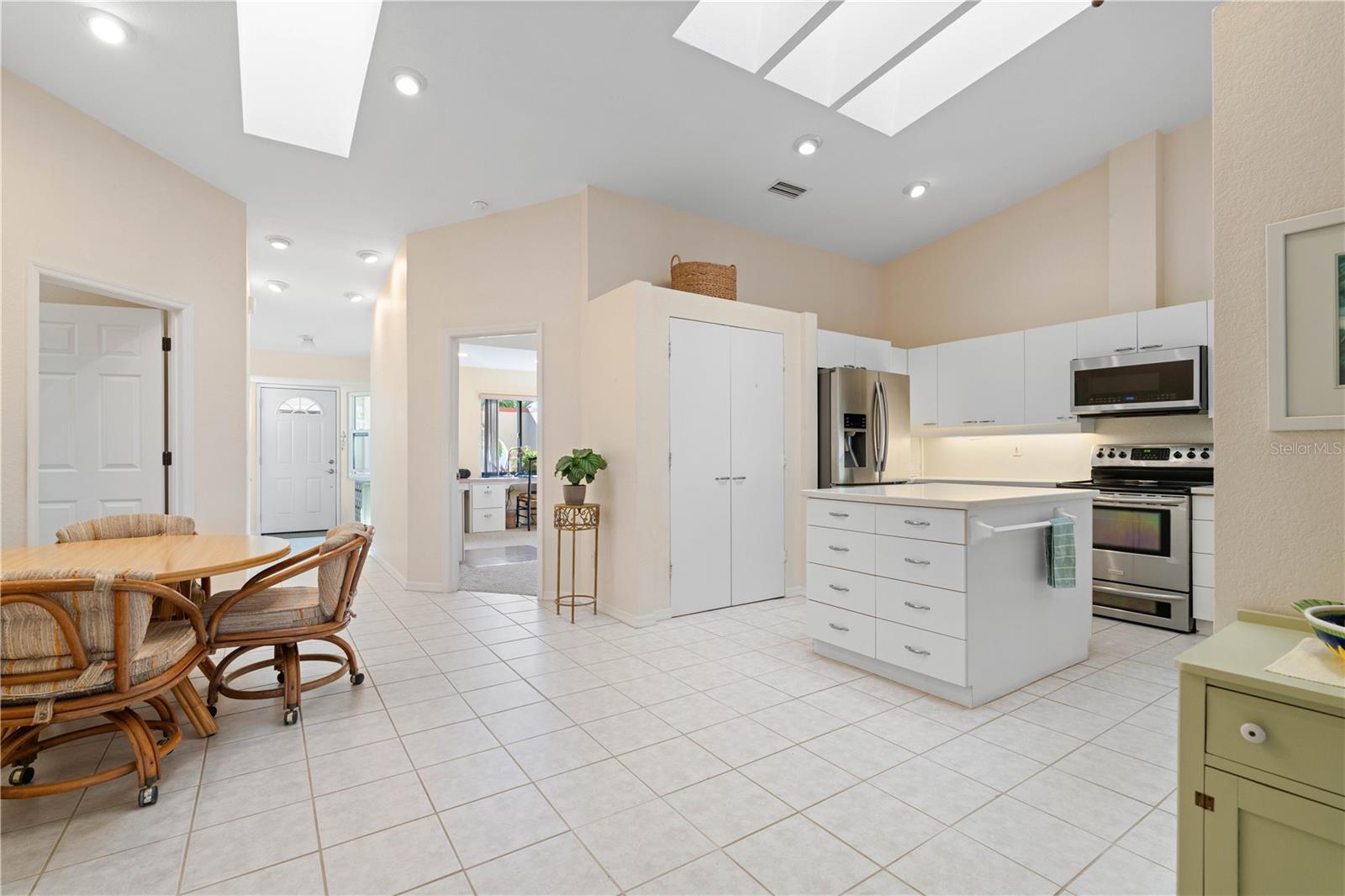 LAKEFRONT VILLA W/**NEW METAL ROOF** AT PARADISE GARDEN VILLAS IN PGI - Spacious, 2,500+ sq ft, 3 bed/2 bath, lakefront villa has a NEW ROOF, NEW SKYLIGHTS, front courtyard & detached two-car garage. Complex is located in the heart of Punta Gorda Isles & is across the street from St Andrews South Golf Club. Enjoy the best of both worlds - relaxing w/lakefront water views or walking across the street for a round of golf with your friends. Interior features include tons of natural light, soaring cathedral ceilings, skylights, spacious kitchen & large, enclosed Florida room w/storage closet. The kitchen boasts solid surface counters, updated appliances, center island, closet pantry as well as under cabinet lighting. Great room is comprised of a large living area & adjacent dining area w/built-in buffet, bookshelf & entertainment center. The master suite has walk-out access to the Florida room w/a fabulous lake view, an oversized walk-in closet including plus an en-suite bath. Master bath has dual sinks, glass-enclosed shower, corner tub & private WC w/linen closet. The two generously sized guest rooms are located at the front of the villa - both have large closets. The guest bath offers a glass-enclosed shower & a linen closet. Interior laundry room has utility sink, full-sized washer/dryer & plus storage shelves. The Florida room has an individual mini-split A/C, built-in bar & boasts walk-out access to the backyard and lakefront viewing pier. Paradise Garden Villas has a park-like setting w/well-maintained tropical landscaping, two in-ground heated pools, a clubhouse, & two lakeside gazebos. Truly paradise found. Make an appointment today.