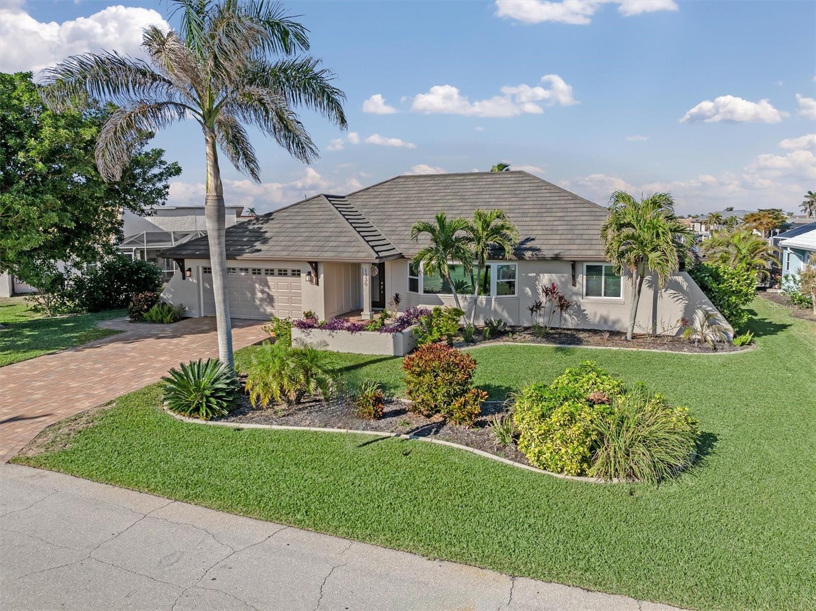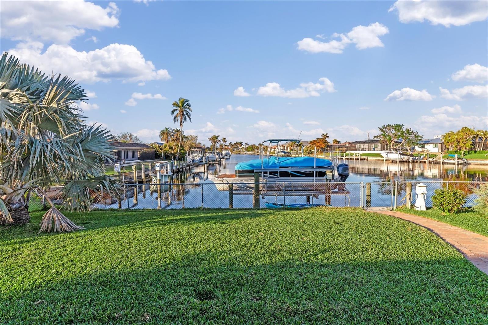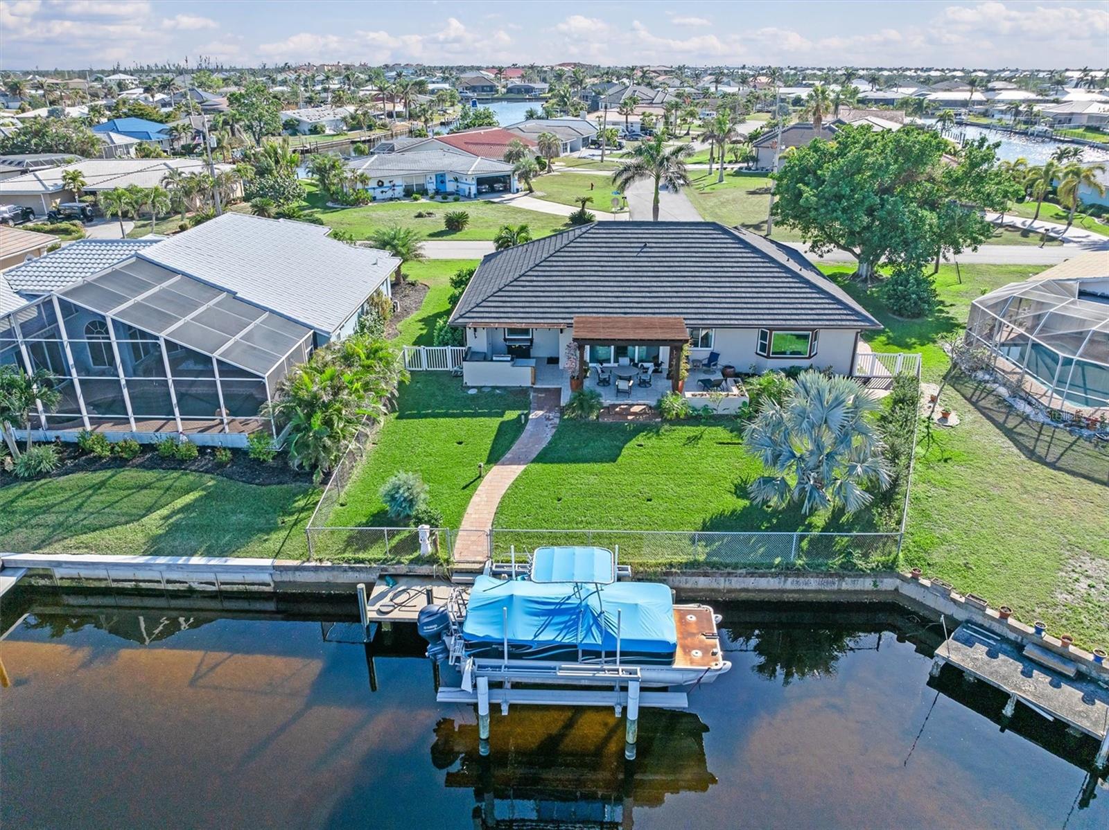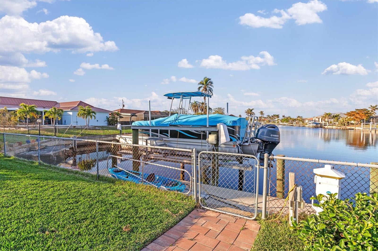 SEE VIRTUAL TOUR 1 FOR WALK-THROUGH AND TOUR 2 FOR 3-D FLOOR PLAN. Exquisite waterfront home in Punta Gorda Isles – completely updated and move-in ready (high and dry, with no damage from recent hurricanes). Featuring an array of modern upgrades, including NEW ROOF, NEW PLUMBING, NEW ELECTRICAL, NEW PAVERS, NEW OUTDOOR KITCHEN, NEW DOCK, NEW GARAGE DOOR/OPENER, NEW IRRIGATION, and NEW INTERIOR AND EXTERIOR LIGHTING, this home offers both elegant functionality and the ultimate in resort-style living. As you arrive, the meticulously landscaped yard greets you with a newly paved driveway and walkway leading to a serene water fountain and quaint garden welcoming you to step inside, where you will find that every detail has been thoughtfully addressed, creating a stylish and inviting space that feels brand-new. The bright and airy living room features a glistening 15-ft bay window, flooding the open floor plan with natural light. Adjacent to the living room, the dining room, two guest bedrooms, and a guest bathroom provide comfort and flexibility for family or guests. The chef-inspired kitchen is a true centerpiece, boasting a breakfast bar, soft-close cabinets, and modern stainless-steel appliances, including a double drop-in stainless sink. The upgraded lighting and fans throughout the home enhance the light and breezy atmosphere. The primary suite, set apart from the guest bedrooms for added privacy, offers tranquil waterfront views and a luxurious ensuite bathroom. Enjoy an extended dual-sink vanity with ample storage, and a walk-in shower designed for relaxation. Unwind in the expansive Florida room and breakfast nook, both overlooking the long canal views. Step outside through hurricane-impact triple sliders to your private outdoor oasis, featuring a 25' x 13' patio with a new custom outdoor kitchen. This space is equipped with a built-in grill, beverage fridge, stainless steel storage, cedar accents, and artistic concrete countertops. Dine under the cedar pergola, soak up the sun, or relax in the shade while savoring the breeze. A paved walkway leads to your 30-ft concrete dock with water, electricity, and an oversized 13,000-lb boat lift stationed alongside more than 60-ft of city-maintained concrete seawall. With quick access to Charlotte Harbor, the Peace River, and the Gulf of Mexico, this home is a boater’s dream. Additional highlights include a spacious laundry room with storage and utility sink, and a custom workshop in the garage. The oversized lot offers ample space for a pool or spa, should you wish to enhance your outdoor experience further. Located in the heart of Punta Gorda Isles, you will be just minutes from Fishermen’s Village, Isles Yacht Club, Ponce and Gilchrist parks, historic downtown Punta Gorda, waterfront dining, and over 18 miles of biking and walking paths. World-class boating, fishing, golfing, and water sports are all at your fingertips, with average winter temperatures in the mid-70s. Easy access to I-75, US-41 and the Punta Gorda Airport, just 15 minutes away, serving over 60 destinations, adds to this property’s appeal. There is room to ADD A POOL, if the buyer so desires. Take advantage of this opportunity to own a truly spectacular waterfront home where every detail has been perfected. PRICED TO SELL, be sure to ask for the Home Features sheet, and schedule your private showing today!