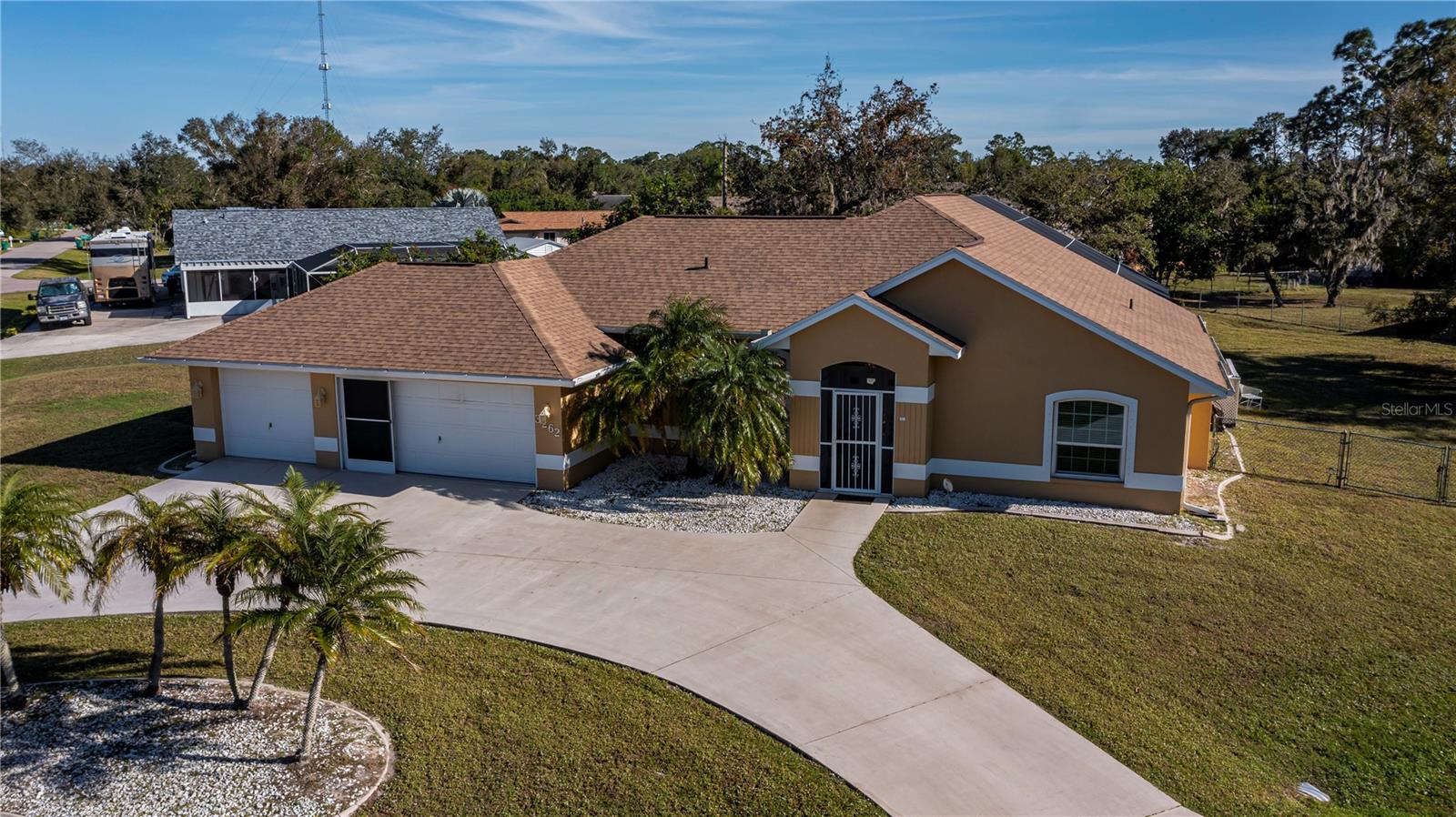 FABULOUS SETUP, don't miss out on this 1/2 ACRE CORNER LOT 3 bedroom 2 bath POOL HOME also having an IMPRESSIVE 3 CAR GARAGE, in a great location! MASSIVE CIRCULAR DRIVEWAY allows for easy care parking, grand double door entry, plus soaring ceiling screened front patio with its oversized pendant lighting is perfect for cross breezes and abundant natural light.Tile throughout, formal foyer, cathedral ceilings, sunburst windows and lots of angles, makes this spacious split floor plan just so special. Chef worthy kitchen boasts a full pantry, breakfast bar, ample counter space and cabinetry, decorator plant shelves, desk area and its own eat in breakfast nook with serene extended backyard views. Formal livingroom plus large family room and a separate dining room with pocketing sliders to the pool brings the outdoors inside instantly! The spacious master bedroom boasts private patio/pool access, large walk in closets, and nice ensuite bathroom. Both guest suites in this split plan are generous sized, have fans, nice sized closet space and share a middle bath with main house. Inside laundry room also has a basin, AC new in 2022, HW heater 2020, NO HOA, and the roof is only 3 years old for extra peace of mind and the 3rd stall of this 3 car garage has has private a/c too.. Enjoy the peaceful views with this large over 1/2 acre lot and deep backyard night or day from your sparkly pool, all the entertaining room you possibly could want is right here with easy care flocrete decking.....covered and screened open air Florida lifestyle is waiting for you.Located in Southwest Florida, this property offers year-round access to boating, fishing, golfing, various Gulf beaches, natural resources, dining establishments, parks, public tennis courts, and shopping. Culturally enriching events are held regularly, with multiple baseball parks in close proximity. Conveniently situated just minutes from the Tampa Bay Rays Training Stadium, shopping mall and numerous parks, and a short 35-minute drive from multiple Gulf beaches, this residence provides exceptional accessibility. The Punta Gorda Regional Airport, served by Allegiant Air, is located a mere 12 miles away.Notably, Fisherman's Village and the Historic District, with their diverse array of dining and shopping options, are approximately 9 miles away. This residence truly merits a personal viewing to fully appreciate its remarkable offerings. Schedule your showing to see this SERENE DOUBLE LOT POOL HOME with extra parking options TODAY!