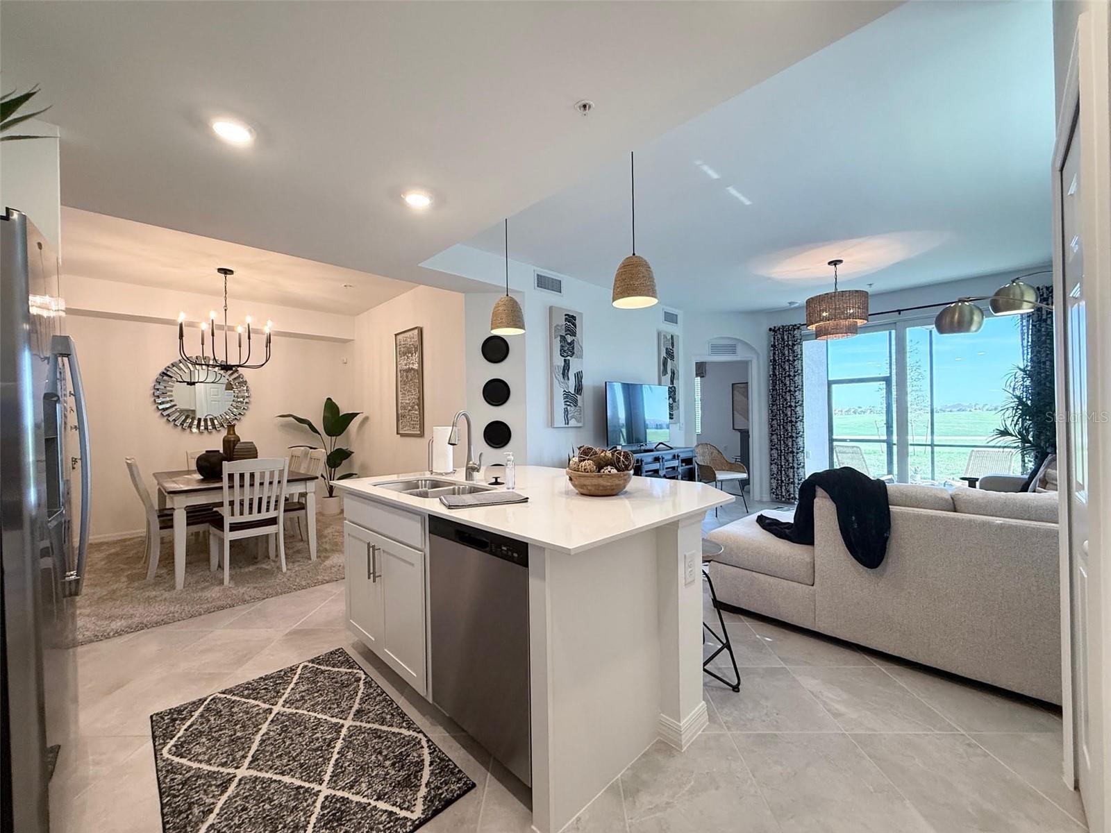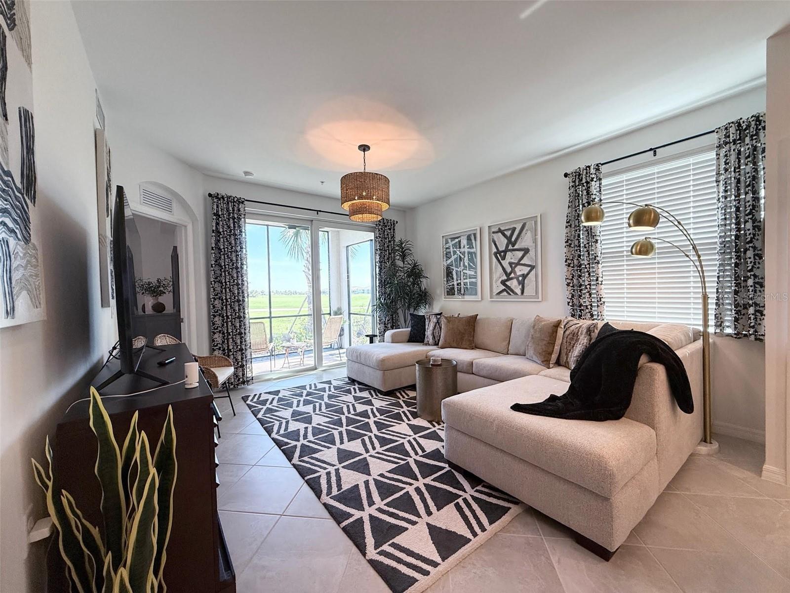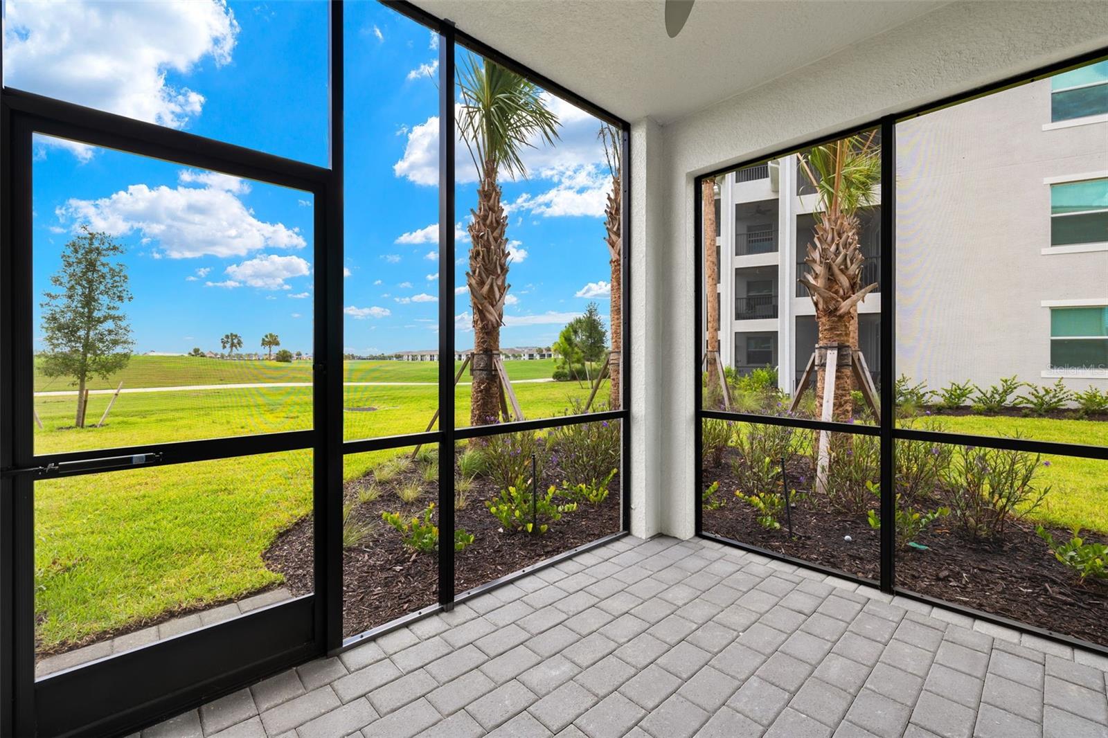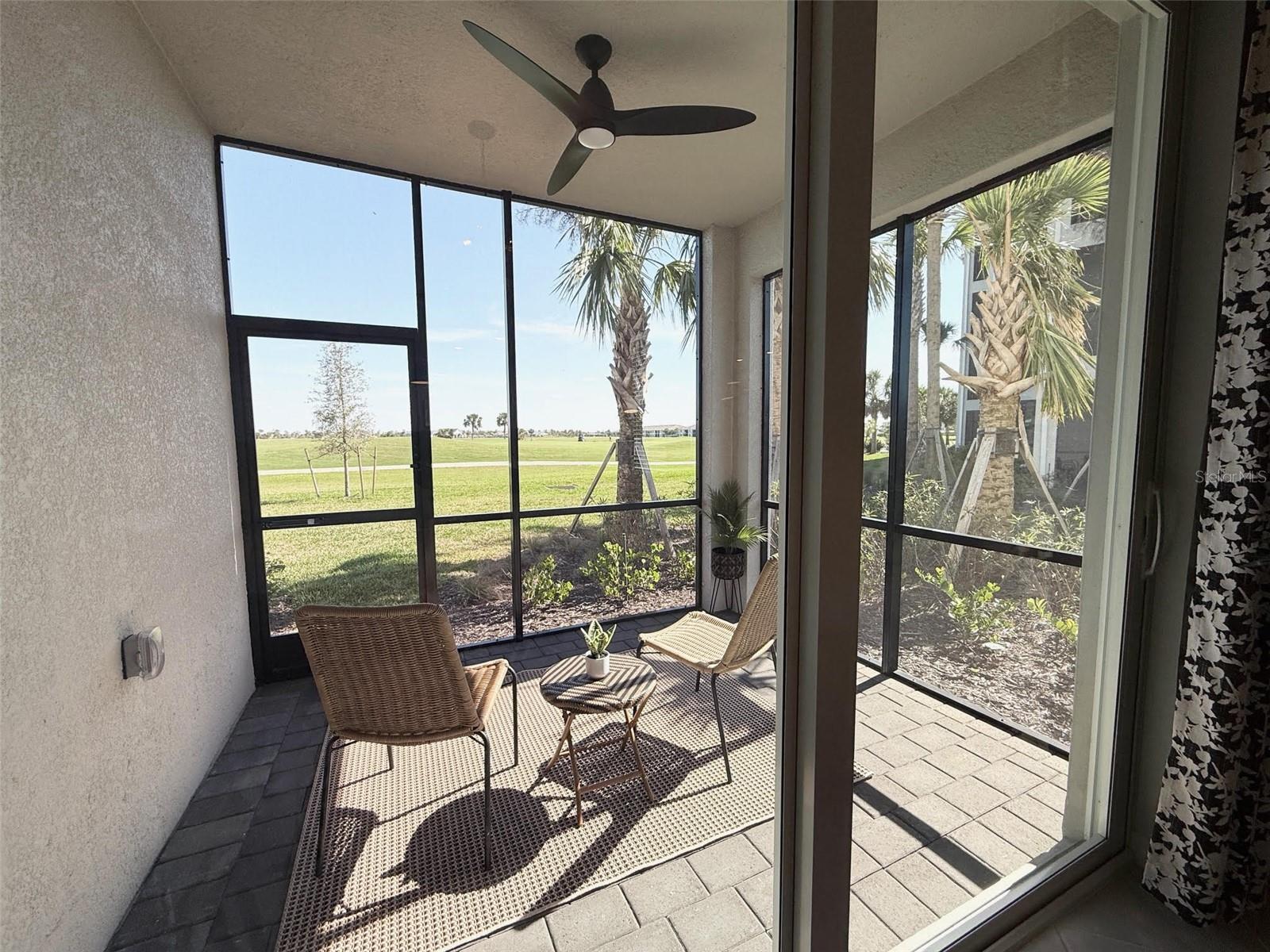 A turnkey opportunity! Everything you see is included! This beautifully furnished and decorated first floor end unit has 3 large bedrooms and 2 baths. Includes tile flooring throughout, quartz countertops with white shaker cabinets, all appliances including washer and dryer, custom lighting and ceiling fans with dimmers, window treatments and blinds, impact windows and doors, SmartHome features with security, screened patio with beautiful golf course views, separate storage room outside and dedicated carport parking. Includes the Social Membership in Babcock National.