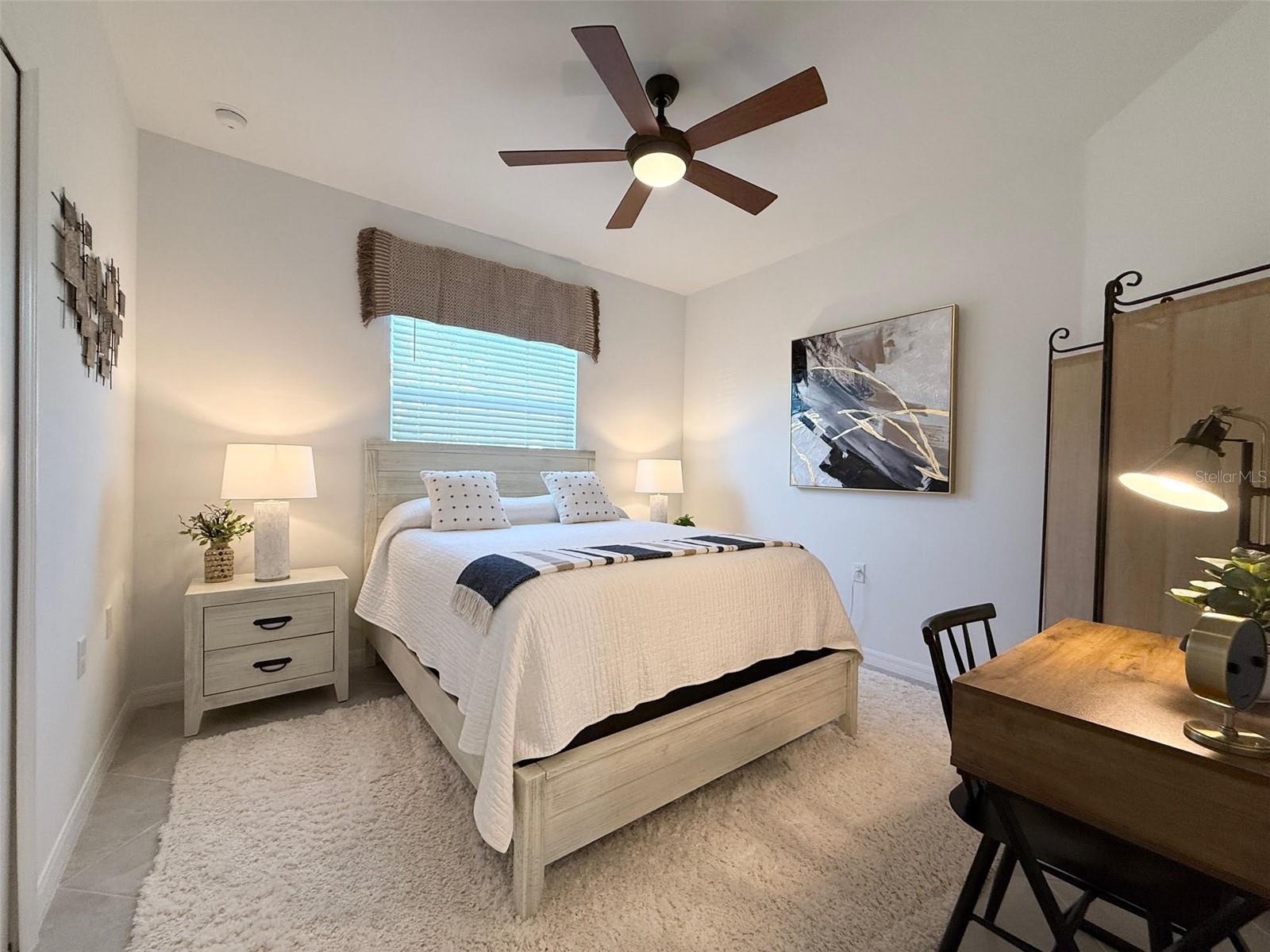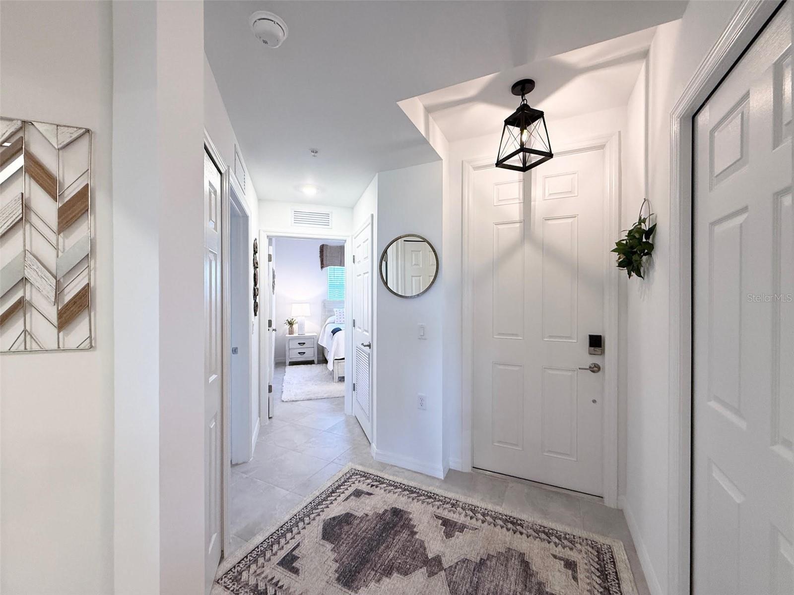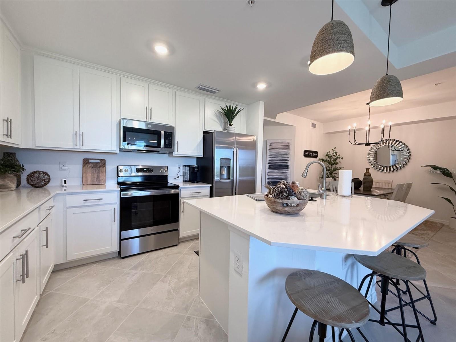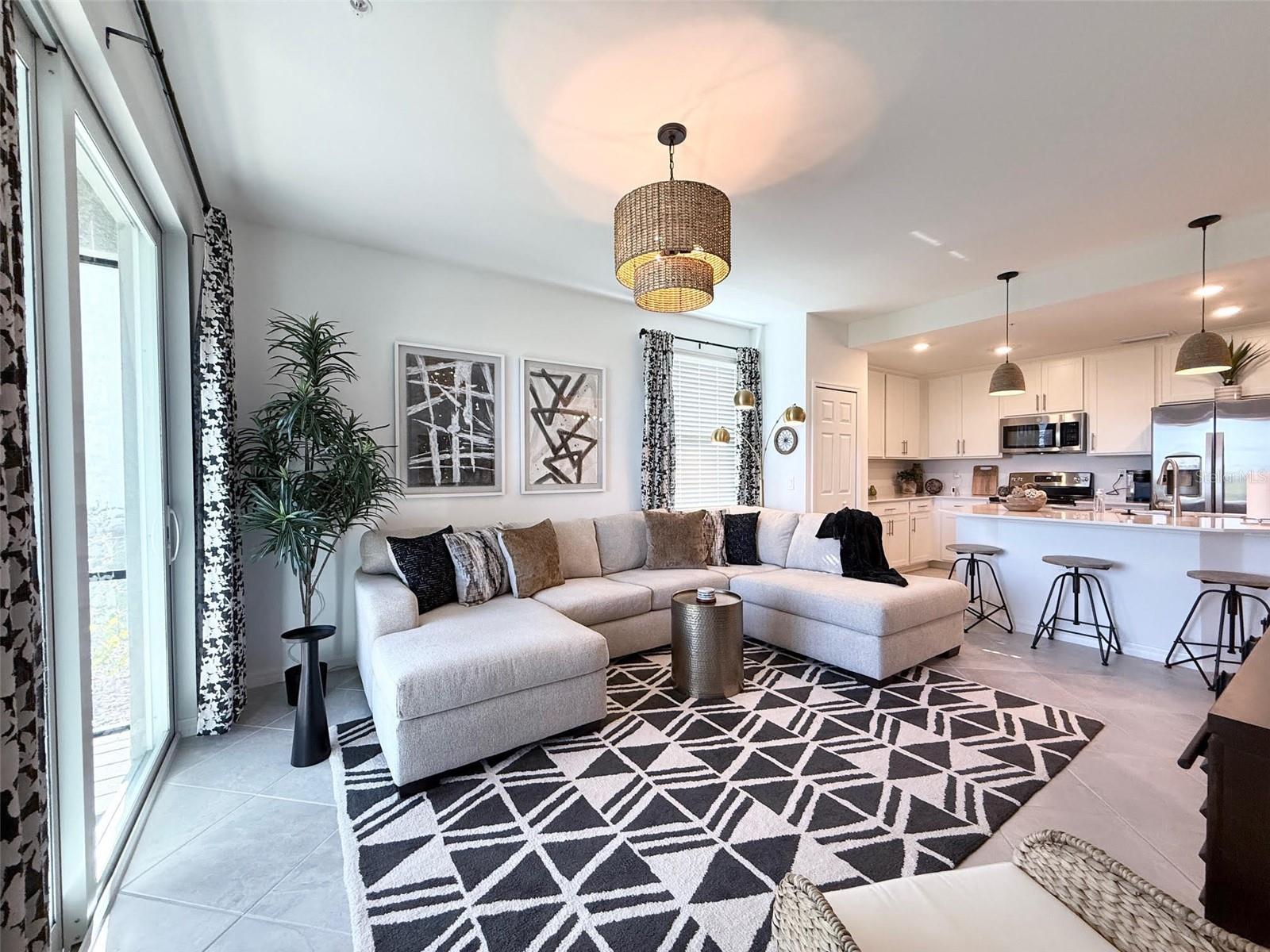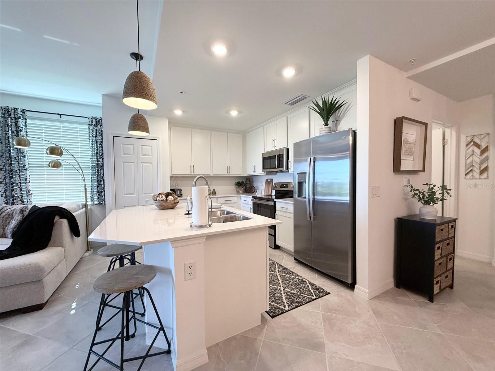 A turnkey opportunity! Everything you see is included! This beautifully furnished and decorated first floor end unit has 3 large bedrooms and 2 baths. Includes tile flooring throughout, quartz countertops with white shaker cabinets, all appliances including washer and dryer, custom lighting and ceiling fans with dimmers, window treatments and blinds, impact windows and doors, SmartHome features with security, screened patio with beautiful golf course views, separate storage room outside and dedicated carport parking. Includes the Social Membership in Babcock National.