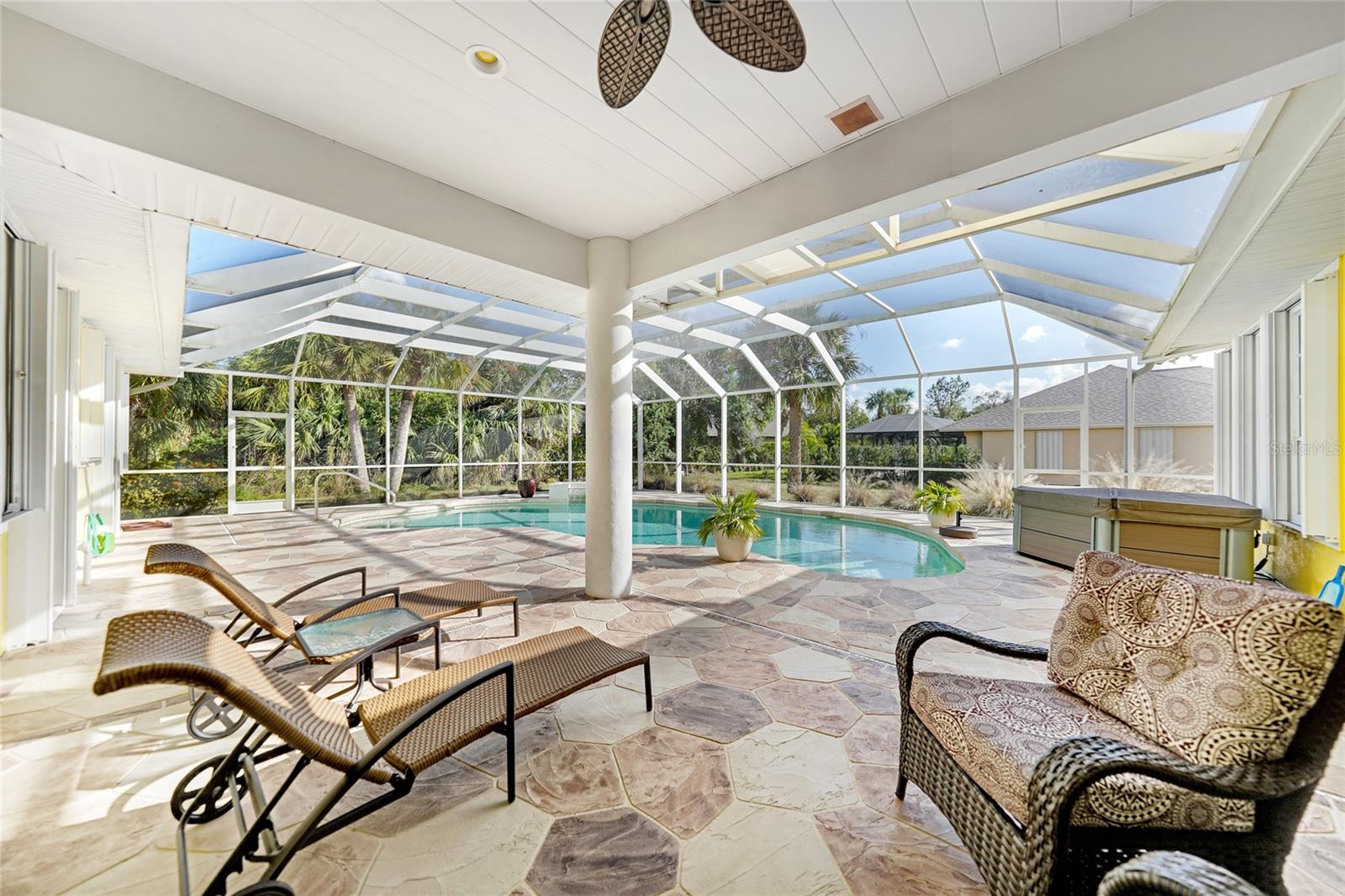 Gunite, In Ground, Lighting, Outside Bath Access, Salt Water, Screen Enclosure
