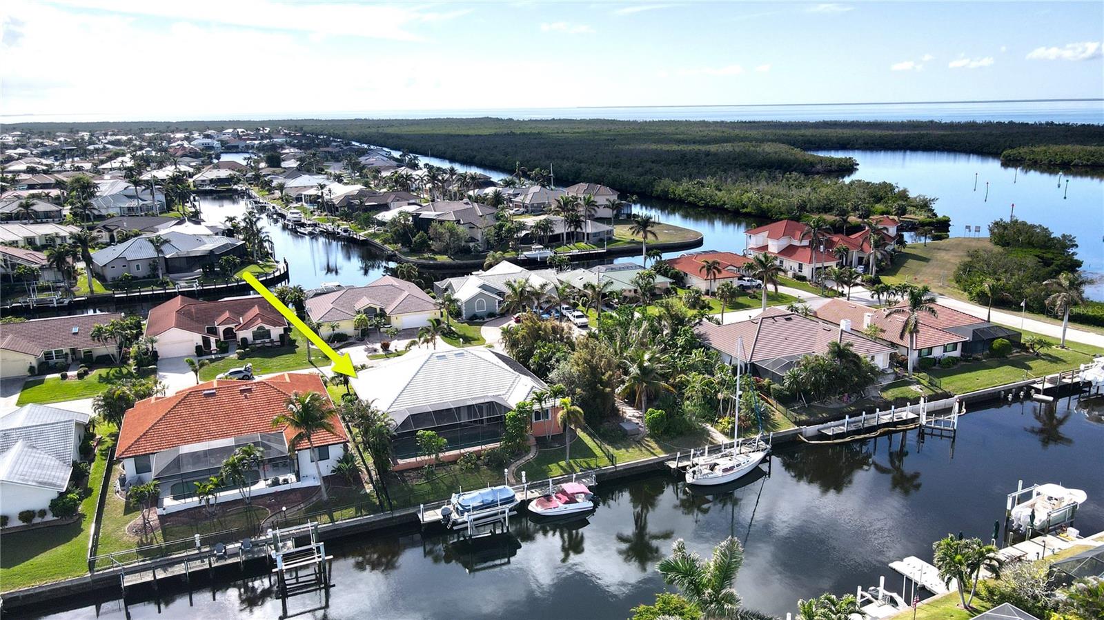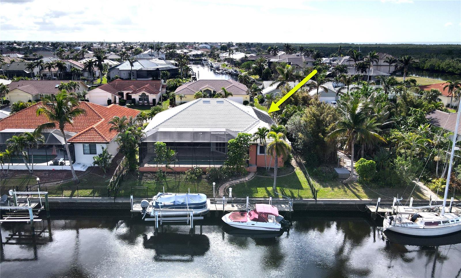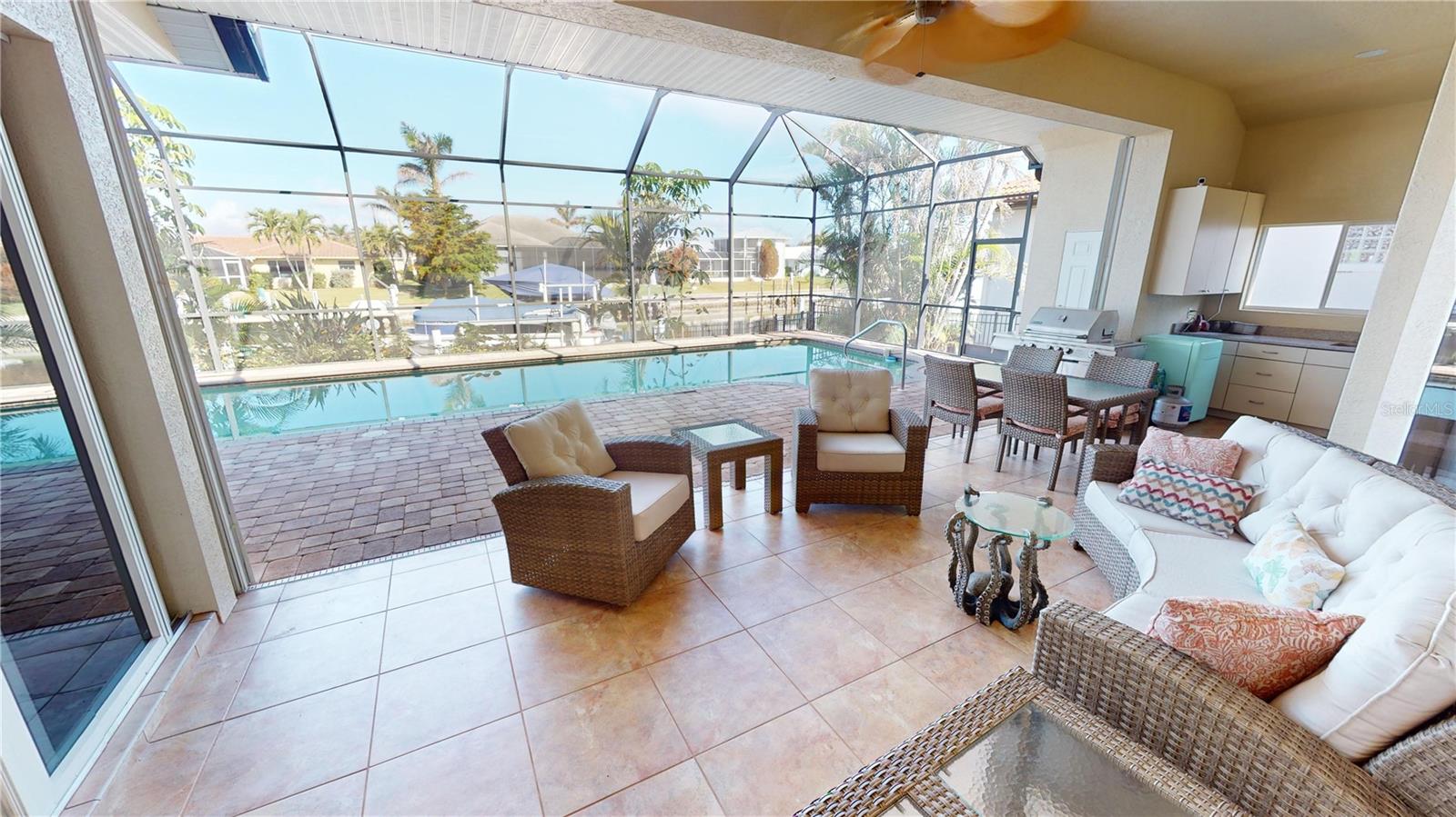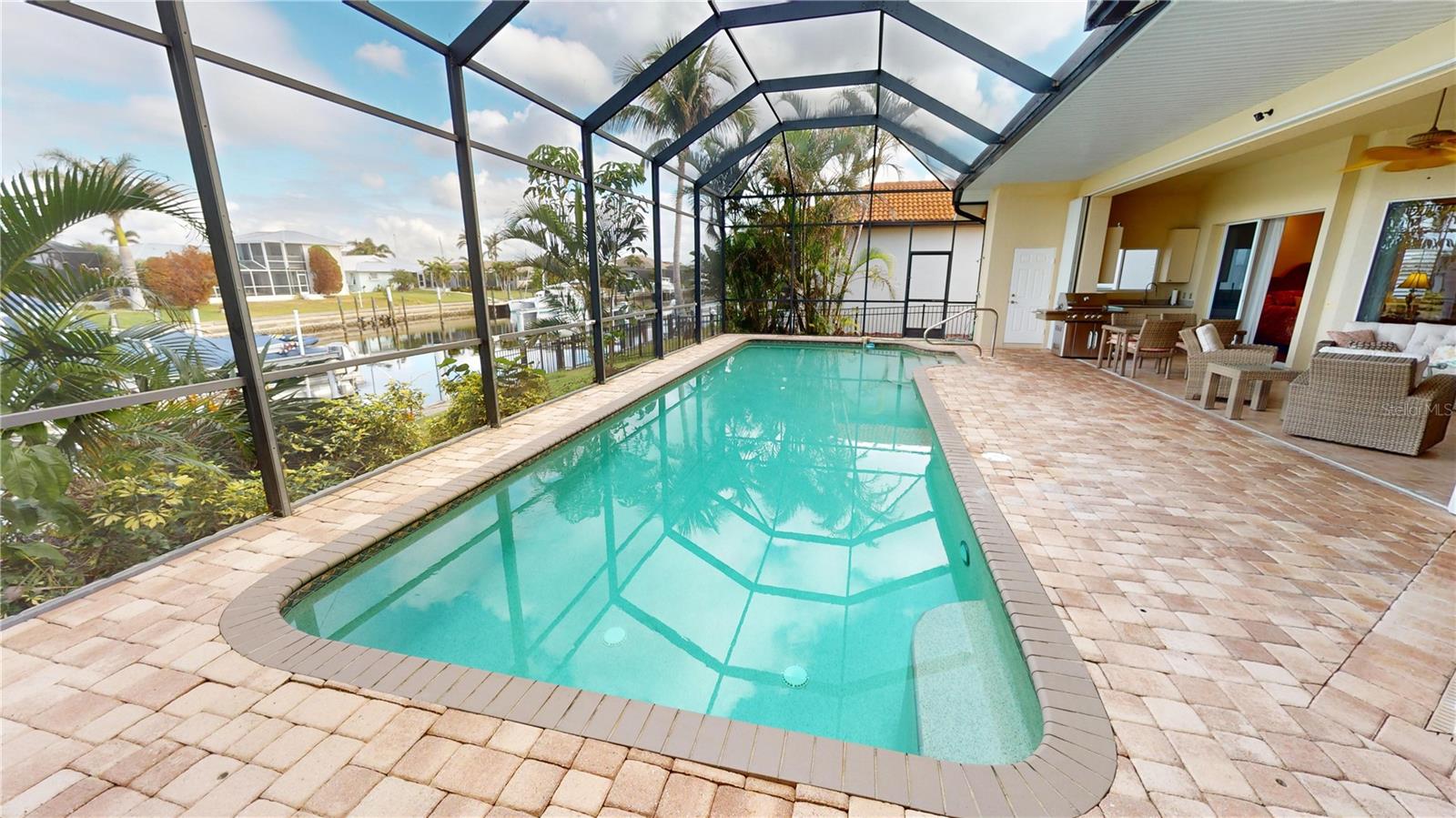 **PRICE IMPROVEMENT**PLEASE ENJOY THE 3D INTERACTIVE VIRTUAL TOUR ASSOCIATED WITH THIS LISTING – Welcome home to Punta Gorda, Florida and the unique boating community of Punta Gorda Isles. Situated on a 120' x 80' canal front lot, just 10 minutes from the open waters of Charlotte Harbor and the Gulf of Mexico beyond, is where you'll find this beautifully maintained, 2450 square foot, three-bedroom + Den, two-bath executive home. Built remarkably strong by Fero Construction in 2007, this residence enjoys an open, great room plan with soaring 11-foot tray ceilings and 8-foot tall corner glass sliders, providing 23 feet of unobstructed access to the screened waterfront pool enclosure. Open to the great room, the home's kitchen sports ample granite counters and Maplewood cabinetry, a closet pantry, a breakfast bar and a great view of the pool area. The primary en-suite bedroom, located on the opposite side of the house from the two guest rooms for added privacy, has two walk-in closets and a spacious bath with dual sinks, a shower and garden tub. The vast screened pool enclosure measures over 1530 square feet in size, 390-feet of which is under roof. This outdoor tropical oasis has direct access from the primary bedroom, living room, kitchen dinette and one of the two guest bedrooms, and it sports a 38' x 12’ foot heated (solar/heat pump) pool, a kitchenette and a storage closet. Beyond the pool enclosure is 80-feet of city-maintained seawall, which enjoys a 60-foot concrete dock with water, electrical service and an electric 10,000-pound boat lift. Other notable features include a two-car attached garage with overhead storage and A/C, ManaBloc central plumbing, a central vacuum system, built-in ceiling speakers in most rooms and full window storm protection. From this location, you are but 1.3 miles from Ponce De Leon Park, 2.6 miles from the Fisherman's Village entertainment complex, 3.2 miles from historic downtown Punta Gorda and just 7 miles from Punta Gorda Airport (PGD). This home represents an excellent find and a preferred area at an ideal price. Walk through this listing now, and click on the interactive 3D virtual tour.