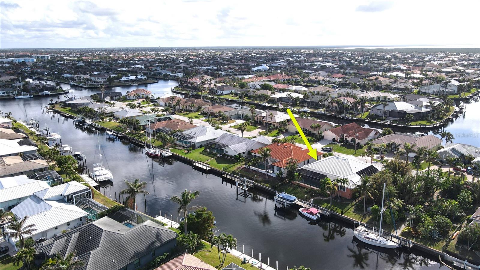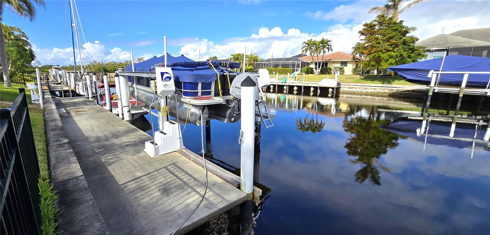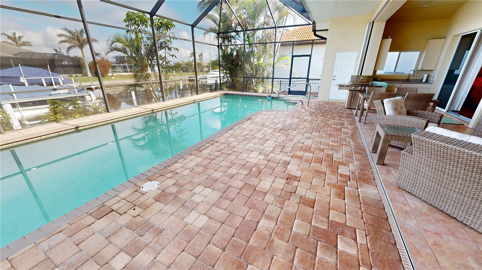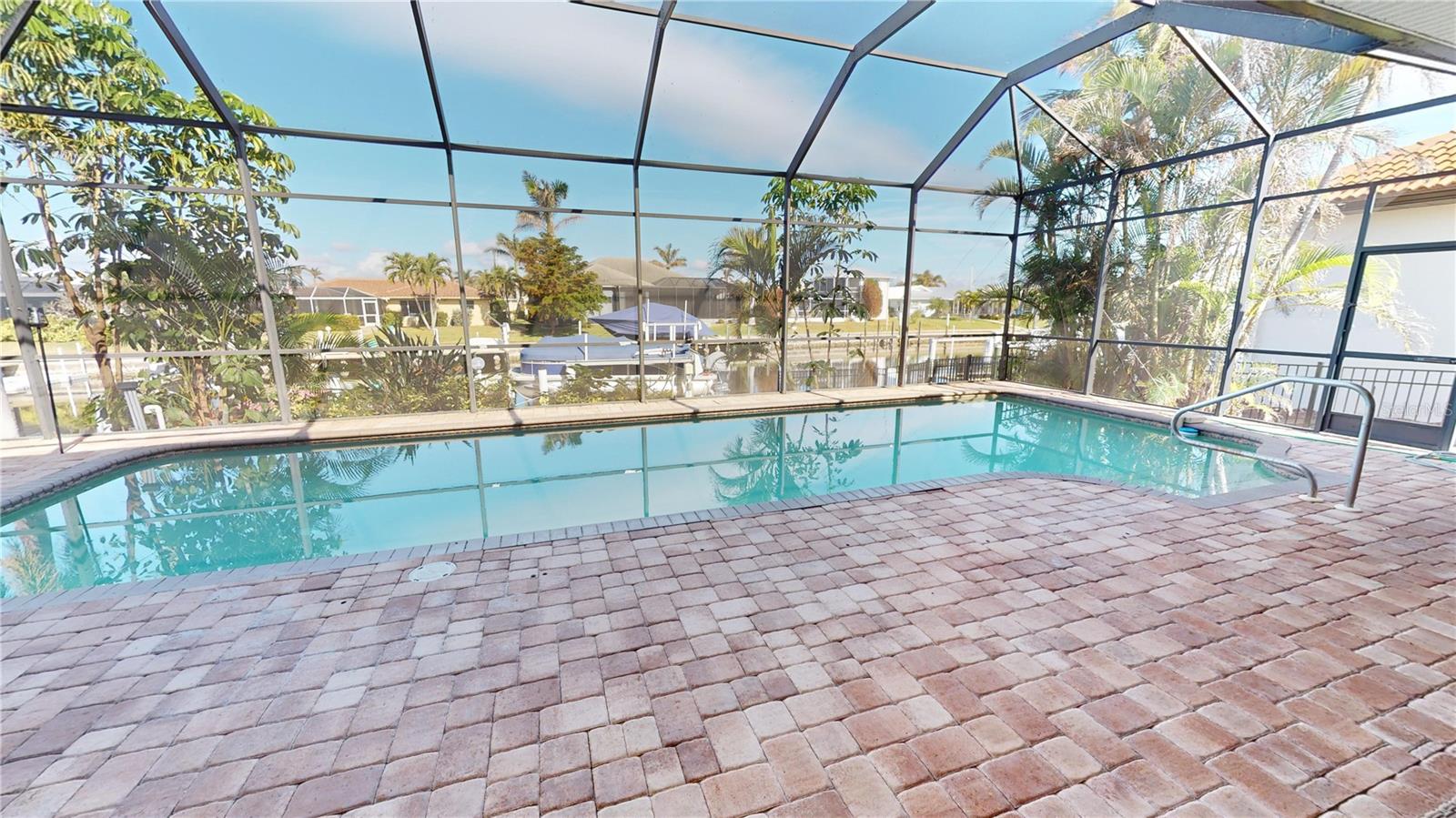 **PRICE IMPROVEMENT**PLEASE ENJOY THE 3D INTERACTIVE VIRTUAL TOUR ASSOCIATED WITH THIS LISTING – Welcome home to Punta Gorda, Florida and the unique boating community of Punta Gorda Isles. Situated on a 120' x 80' canal front lot, just 10 minutes from the open waters of Charlotte Harbor and the Gulf of Mexico beyond, is where you'll find this beautifully maintained, 2450 square foot, three-bedroom + Den, two-bath executive home. Built remarkably strong by Fero Construction in 2007, this residence enjoys an open, great room plan with soaring 11-foot tray ceilings and 8-foot tall corner glass sliders, providing 23 feet of unobstructed access to the screened waterfront pool enclosure. Open to the great room, the home's kitchen sports ample granite counters and Maplewood cabinetry, a closet pantry, a breakfast bar and a great view of the pool area. The primary en-suite bedroom, located on the opposite side of the house from the two guest rooms for added privacy, has two walk-in closets and a spacious bath with dual sinks, a shower and garden tub. The vast screened pool enclosure measures over 1530 square feet in size, 390-feet of which is under roof. This outdoor tropical oasis has direct access from the primary bedroom, living room, kitchen dinette and one of the two guest bedrooms, and it sports a 38' x 12’ foot heated (solar/heat pump) pool, a kitchenette and a storage closet. Beyond the pool enclosure is 80-feet of city-maintained seawall, which enjoys a 60-foot concrete dock with water, electrical service and an electric 10,000-pound boat lift. Other notable features include a two-car attached garage with overhead storage and A/C, ManaBloc central plumbing, a central vacuum system, built-in ceiling speakers in most rooms and full window storm protection. From this location, you are but 1.3 miles from Ponce De Leon Park, 2.6 miles from the Fisherman's Village entertainment complex, 3.2 miles from historic downtown Punta Gorda and just 7 miles from Punta Gorda Airport (PGD). This home represents an excellent find and a preferred area at an ideal price. Walk through this listing now, and click on the interactive 3D virtual tour.