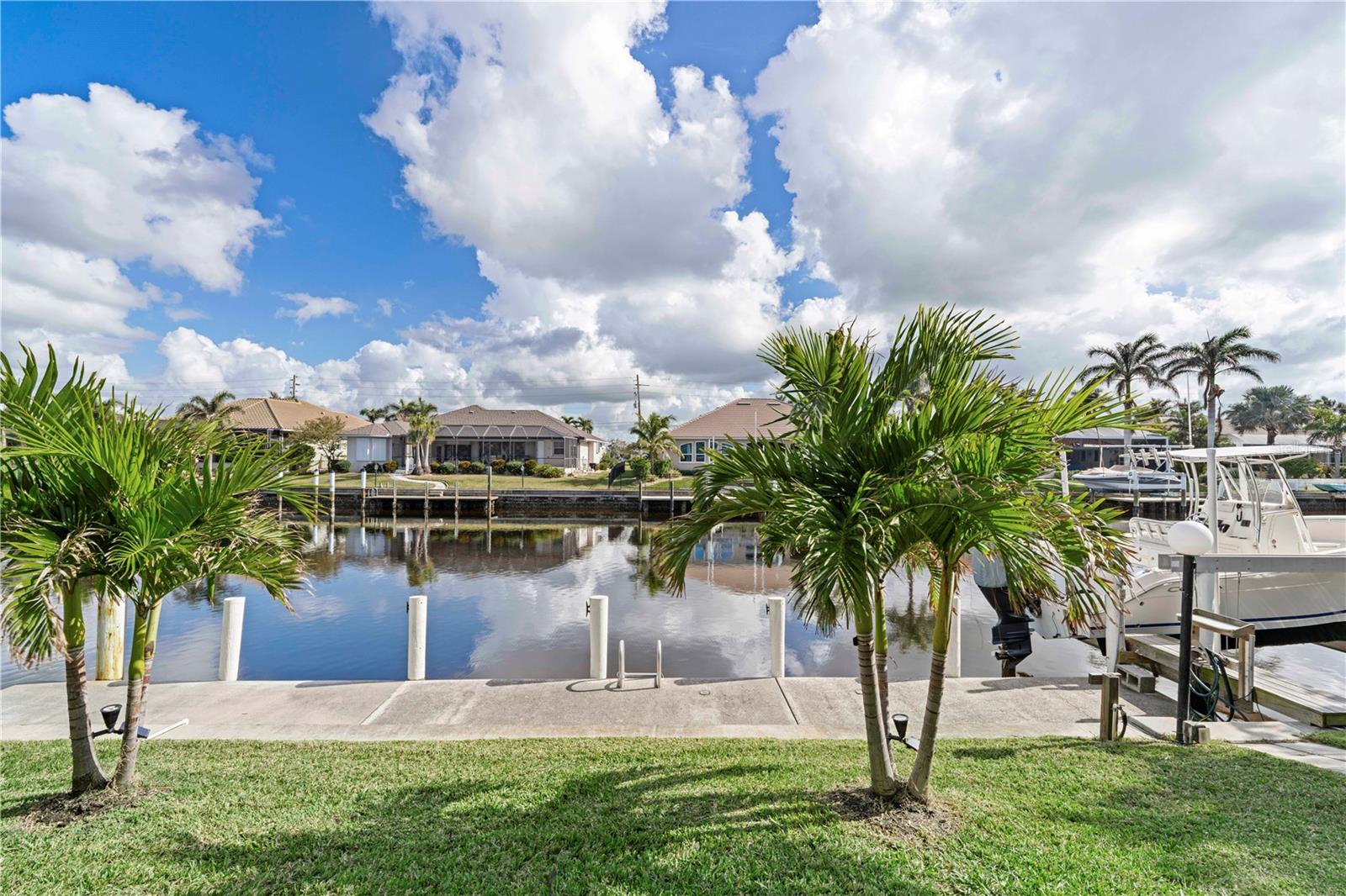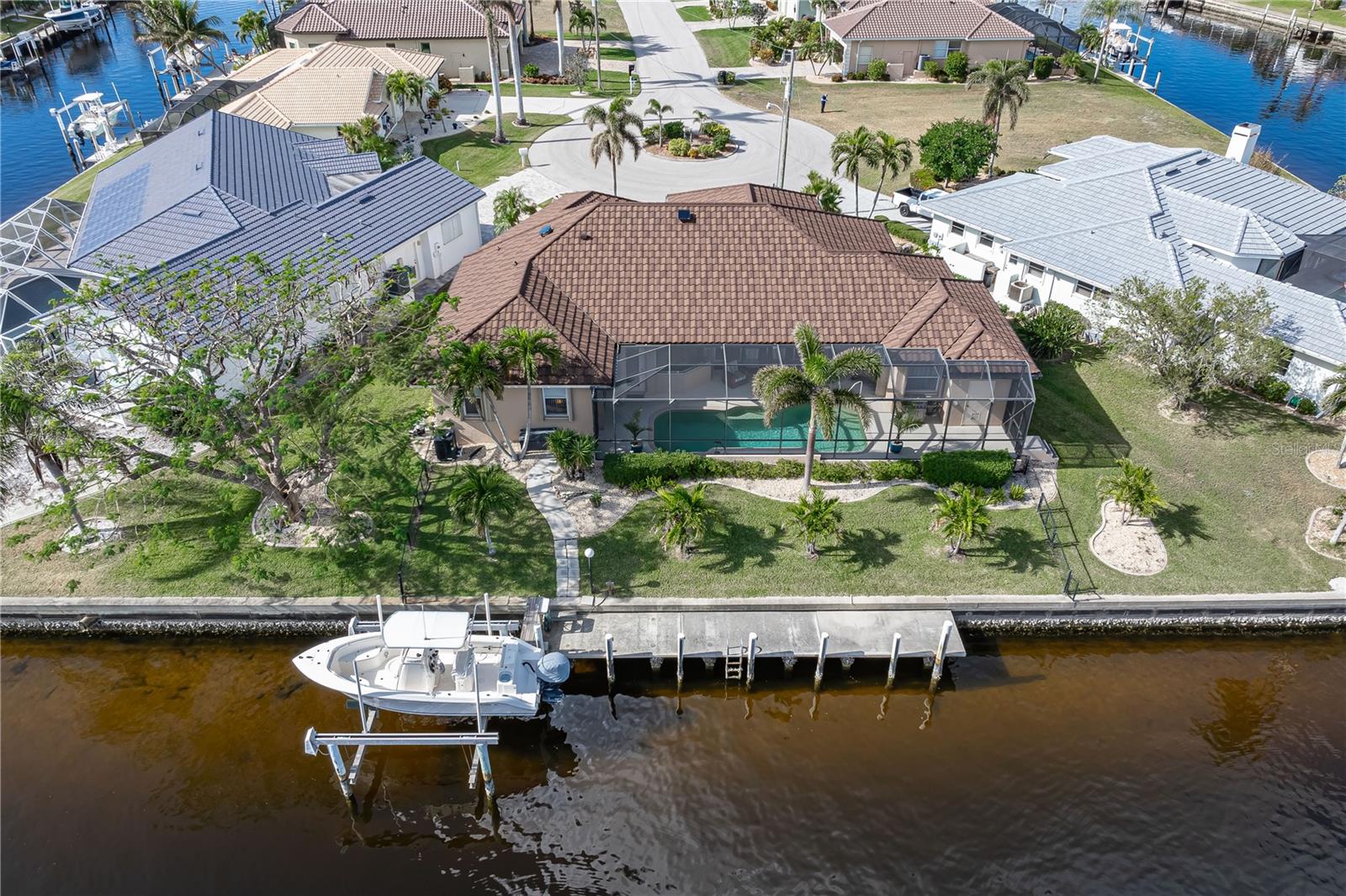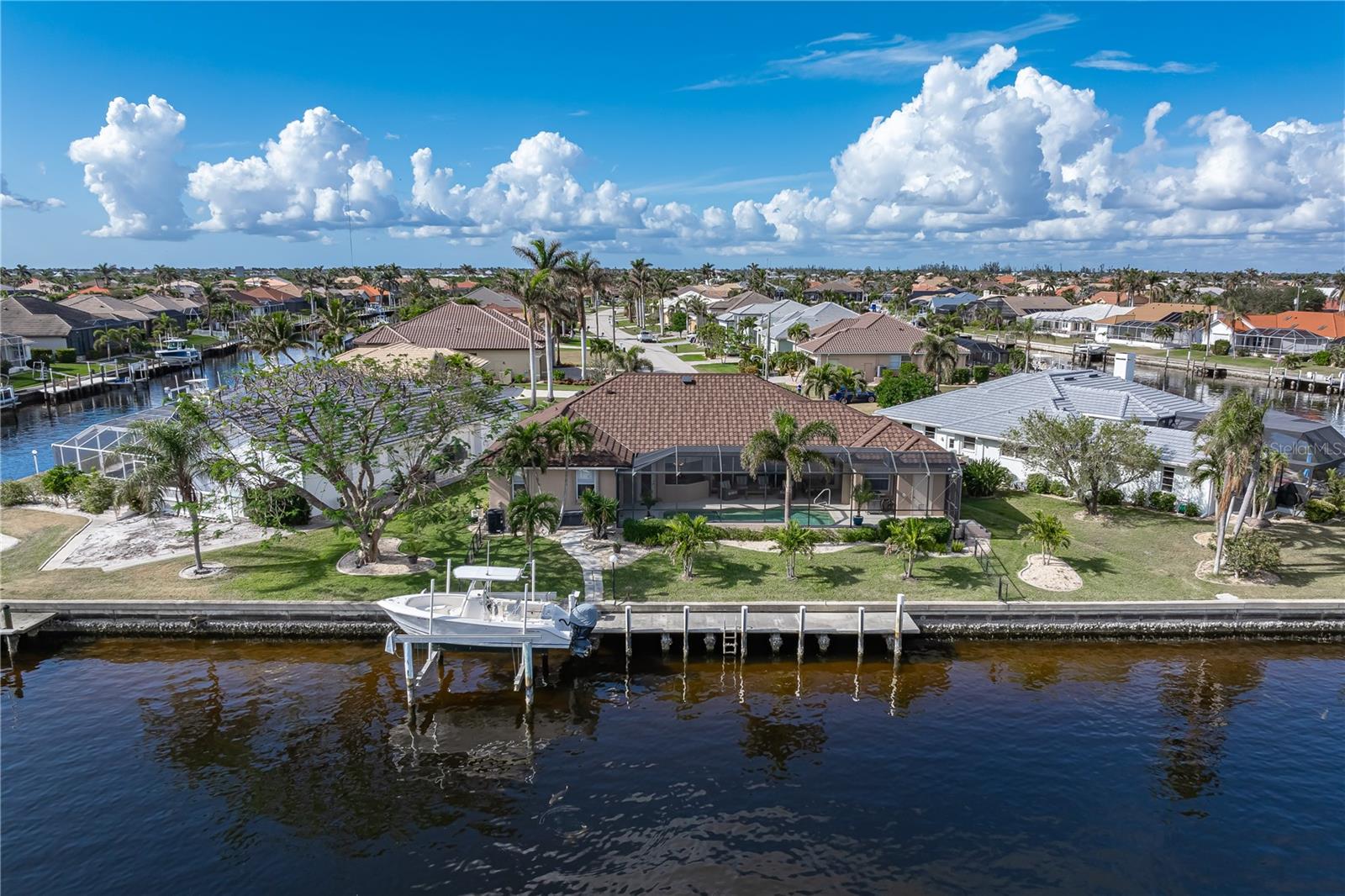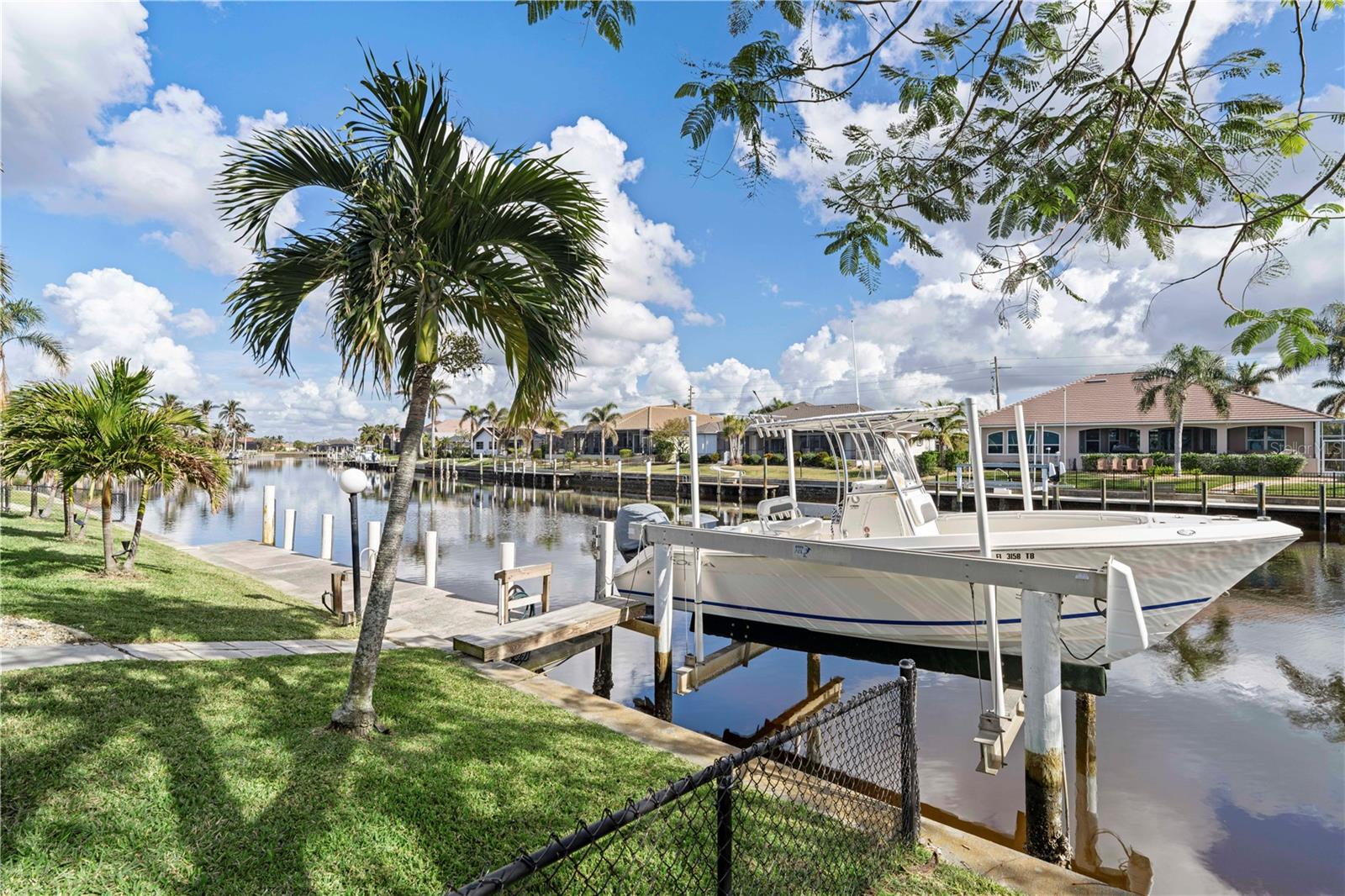 CUSTOM WATERFRONT HOME IN BSI ON KEY LOT W/**NEW METAL TILE ROOF AND NEW ENERGY EFFICIENT AC ** & 140 FT OF SEAWALL! Check out this 3 bed/2 bath, waterfront home w/over 2,200 sq ft of living space in the deed-restricted waterfront & golf community of Burnt Store Isles. Home is located on a quiet cul-de-sac surrounded by friendly neighbors. The interior of the home is bright & airy w/walls of sliding glass doors & large picture windows in almost every room. Architectural details include soaring cathedral ceilings, porcelain tile flooring throughout the main living areas as well as the guest bedroom/den, decorative plant shelves, rectangular transom windows in great room, gourmet kitchen w/adjacent breakfast nook & inviting outdoor living area. The great room features a built-in entertainment center w/lighted display shelves & disappearing sliding glass doors that extend the living space out onto the lanai. Centrally located kitchen offers a wraparound, multi-level breakfast bar, built-in convection oven/convection microwave, cook-top range w/hood plus ample cabinet & counter space. Almost all of the cabinets have pull-out shelves. The kitchen also features a tile back splash & under cabinet lighting. Lots of space for entertaining w/a formal dining area & large breakfast nook. Breakfast nook boasts a mitered aquarium glass window & built-in desk. The master suite offers walk-out access to the lanai, a spa-like master bath & oversized walk-in closet. The master bath has dual sinks, a large linen closet, private WC, a corner tub plus a tile & glass walk-in shower. The split bedroom offers large guest rooms. One guest room has walk-out access to the lanai w/pool & canal views while the other doubles as a home office/den. The guest bath features a combination tub/shower & linen closet. Outside, the lanai offers an in-ground, heated pool & lots of room for outdoor entertaining w/covered seating area & a sun deck off to the side by the outdoor shower & pool storage closet. Sit back & enjoy the canal view - watch as boats & the occasional dolphin or manatee wander past. Two doors from the screened lanai lead out to the fenced back yard. A concrete walkway leads to the 45 ft extended concrete dock w/12,000 lb boat lift. Boat lift perfectly positioned off to the side so as not to block the water view. Water & electric hook-ups are available dockside. Set off on your latest maritime adventure from your own backyard & start enjoying some of the best fishing & boating SW Florida has to offer. Other amenities include whole-house hurricane protection w/accordion shutters, water softener, attached oversized two car garage w/workshop & well-maintained tropical landscaping. Burnt Store Isles has an optional HOA & optional boat club both w/active social calendars. AC - Sept 2025 - Brand New. Boat for sale separately.