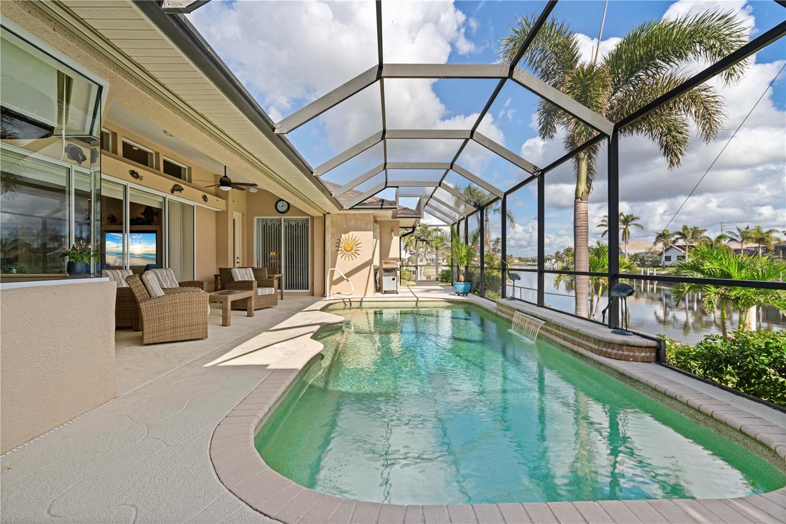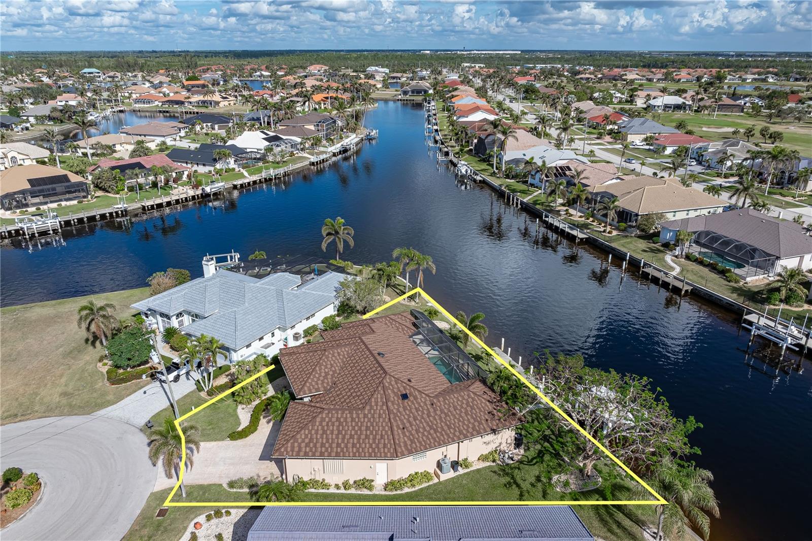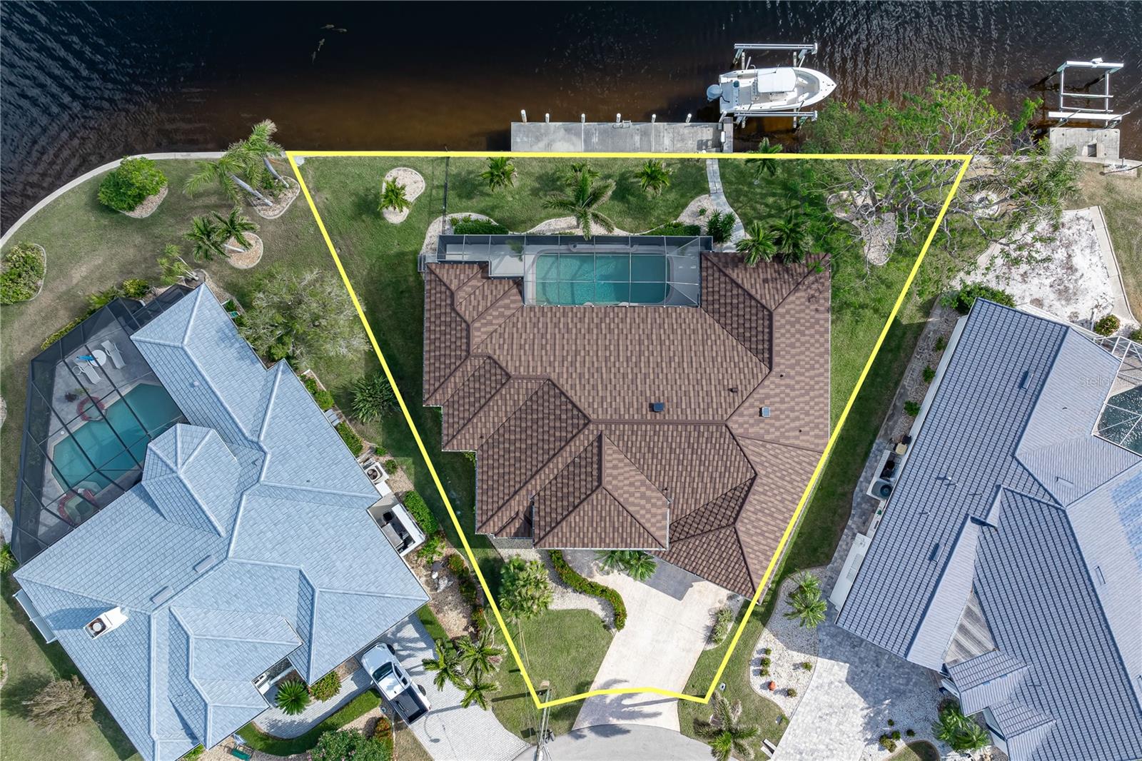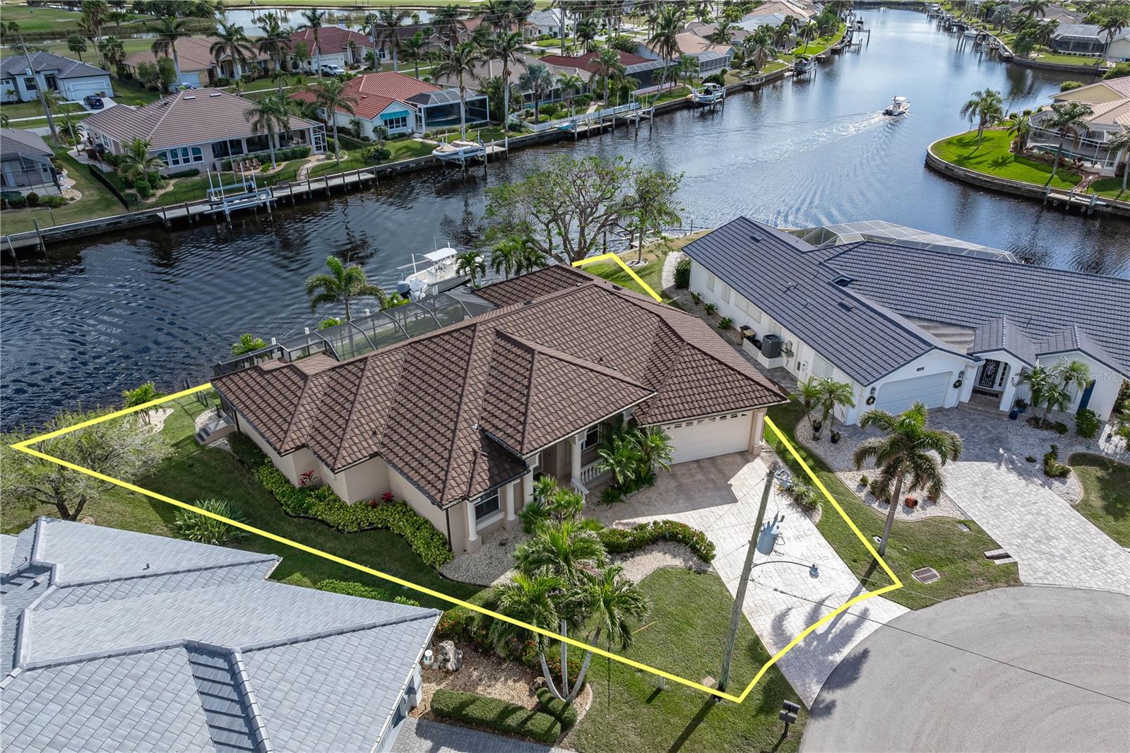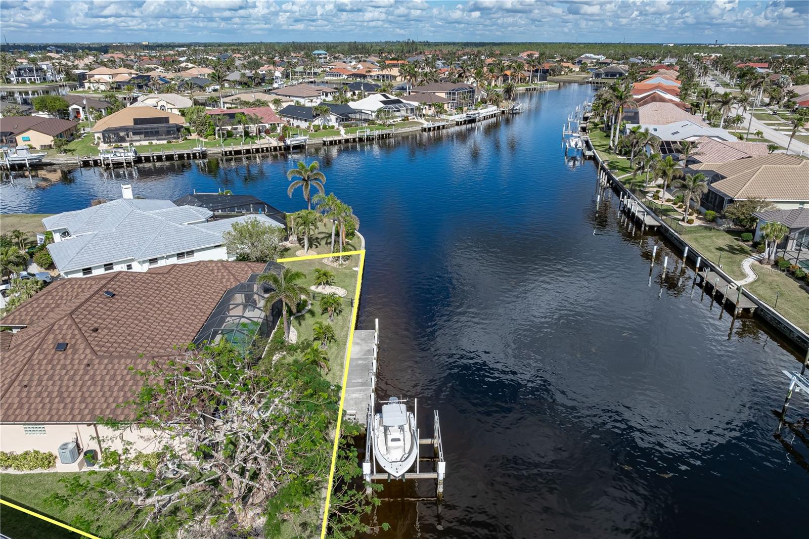 CUSTOM WATERFRONT HOME IN BSI ON KEY LOT W/**NEW METAL TILE ROOF AND NEW ENERGY EFFICIENT AC ** & 140 FT OF SEAWALL! Check out this 3 bed/2 bath, waterfront home w/over 2,200 sq ft of living space in the deed-restricted waterfront & golf community of Burnt Store Isles. Home is located on a quiet cul-de-sac surrounded by friendly neighbors. The interior of the home is bright & airy w/walls of sliding glass doors & large picture windows in almost every room. Architectural details include soaring cathedral ceilings, porcelain tile flooring throughout the main living areas as well as the guest bedroom/den, decorative plant shelves, rectangular transom windows in great room, gourmet kitchen w/adjacent breakfast nook & inviting outdoor living area. The great room features a built-in entertainment center w/lighted display shelves & disappearing sliding glass doors that extend the living space out onto the lanai. Centrally located kitchen offers a wraparound, multi-level breakfast bar, built-in convection oven/convection microwave, cook-top range w/hood plus ample cabinet & counter space. Almost all of the cabinets have pull-out shelves. The kitchen also features a tile back splash & under cabinet lighting. Lots of space for entertaining w/a formal dining area & large breakfast nook. Breakfast nook boasts a mitered aquarium glass window & built-in desk. The master suite offers walk-out access to the lanai, a spa-like master bath & oversized walk-in closet. The master bath has dual sinks, a large linen closet, private WC, a corner tub plus a tile & glass walk-in shower. The split bedroom offers large guest rooms. One guest room has walk-out access to the lanai w/pool & canal views while the other doubles as a home office/den. The guest bath features a combination tub/shower & linen closet. Outside, the lanai offers an in-ground, heated pool & lots of room for outdoor entertaining w/covered seating area & a sun deck off to the side by the outdoor shower & pool storage closet. Sit back & enjoy the canal view - watch as boats & the occasional dolphin or manatee wander past. Two doors from the screened lanai lead out to the fenced back yard. A concrete walkway leads to the 45 ft extended concrete dock w/12,000 lb boat lift. Boat lift perfectly positioned off to the side so as not to block the water view. Water & electric hook-ups are available dockside. Set off on your latest maritime adventure from your own backyard & start enjoying some of the best fishing & boating SW Florida has to offer. Other amenities include whole-house hurricane protection w/accordion shutters, water softener, attached oversized two car garage w/workshop & well-maintained tropical landscaping. Burnt Store Isles has an optional HOA & optional boat club both w/active social calendars. AC - Sept 2025 - Brand New. Boat for sale separately.