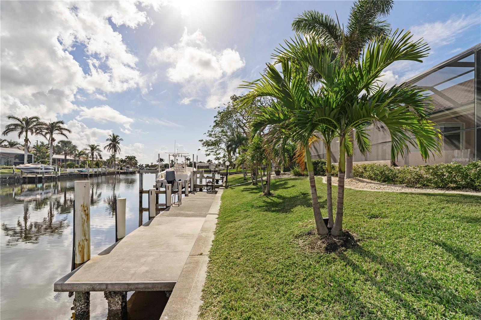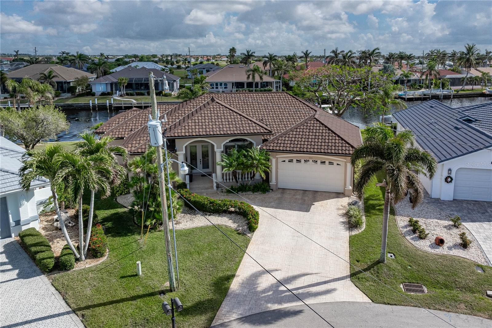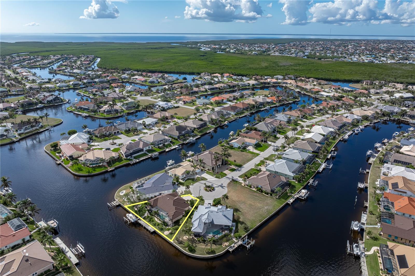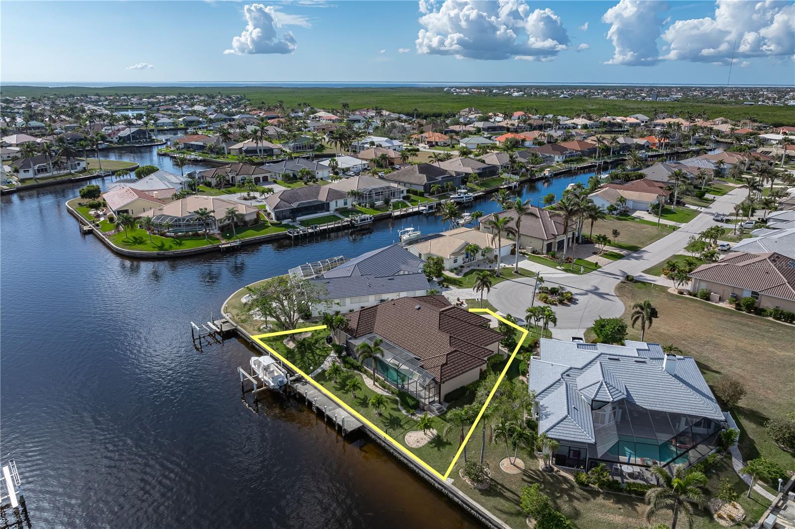 CUSTOM WATERFRONT HOME IN BSI ON KEY LOT W/**NEW METAL TILE ROOF AND NEW ENERGY EFFICIENT AC ** & 140 FT OF SEAWALL! Check out this 3 bed/2 bath, waterfront home w/over 2,200 sq ft of living space in the deed-restricted waterfront & golf community of Burnt Store Isles. Home is located on a quiet cul-de-sac surrounded by friendly neighbors. The interior of the home is bright & airy w/walls of sliding glass doors & large picture windows in almost every room. Architectural details include soaring cathedral ceilings, porcelain tile flooring throughout the main living areas as well as the guest bedroom/den, decorative plant shelves, rectangular transom windows in great room, gourmet kitchen w/adjacent breakfast nook & inviting outdoor living area. The great room features a built-in entertainment center w/lighted display shelves & disappearing sliding glass doors that extend the living space out onto the lanai. Centrally located kitchen offers a wraparound, multi-level breakfast bar, built-in convection oven/convection microwave, cook-top range w/hood plus ample cabinet & counter space. Almost all of the cabinets have pull-out shelves. The kitchen also features a tile back splash & under cabinet lighting. Lots of space for entertaining w/a formal dining area & large breakfast nook. Breakfast nook boasts a mitered aquarium glass window & built-in desk. The master suite offers walk-out access to the lanai, a spa-like master bath & oversized walk-in closet. The master bath has dual sinks, a large linen closet, private WC, a corner tub plus a tile & glass walk-in shower. The split bedroom offers large guest rooms. One guest room has walk-out access to the lanai w/pool & canal views while the other doubles as a home office/den. The guest bath features a combination tub/shower & linen closet. Outside, the lanai offers an in-ground, heated pool & lots of room for outdoor entertaining w/covered seating area & a sun deck off to the side by the outdoor shower & pool storage closet. Sit back & enjoy the canal view - watch as boats & the occasional dolphin or manatee wander past. Two doors from the screened lanai lead out to the fenced back yard. A concrete walkway leads to the 45 ft extended concrete dock w/12,000 lb boat lift. Boat lift perfectly positioned off to the side so as not to block the water view. Water & electric hook-ups are available dockside. Set off on your latest maritime adventure from your own backyard & start enjoying some of the best fishing & boating SW Florida has to offer. Other amenities include whole-house hurricane protection w/accordion shutters, water softener, attached oversized two car garage w/workshop & well-maintained tropical landscaping. Burnt Store Isles has an optional HOA & optional boat club both w/active social calendars. AC - Sept 2025 - Brand New. Boat for sale separately.