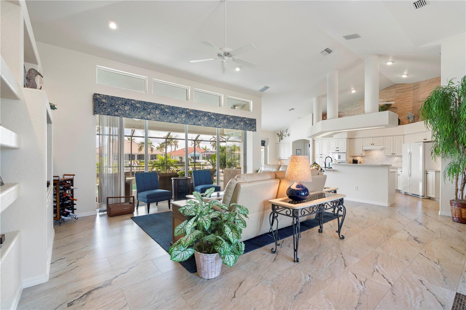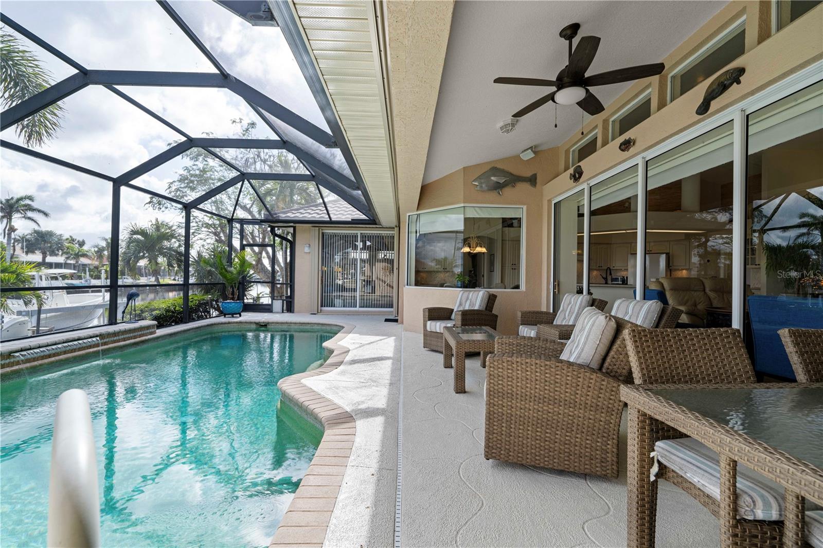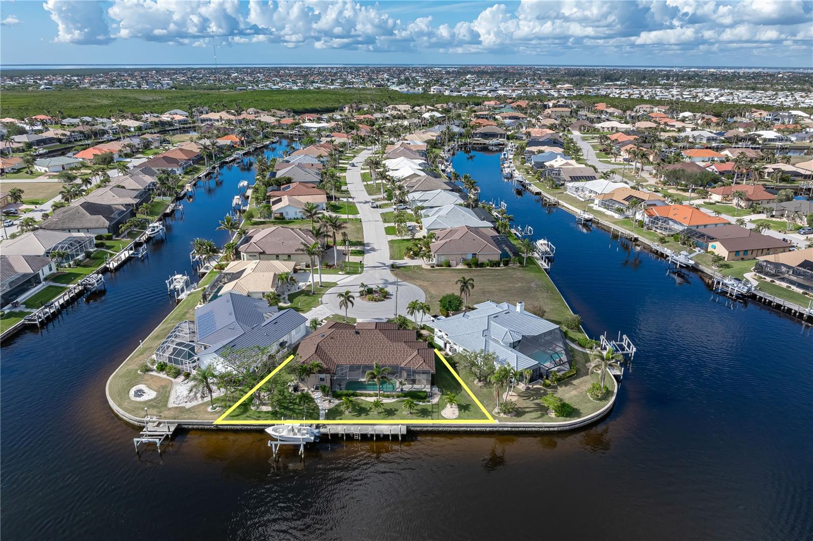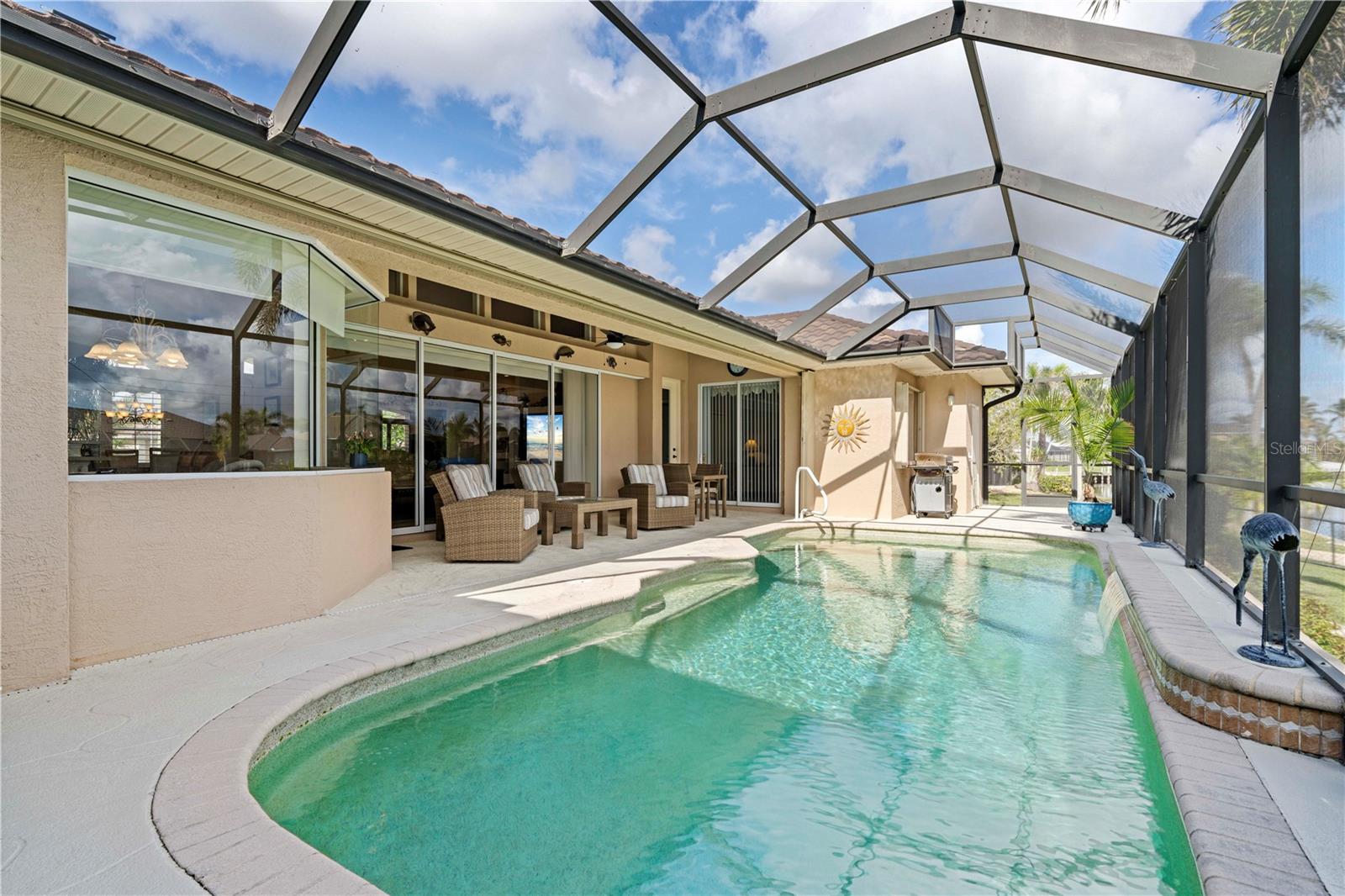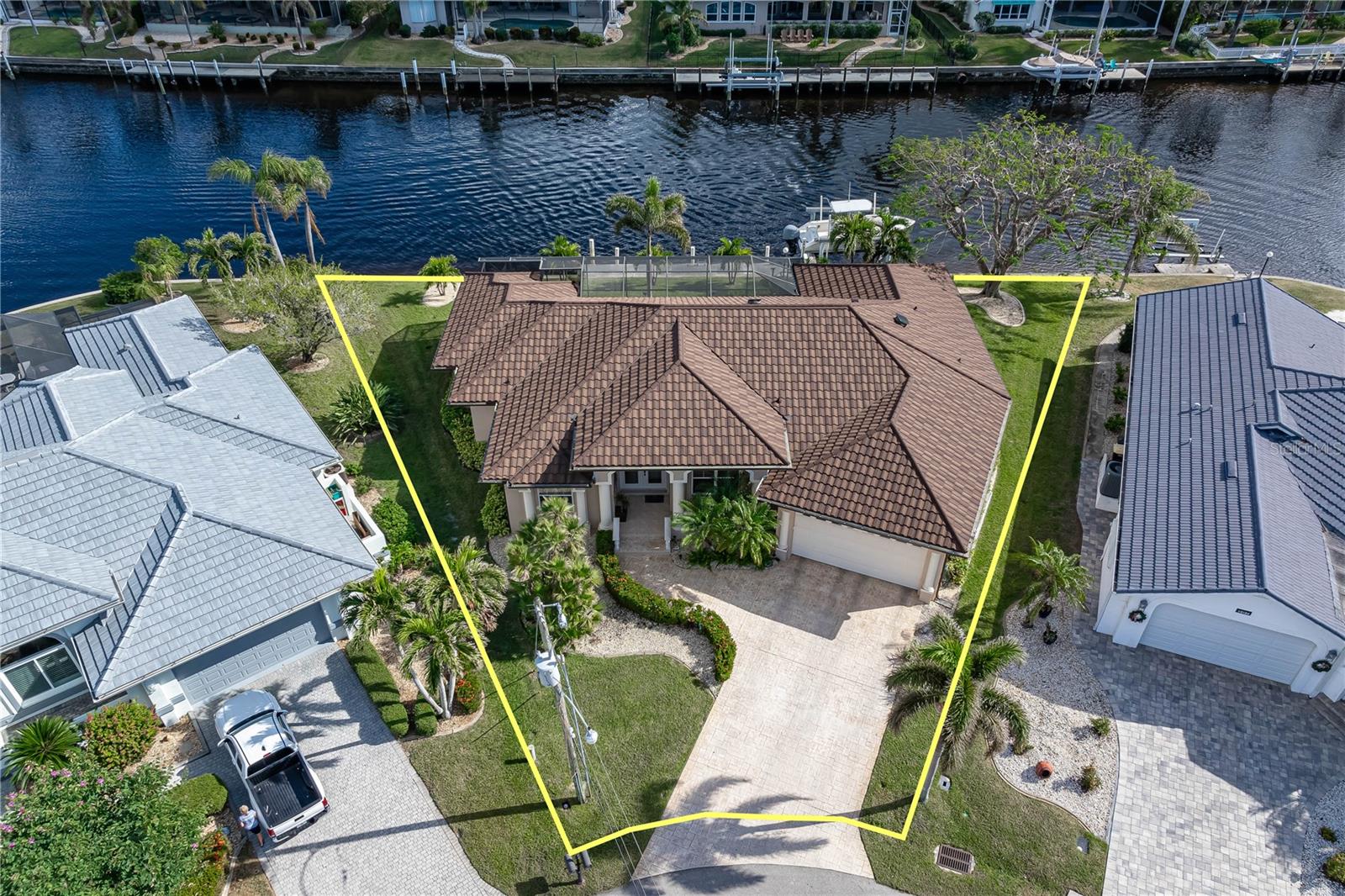 CUSTOM WATERFRONT HOME IN BSI ON KEY LOT W/**NEW METAL TILE ROOF AND NEW ENERGY EFFICIENT AC ** & 140 FT OF SEAWALL! Check out this 3 bed/2 bath, waterfront home w/over 2,200 sq ft of living space in the deed-restricted waterfront & golf community of Burnt Store Isles. Home is located on a quiet cul-de-sac surrounded by friendly neighbors. The interior of the home is bright & airy w/walls of sliding glass doors & large picture windows in almost every room. Architectural details include soaring cathedral ceilings, porcelain tile flooring throughout the main living areas as well as the guest bedroom/den, decorative plant shelves, rectangular transom windows in great room, gourmet kitchen w/adjacent breakfast nook & inviting outdoor living area. The great room features a built-in entertainment center w/lighted display shelves & disappearing sliding glass doors that extend the living space out onto the lanai. Centrally located kitchen offers a wraparound, multi-level breakfast bar, built-in convection oven/convection microwave, cook-top range w/hood plus ample cabinet & counter space. Almost all of the cabinets have pull-out shelves. The kitchen also features a tile back splash & under cabinet lighting. Lots of space for entertaining w/a formal dining area & large breakfast nook. Breakfast nook boasts a mitered aquarium glass window & built-in desk. The master suite offers walk-out access to the lanai, a spa-like master bath & oversized walk-in closet. The master bath has dual sinks, a large linen closet, private WC, a corner tub plus a tile & glass walk-in shower. The split bedroom offers large guest rooms. One guest room has walk-out access to the lanai w/pool & canal views while the other doubles as a home office/den. The guest bath features a combination tub/shower & linen closet. Outside, the lanai offers an in-ground, heated pool & lots of room for outdoor entertaining w/covered seating area & a sun deck off to the side by the outdoor shower & pool storage closet. Sit back & enjoy the canal view - watch as boats & the occasional dolphin or manatee wander past. Two doors from the screened lanai lead out to the fenced back yard. A concrete walkway leads to the 45 ft extended concrete dock w/12,000 lb boat lift. Boat lift perfectly positioned off to the side so as not to block the water view. Water & electric hook-ups are available dockside. Set off on your latest maritime adventure from your own backyard & start enjoying some of the best fishing & boating SW Florida has to offer. Other amenities include whole-house hurricane protection w/accordion shutters, water softener, attached oversized two car garage w/workshop & well-maintained tropical landscaping. Burnt Store Isles has an optional HOA & optional boat club both w/active social calendars. AC - Sept 2025 - Brand New. Boat for sale separately.