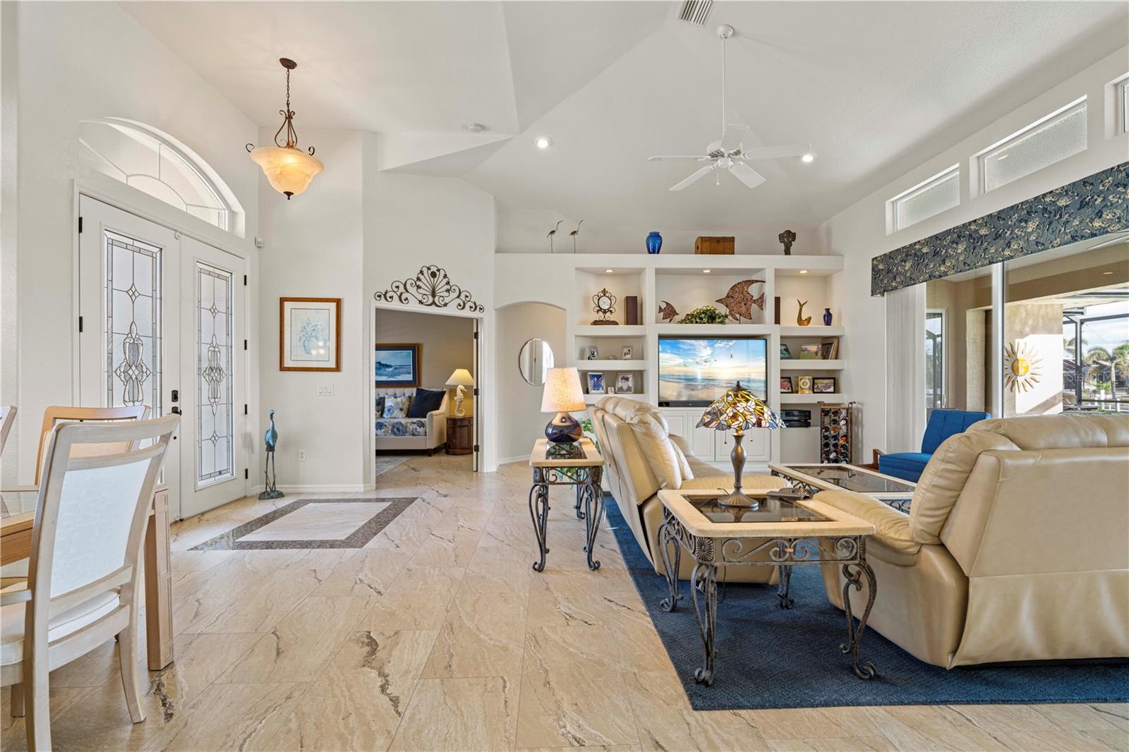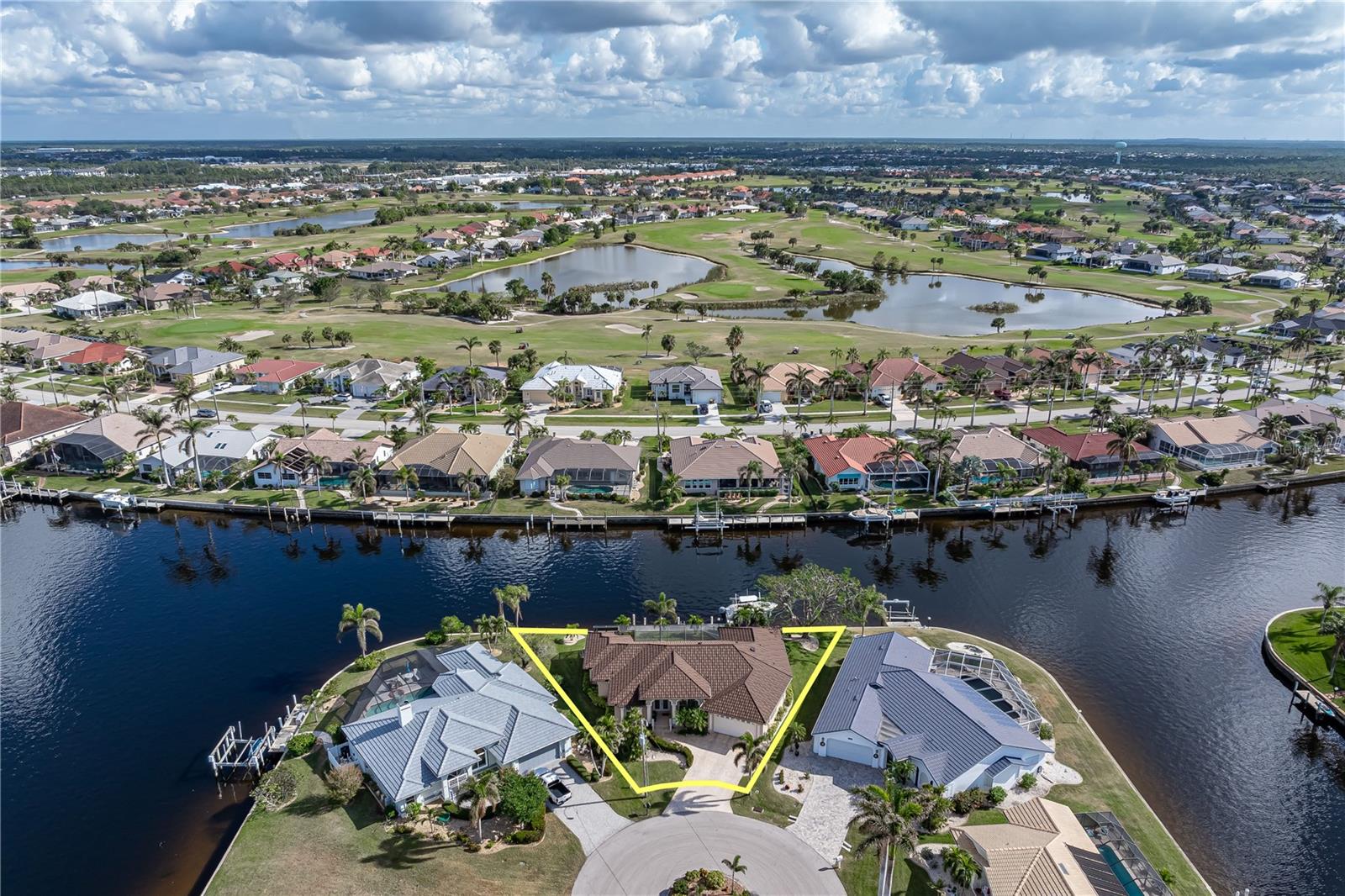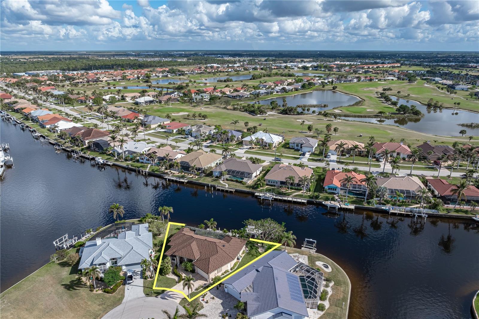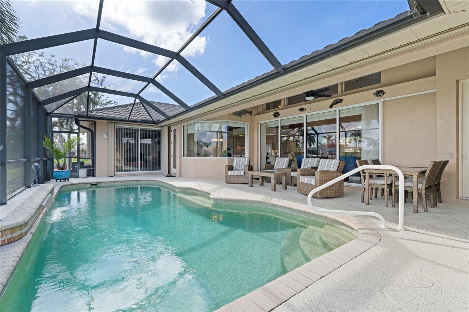 CUSTOM WATERFRONT HOME IN BSI ON KEY LOT W/**NEW METAL TILE ROOF AND NEW ENERGY EFFICIENT AC ** & 140 FT OF SEAWALL! Check out this 3 bed/2 bath, waterfront home w/over 2,200 sq ft of living space in the deed-restricted waterfront & golf community of Burnt Store Isles. Home is located on a quiet cul-de-sac surrounded by friendly neighbors. The interior of the home is bright & airy w/walls of sliding glass doors & large picture windows in almost every room. Architectural details include soaring cathedral ceilings, porcelain tile flooring throughout the main living areas as well as the guest bedroom/den, decorative plant shelves, rectangular transom windows in great room, gourmet kitchen w/adjacent breakfast nook & inviting outdoor living area. The great room features a built-in entertainment center w/lighted display shelves & disappearing sliding glass doors that extend the living space out onto the lanai. Centrally located kitchen offers a wraparound, multi-level breakfast bar, built-in convection oven/convection microwave, cook-top range w/hood plus ample cabinet & counter space. Almost all of the cabinets have pull-out shelves. The kitchen also features a tile back splash & under cabinet lighting. Lots of space for entertaining w/a formal dining area & large breakfast nook. Breakfast nook boasts a mitered aquarium glass window & built-in desk. The master suite offers walk-out access to the lanai, a spa-like master bath & oversized walk-in closet. The master bath has dual sinks, a large linen closet, private WC, a corner tub plus a tile & glass walk-in shower. The split bedroom offers large guest rooms. One guest room has walk-out access to the lanai w/pool & canal views while the other doubles as a home office/den. The guest bath features a combination tub/shower & linen closet. Outside, the lanai offers an in-ground, heated pool & lots of room for outdoor entertaining w/covered seating area & a sun deck off to the side by the outdoor shower & pool storage closet. Sit back & enjoy the canal view - watch as boats & the occasional dolphin or manatee wander past. Two doors from the screened lanai lead out to the fenced back yard. A concrete walkway leads to the 45 ft extended concrete dock w/12,000 lb boat lift. Boat lift perfectly positioned off to the side so as not to block the water view. Water & electric hook-ups are available dockside. Set off on your latest maritime adventure from your own backyard & start enjoying some of the best fishing & boating SW Florida has to offer. Other amenities include whole-house hurricane protection w/accordion shutters, water softener, attached oversized two car garage w/workshop & well-maintained tropical landscaping. Burnt Store Isles has an optional HOA & optional boat club both w/active social calendars. AC - Sept 2025 - Brand New. Boat for sale separately.