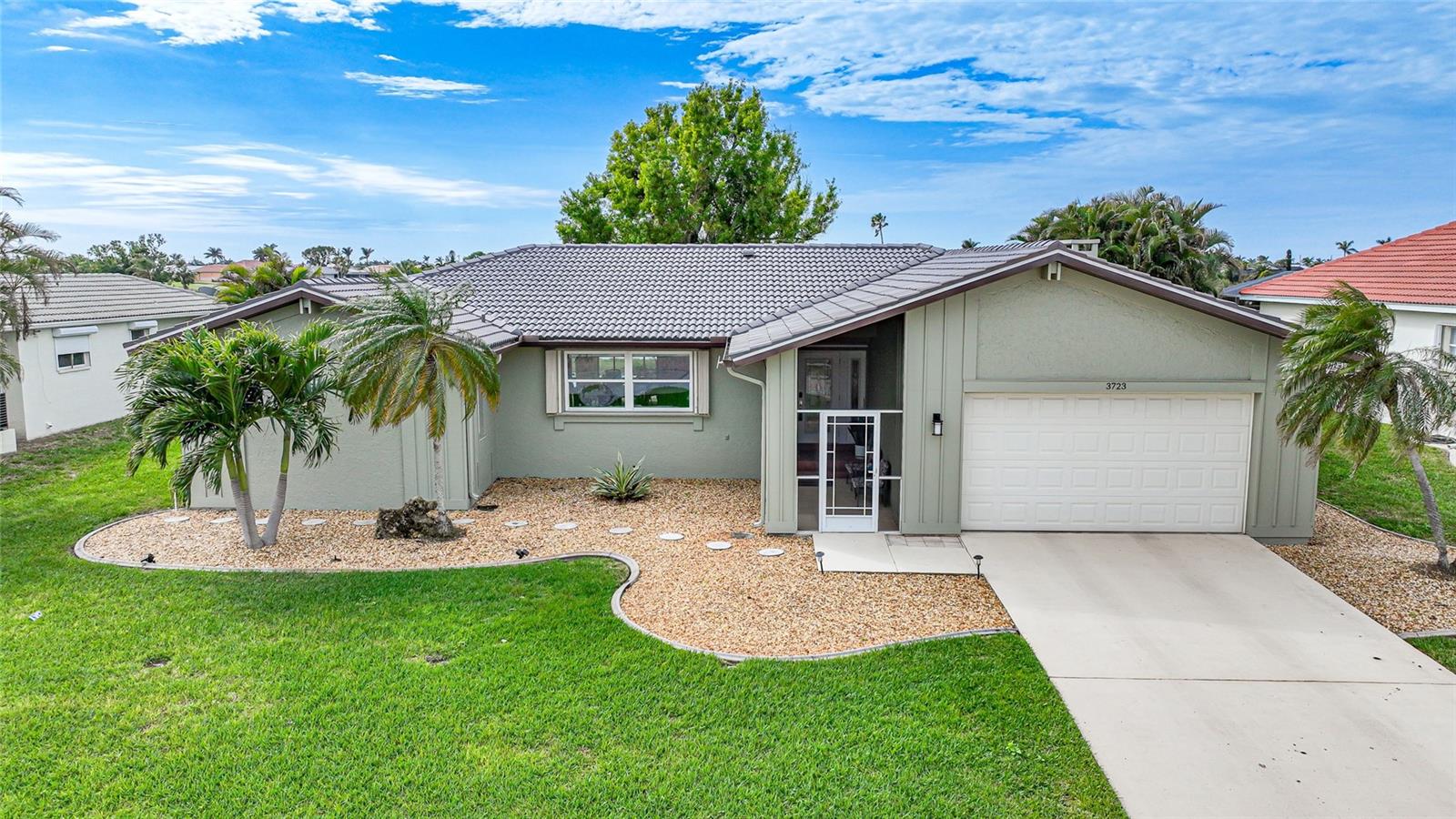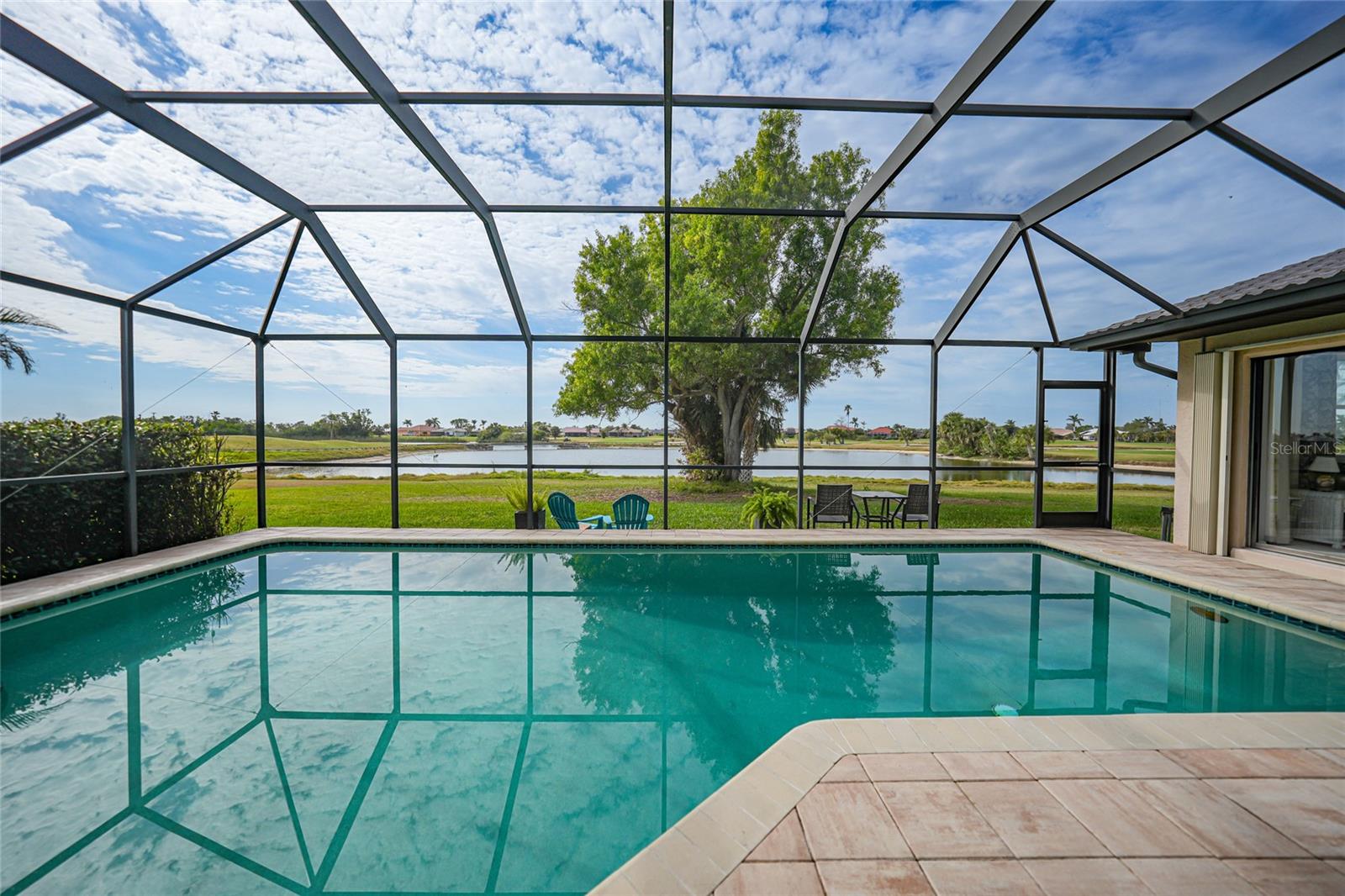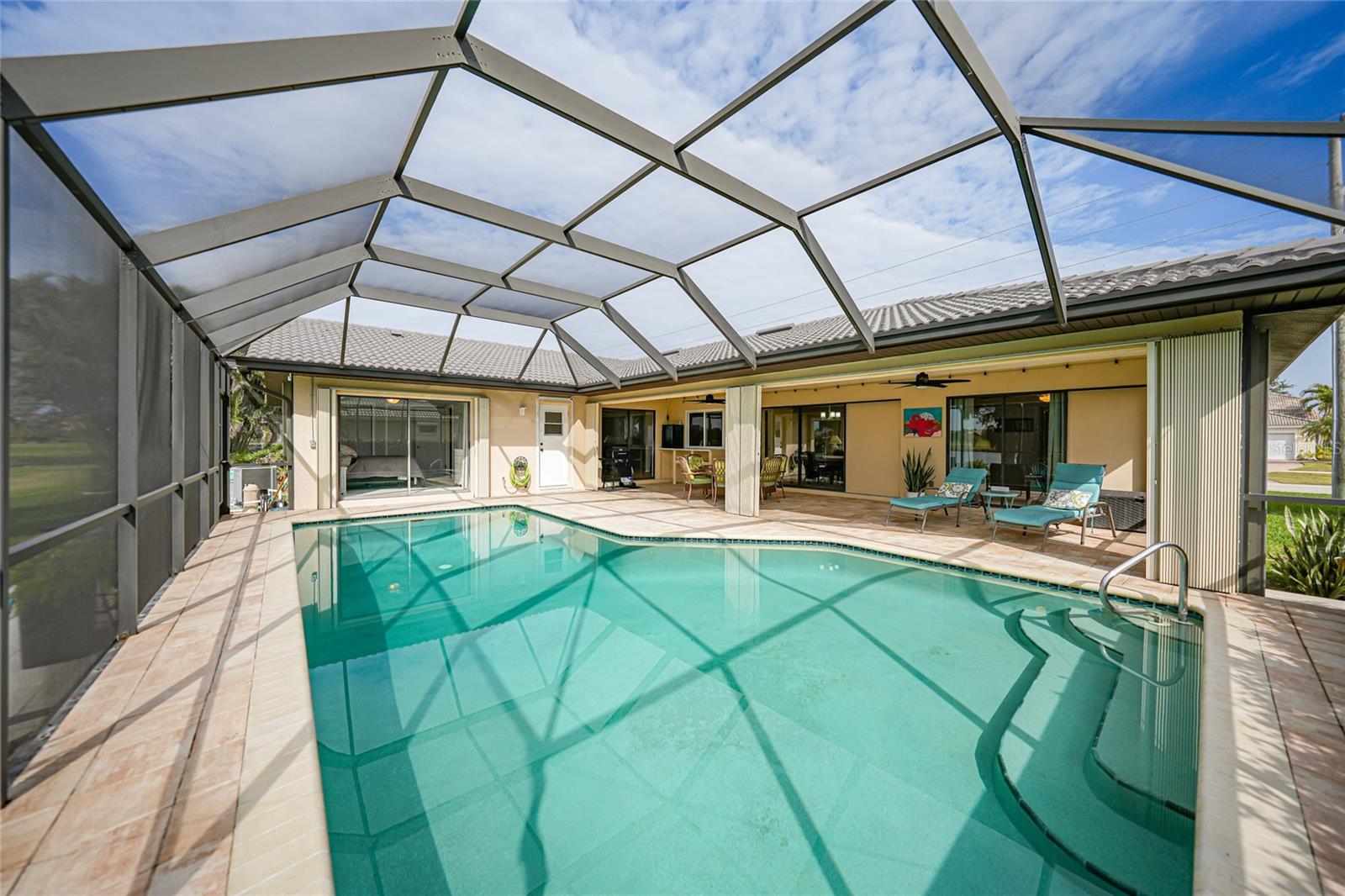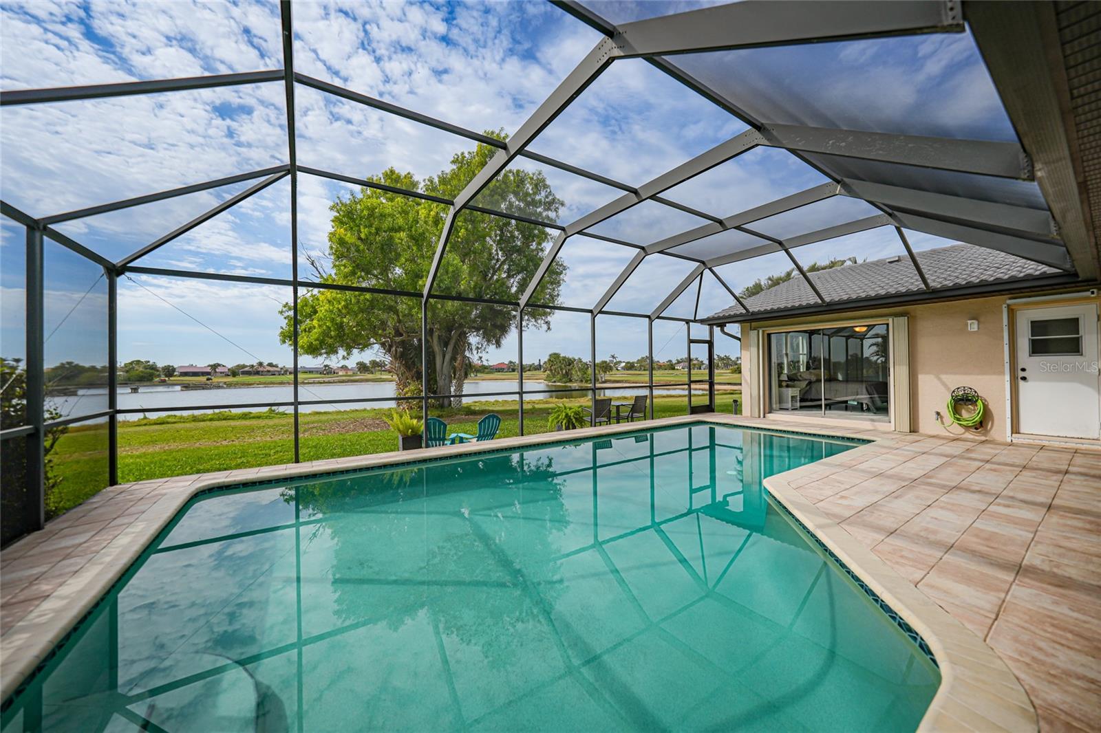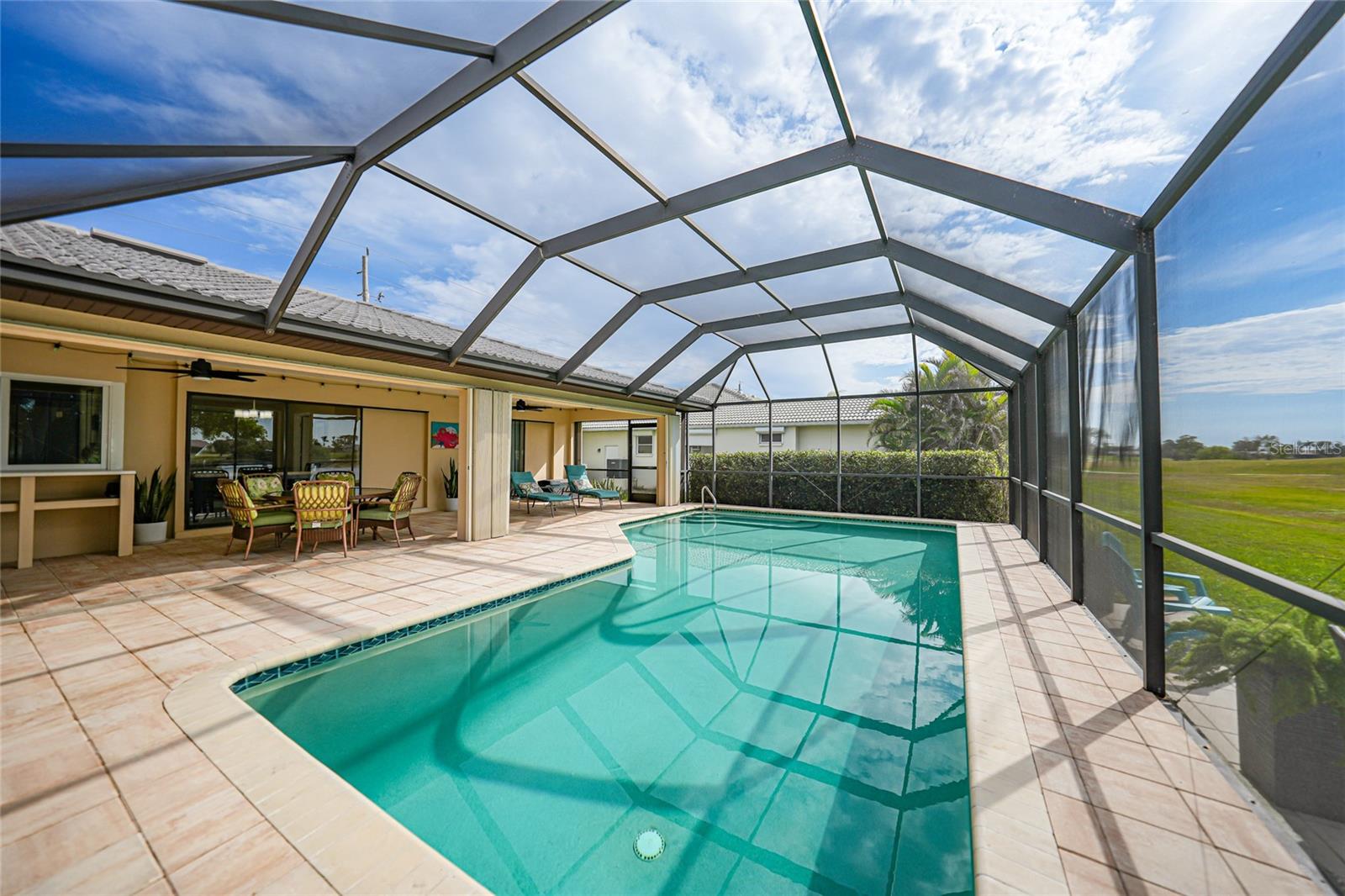 Welcome to Burnt Store Isles, a desirable golf and waterfront community with optional HOA fees. This impeccably maintained 3-bedroom, 2-bath, 2-car garage home offers over 2,200 sq. ft. of living space, featuring a heated saltwater pool and breathtaking waterfront views overlooking the 15th green of Twin Isles Golf Course with NO WORRIES about being hit by golf balls! Recent updates include hurricane shutters, new tile flooring, a new electrical panel with a whole-house surge protector, a sprinkler system, a new pool deck, and fresh interior paint. From the moment you arrive, you’ll be captivated by the home’s curb appeal, with tropical landscaping, a screened front porch, a cement tile roof, and lake views visible from every room. The open-concept layout is ideal for entertaining, with expansive double sliding pocket doors that effortlessly connect the interior to the outdoor lanai, expanding your living space. Tile flooring throughout the main living areas enhances the living and dining rooms. The chef-inspired kitchen boasts ample cabinet and counter space, a closet pantry, a stylish tile backsplash, a dinette area, a full suite of appliances, a convenient pass-thru window to the lanai, and a breakfast bar. The kitchen opens to a cozy family room featuring a decorative wood-paneled accent wall, wet bar, and decorative fireplace. The master suite is a tranquil retreat with private pool access, two walk-in closets, dual vanities, a separate toilet area, and a Roman-style walk-in shower. Guest bedrooms are generously sized, one with pool access, each featuring ceiling fans and built-in closets. They share a full bath with convenient pool access. The dedicated laundry room includes front-load washers and dryers, a utility sink, and extra shelving for storage. Step outside to your upgraded, screened lanai with No-See-Um screening, where a sparkling saltwater heated pool awaits, offering stunning lake views. Perfect for entertaining, relaxing, or dining while watching the picturesque sunset. Enjoy the convenience of being close to top-rated beaches, parks with biking and walking trails, and boat ramps providing access to the Peace & Myakka Rivers, Charlotte Harbor, and the Gulf of Mexico. Historic downtown Punta Gorda and Fishermen’s Village, with charming shops and cafes, are just a short drive away.