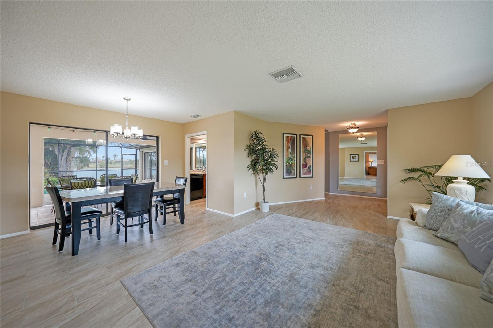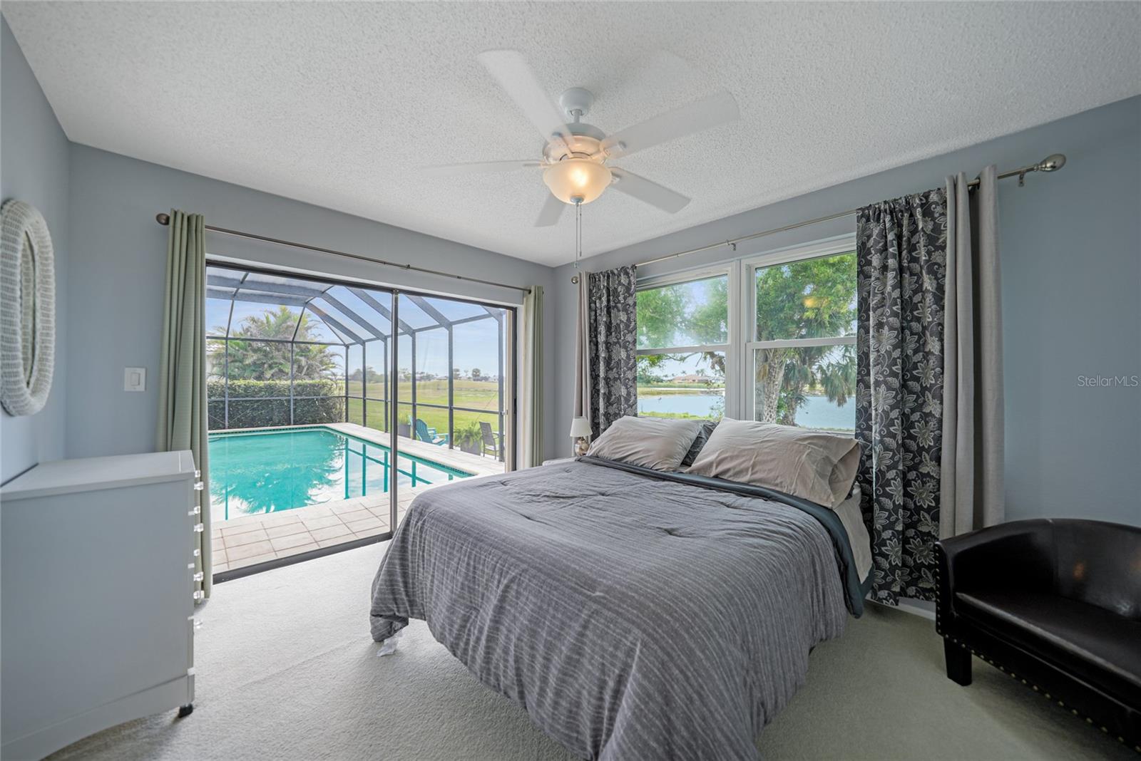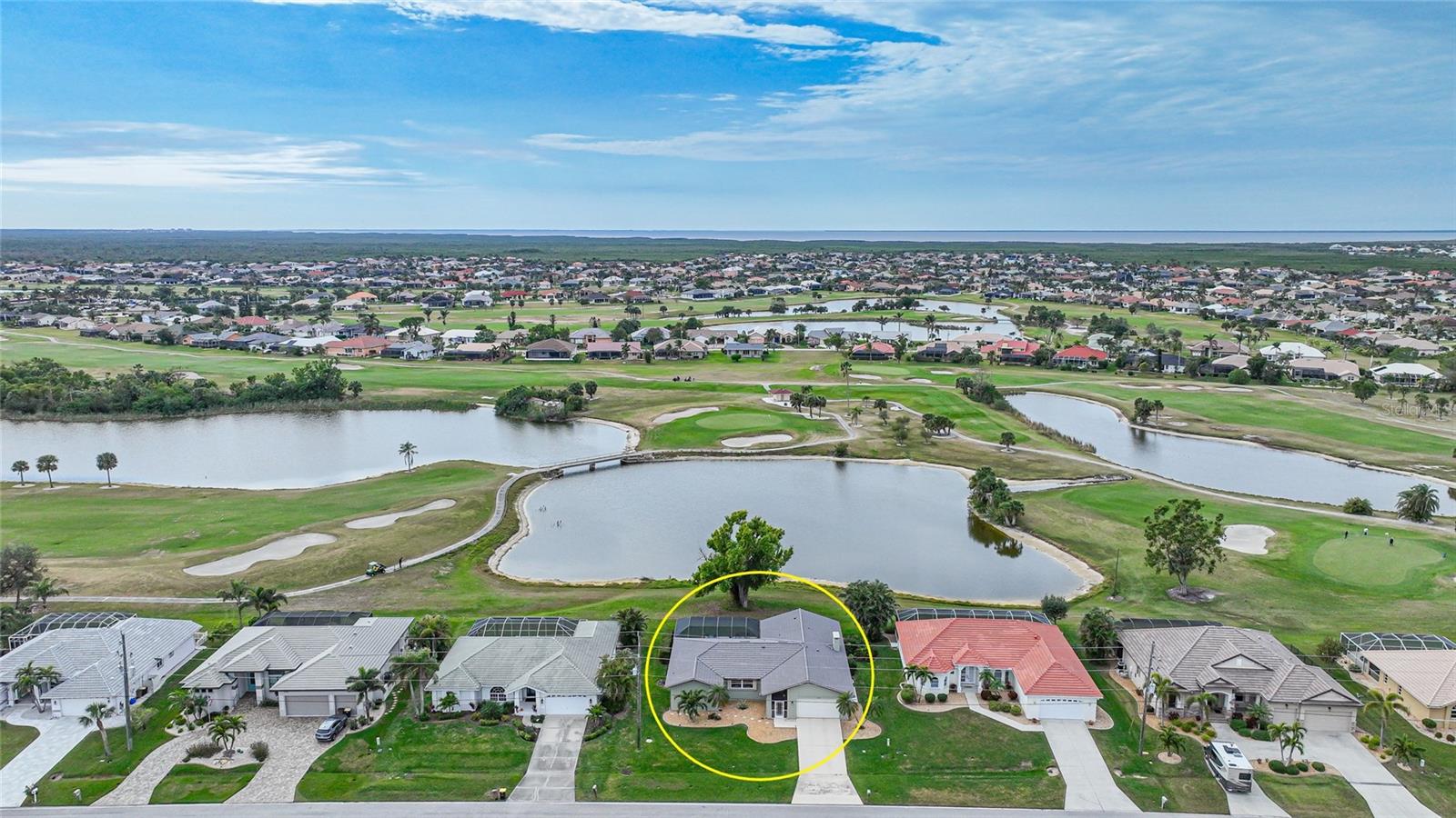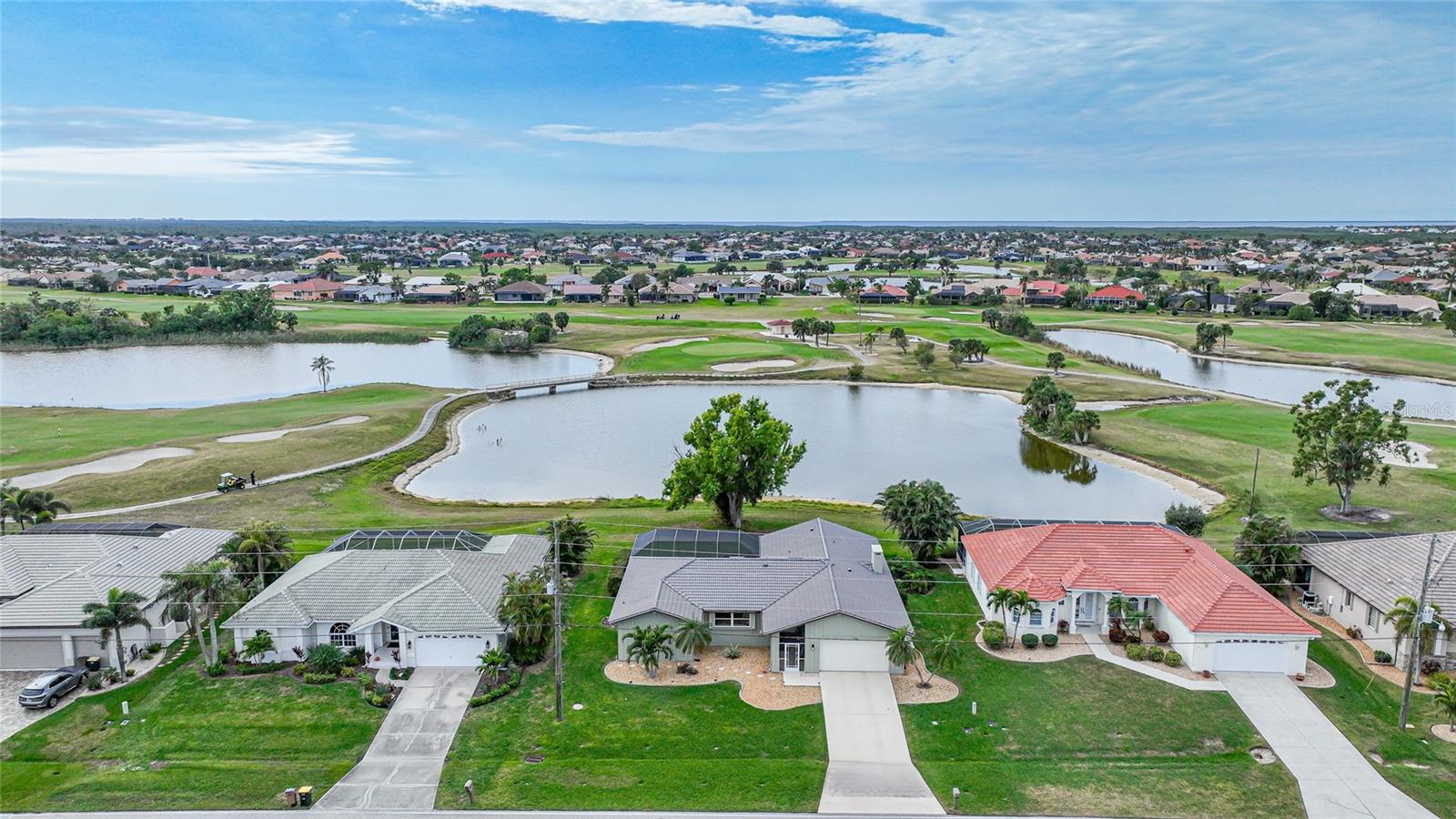 Welcome to Burnt Store Isles, a desirable golf and waterfront community with optional HOA fees. This impeccably maintained 3-bedroom, 2-bath, 2-car garage home offers over 2,200 sq. ft. of living space, featuring a heated saltwater pool and breathtaking waterfront views overlooking the 15th green of Twin Isles Golf Course with NO WORRIES about being hit by golf balls! Recent updates include hurricane shutters, new tile flooring, a new electrical panel with a whole-house surge protector, a sprinkler system, a new pool deck, and fresh interior paint. From the moment you arrive, you’ll be captivated by the home’s curb appeal, with tropical landscaping, a screened front porch, a cement tile roof, and lake views visible from every room. The open-concept layout is ideal for entertaining, with expansive double sliding pocket doors that effortlessly connect the interior to the outdoor lanai, expanding your living space. Tile flooring throughout the main living areas enhances the living and dining rooms. The chef-inspired kitchen boasts ample cabinet and counter space, a closet pantry, a stylish tile backsplash, a dinette area, a full suite of appliances, a convenient pass-thru window to the lanai, and a breakfast bar. The kitchen opens to a cozy family room featuring a decorative wood-paneled accent wall, wet bar, and decorative fireplace. The master suite is a tranquil retreat with private pool access, two walk-in closets, dual vanities, a separate toilet area, and a Roman-style walk-in shower. Guest bedrooms are generously sized, one with pool access, each featuring ceiling fans and built-in closets. They share a full bath with convenient pool access. The dedicated laundry room includes front-load washers and dryers, a utility sink, and extra shelving for storage. Step outside to your upgraded, screened lanai with No-See-Um screening, where a sparkling saltwater heated pool awaits, offering stunning lake views. Perfect for entertaining, relaxing, or dining while watching the picturesque sunset. Enjoy the convenience of being close to top-rated beaches, parks with biking and walking trails, and boat ramps providing access to the Peace & Myakka Rivers, Charlotte Harbor, and the Gulf of Mexico. Historic downtown Punta Gorda and Fishermen’s Village, with charming shops and cafes, are just a short drive away.