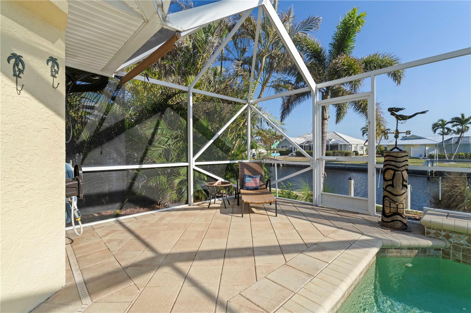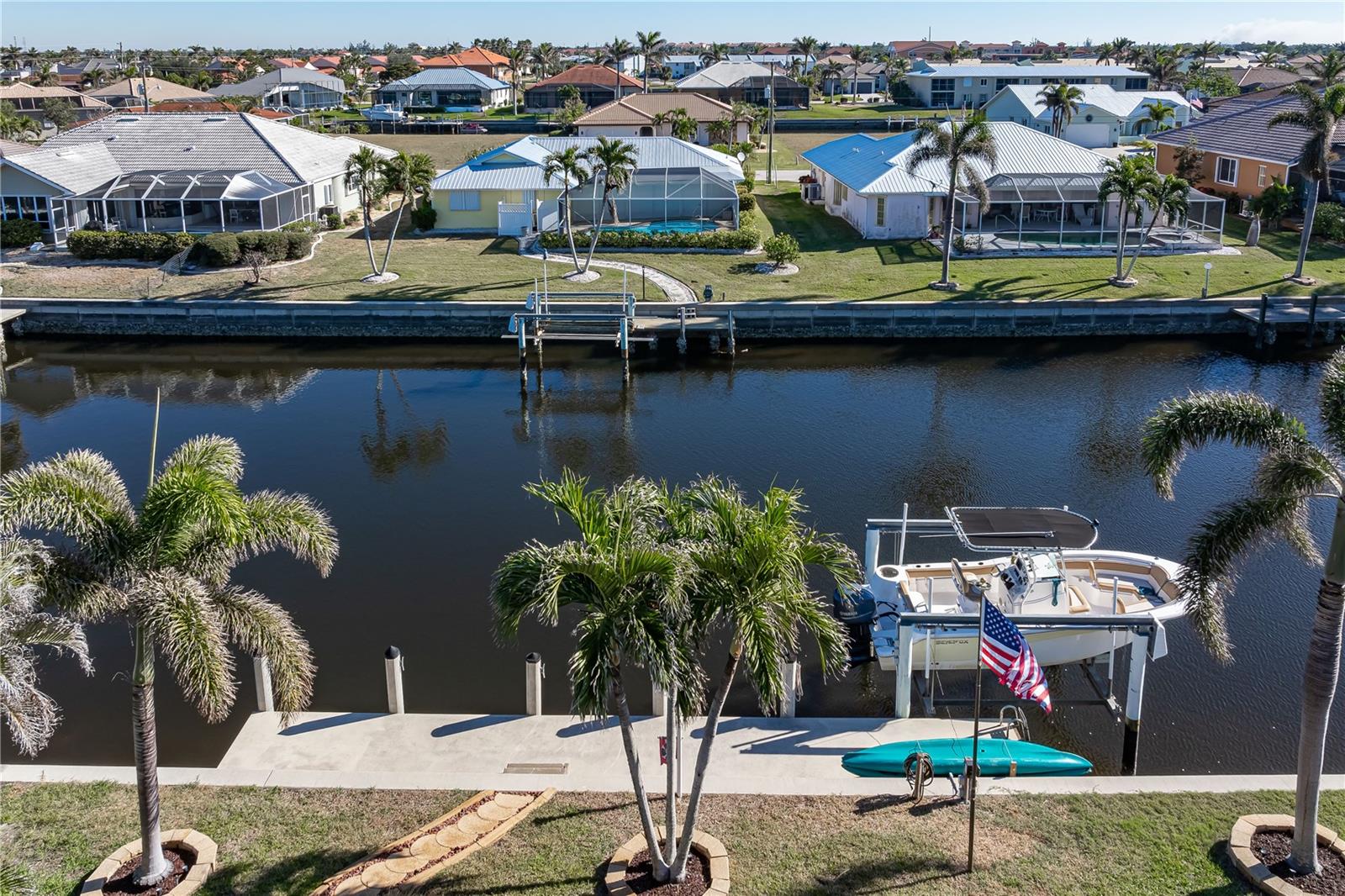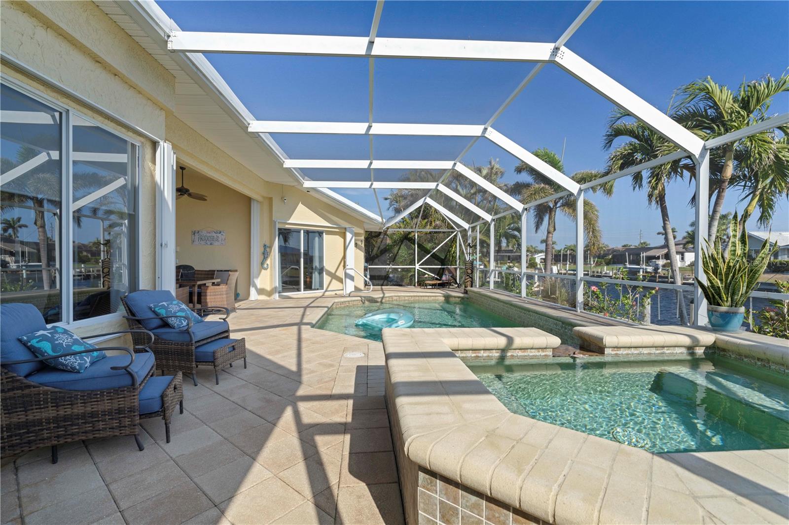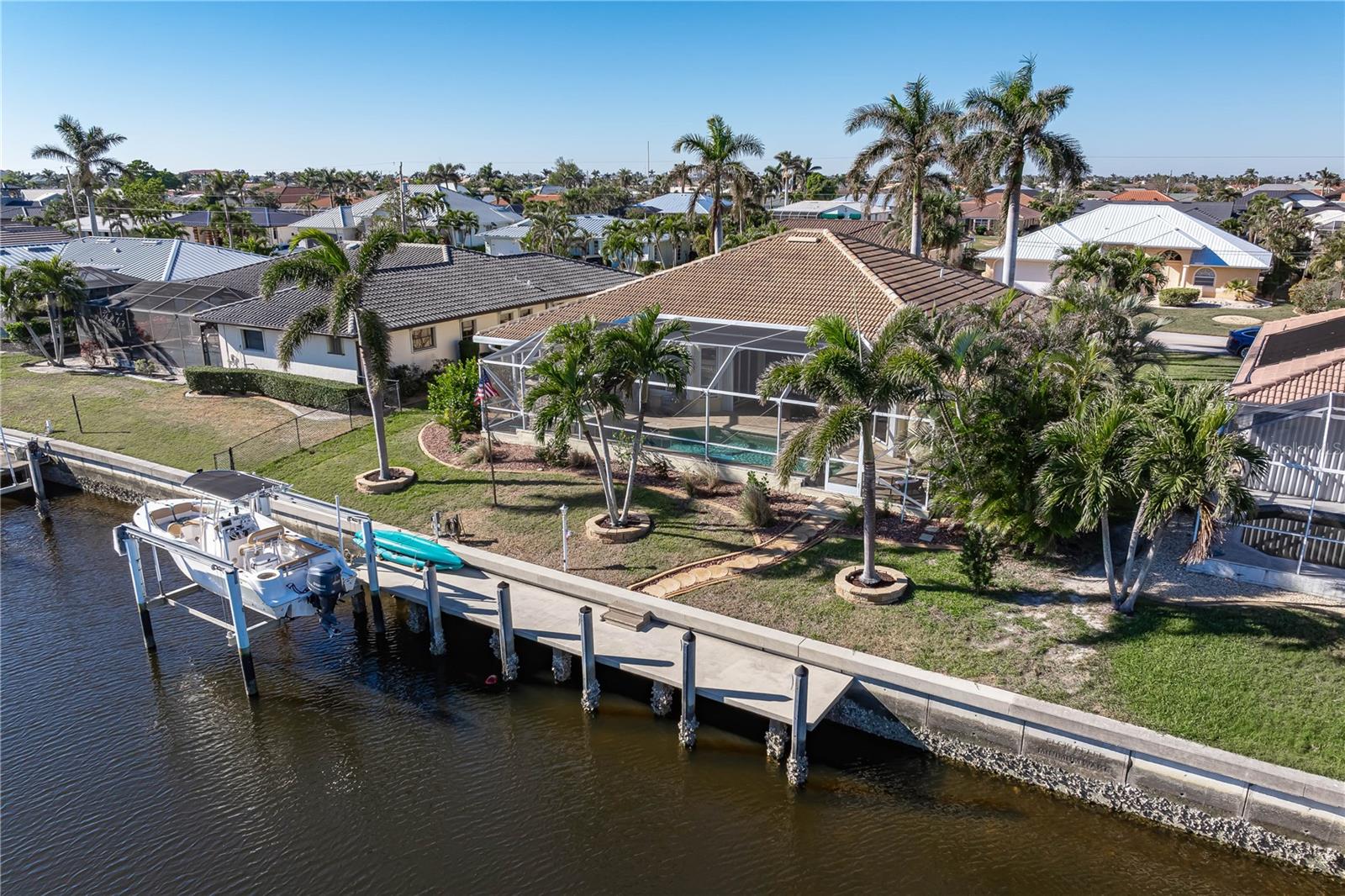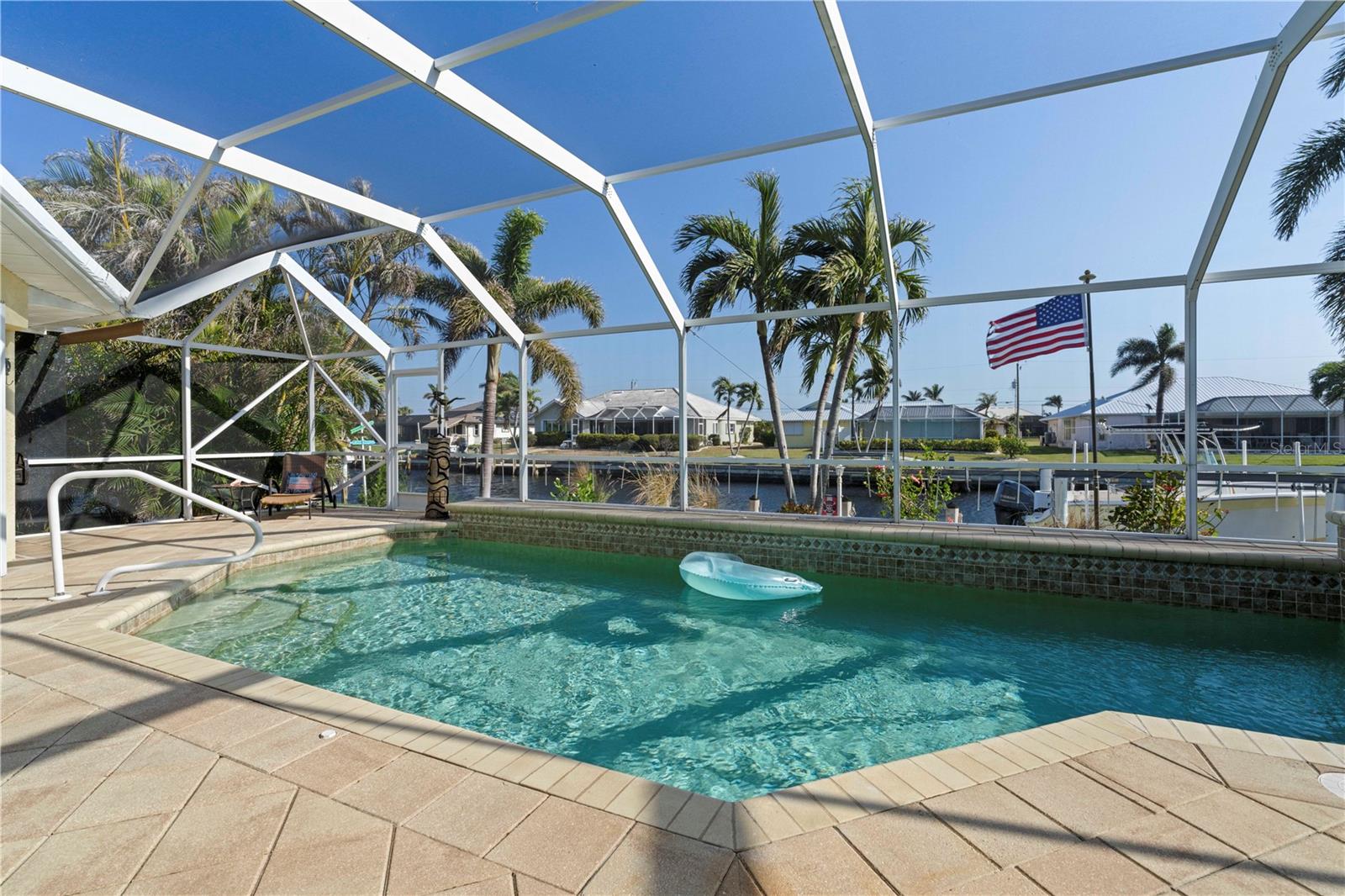 MOVE-IN READY, PGI WATERFRONT HOME W/OVERSIZED DOCK & QUICK BOATING ACCESS - Looking for a move-in ready, waterfront home? Consider this 3 bed/2 bath, waterfront home w/pool & attached 2-car garage. Inside, the home has a spacious, open floor plan w/soaring ceilings, updated kitchen & large bedrooms. Large picture windows, a wall of sliding glass doors & rectangular transom windows above the sliders flood the home w/natural light. Great room seamless blends indoor/outdoor living when sliding glass doors are open. Flex space that can be either a home office or formal dining area is just off the entry. Kitchen boasts quartz counters, stainless steel appliances, wood cabinetry w/ample cabinet & counter space. Tile flooring is found throughout the main living areas & bathrooms plus luxury vinyl wood-look plank flooring in the master bedroom as well as carpet in the guest bedrooms. The master suite has walk-out access to the lanai, pool & canal views, two walk-in closets & an en-suite master bath w/dual sinks, private WC, linen closet & glass-enclosed shower. One guest room is located at the front of the home & is currently used as a home office/gym. The 3rd bedroom is located on the opposite end of the home providing privacy for owners & guests. It features an oversized walk-in closet & walk-out access to the lanai. It is located across the hall from the guest bath. Outside, the lanai has a brick paver deck that surrounds the in-ground, heated (solar & electric) saltwater pool w/attached spa. The spa overflow is a waterfall feature that provides the sound of running water adding to the relaxing nature of this outdoor living space. Lanai offers a covered seating/dining area as well as a large sun deck area where you can lounge poolside to soak up some Florida sun. There is also an outdoor shower that lets you rinse off after a day on the boat or time spent in the pool. The back walkway leads to the oversized, 45 ft concrete dock w/10,000 lb boat lift. Water & electric hook-ups are available dockside. Reach open water in under 15 minutes from your backyard & start enjoying some of the best fishing & boating SW Florida has to offer. Other amenities include whole-house water softener, whole-house hurricane protection, an attached oversized 2-car garage w/workshop bump-out & an exterior storage closet (the fisherman's equipment nook) where you can store fishing, boating & lawn care items without taking up valuable space in the garage. Furniture is negotiable. Make an appointment today! You won't be disappointed.